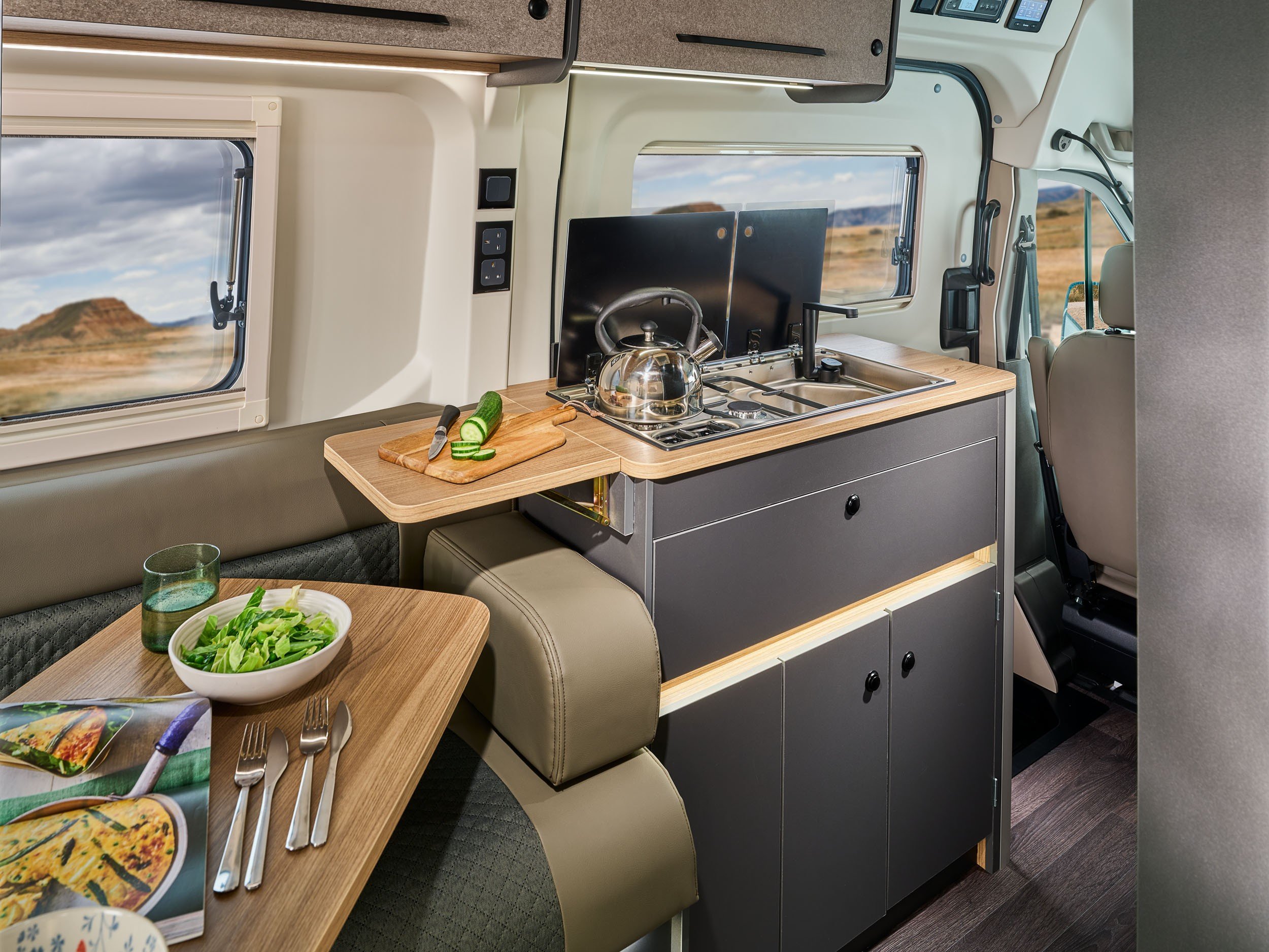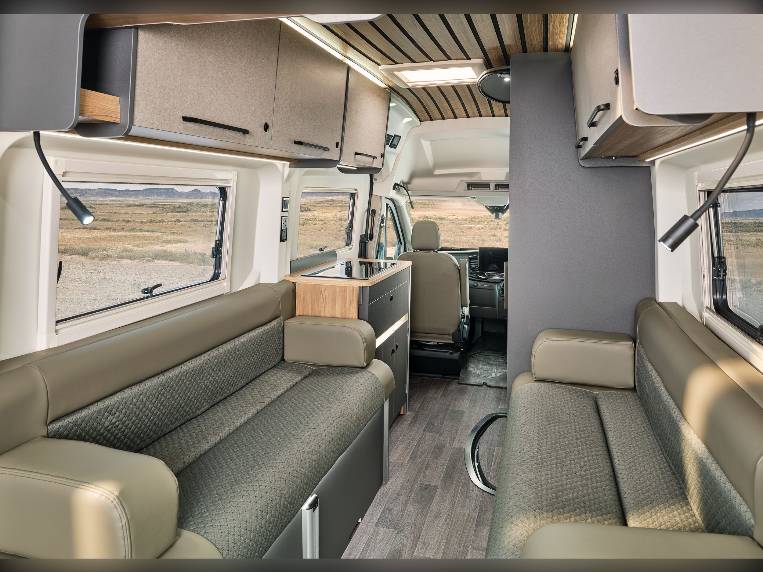 Year: 2026, Berth:2, External length: 5.98m / 19'", Width: 2.49m / 8'2, Height: 2.8m / 9'2", Unladen weight: 2819kg, MTPLM: 3500kg, Engine 2.0l 165bhp 6 speed manual. This model is ideal for two people who like space and flexibility. At the rear of this model is a large seating area which converts into a large double bed, or it can be used as two singles. The folding front table in the lounge can be set in different positions to suit your needs, with a two burner hob and 90l fridge features in the kitchen. The sliding door to the washroom gives more room in the kitchen area, while also giving usable space in the shower area. The 12" information screen has built in sat nav, a rear camera and rear parking sensors. For those who like to be off grid, there is a 100l fresh water tank, a 58 l waste water tank, a 130 w solar panel and two 80 ah agm leisure batteries fitted to this model. The diesel truma heating will keep you nice and warm all year round, where ever your adventures take you. Options include : 8 speed auto, roof rack, tent box, tow bar16" Swamper black alloy wheels, Thule blind, glass panoramic window - ask for details -