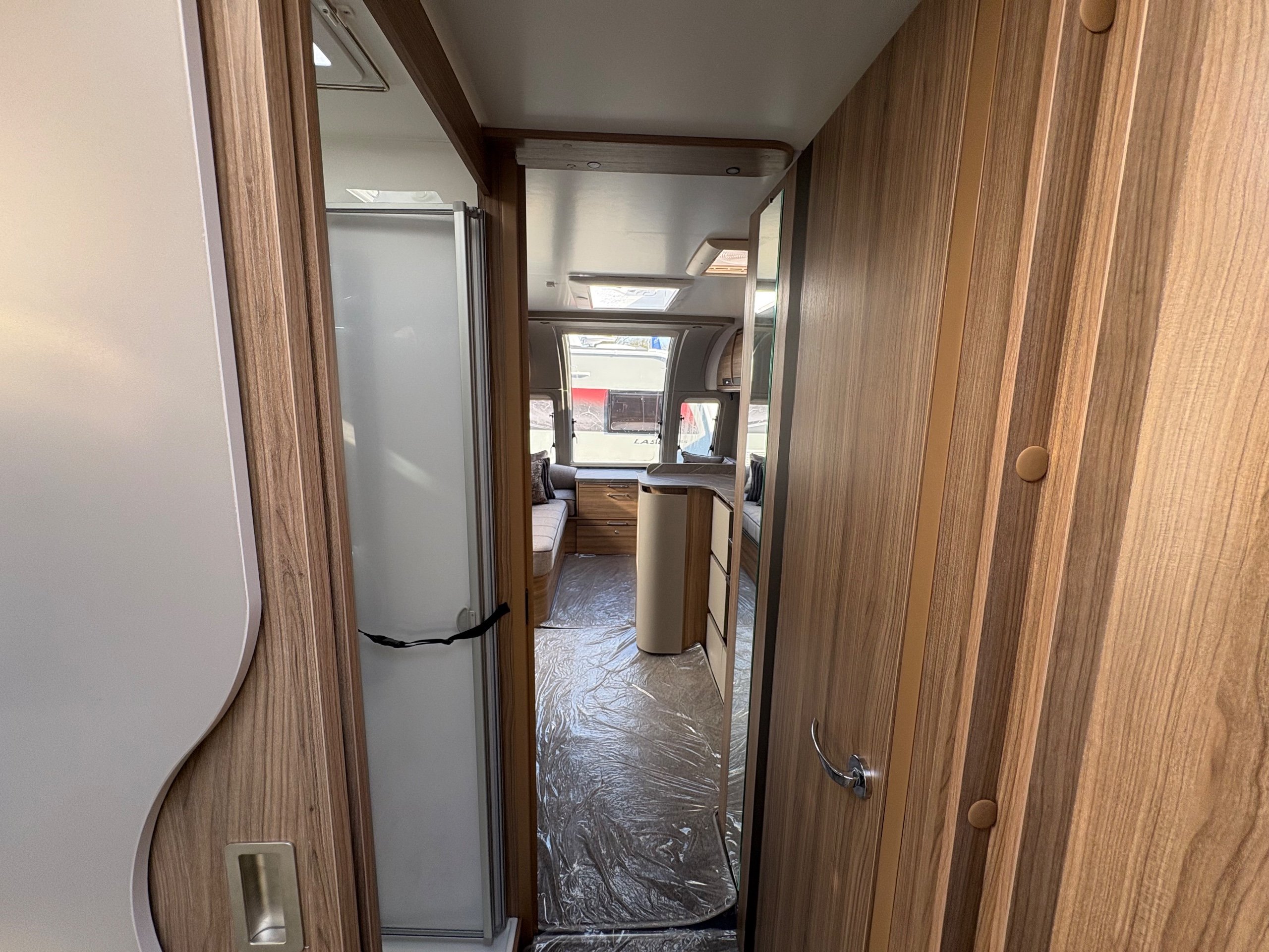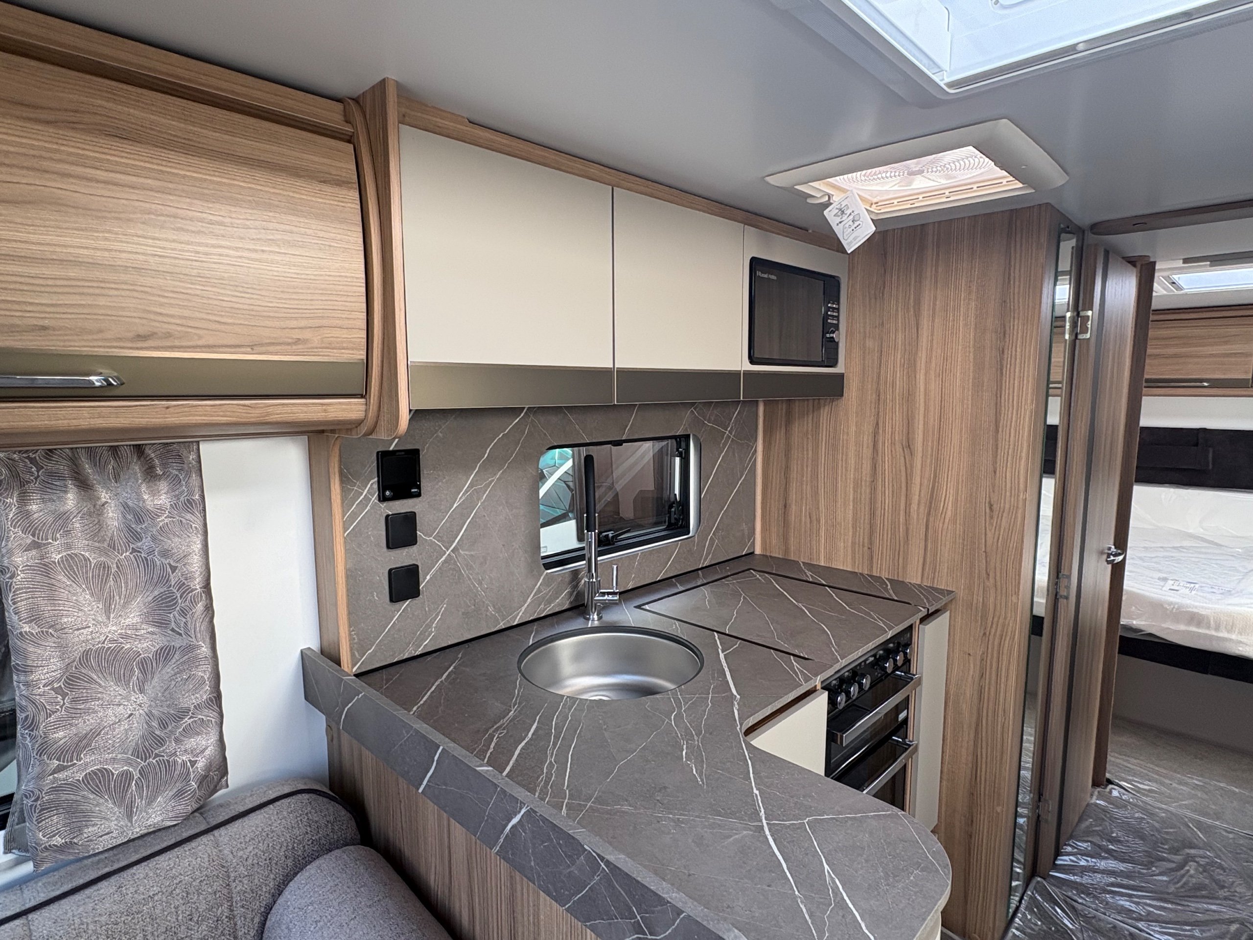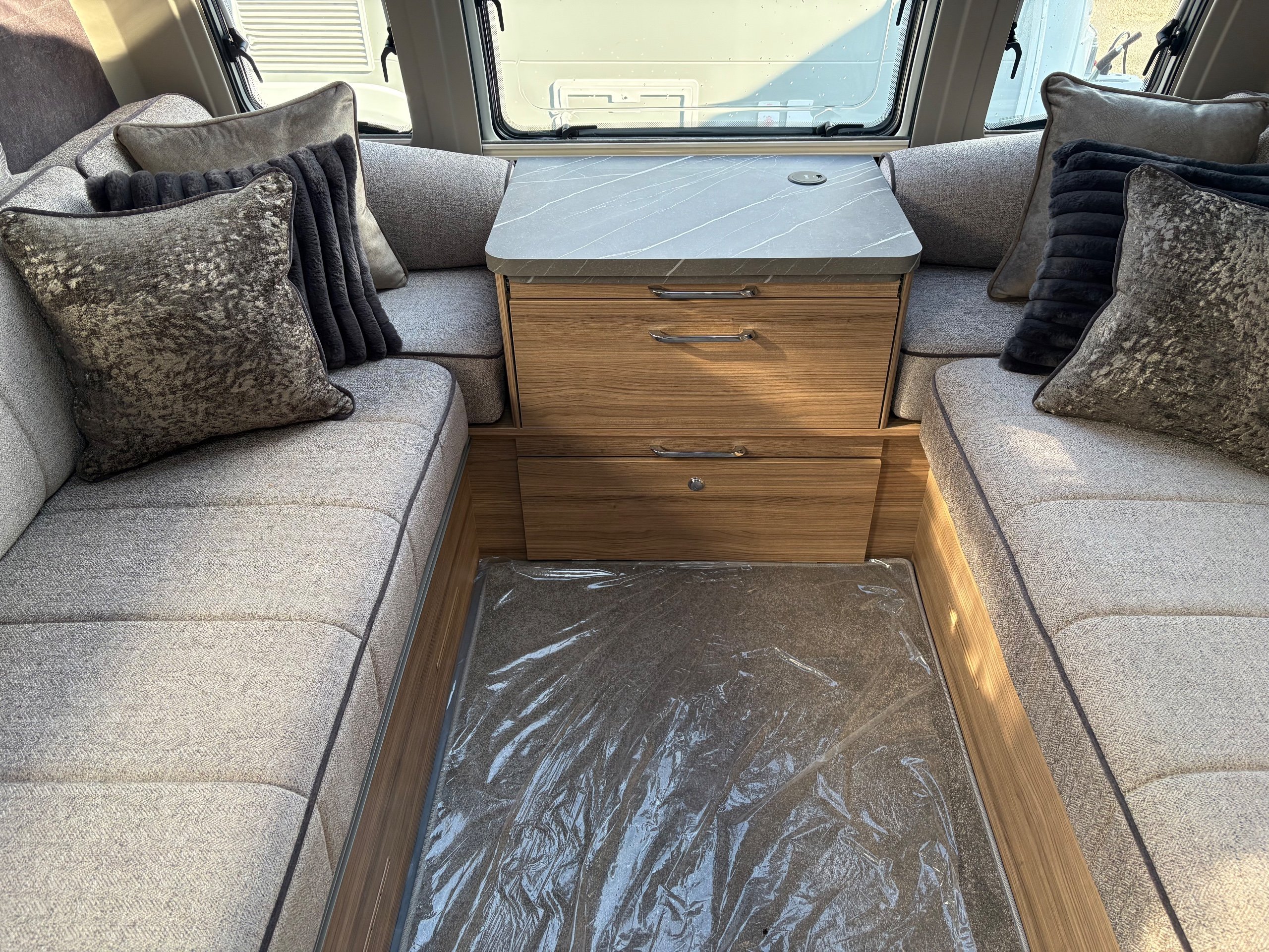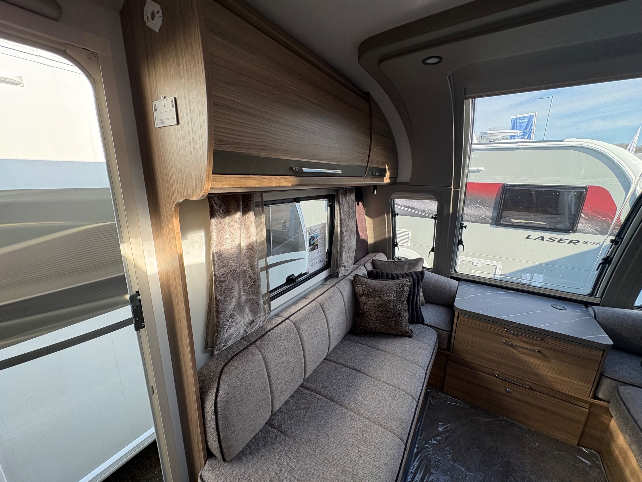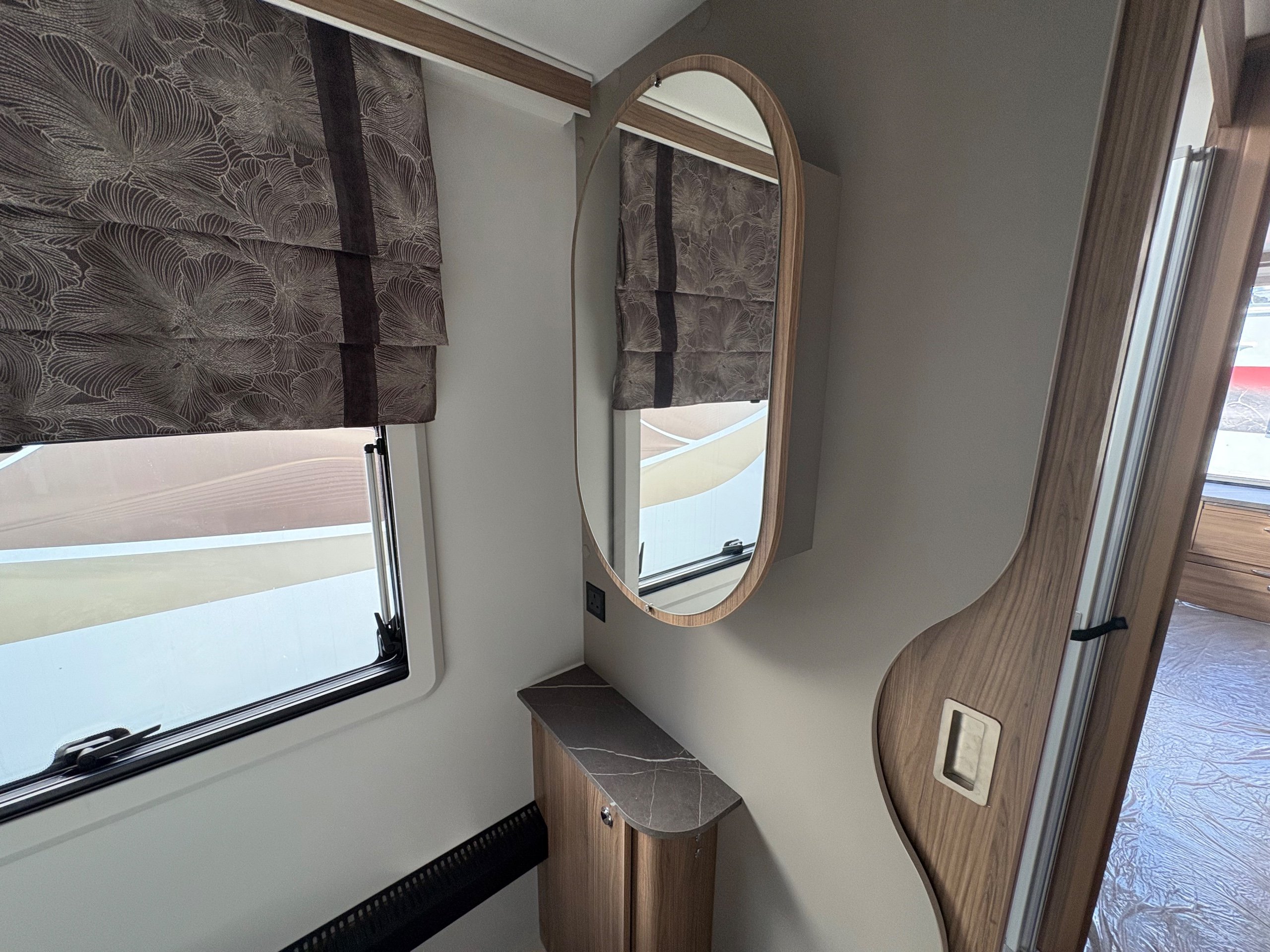 Year: 2026, Berth: 4, Internal length: 6.60m / 21'8", External length: 7.90m / 25'11", Width: 2.45m / 8', Unladen weight: 1703kg, MTPLM: 1863kg ( Upgraded MTPLM: 2000kg ), Awning size: 10.78m, Warranty: 3 years major components, 6 years bodyshell ( subject to terms and conditions ). This caravan is on a twin axle chassis with an eight feet body width. A large five foot wide rear island bed with generous storage, is a big feature of this caravan. The mid washroom has doors on both sides, allowing for privacy or to create a dressing space. The L shaped kitchen provides lots of work surface, with generous cupboard space and a metal pull out rack for smaller items. The parallel front seats gives lots of comfortable seating space with sprung cushions, a dedicated television area, wireless charging a bluetooth speaker for your entertainment. Wi-fi, alde heating , external gas and mains points, a roof mounted solar panel are just a few of the features fitted as standard on this top of the range model. -