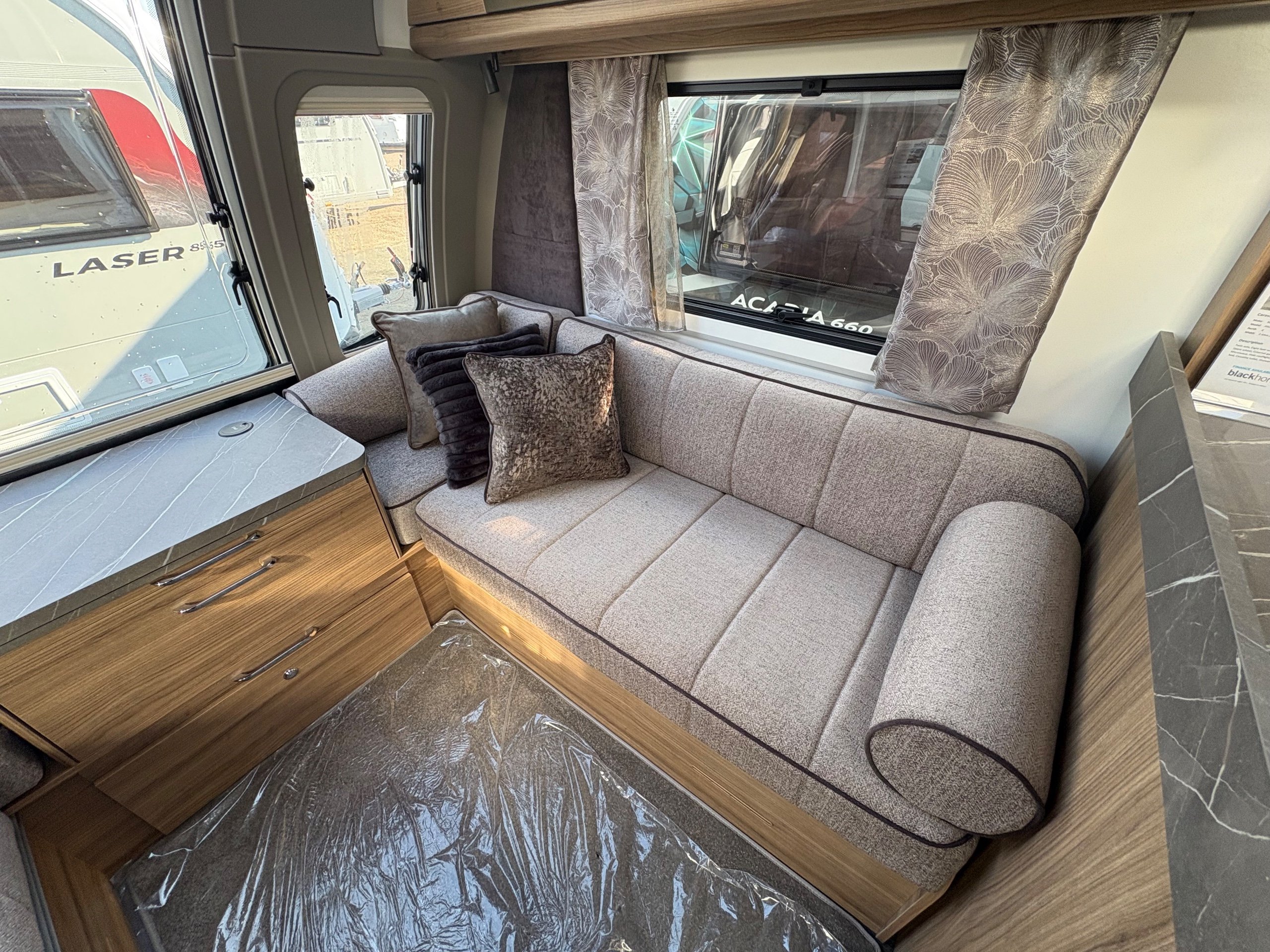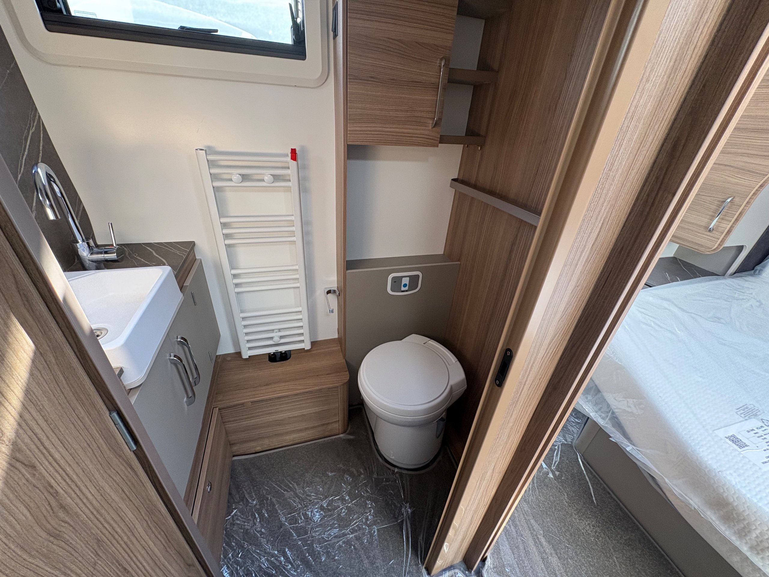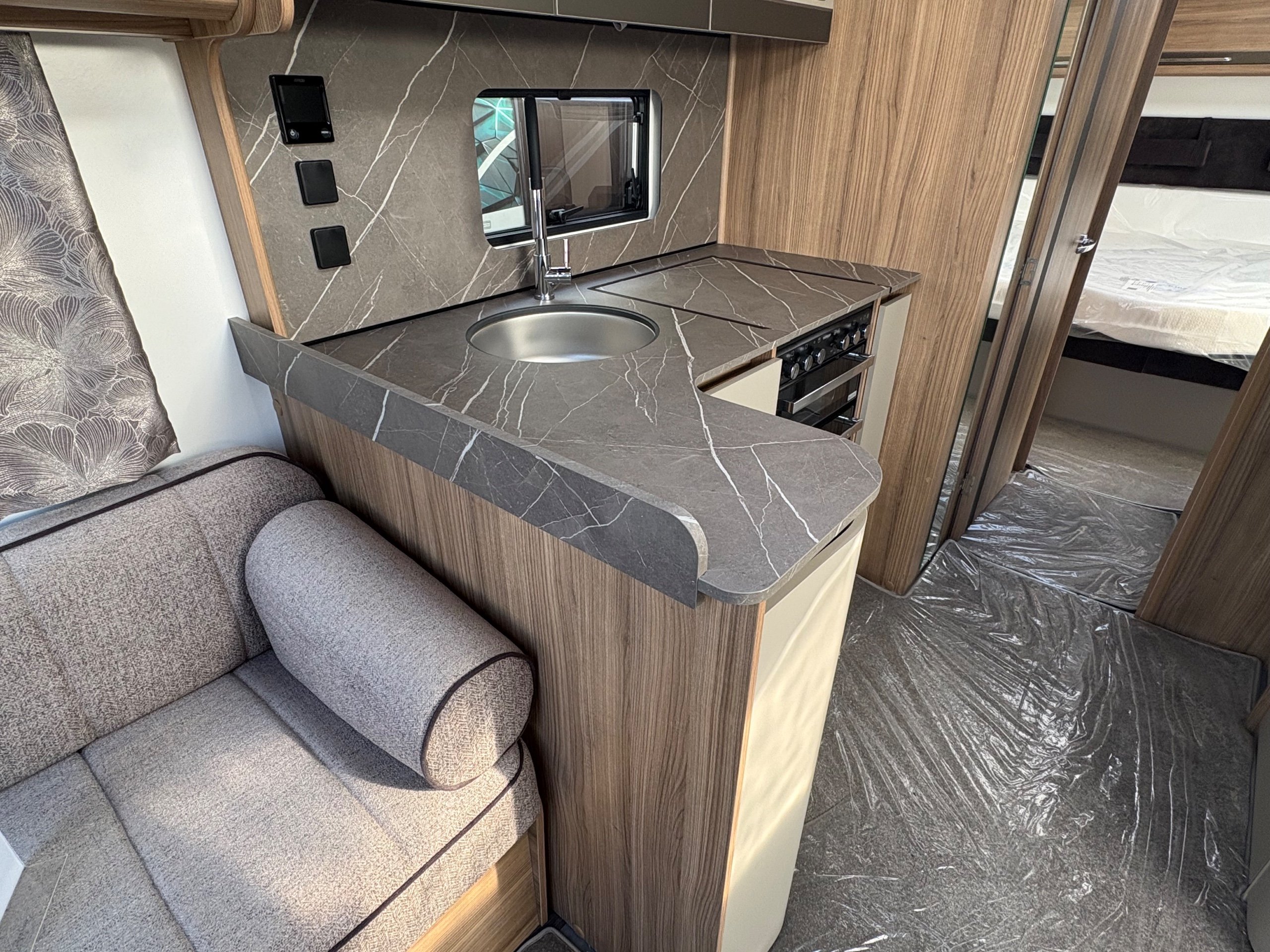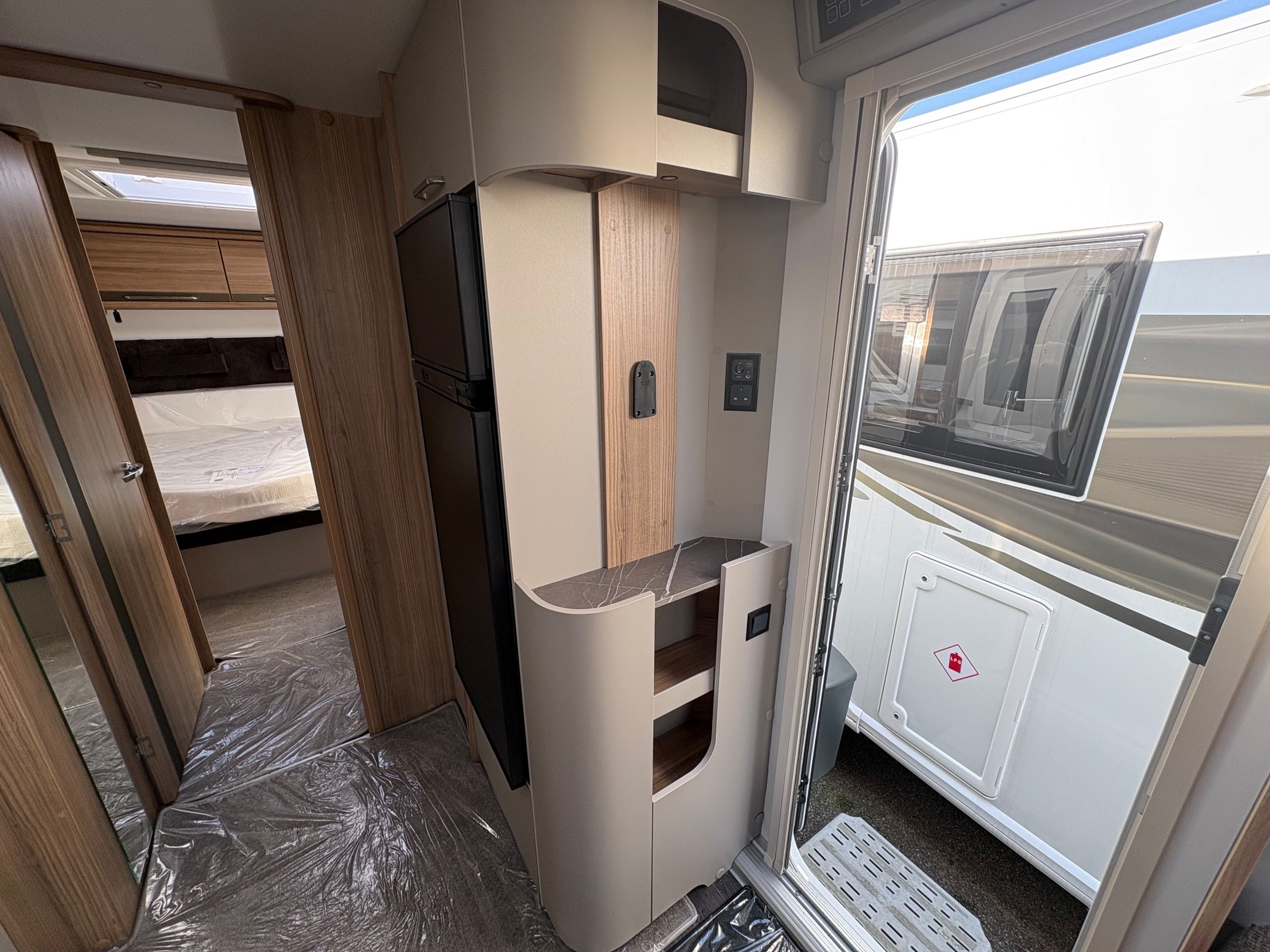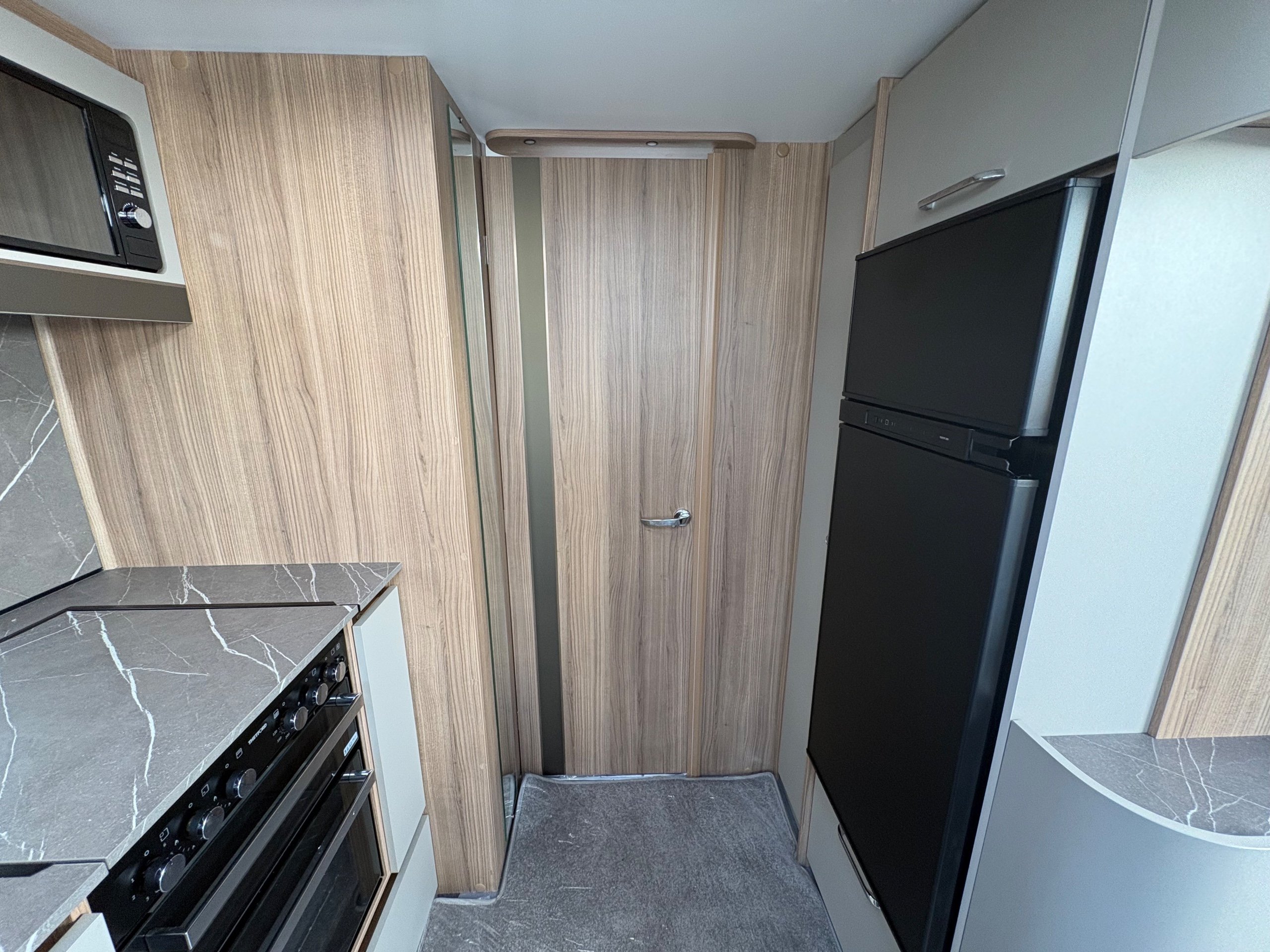 Year: 2026, Berth: 4, Internal length: 6.60m / 21'8", External length: 7.90m / 25'11", Width: 2.45m / 8', Unladen weight: 1703kg, MTPLM: 1863kg ( Upgraded MTPLM: 2000kg ), Awning size: 10.78m, Warranty: 3 years major components, 6 years bodyshell ( subject to terms and conditions ). This caravan is on a twin axle chassis with an eight feet body width. A large five foot wide rear island bed with generous storage, is a big feature of this caravan. The mid washroom has doors on both sides, allowing for privacy or to create a dressing space. The L shaped kitchen provides lots of work surface, with generous cupboard space and a metal pull out rack for smaller items. The parallel front seats gives lots of comfortable seating space with sprung cushions, a dedicated television area, wireless charging a bluetooth speaker for your entertainment. Wi-fi, alde heating , external gas and mains points, a roof mounted solar panel are just a few of the features fitted as standard on this top of the range model. -