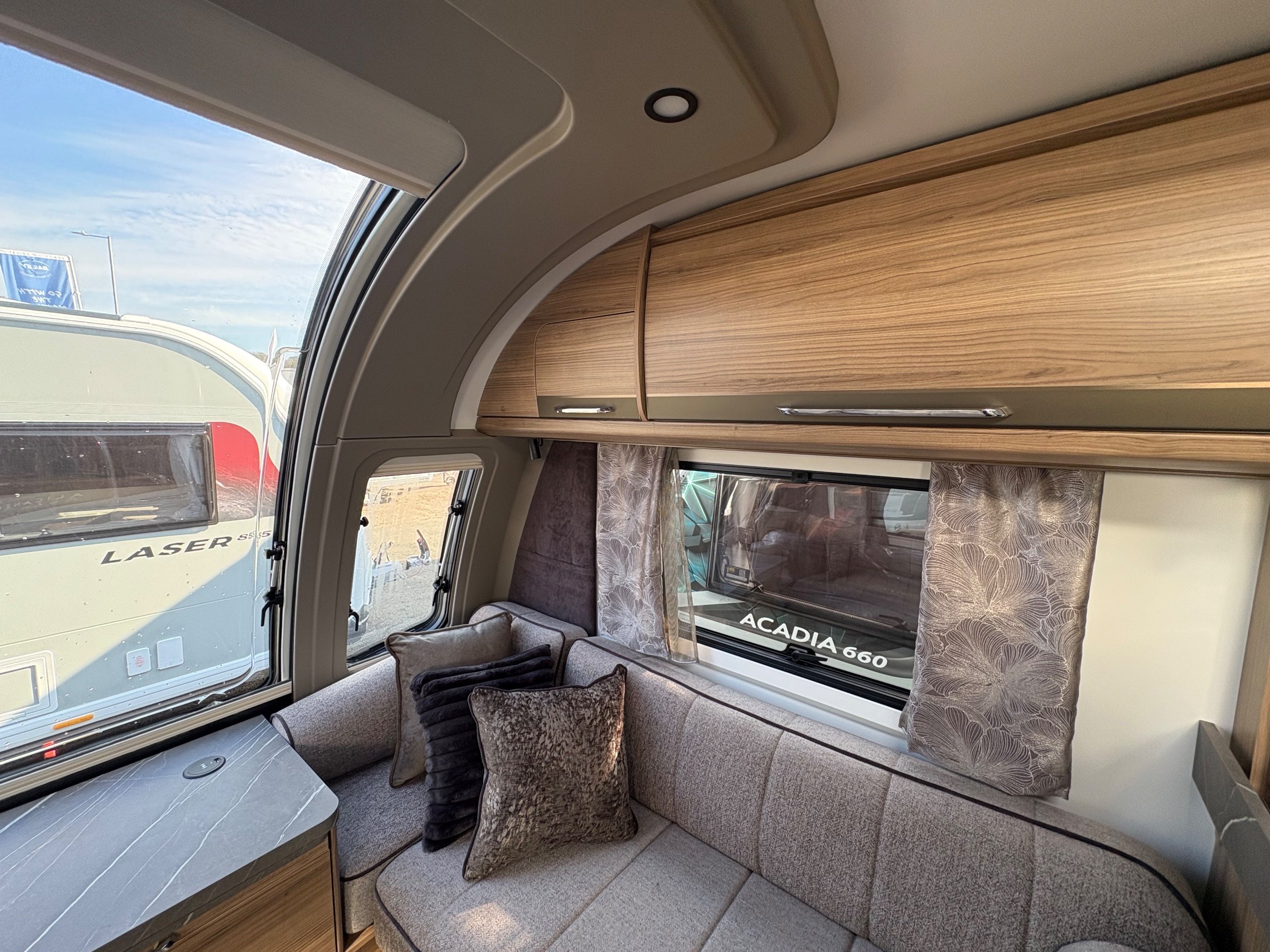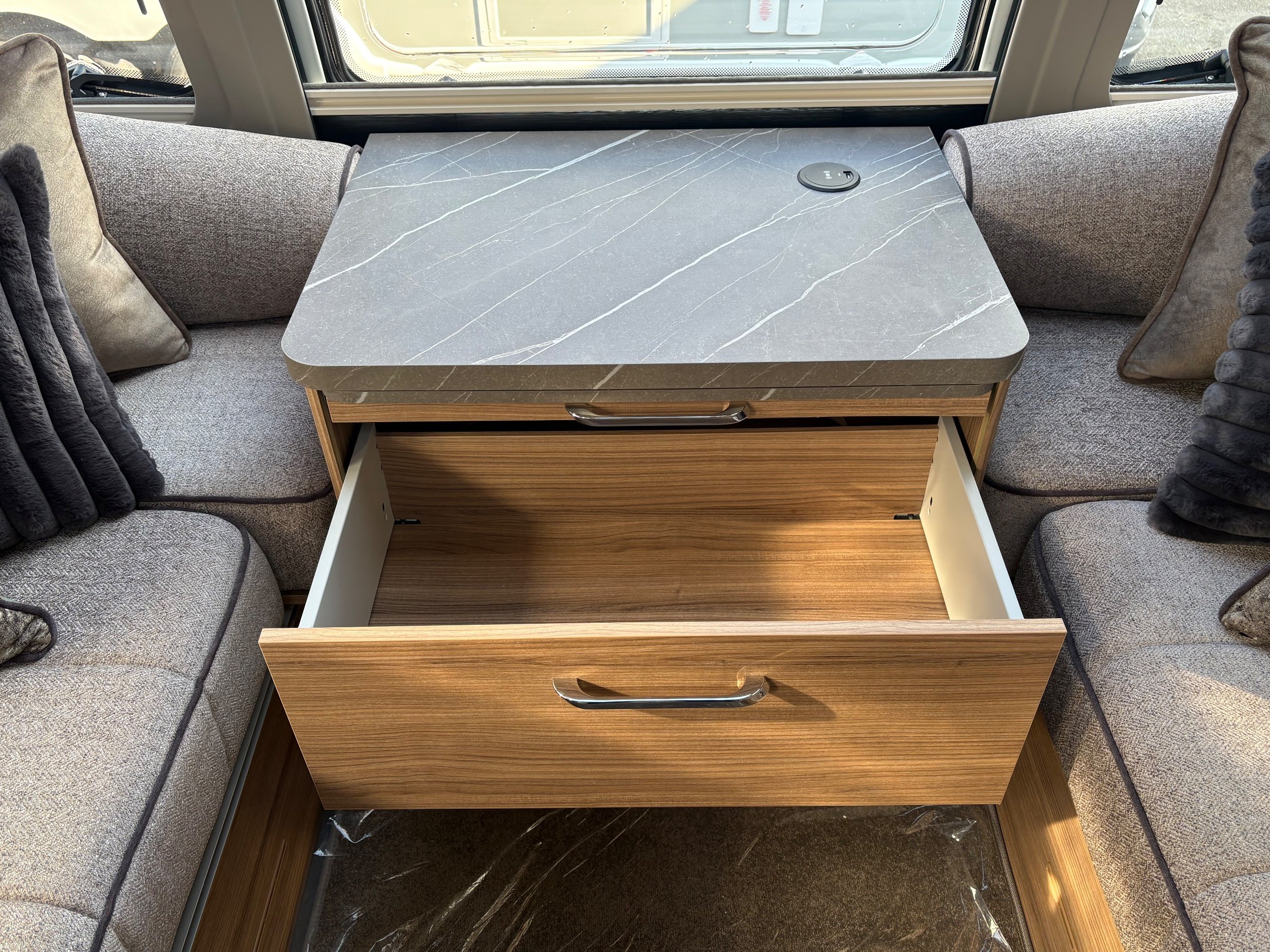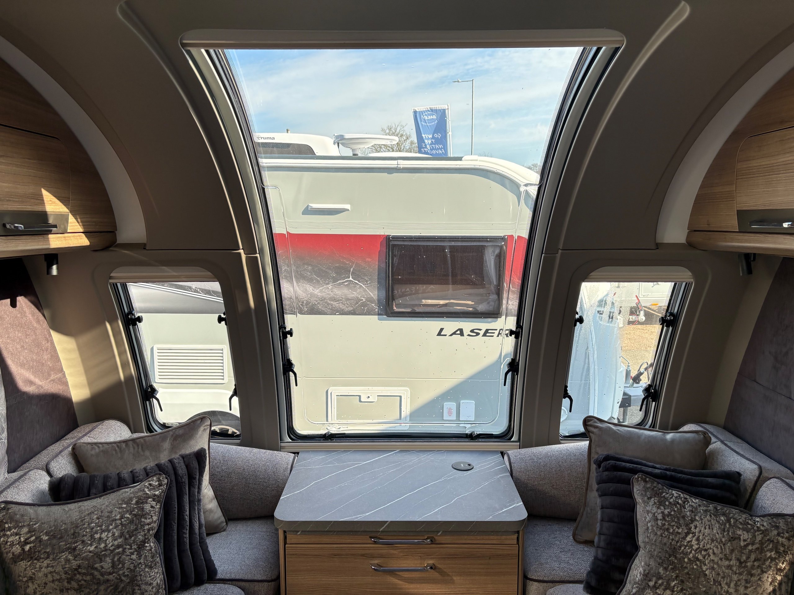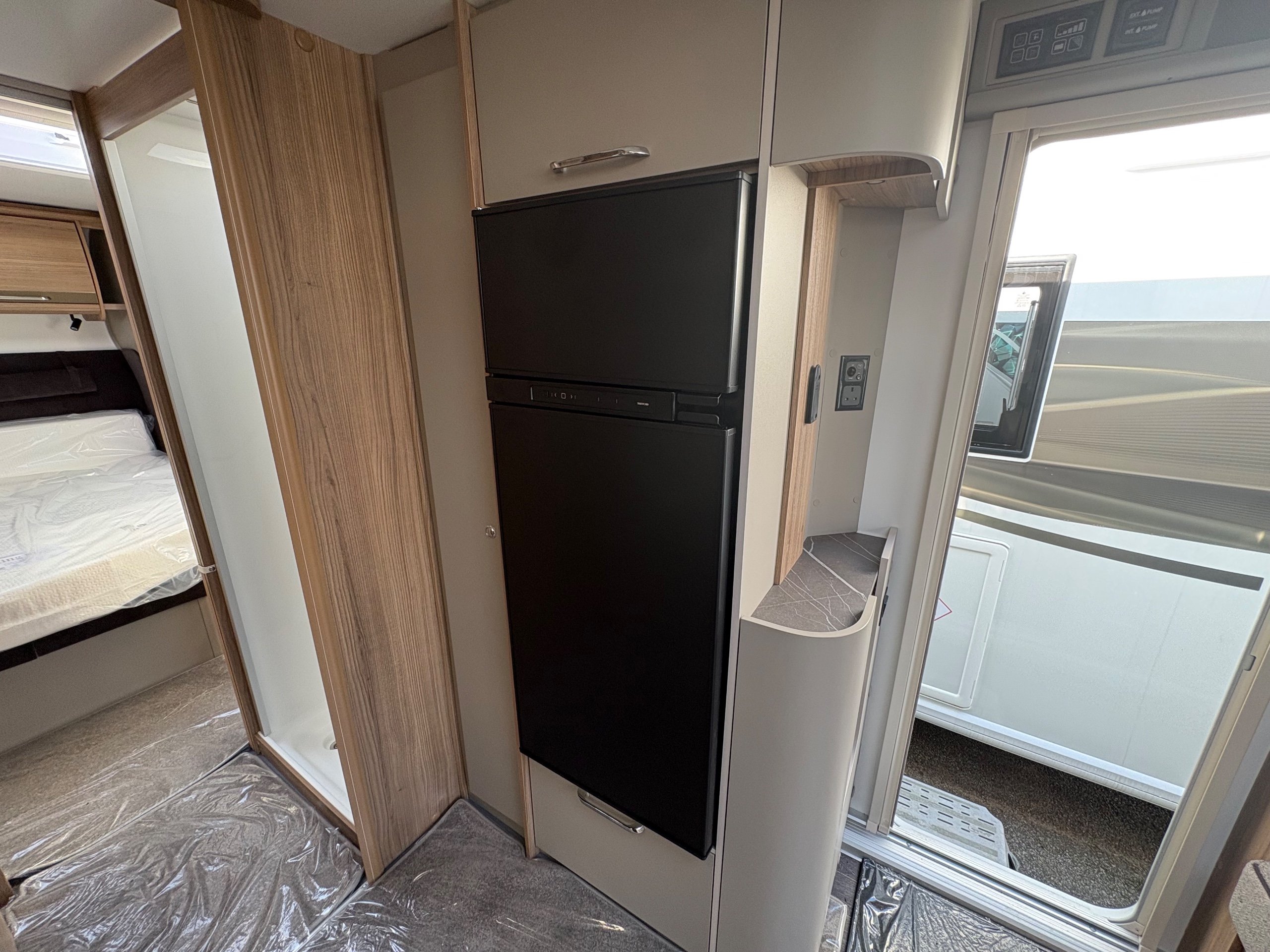 Year: 2026, Berth: 4, Internal length: 6.60m / 21'8", External length: 7.90m / 25'11", Width: 2.45m / 8', Unladen weight: 1703kg, MTPLM: 1863kg ( Upgraded MTPLM: 2000kg ), Awning size: 10.78m, Warranty: 3 years major components, 6 years bodyshell ( subject to terms and conditions ). This caravan is on a twin axle chassis with an eight feet body width. A large five foot wide rear island bed with generous storage, is a big feature of this caravan. The mid washroom has doors on both sides, allowing for privacy or to create a dressing space. The L shaped kitchen provides lots of work surface, with generous cupboard space and a metal pull out rack for smaller items. The parallel front seats gives lots of comfortable seating space with sprung cushions, a dedicated television area, wireless charging a bluetooth speaker for your entertainment. Wi-fi, alde heating , external gas and mains points, a roof mounted solar panel are just a few of the features fitted as standard on this top of the range model. -