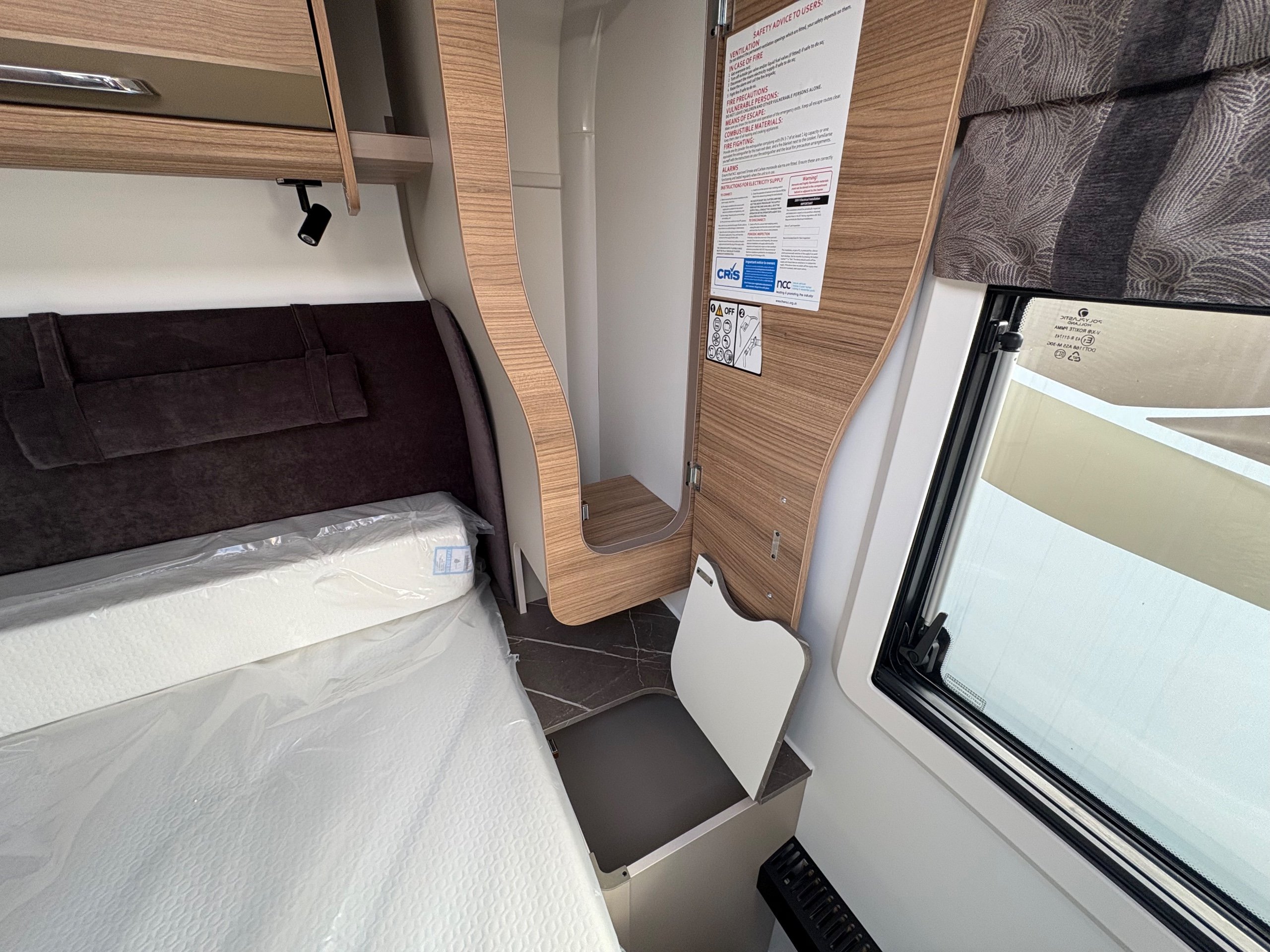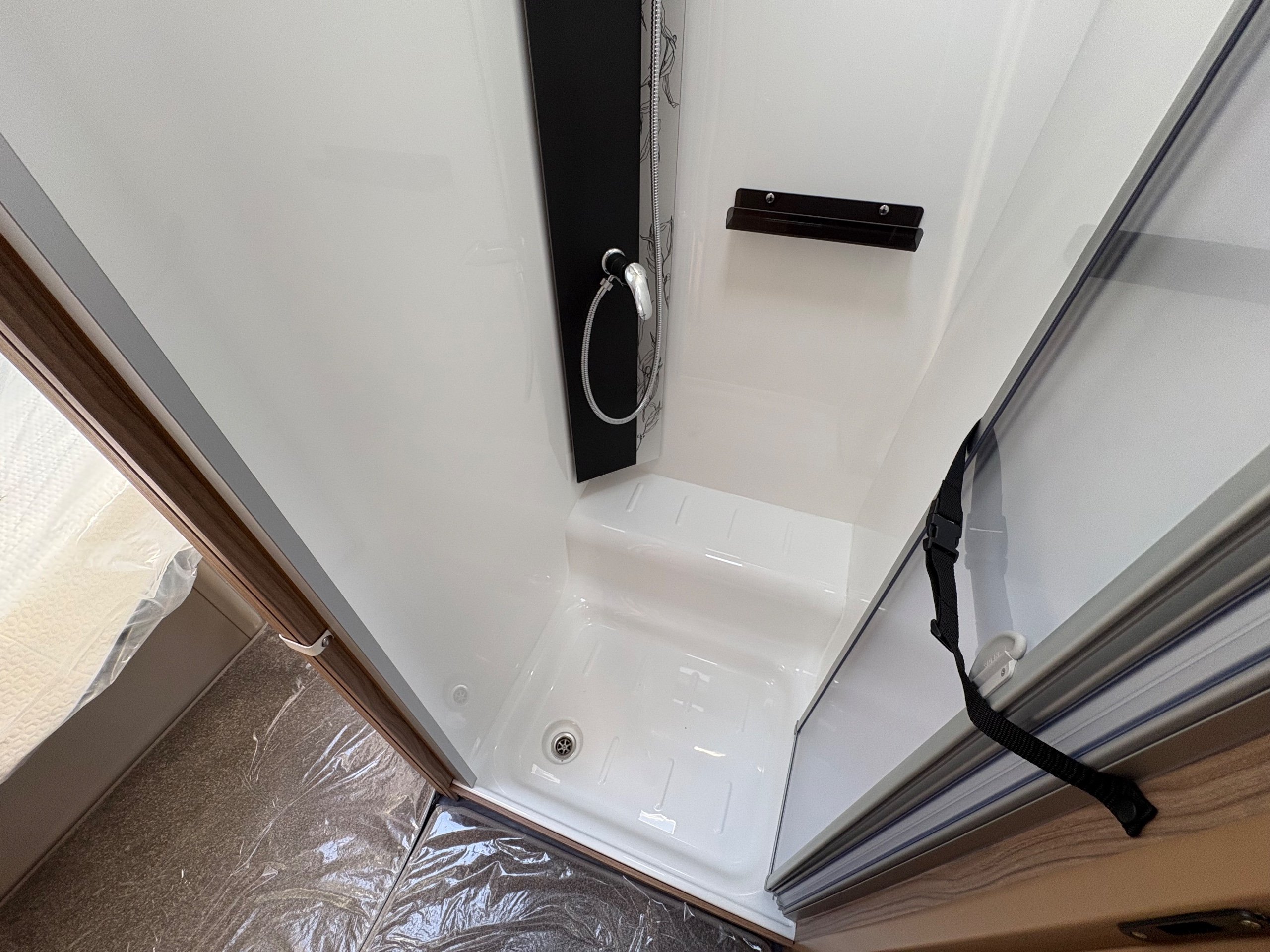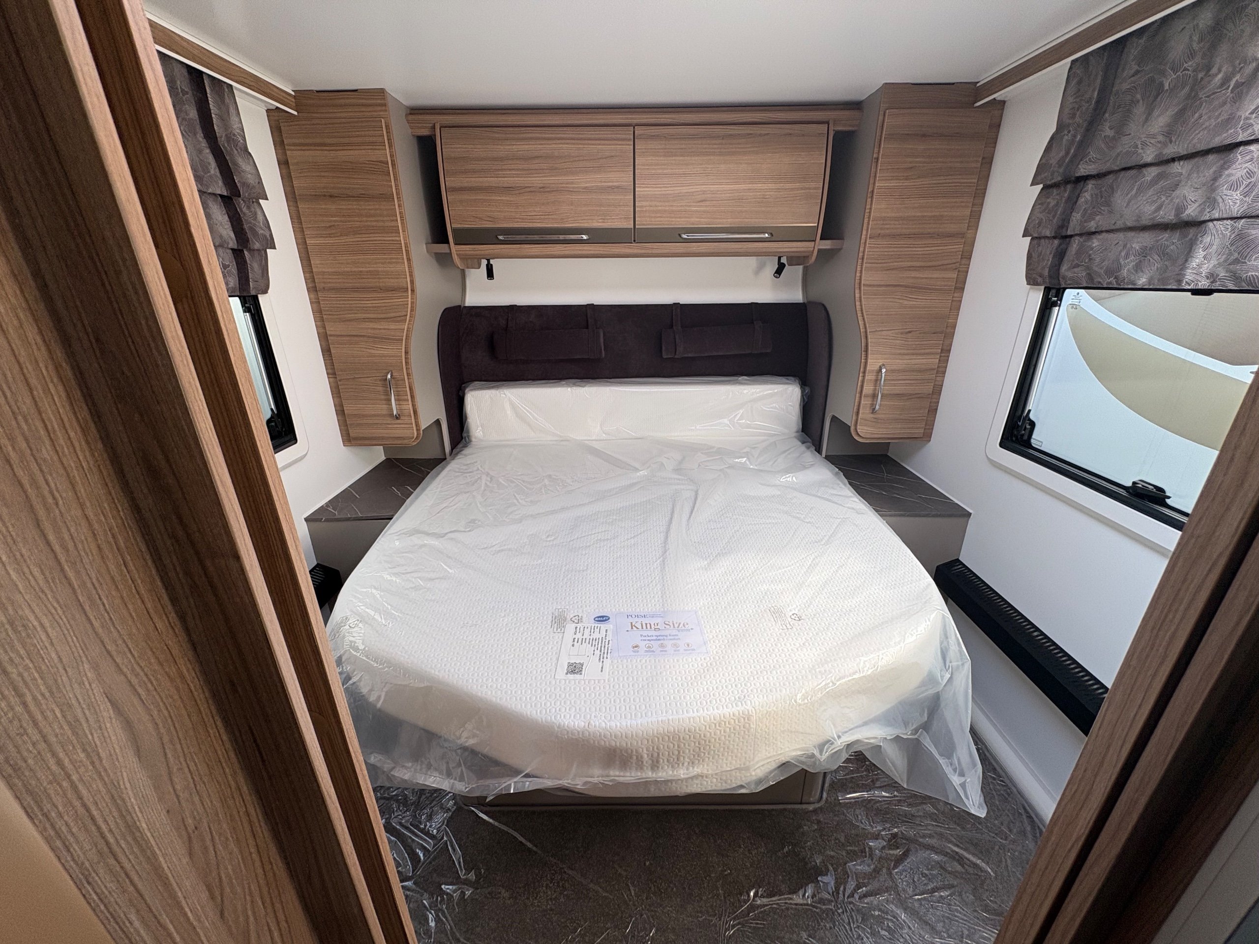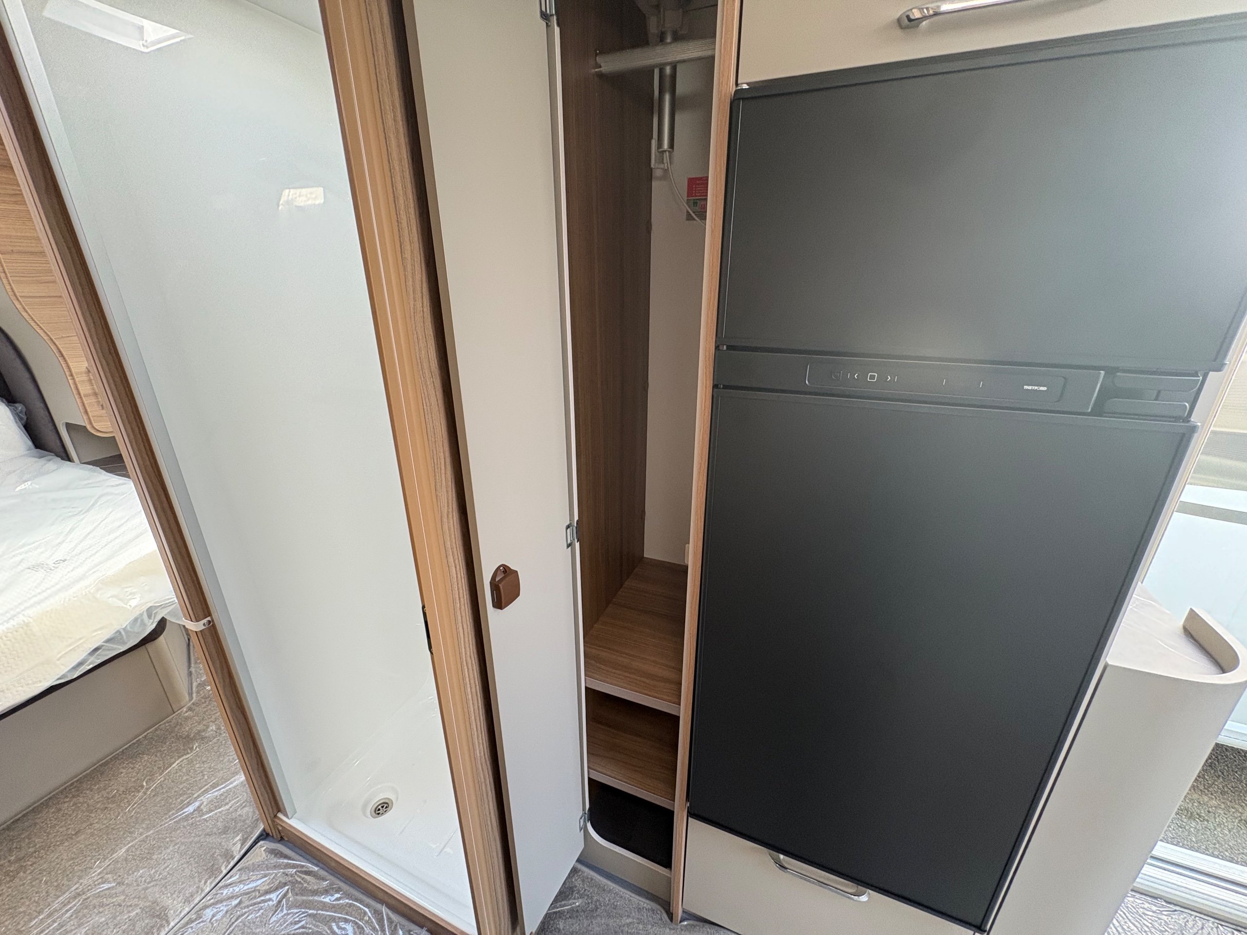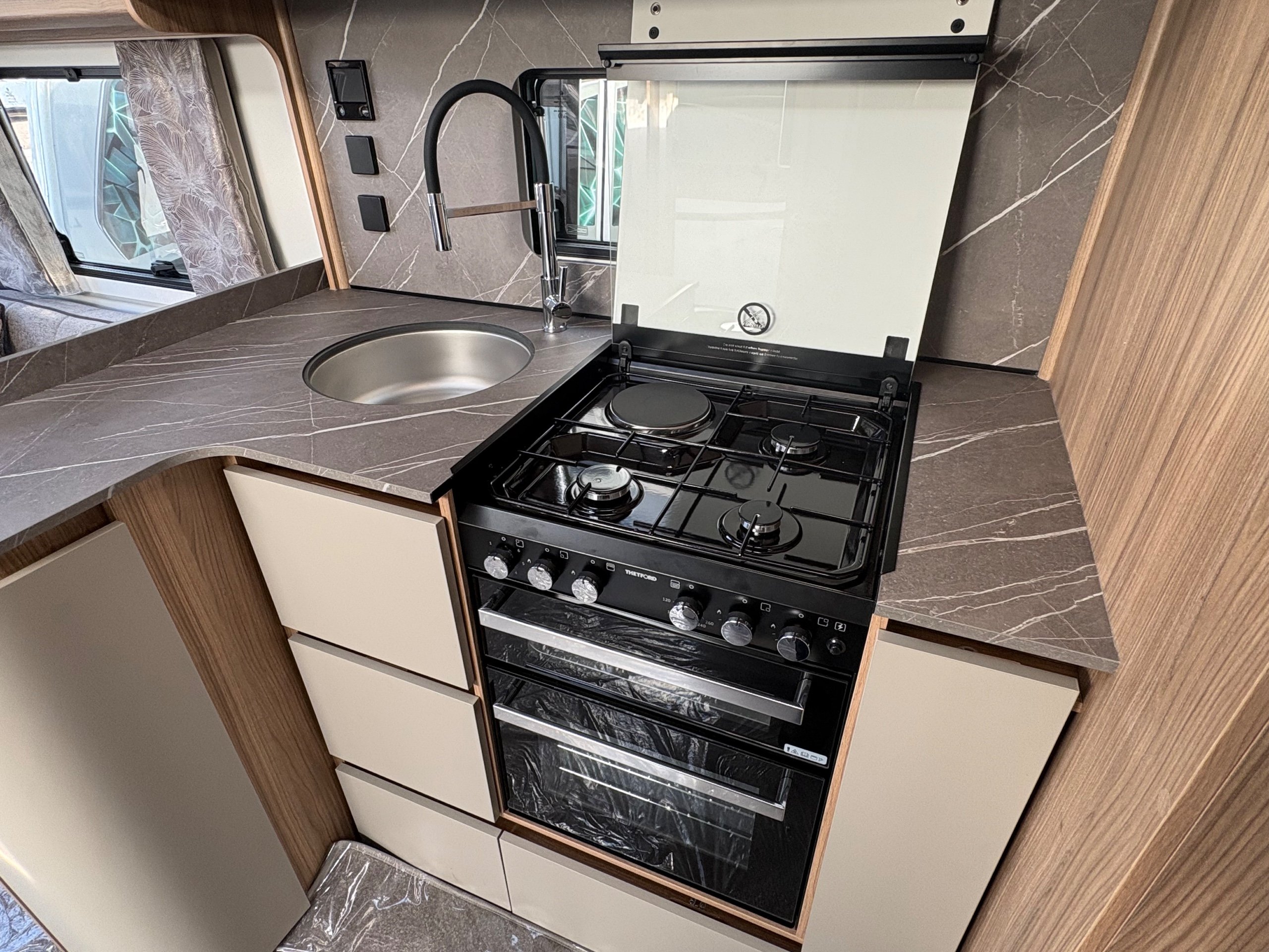 Year: 2026, Berth: 4, Internal length: 6.60m / 21'8", External length: 7.90m / 25'11", Width: 2.45m / 8', Unladen weight: 1703kg, MTPLM: 1863kg ( Upgraded MTPLM: 2000kg ), Awning size: 10.78m, Warranty: 3 years major components, 6 years bodyshell ( subject to terms and conditions ). This caravan is on a twin axle chassis with an eight feet body width. A large five foot wide rear island bed with generous storage, is a big feature of this caravan. The mid washroom has doors on both sides, allowing for privacy or to create a dressing space. The L shaped kitchen provides lots of work surface, with generous cupboard space and a metal pull out rack for smaller items. The parallel front seats gives lots of comfortable seating space with sprung cushions, a dedicated television area, wireless charging a bluetooth speaker for your entertainment. Wi-fi, alde heating , external gas and mains points, a roof mounted solar panel are just a few of the features fitted as standard on this top of the range model. -