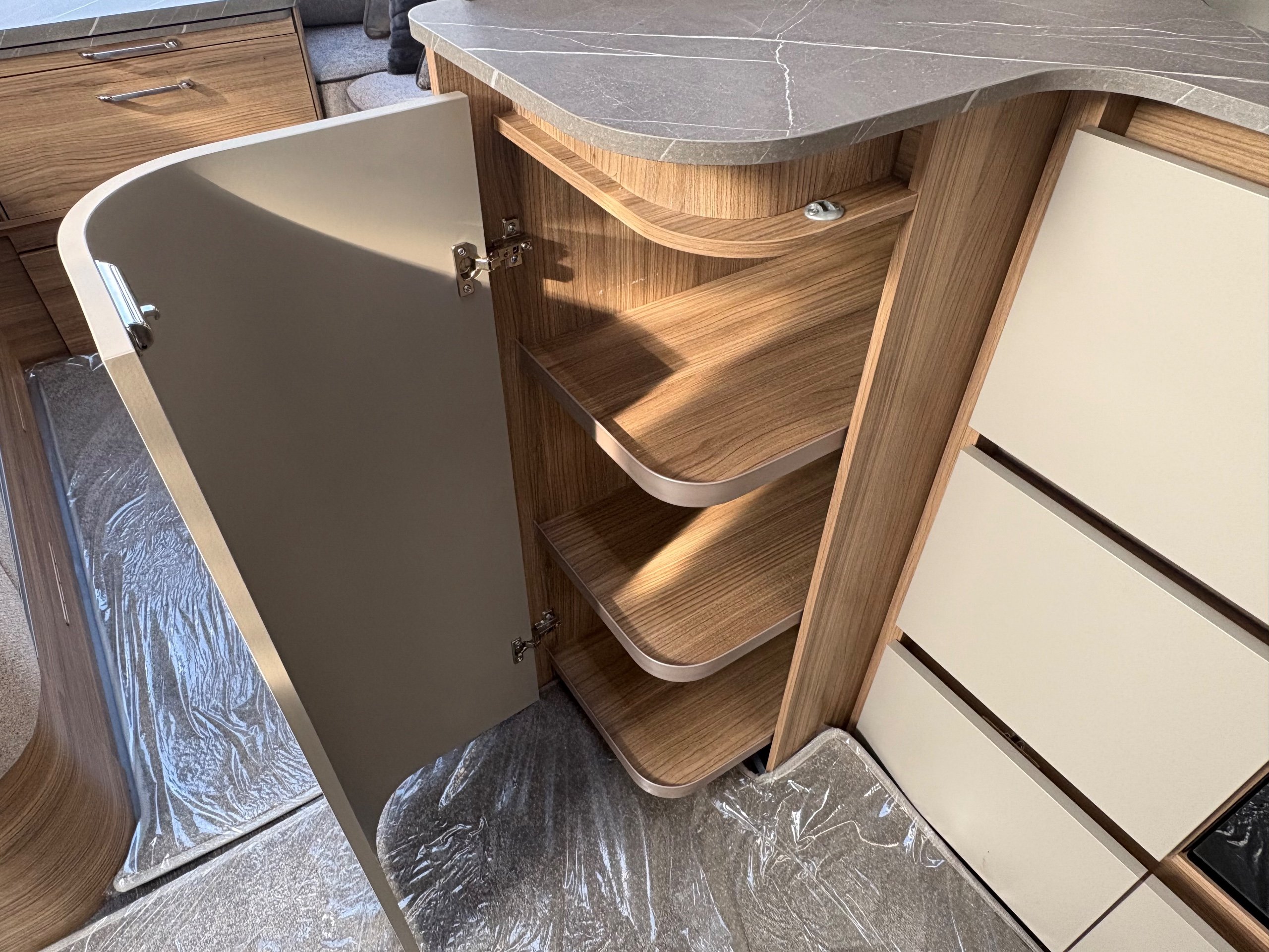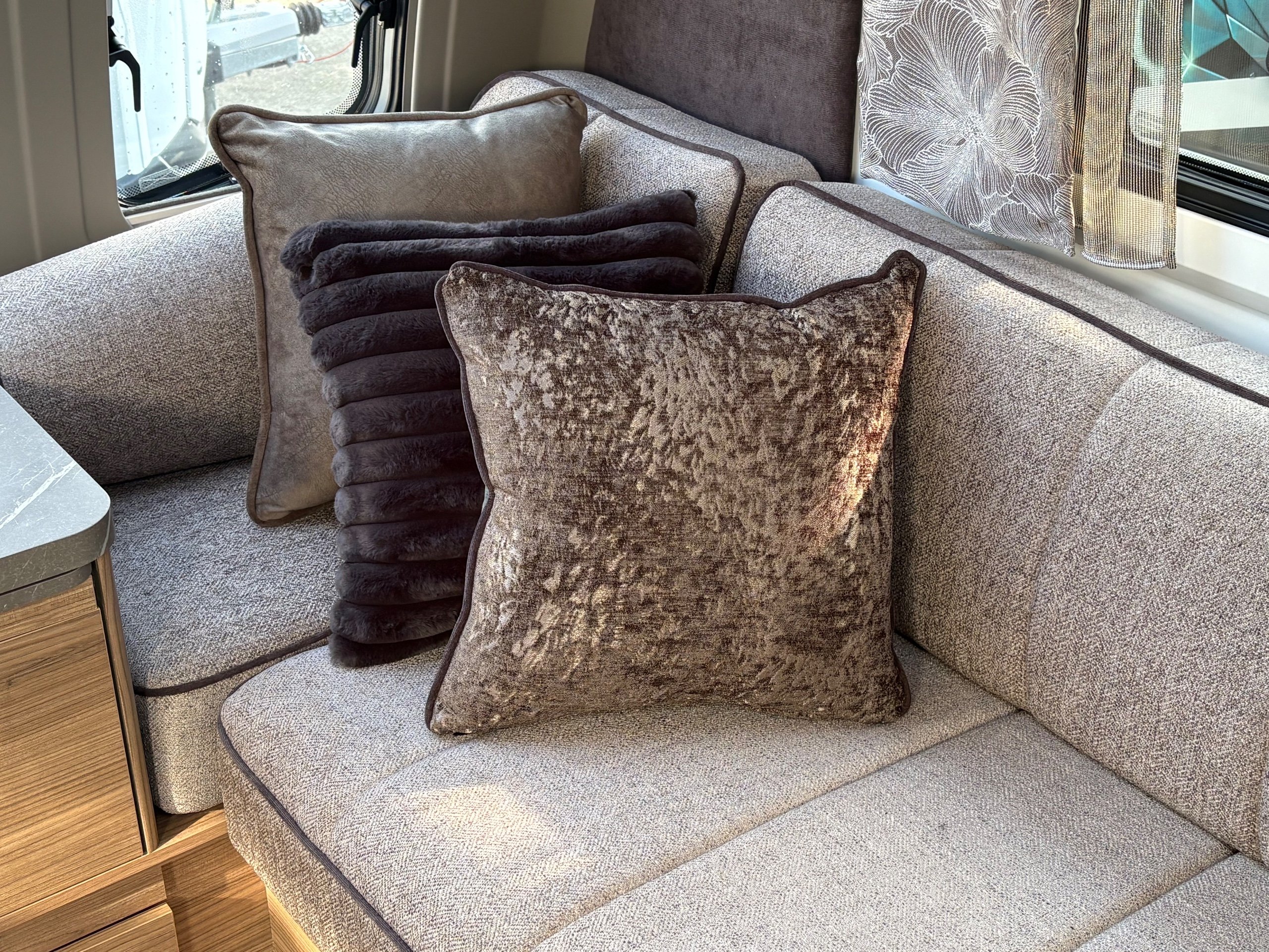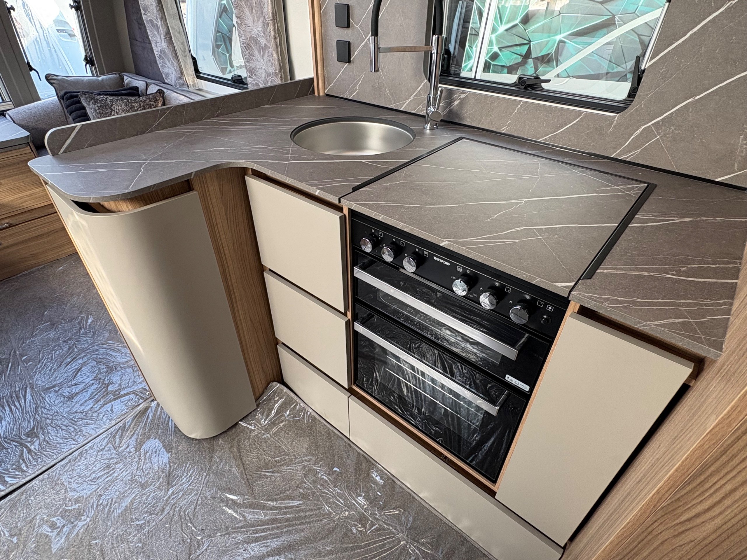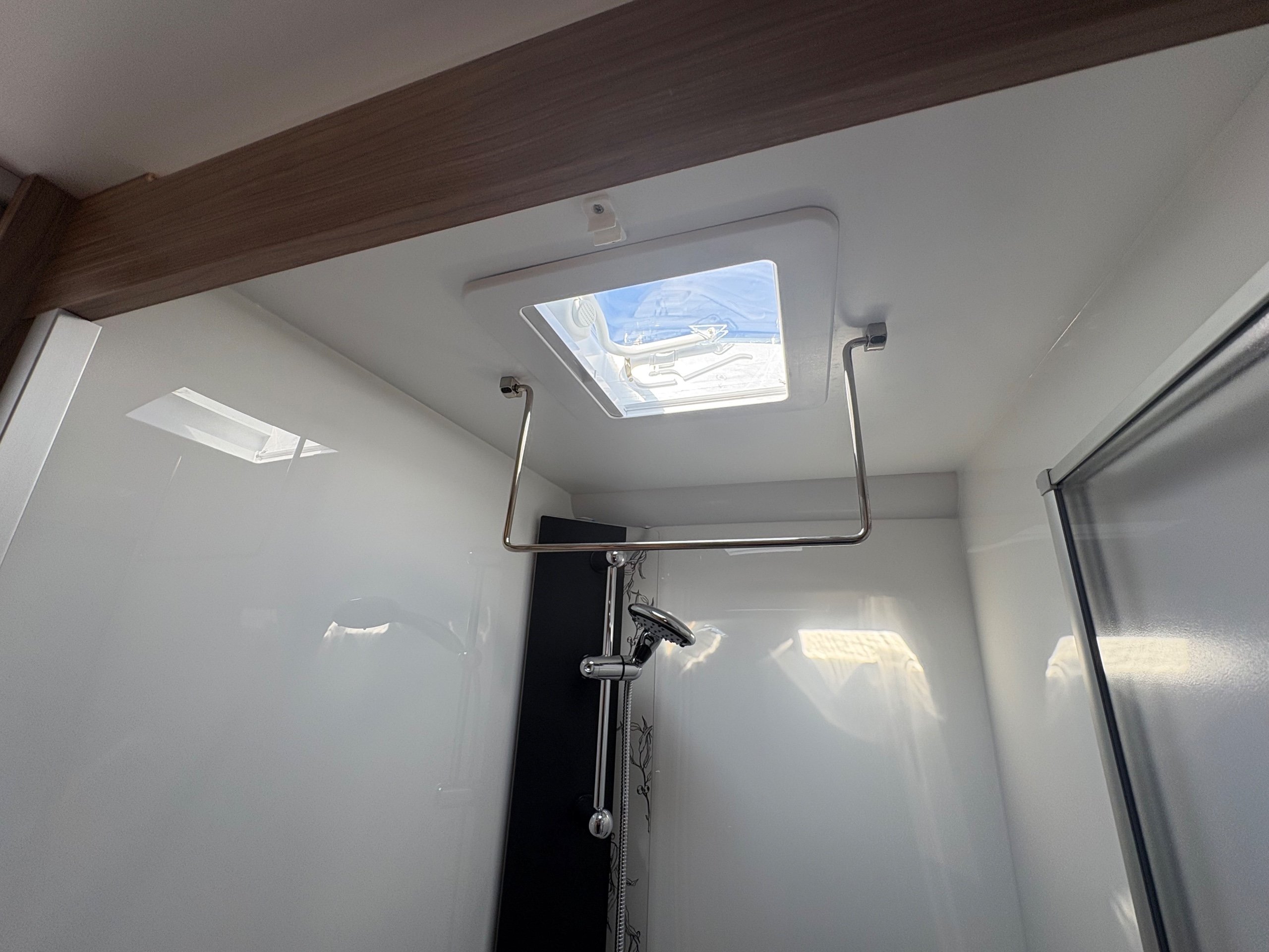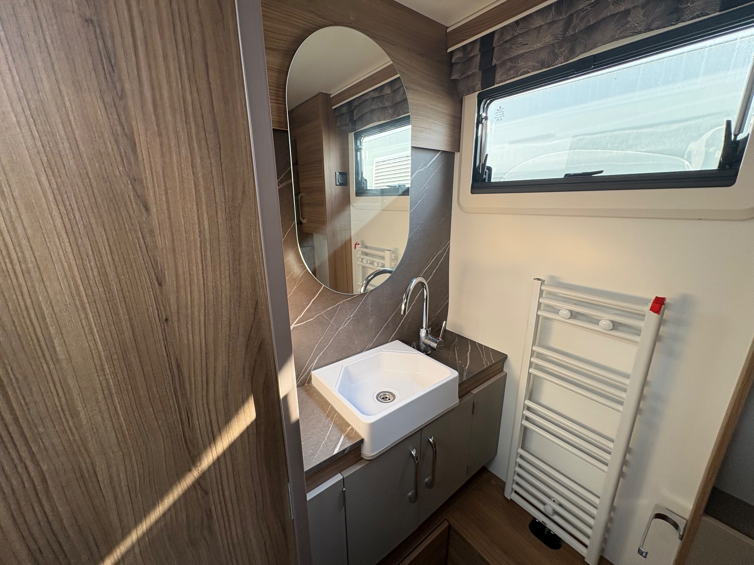 Year: 2026, Berth: 4, Internal length: 6.60m / 21'8", External length: 7.90m / 25'11", Width: 2.45m / 8', Unladen weight: 1703kg, MTPLM: 1863kg ( Upgraded MTPLM: 2000kg ), Awning size: 10.78m, Warranty: 3 years major components, 6 years bodyshell ( subject to terms and conditions ). This caravan is on a twin axle chassis with an eight feet body width. A large five foot wide rear island bed with generous storage, is a big feature of this caravan. The mid washroom has doors on both sides, allowing for privacy or to create a dressing space. The L shaped kitchen provides lots of work surface, with generous cupboard space and a metal pull out rack for smaller items. The parallel front seats gives lots of comfortable seating space with sprung cushions, a dedicated television area, wireless charging a bluetooth speaker for your entertainment. Wi-fi, alde heating , external gas and mains points, a roof mounted solar panel are just a few of the features fitted as standard on this top of the range model. -
