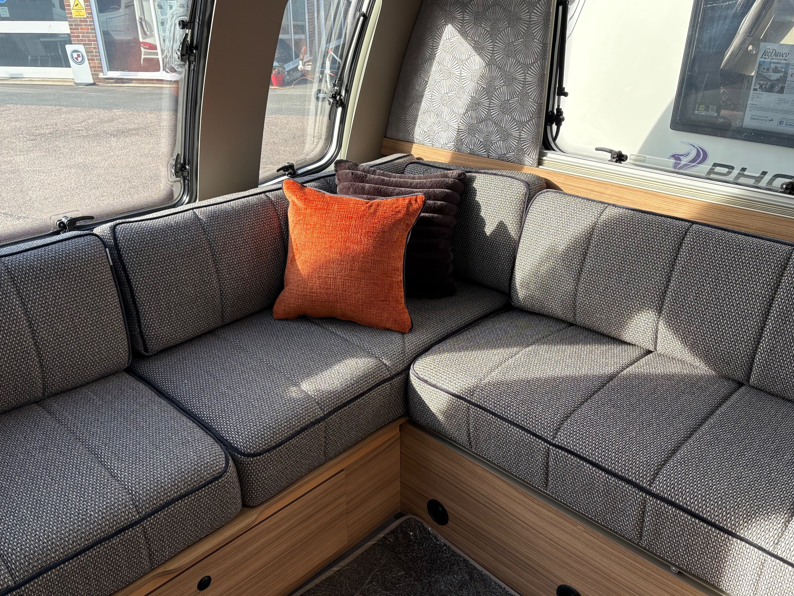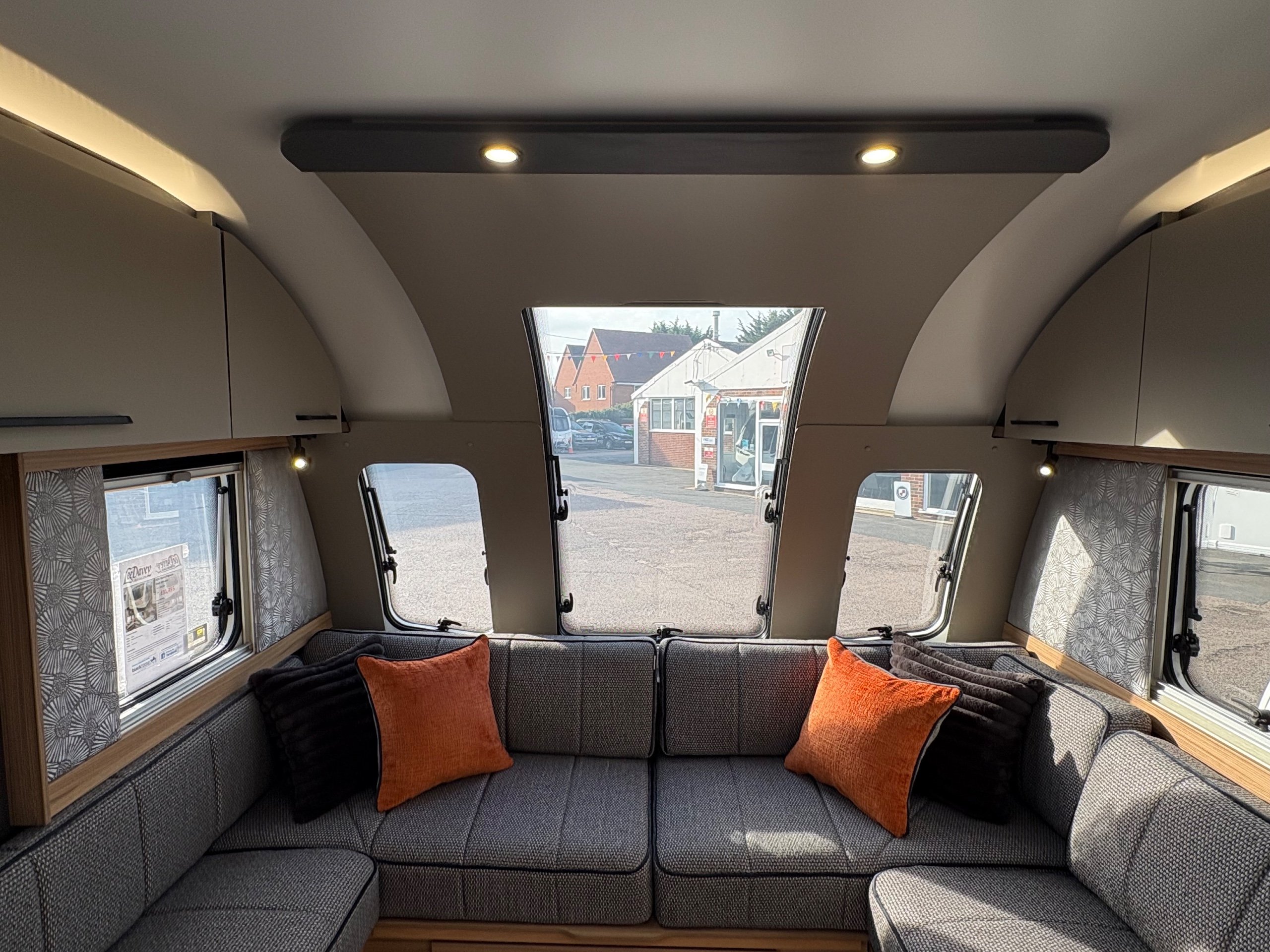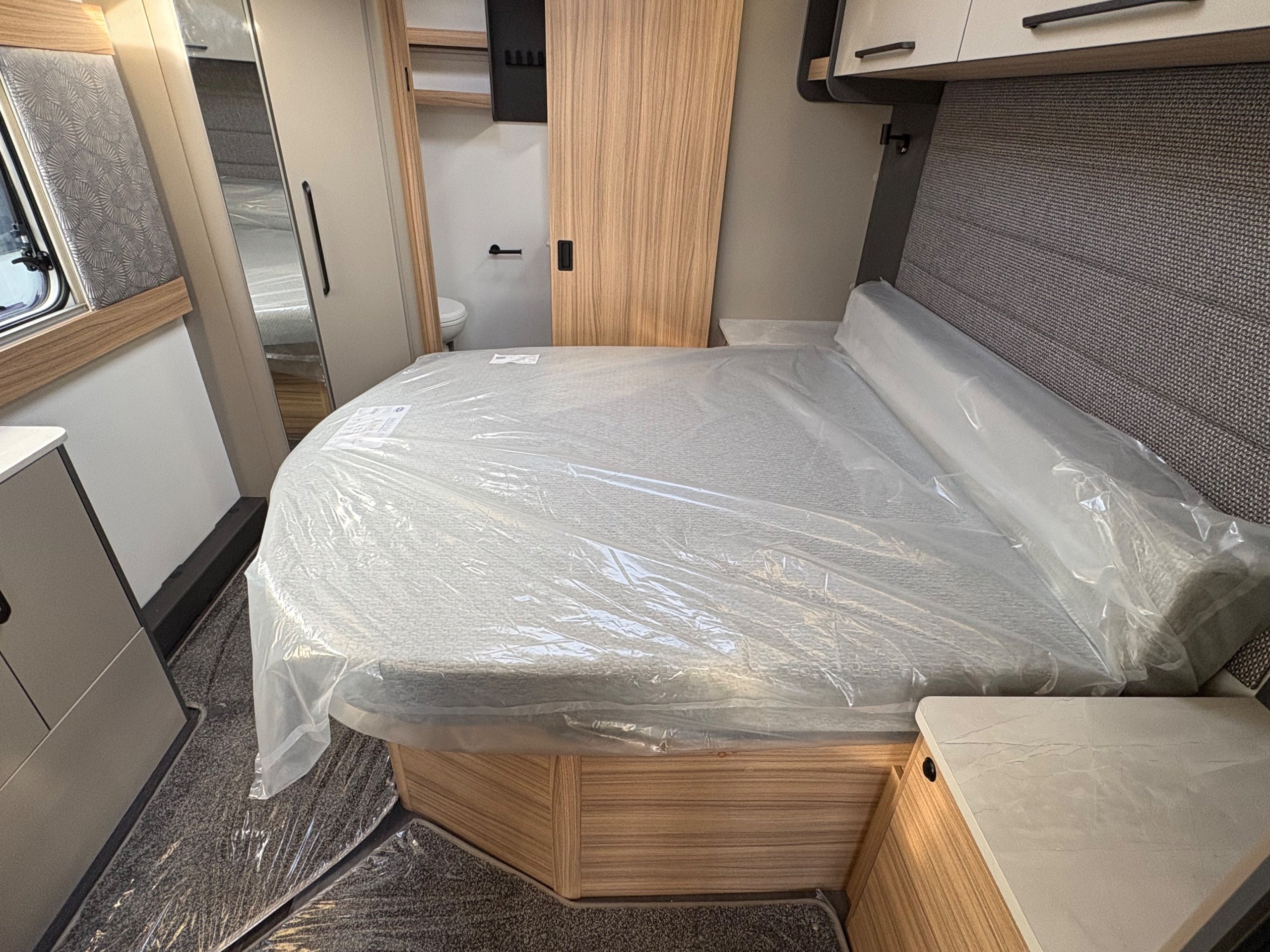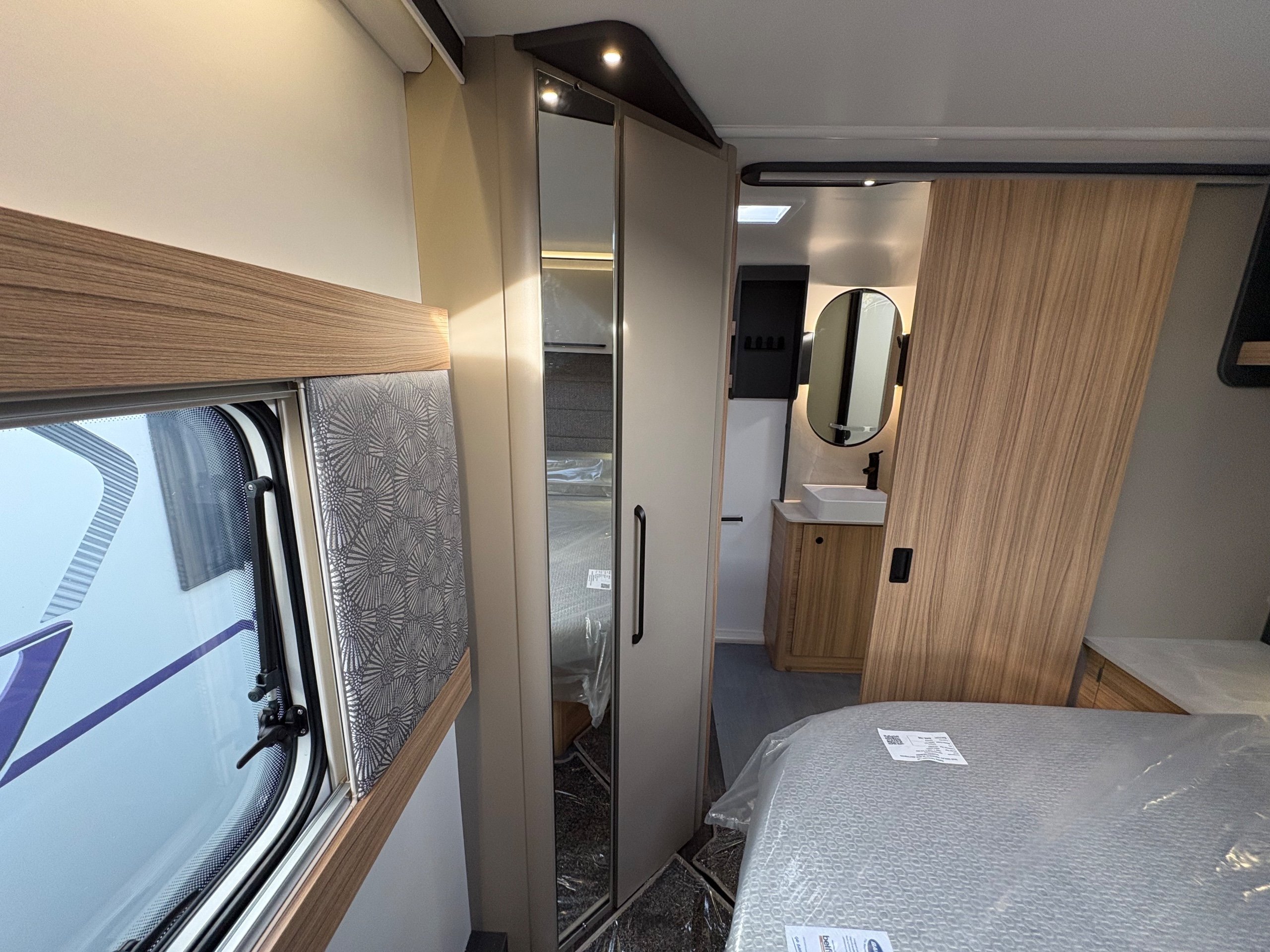 Year: 2026, Berth: 4, Internal length: 6.33m / 20'9", External length: 7.91m / 25'11", Width: 2.43m / 8', Unladen weight: 1529kg, MTPLM: 1689kg ( Awning size: 1800kg ), Awning size: 10.89m, Warranty: 3 years major components, 6 years bodyshell ( subject to terms and conditions ). This eight feet wide twin axle model, gives plenty of room to relax and enjoy this caravan. The C shaped lounge provides plenty of floor space ideal for pets as well as their owners, along with a dedicated television bracket and wireless phone charging. The bedroom has a five foot wide mattress for extra comfort, generous wardrobe space and a large rear washroom. Solar panels, alko ATC braking and external gas and mains points are just some of the features on this model. -