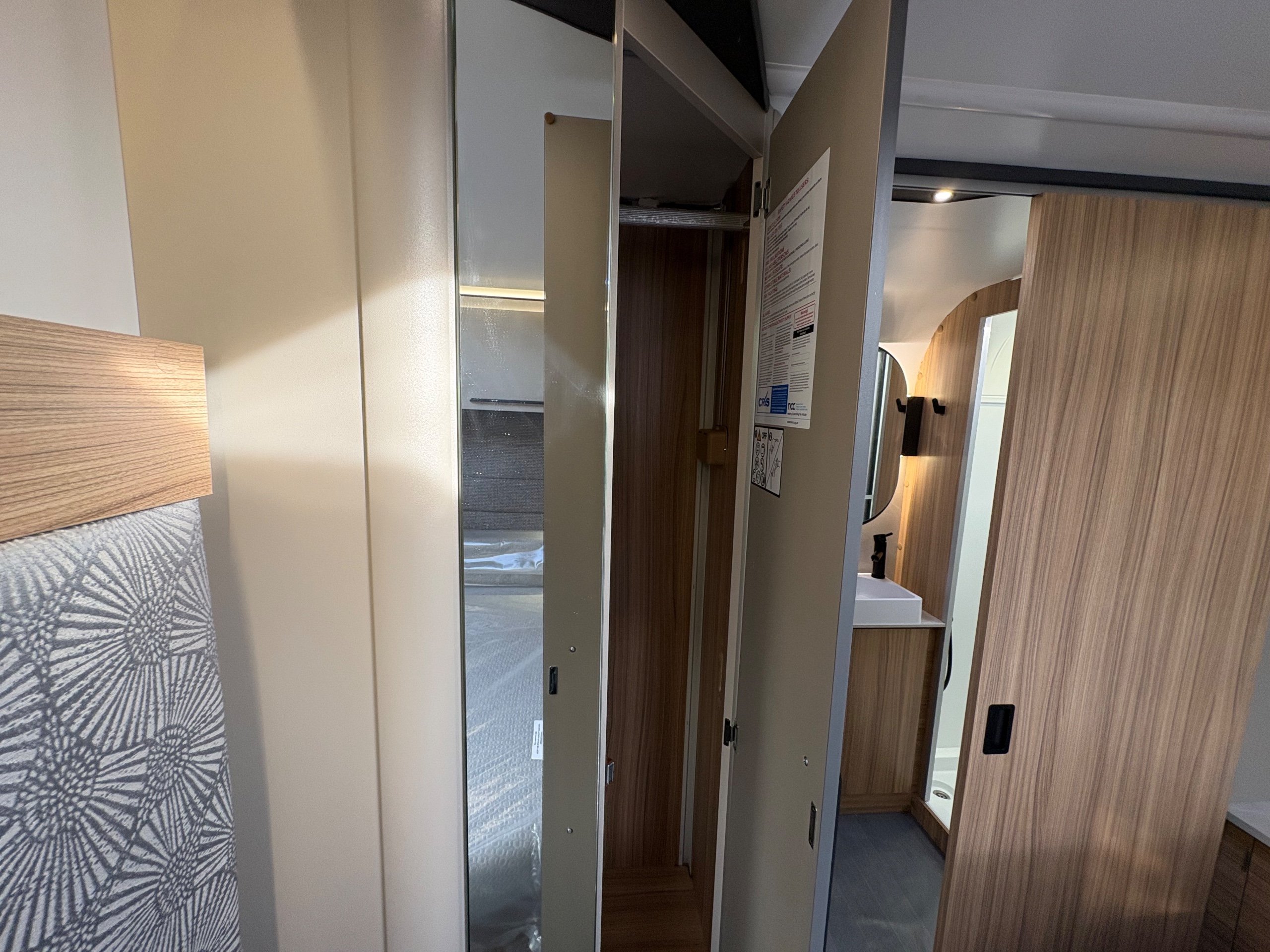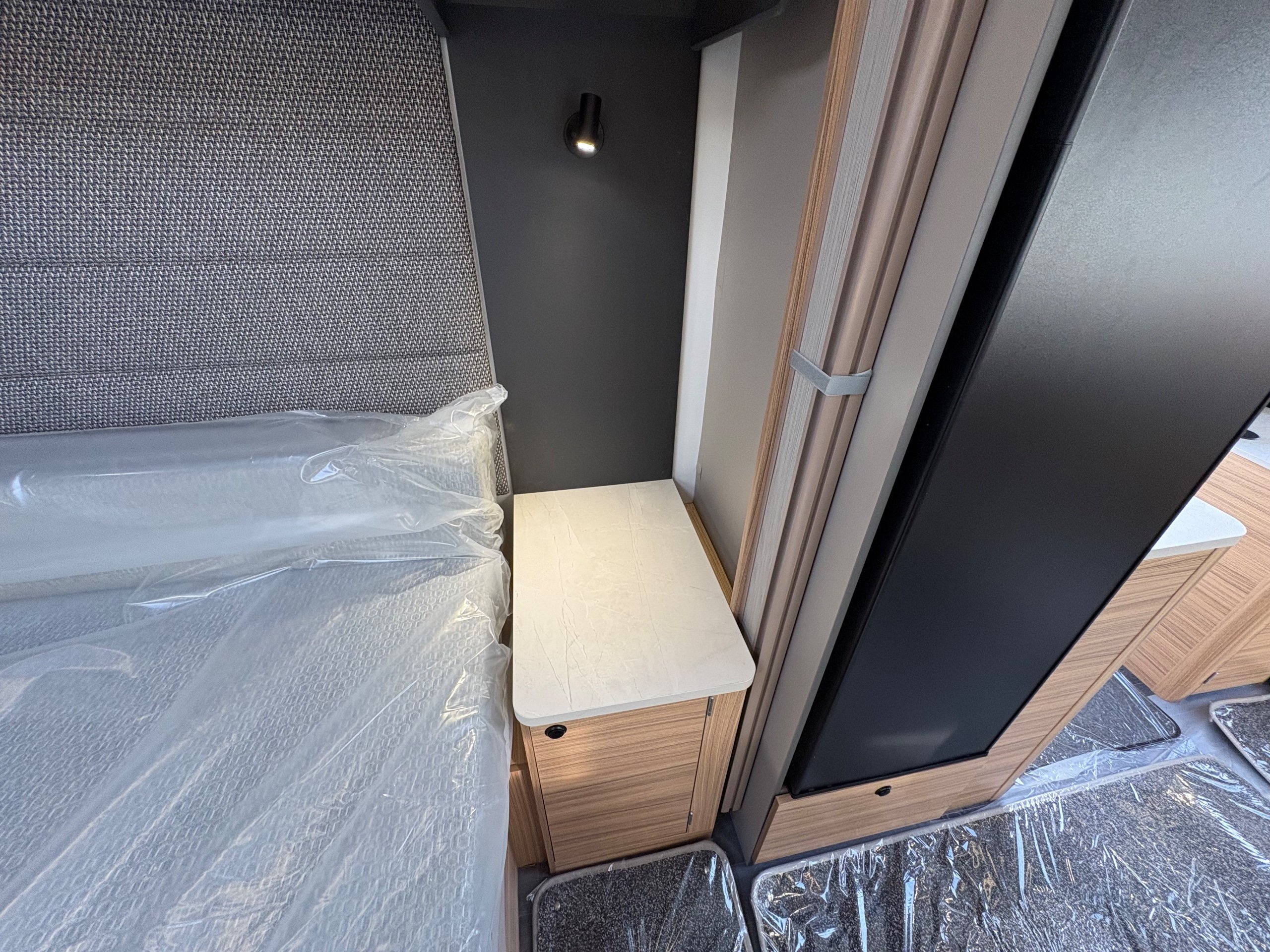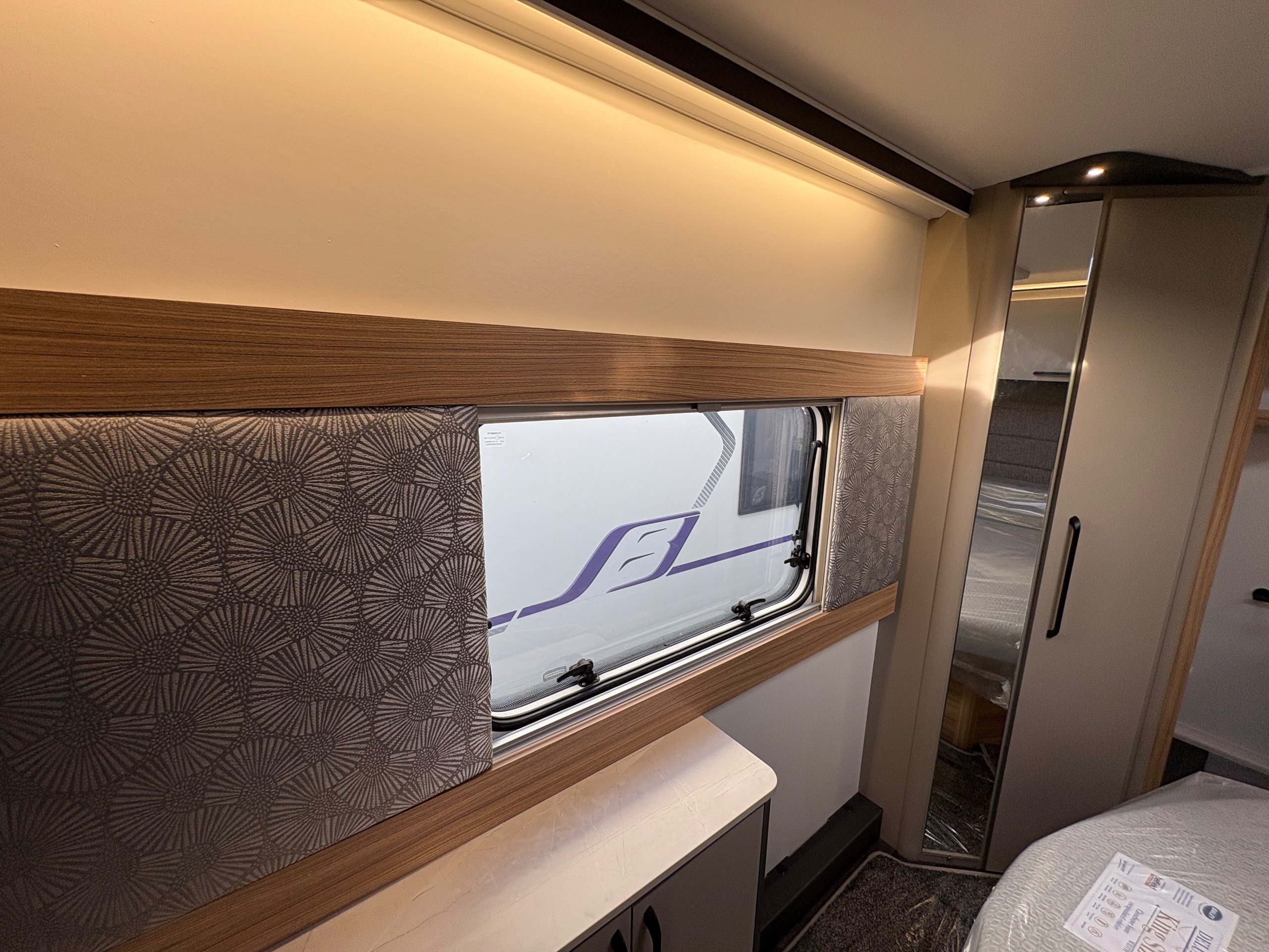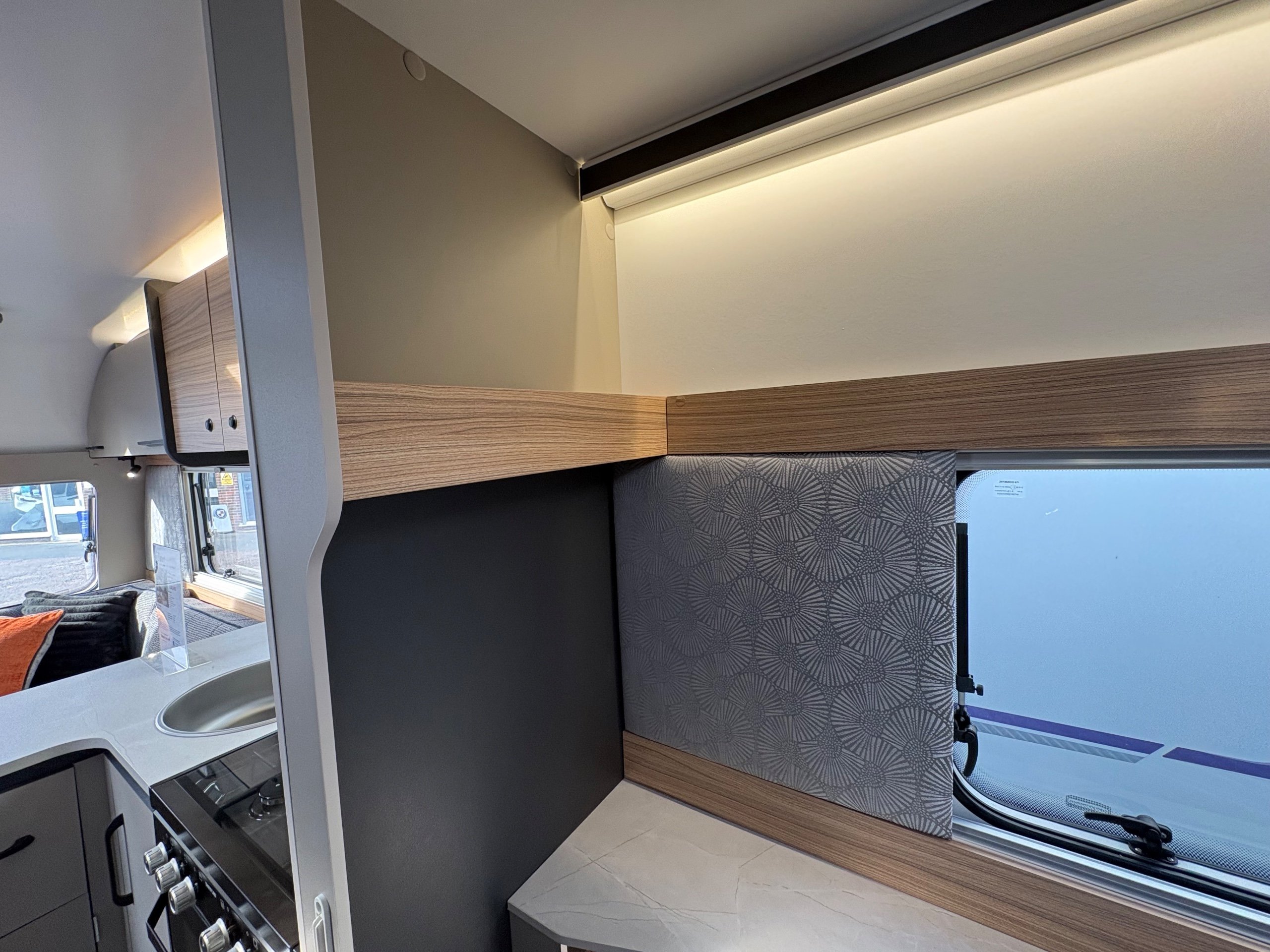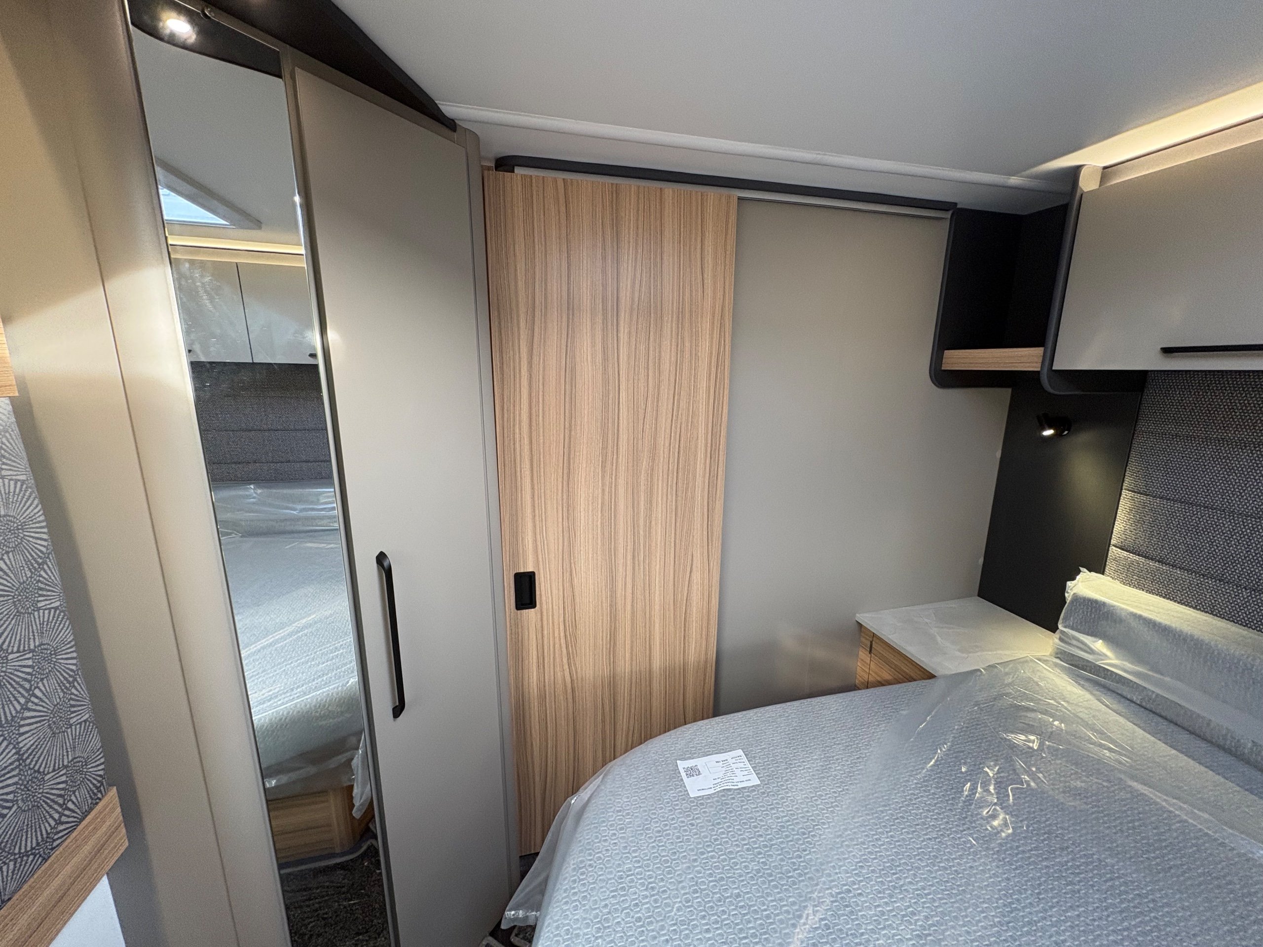 Year: 2026, Berth: 4, Internal length: 6.33m / 20'9", External length: 7.91m / 25'11", Width: 2.43m / 8', Unladen weight: 1529kg, MTPLM: 1689kg ( Awning size: 1800kg ), Awning size: 10.89m, Warranty: 3 years major components, 6 years bodyshell ( subject to terms and conditions ). This eight feet wide twin axle model, gives plenty of room to relax and enjoy this caravan. The C shaped lounge provides plenty of floor space ideal for pets as well as their owners, along with a dedicated television bracket and wireless phone charging. The bedroom has a five foot wide mattress for extra comfort, generous wardrobe space and a large rear washroom. Solar panels, alko ATC braking and external gas and mains points are just some of the features on this model. -