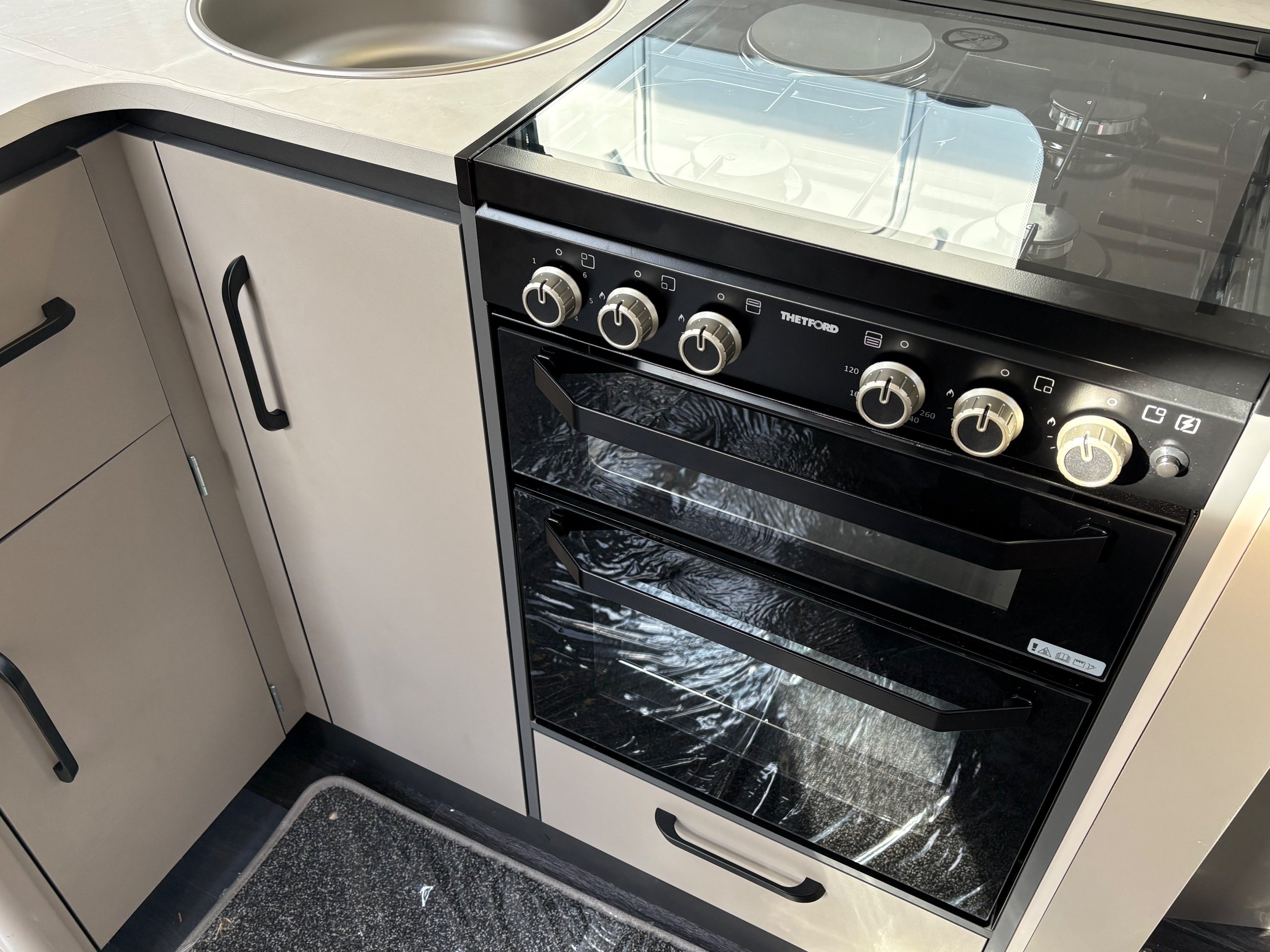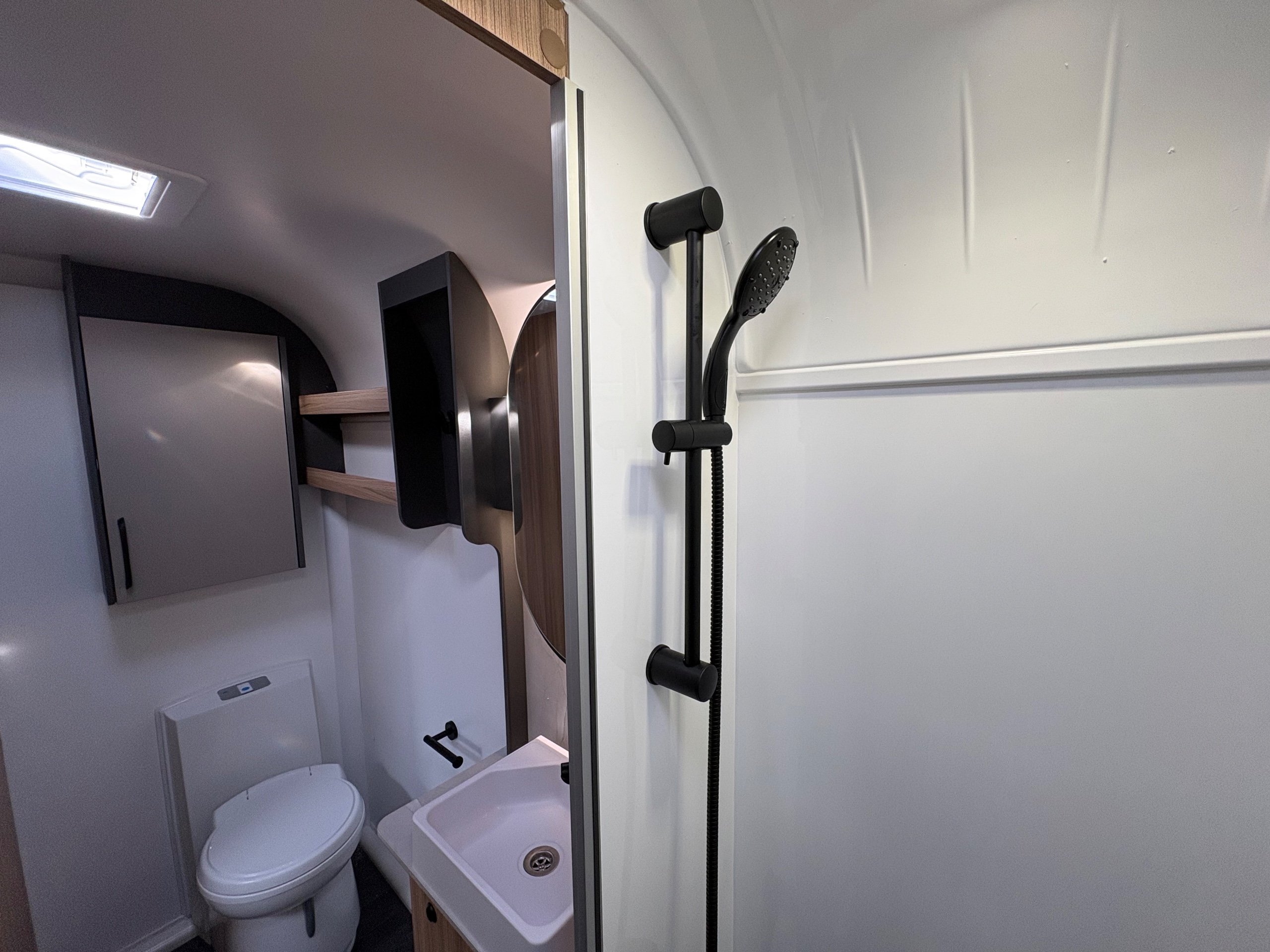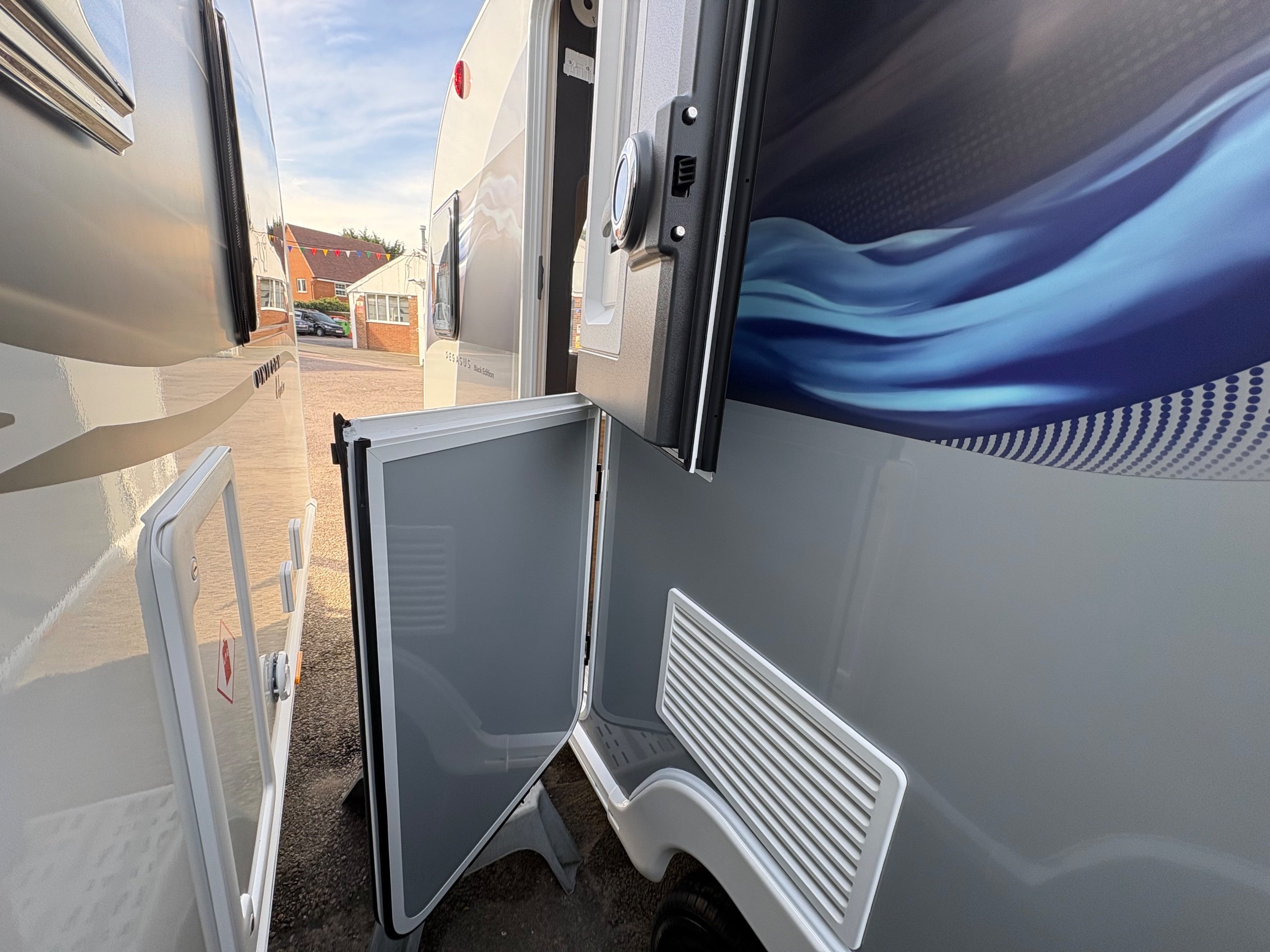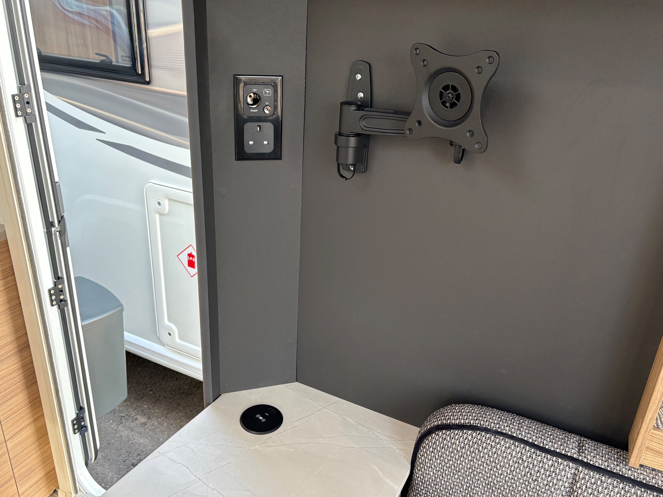 Year: 2026, Berth: 4, Internal length: 6.33m / 20'9", External length: 7.91m / 25'11", Width: 2.43m / 8', Unladen weight: 1529kg, MTPLM: 1689kg ( Awning size: 1800kg ), Awning size: 10.89m, Warranty: 3 years major components, 6 years bodyshell ( subject to terms and conditions ). This eight feet wide twin axle model, gives plenty of room to relax and enjoy this caravan. The C shaped lounge provides plenty of floor space ideal for pets as well as their owners, along with a dedicated television bracket and wireless phone charging. The bedroom has a five foot wide mattress for extra comfort, generous wardrobe space and a large rear washroom. Solar panels, alko ATC braking and external gas and mains points are just some of the features on this model. -