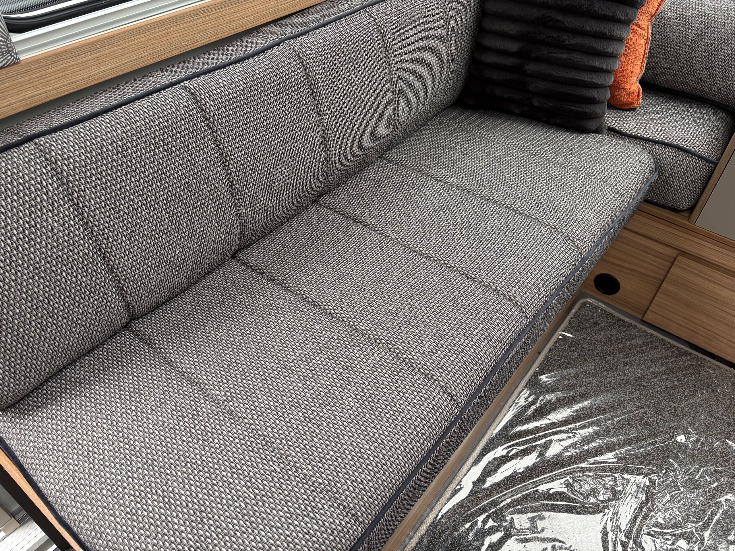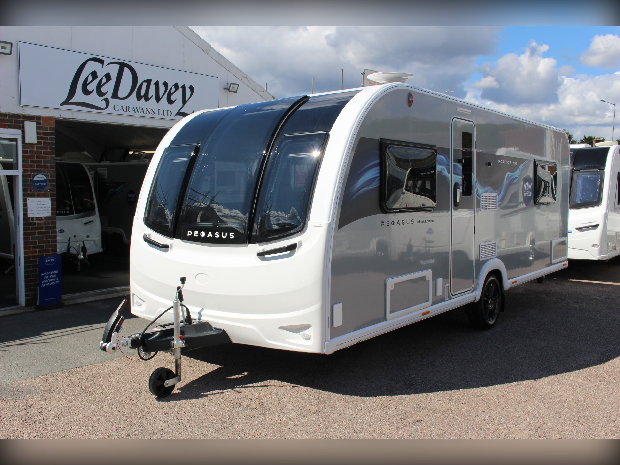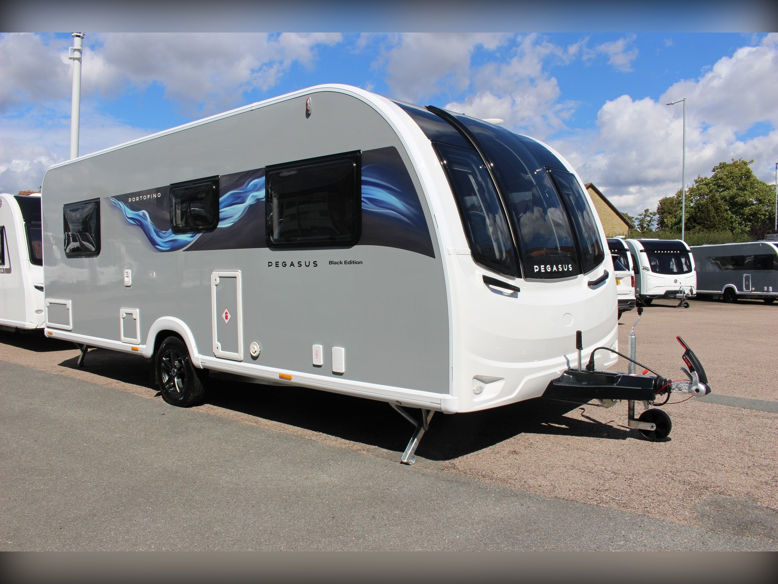 Year: 2026, Berth: 4, Internal length: 5.91m / 19'5", External length: 7.35m / 24'1", Width: 2.43m / 8', Unladen weight: 1444kg, MTPLM: 1599kg, Awning size: 10.43m, Warranty: 3 years major components, 6 years bodyshell ( subject to terms and conditions ). The Pegasus range has been updated for 2026, with the Black edition. New black accents are present on the taps, shower, wheels and new style decals on the outside. The kitchen worktop extension flap and sonos bluetooth speaker has also been added, along with a modified washroom door providing extra space in the washroom, along with a larger solar panel now being fitted. To top it all the wide eight foot wide body provides more room throughout the caravan. -