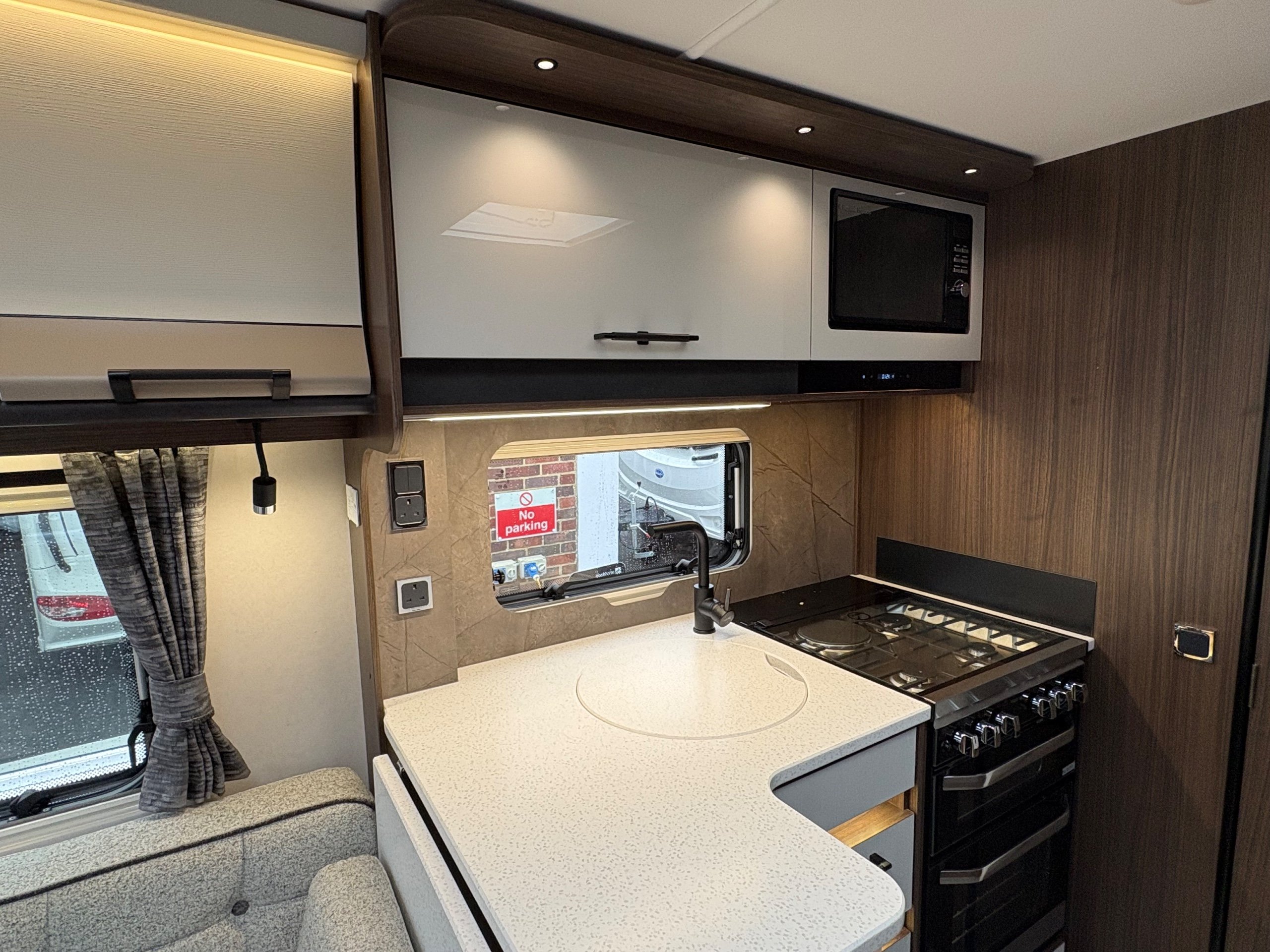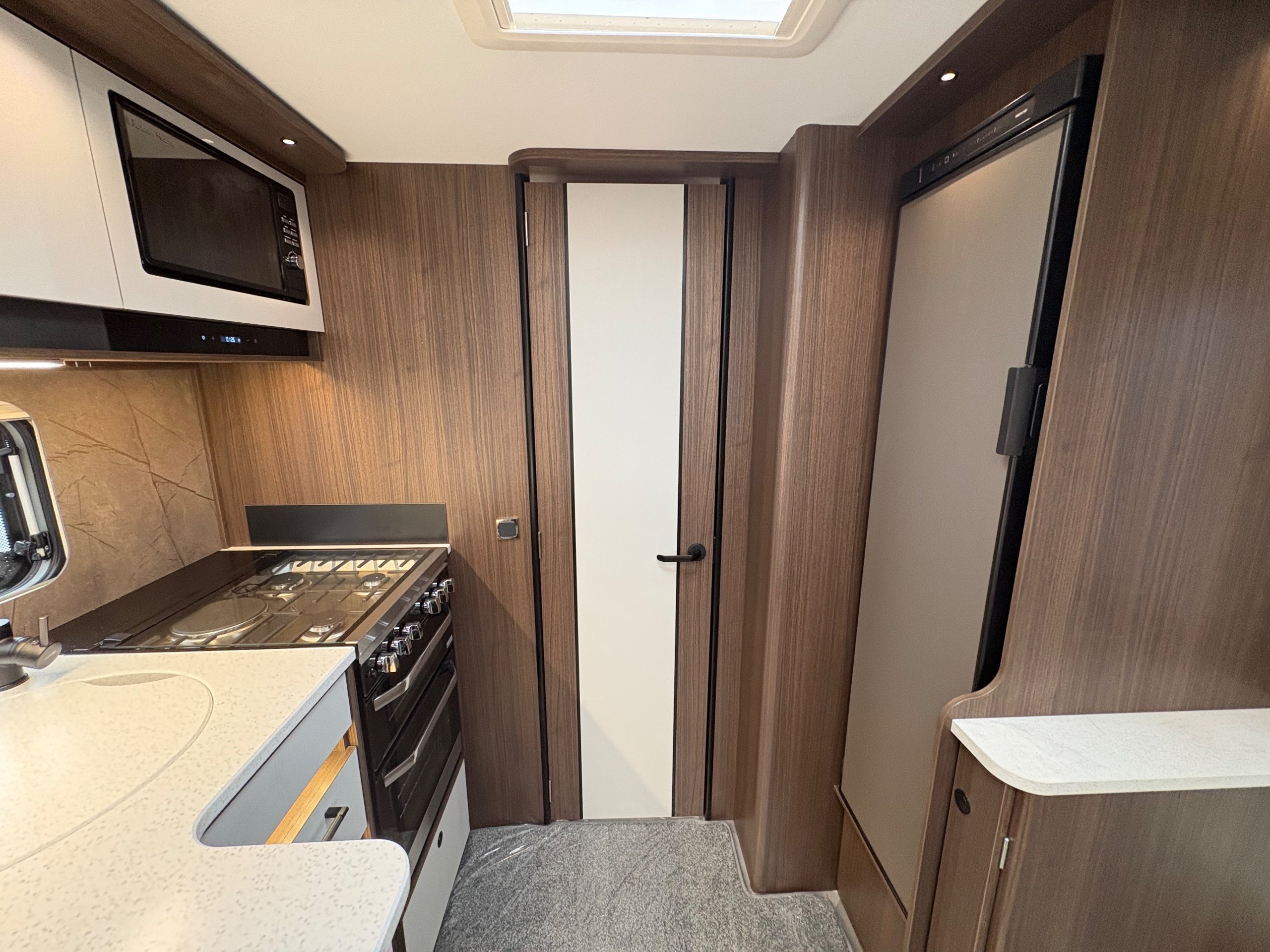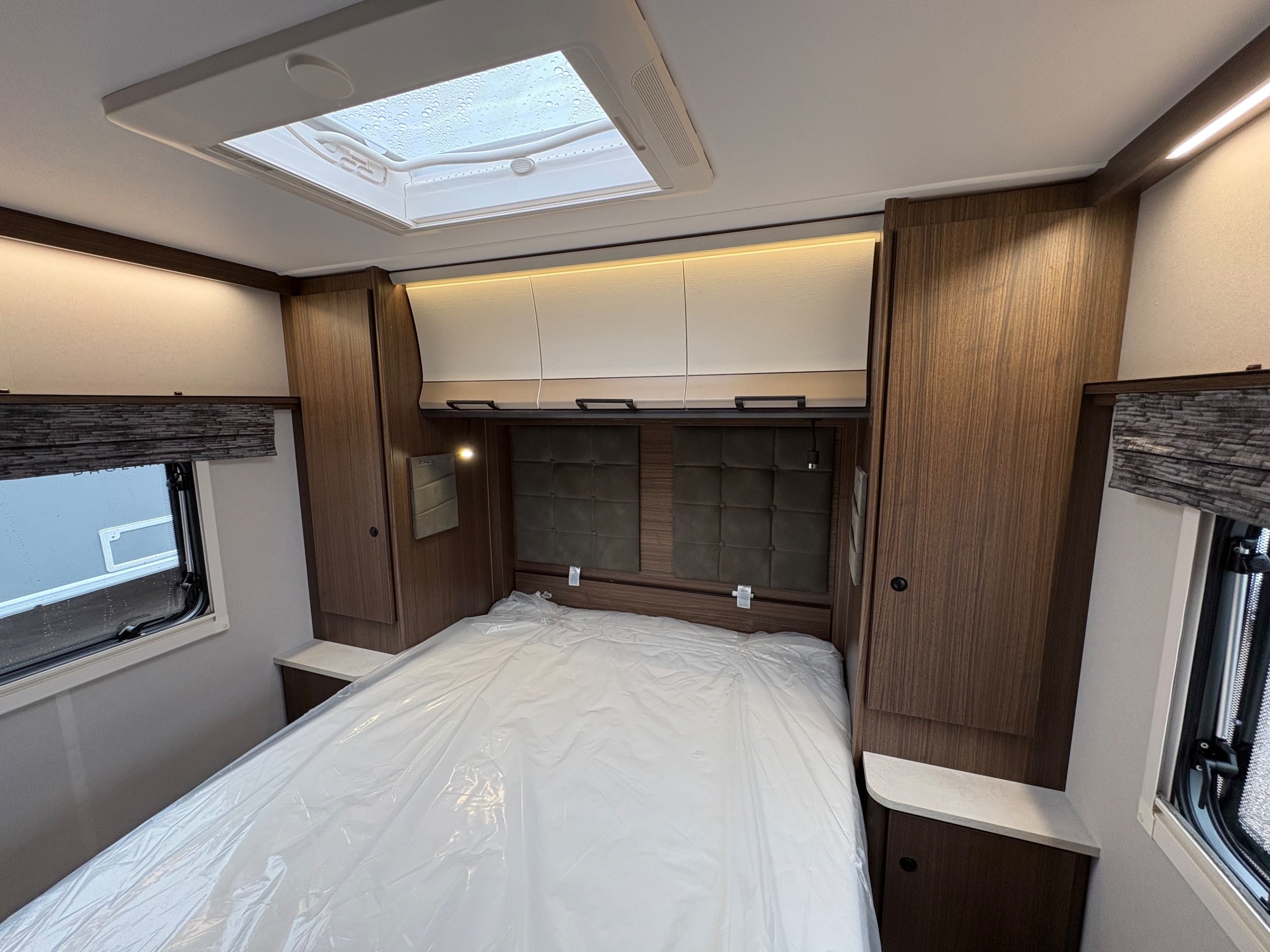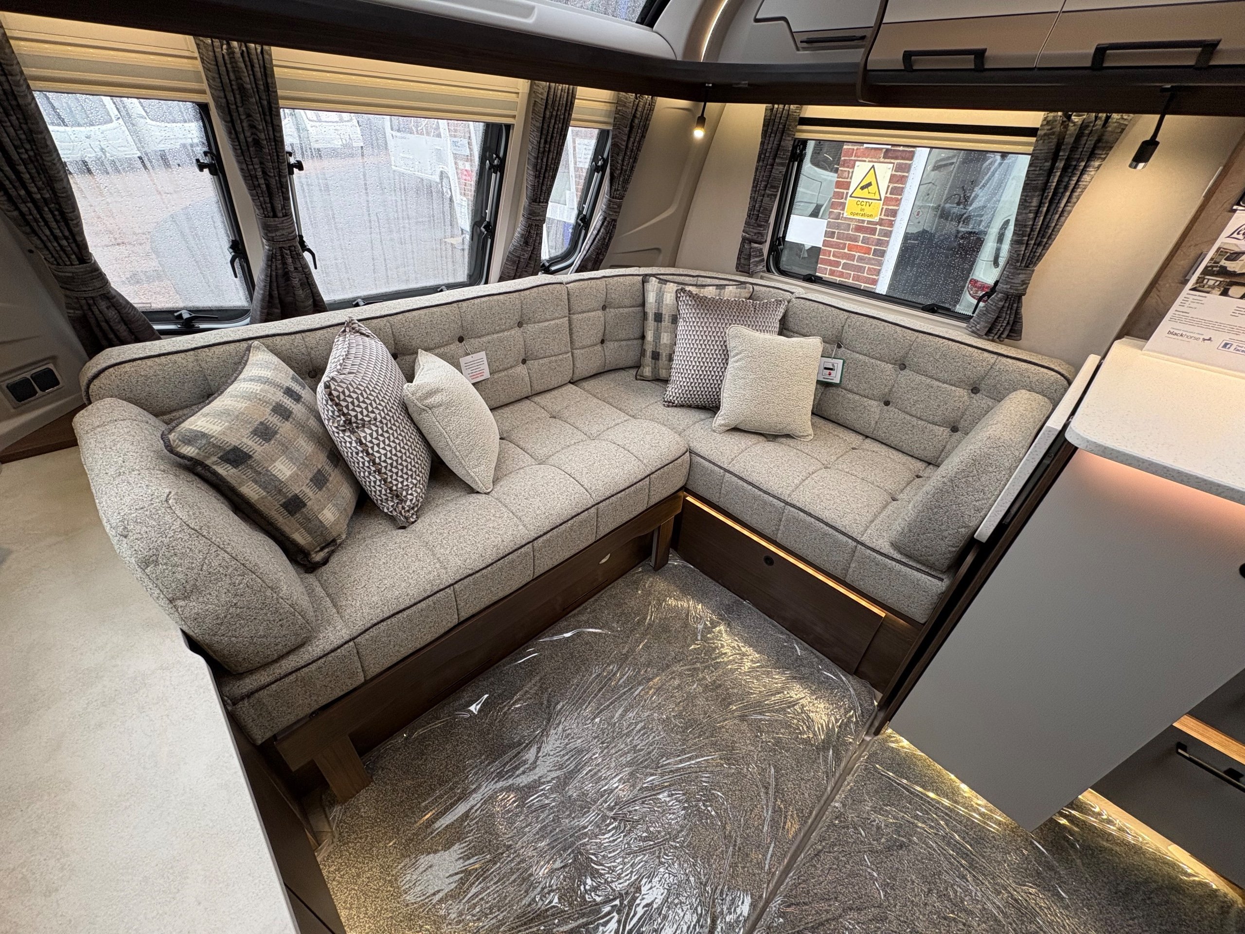 Year: 2026, Berth: 4, Internal length: 5.80m / 19', External length: 7.43m / 24'5", Width: 2.44m / 8', Unladen weight: 1595kg, MTPLM: 1770kg ( Upgraded MTPLM: 1800kg ), Awning size: 10.24m, Warranty: 3 years major components, 10 year bodyshell ( subject to terms and conditions ). This caravan features a L shaped front lounge, which in conjunction with caravans eight foot width, makes for a comfortable seating area. The mid washroom has been modified for the 2026 season, with a new shaped shower providing better access to the washroom. The handbasin is centrally fitted ahead of the bedroom, providing individual access to either side of the double bed. The alde heating system provides a true all year round performer. -