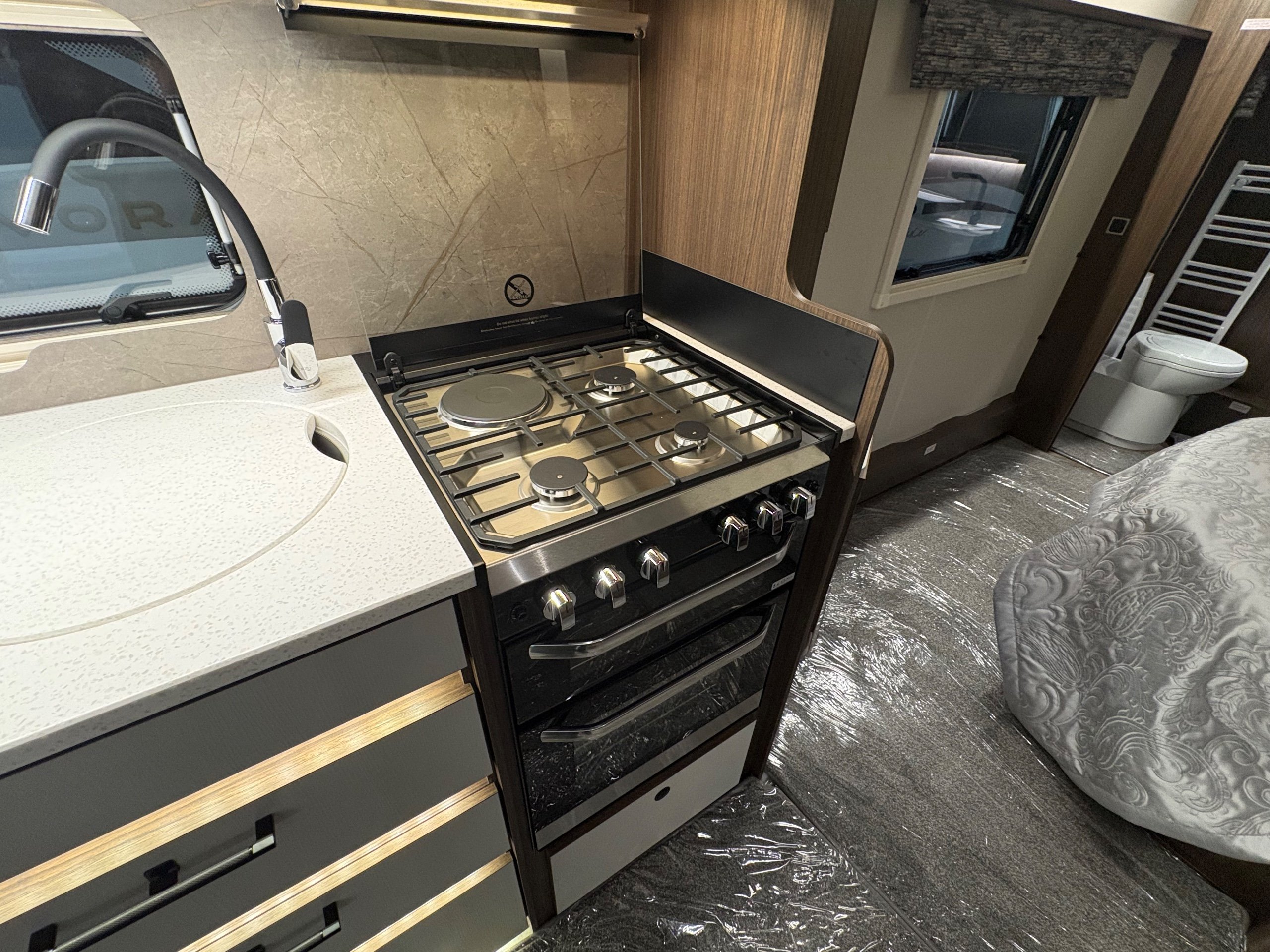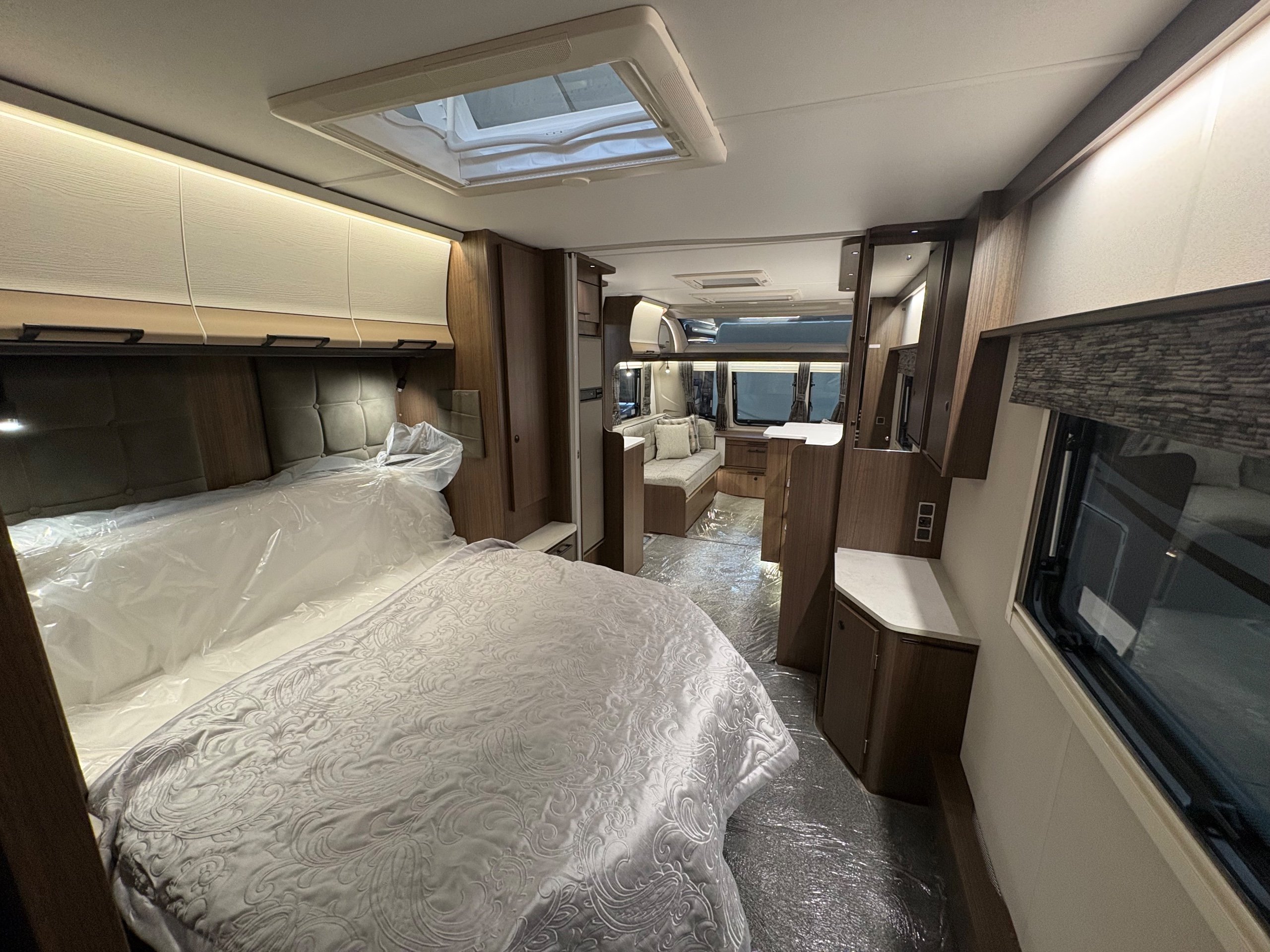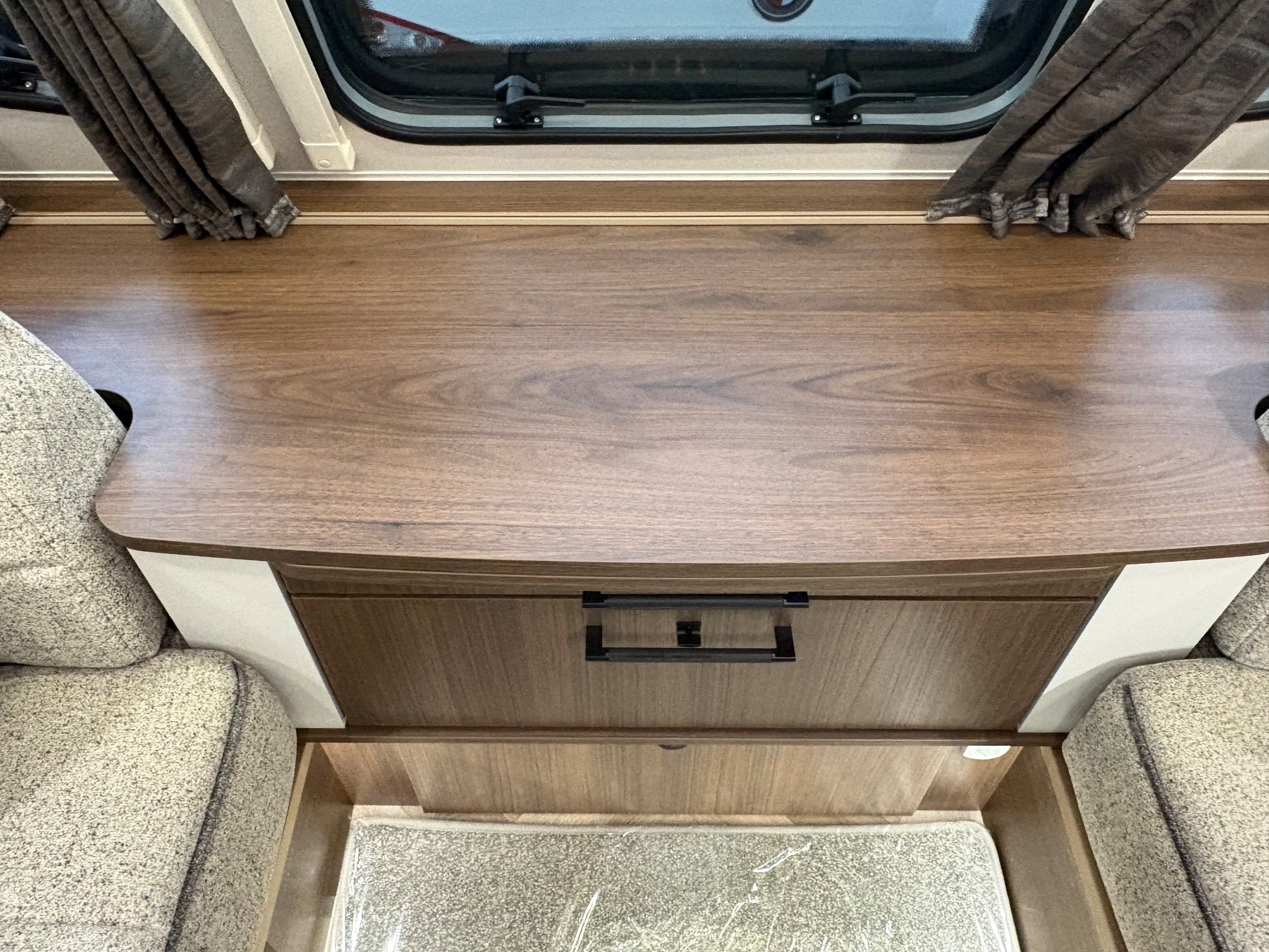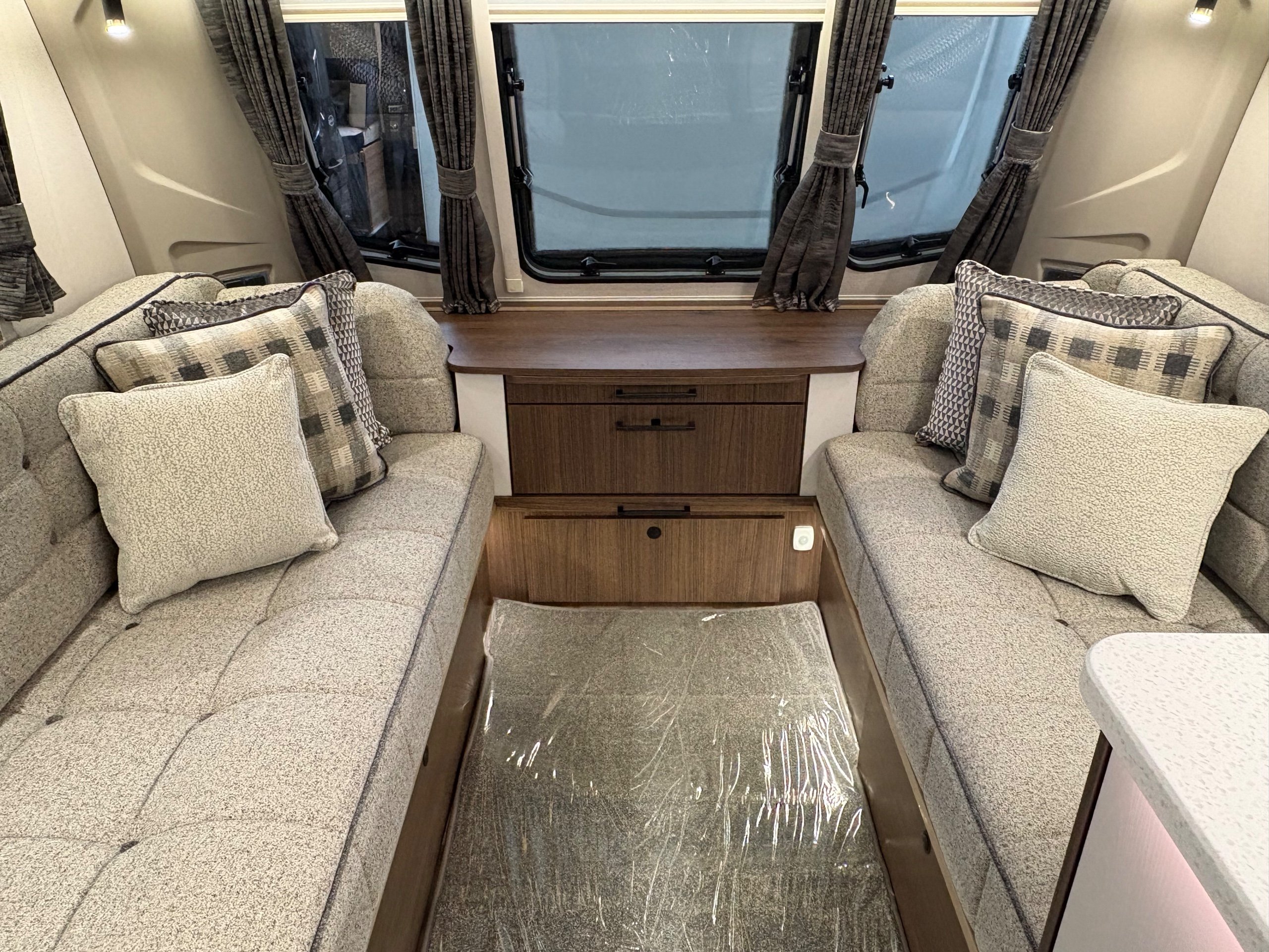 Year: 2026, Berth: 4, Internal length: 6.27m / 20'7", External length: 7.90m / 25'11", Width: 2.44m / 8', Unladen weight: 1736kg, MTPLM: 1896kg ( Upgraded MTPLM: 2000kg ), Awning size: 10.62m, Warranty: 3 years major components, 10 year bodyshell ( subject to terms and conditions ). This twin axle model features an eight foot width, a transverse double bed and a rear washroom. This caravan works as either a two or four berth. Due to the wide body, the double bed can be left extended while still leaving enough room to pass it to the washroom. A high level of equipment is standard on this level of product including alde heating and a large fridge freezer. -