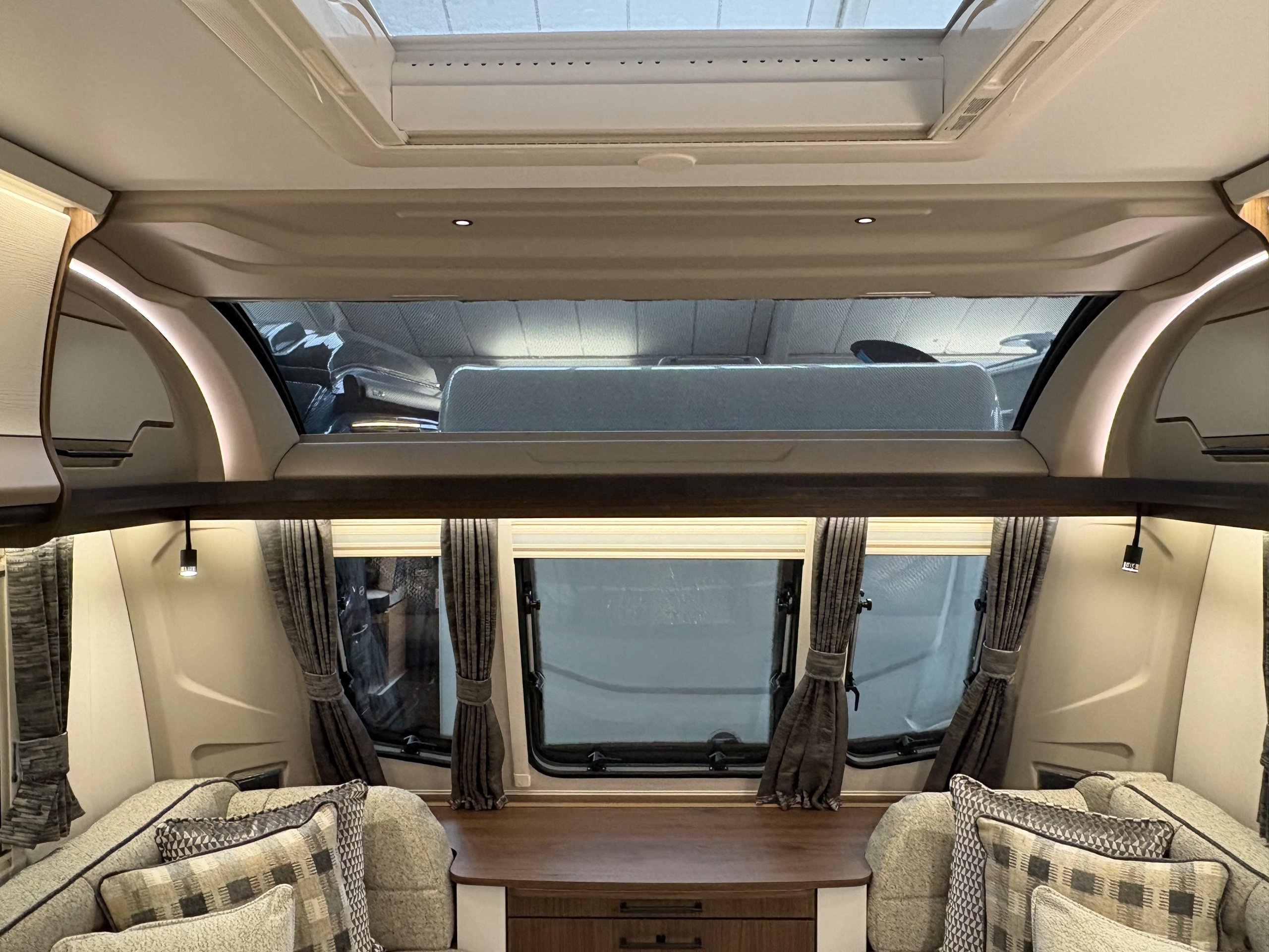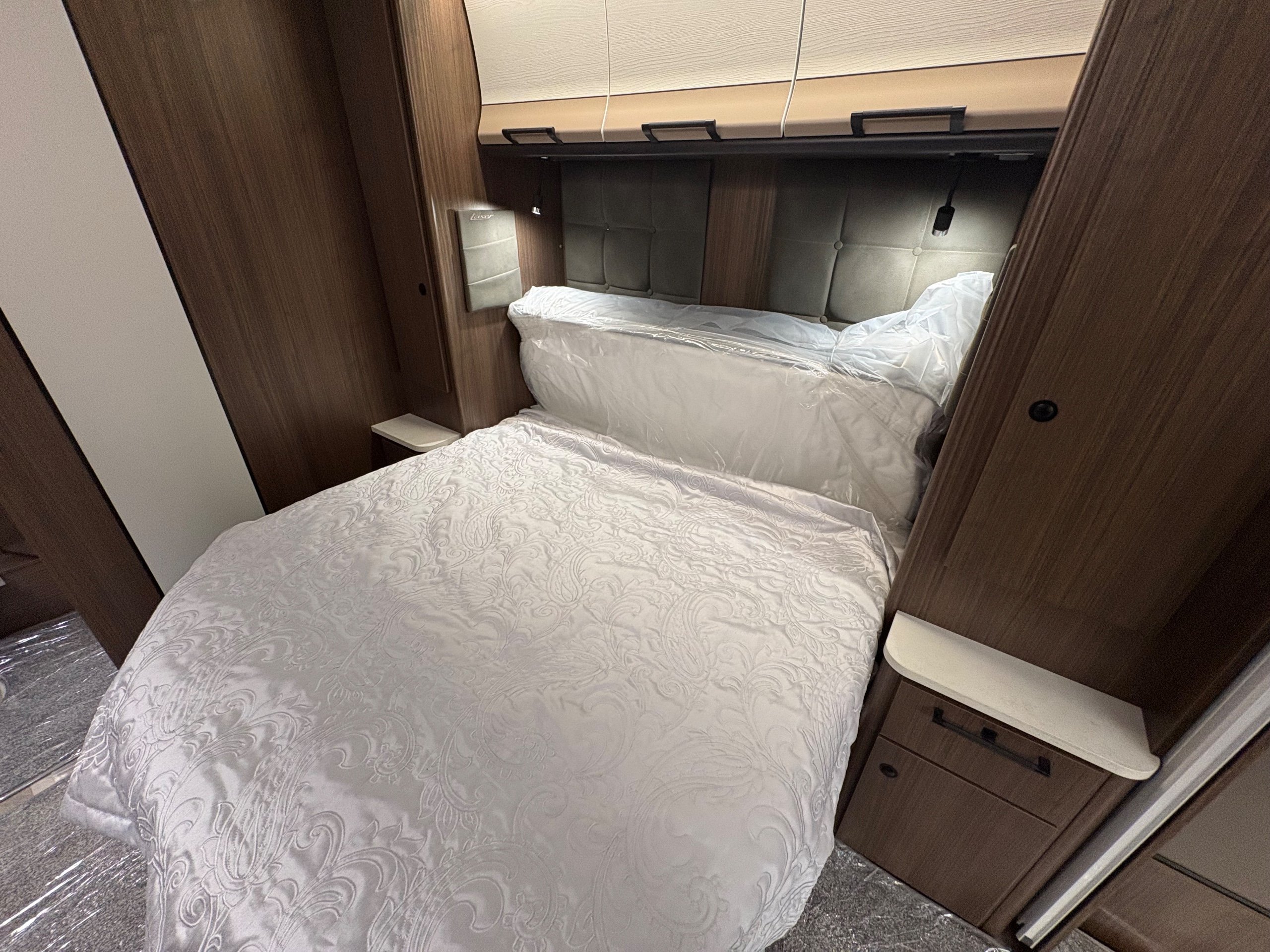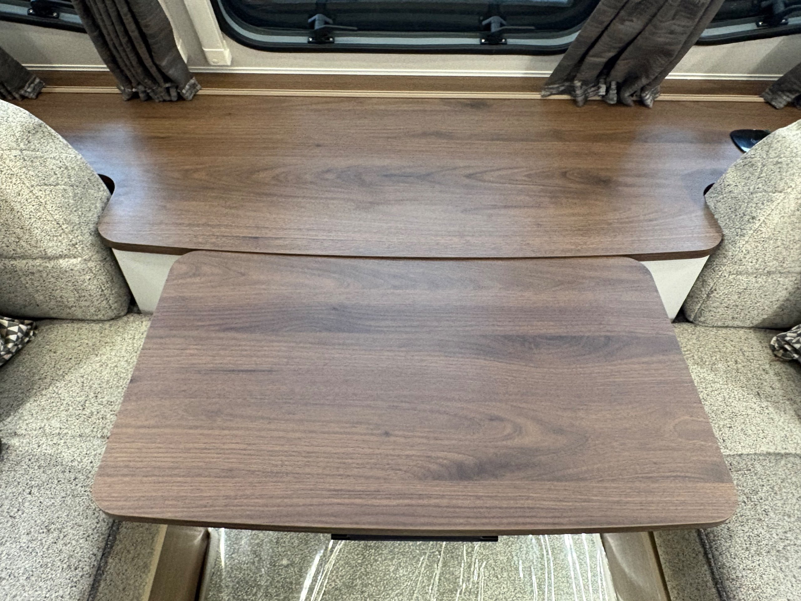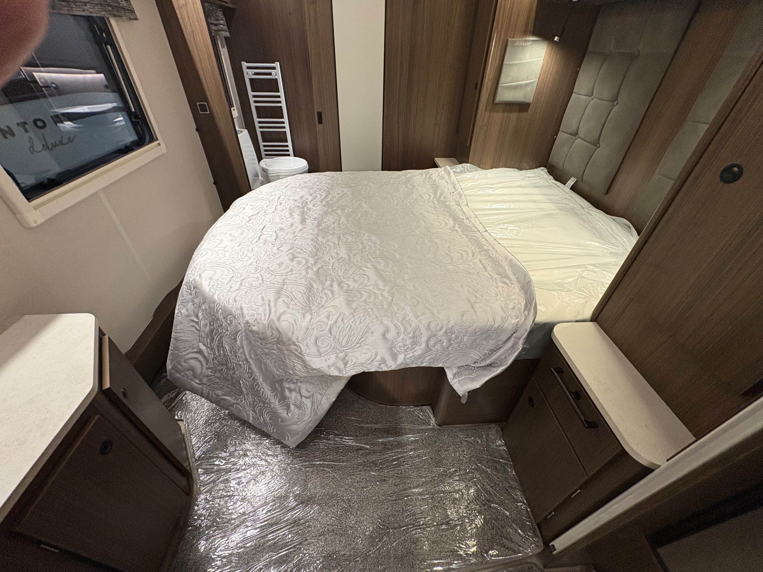 Year: 2026, Berth: 4, Internal length: 6.27m / 20'7", External length: 7.90m / 25'11", Width: 2.44m / 8', Unladen weight: 1736kg, MTPLM: 1896kg ( Upgraded MTPLM: 2000kg ), Awning size: 10.62m, Warranty: 3 years major components, 10 year bodyshell ( subject to terms and conditions ). This twin axle model features an eight foot width, a transverse double bed and a rear washroom. This caravan works as either a two or four berth. Due to the wide body, the double bed can be left extended while still leaving enough room to pass it to the washroom. A high level of equipment is standard on this level of product including alde heating and a large fridge freezer. -