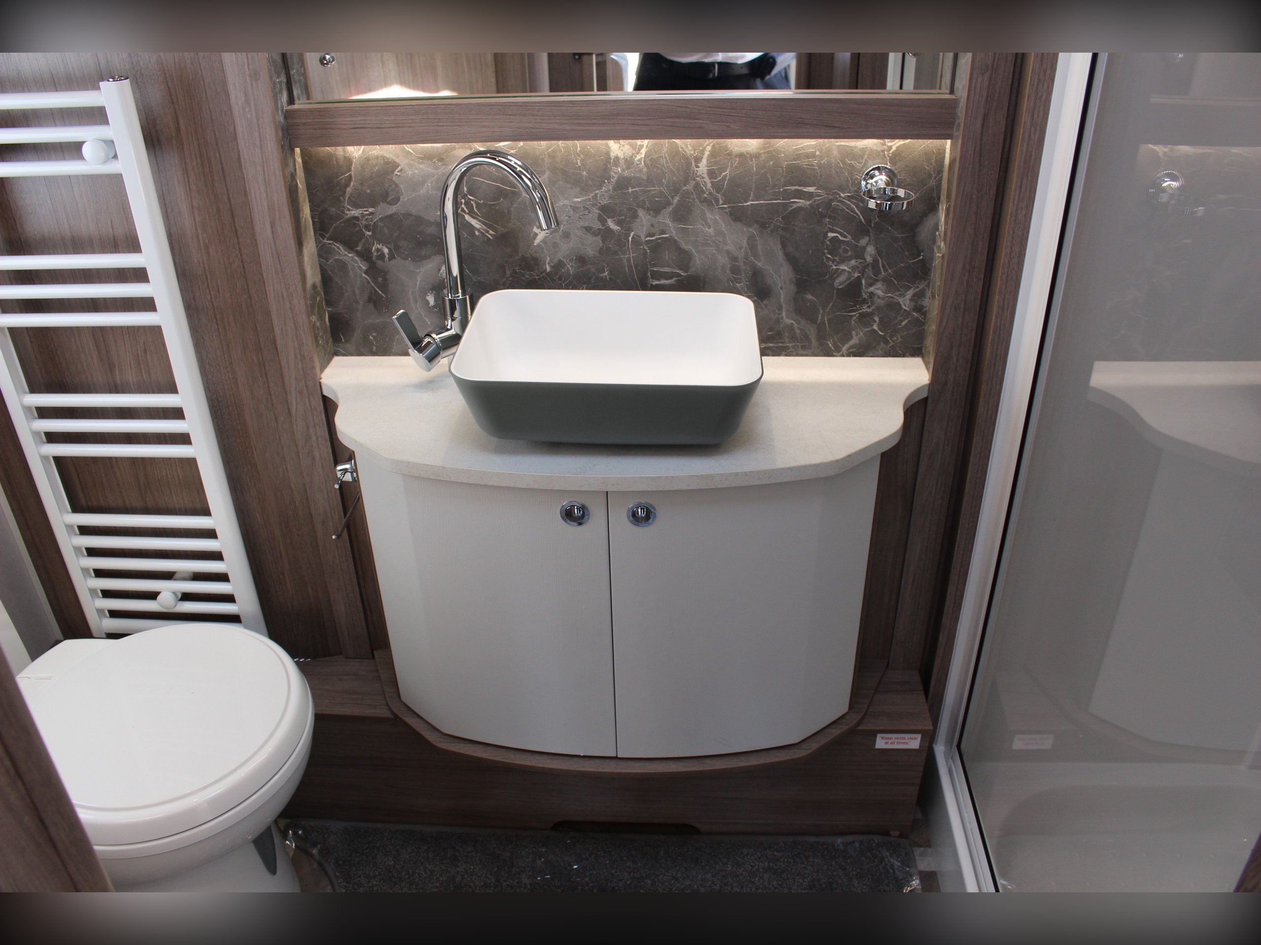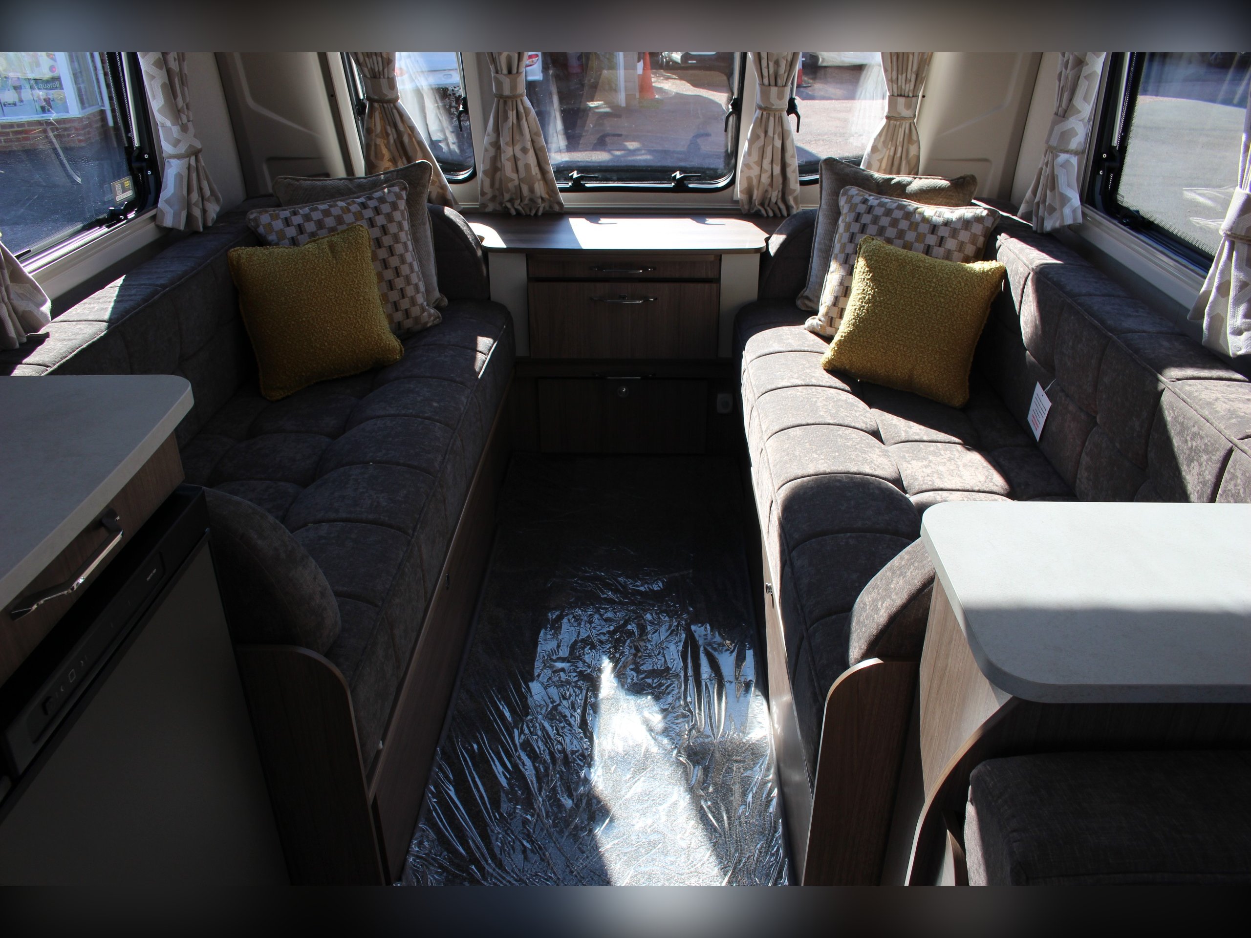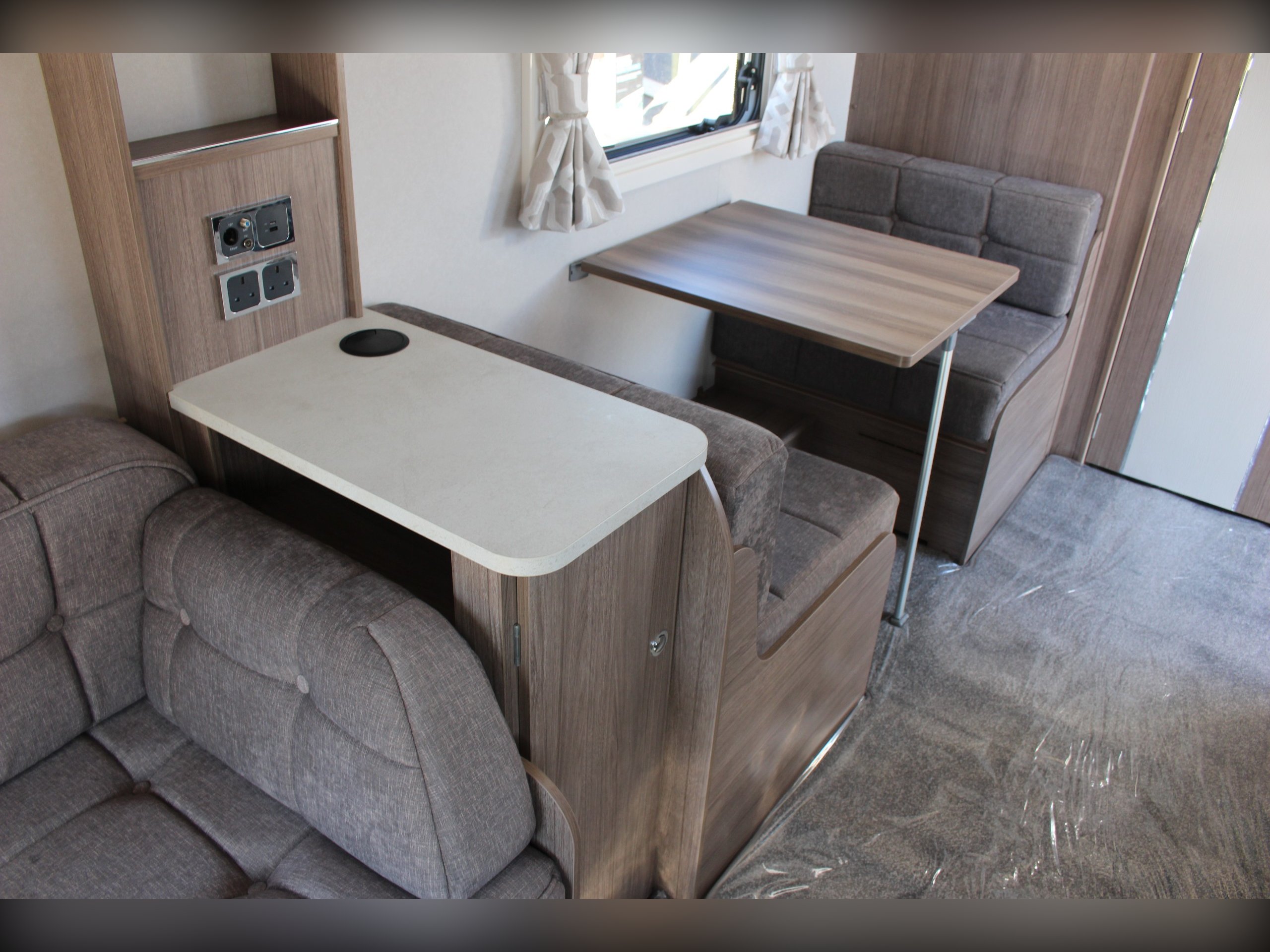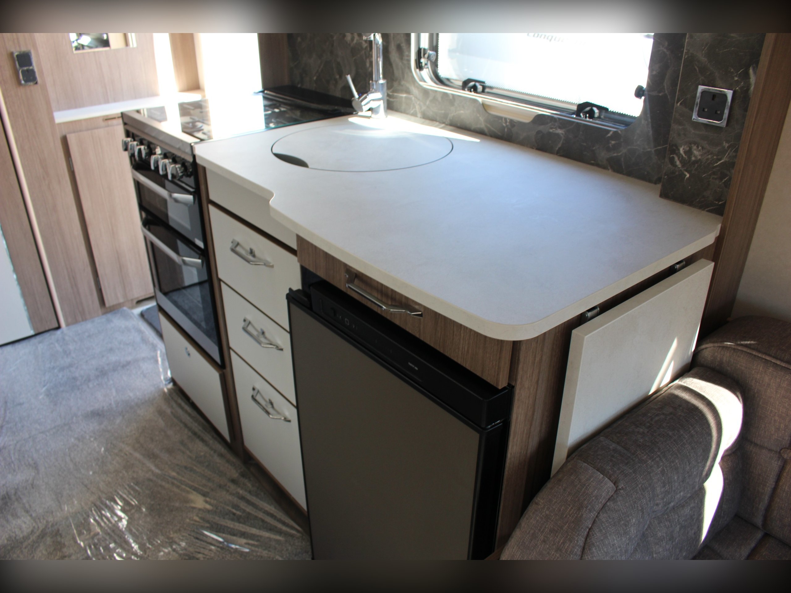 Year: 2026, Berth: 3, Internal length: 5.42m / 17'9", Width: 2.31m / 7'7", Unladen weight: 1398kg, MTPLM: 1540kg ( Upgraded MTPLM: 1550kg ), Awning size: 9.75m, Warranty: 3 years major components, 10 year bodyshell ( subject to terms and conditions ). The 520 is a truly flexible layout with the side dinette offering a single bed, dining area, extra work surface or just another seating area. Often favoured by customers who are looking at two berth, if you are prepared to go slightly larger in caravan, you gain a lot more more usable space. The kitchen is a good size offering lots of work top space, with the unit on the opposite side offering a place for the television. The large rear washroom offers plenty of room to move around when in use. -