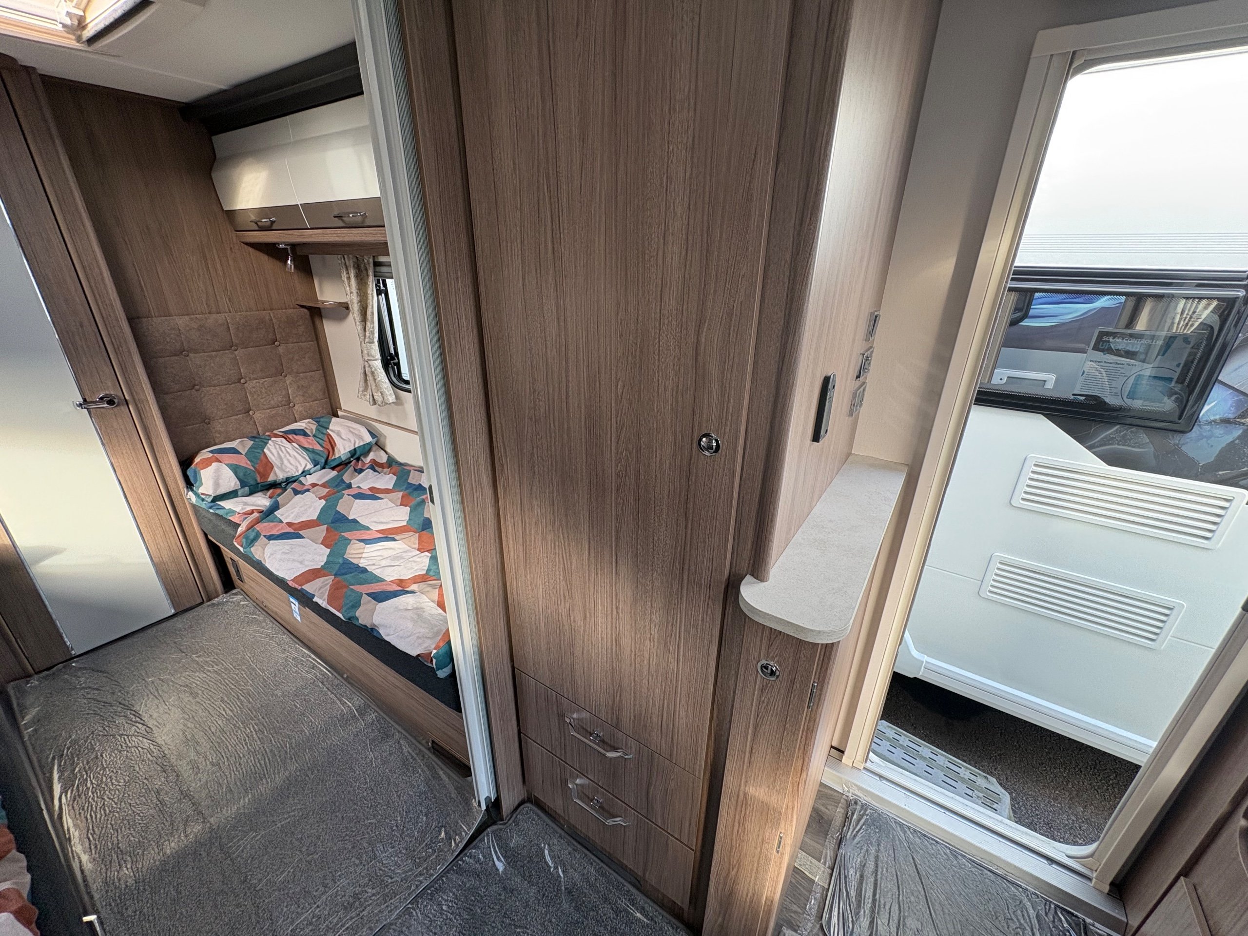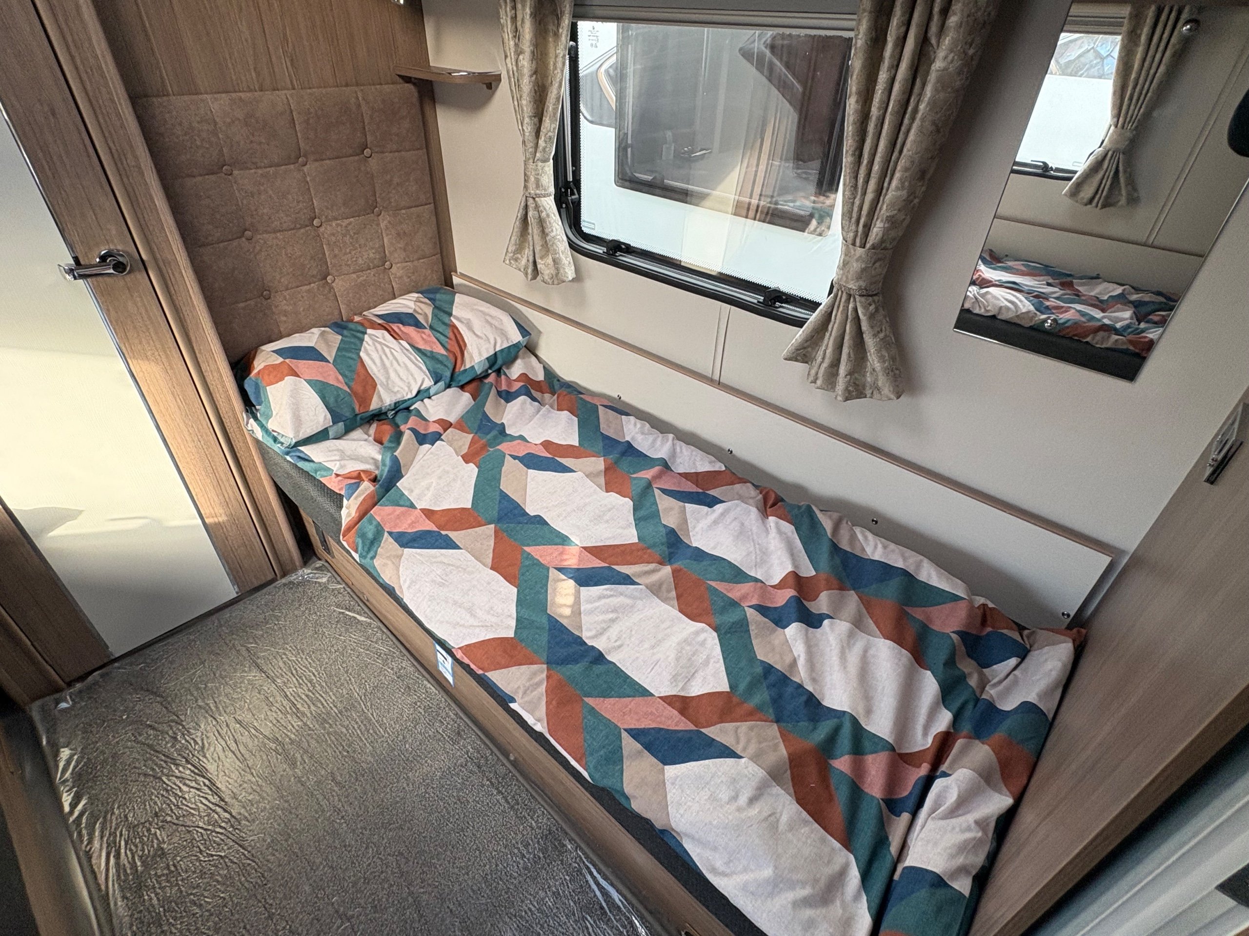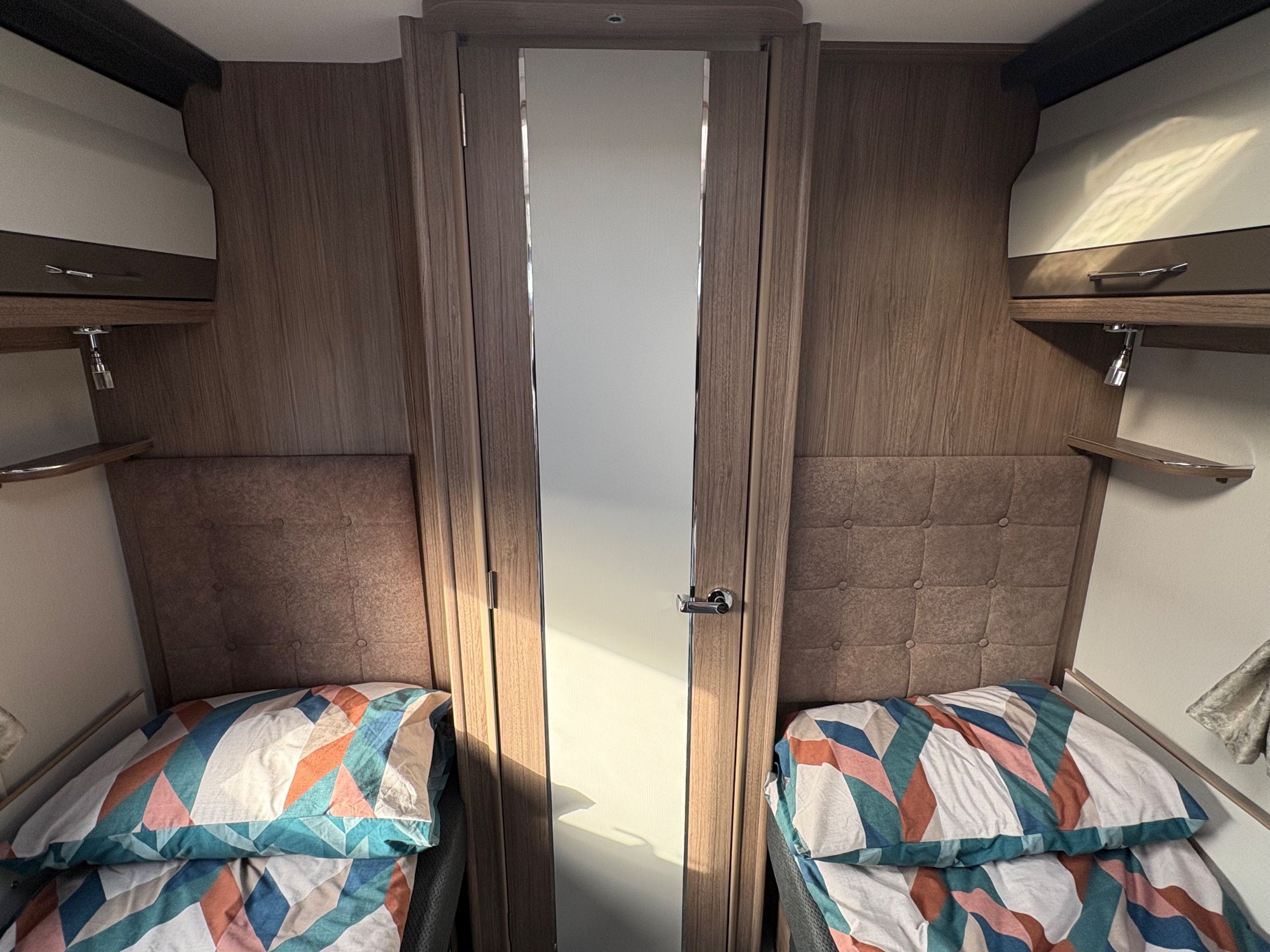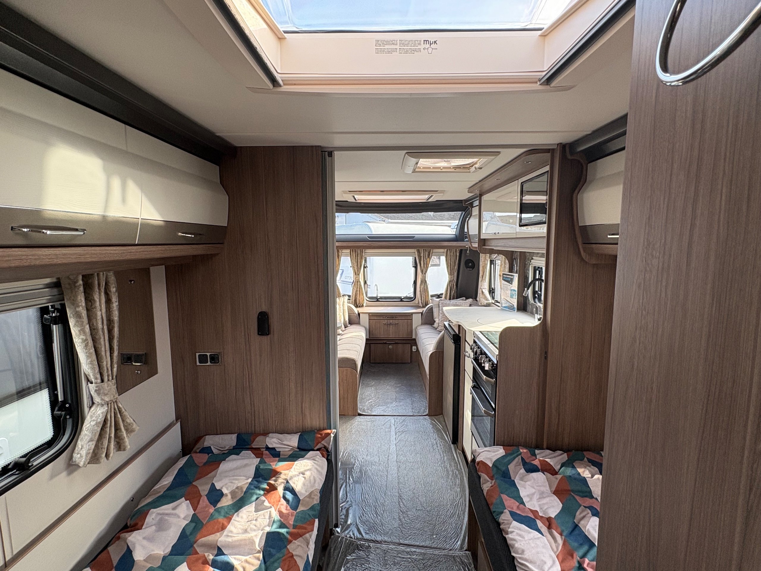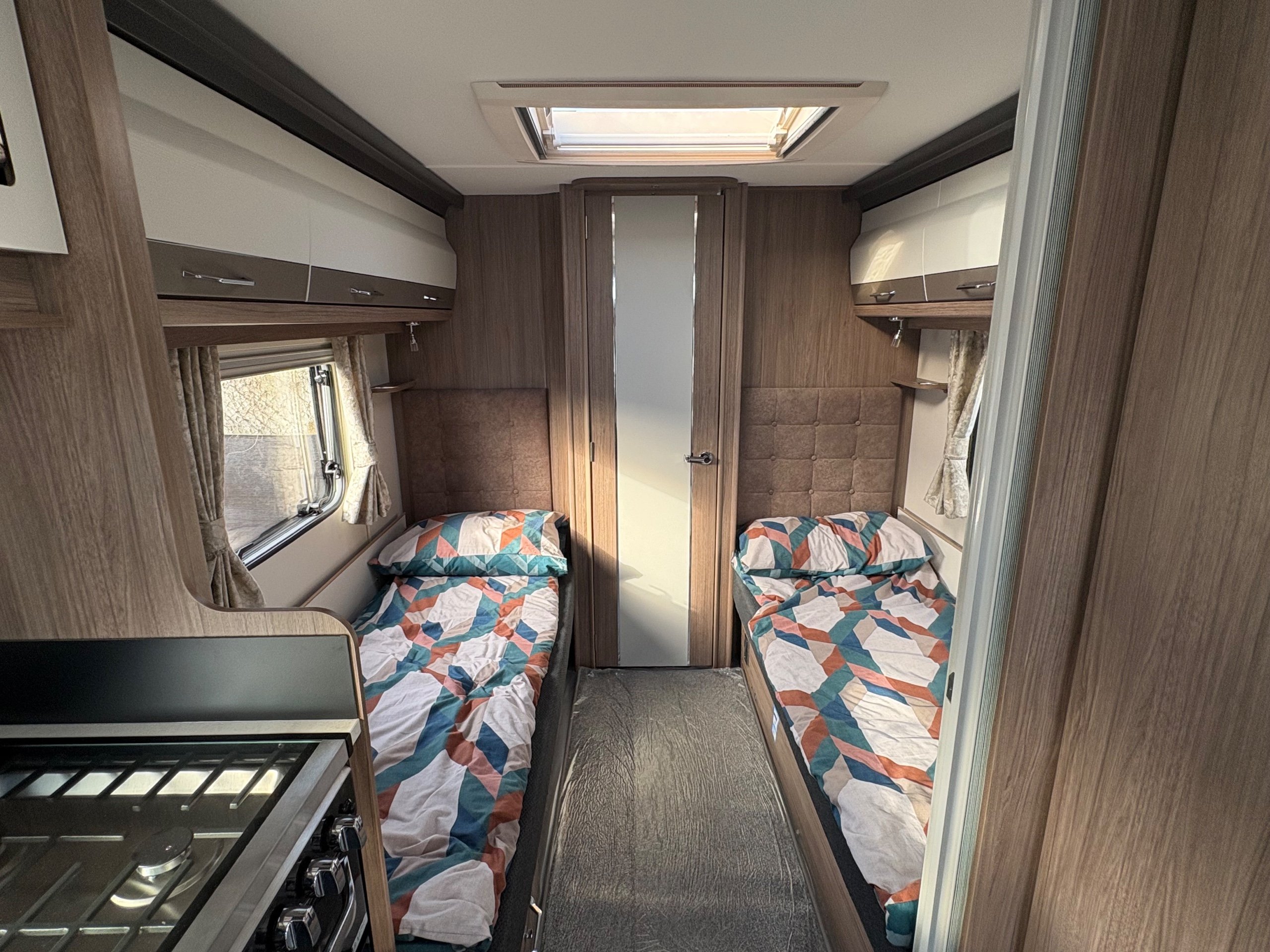 Year: 2025, Berth: 4, Internal length: 5.74m / 18'10", External length: 7.37m / 24'2", Width: 2.31m / 7'7", Unladen weight: 1483kg, MTPLM: 1638kg, Awning size: 10.20m, Warranty: 3 years major components, 10 year bodyshell ( terms and conditions apply ). Twin rear fixed single beds and an end washroom are featured in this model. With the wardrobe midships, it frees up more space in the washroom providing freedom of movement. Mainly used as a two berth it will sleep up to four dependant on requirements, allowing for individual access to either bed, perfect for those who are up in the night! Being on the 7'7" bodyshell and with the help of the big front sunroof, this model always feel bright and airy with a nice open plan feel. -