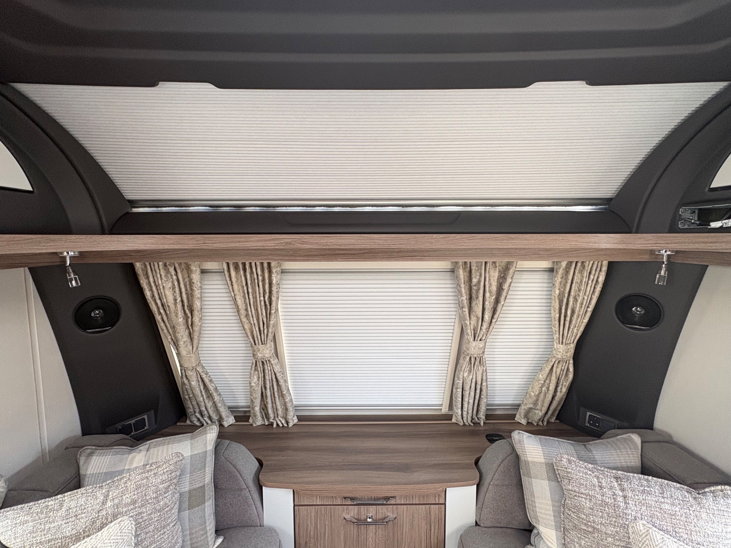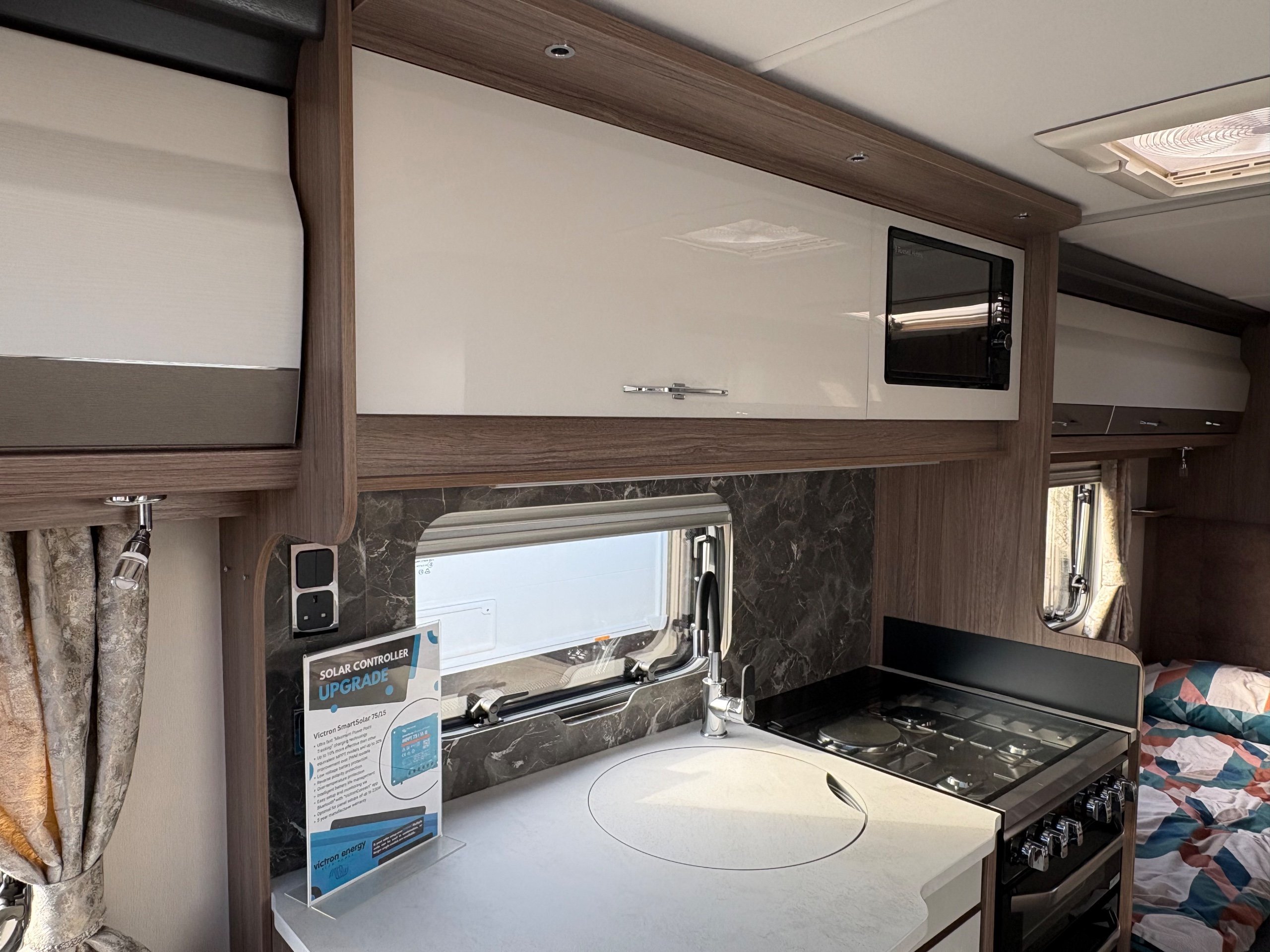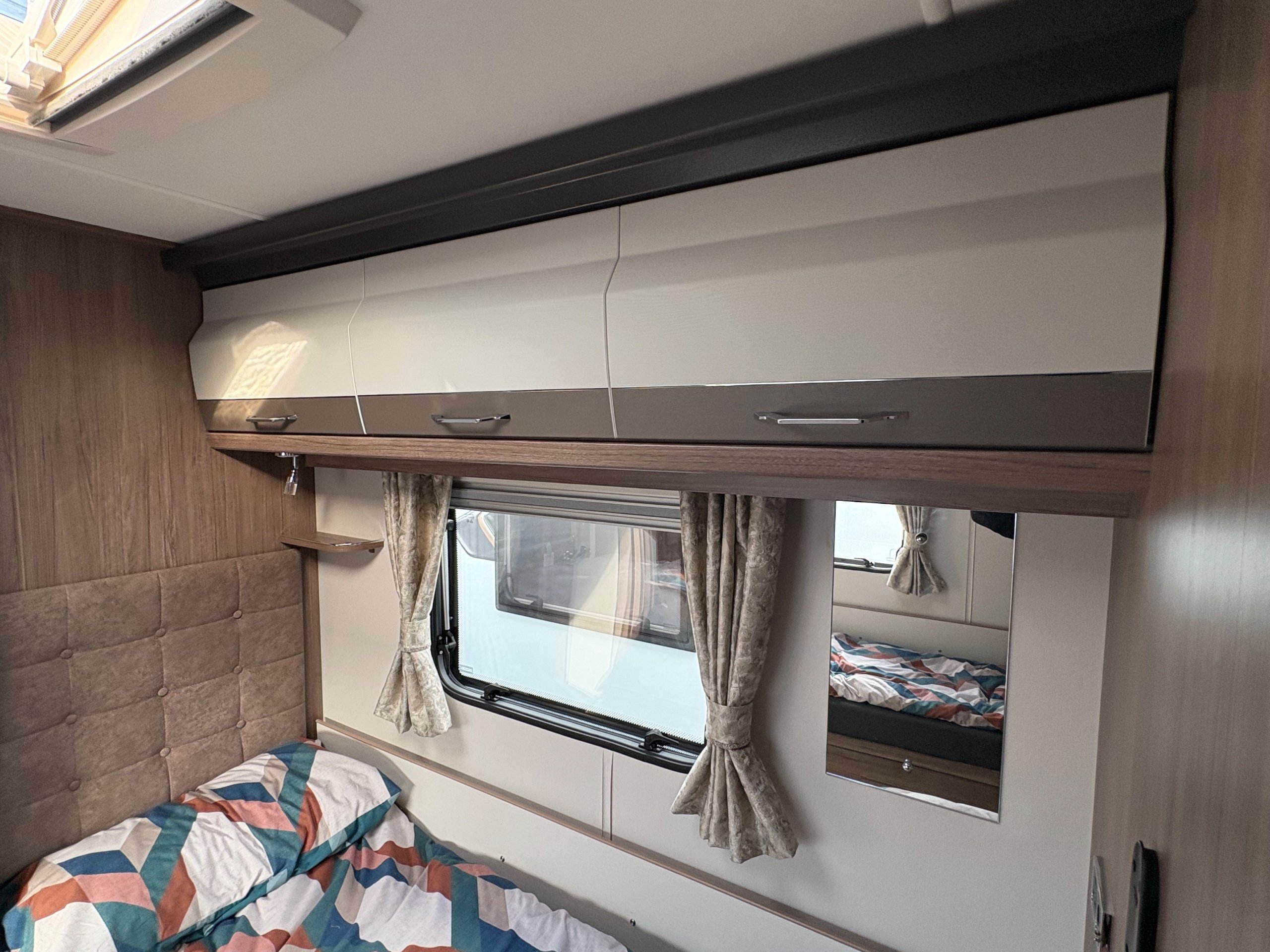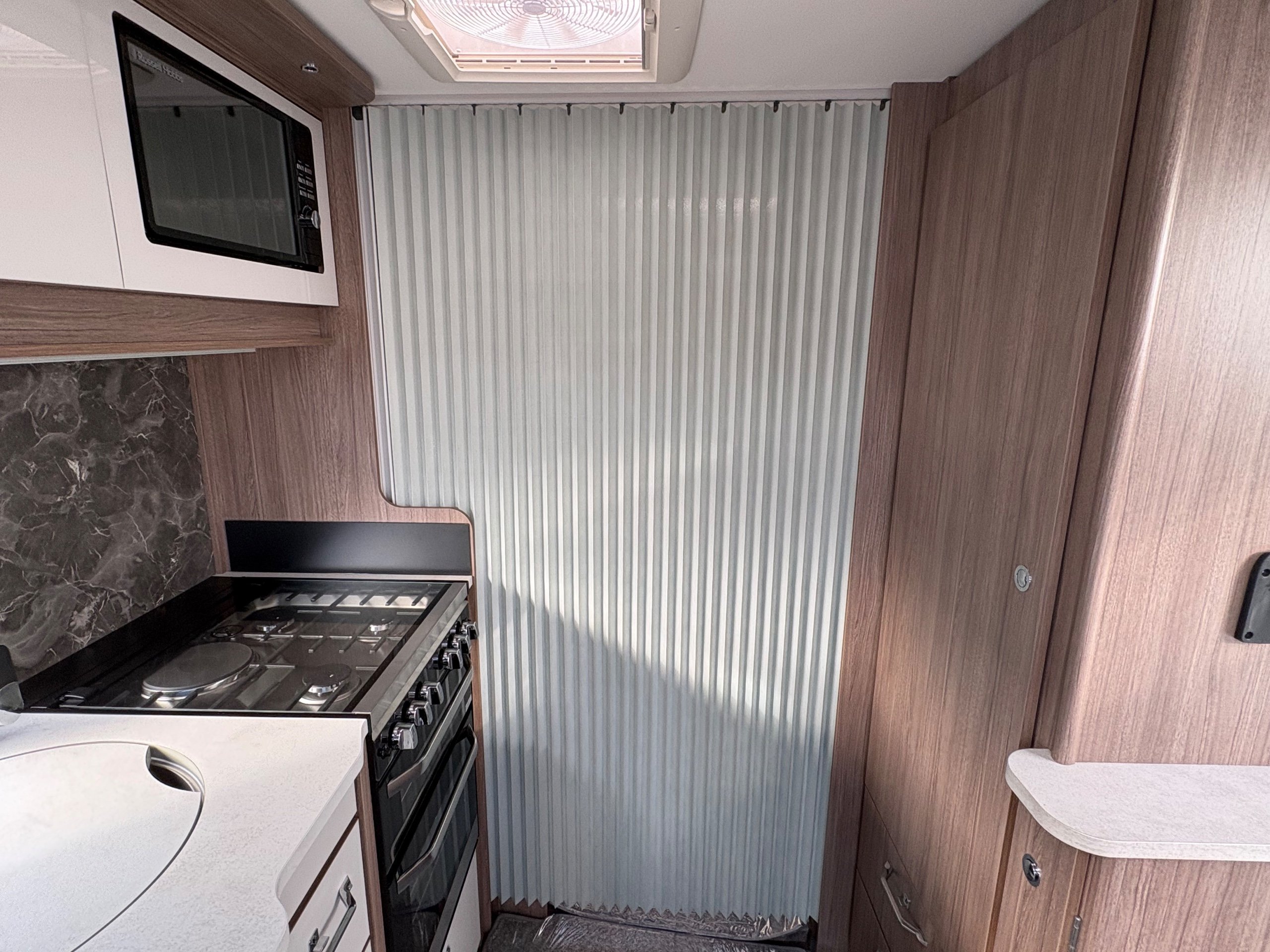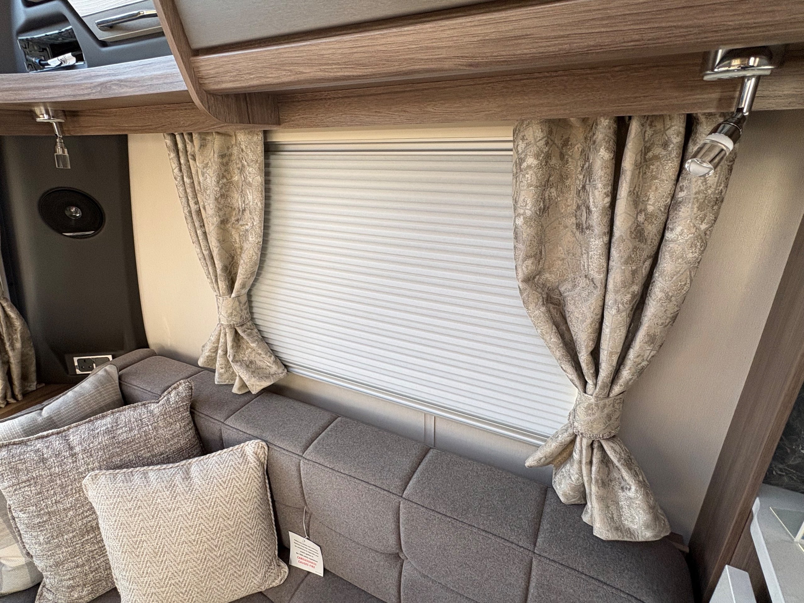 Year: 2025, Berth: 4, Internal length: 5.74m / 18'10", External length: 7.37m / 24'2", Width: 2.31m / 7'7", Unladen weight: 1483kg, MTPLM: 1638kg, Awning size: 10.20m, Warranty: 3 years major components, 10 year bodyshell ( terms and conditions apply ). Twin rear fixed single beds and an end washroom are featured in this model. With the wardrobe midships, it frees up more space in the washroom providing freedom of movement. Mainly used as a two berth it will sleep up to four dependant on requirements, allowing for individual access to either bed, perfect for those who are up in the night! Being on the 7'7" bodyshell and with the help of the big front sunroof, this model always feel bright and airy with a nice open plan feel. -