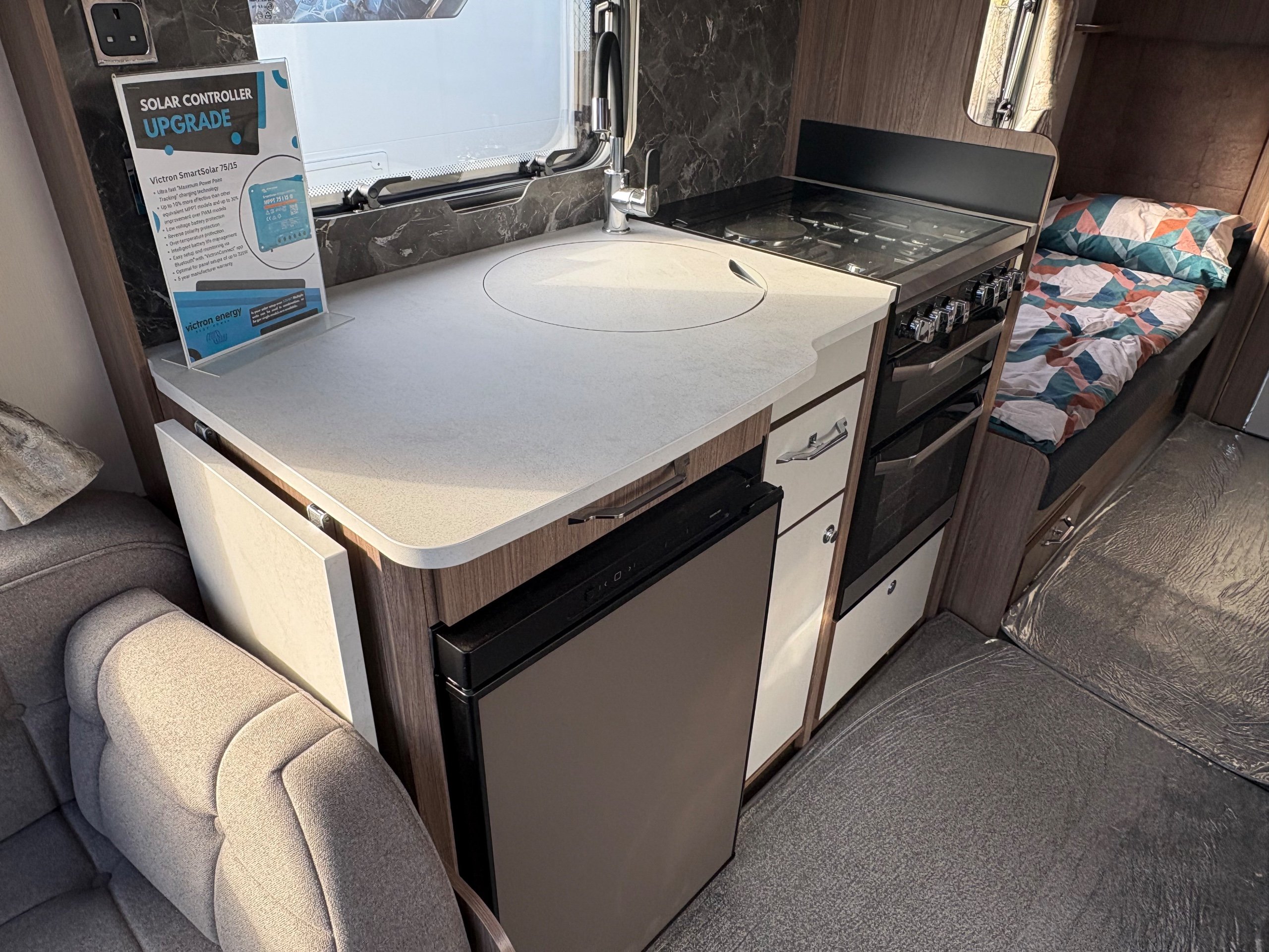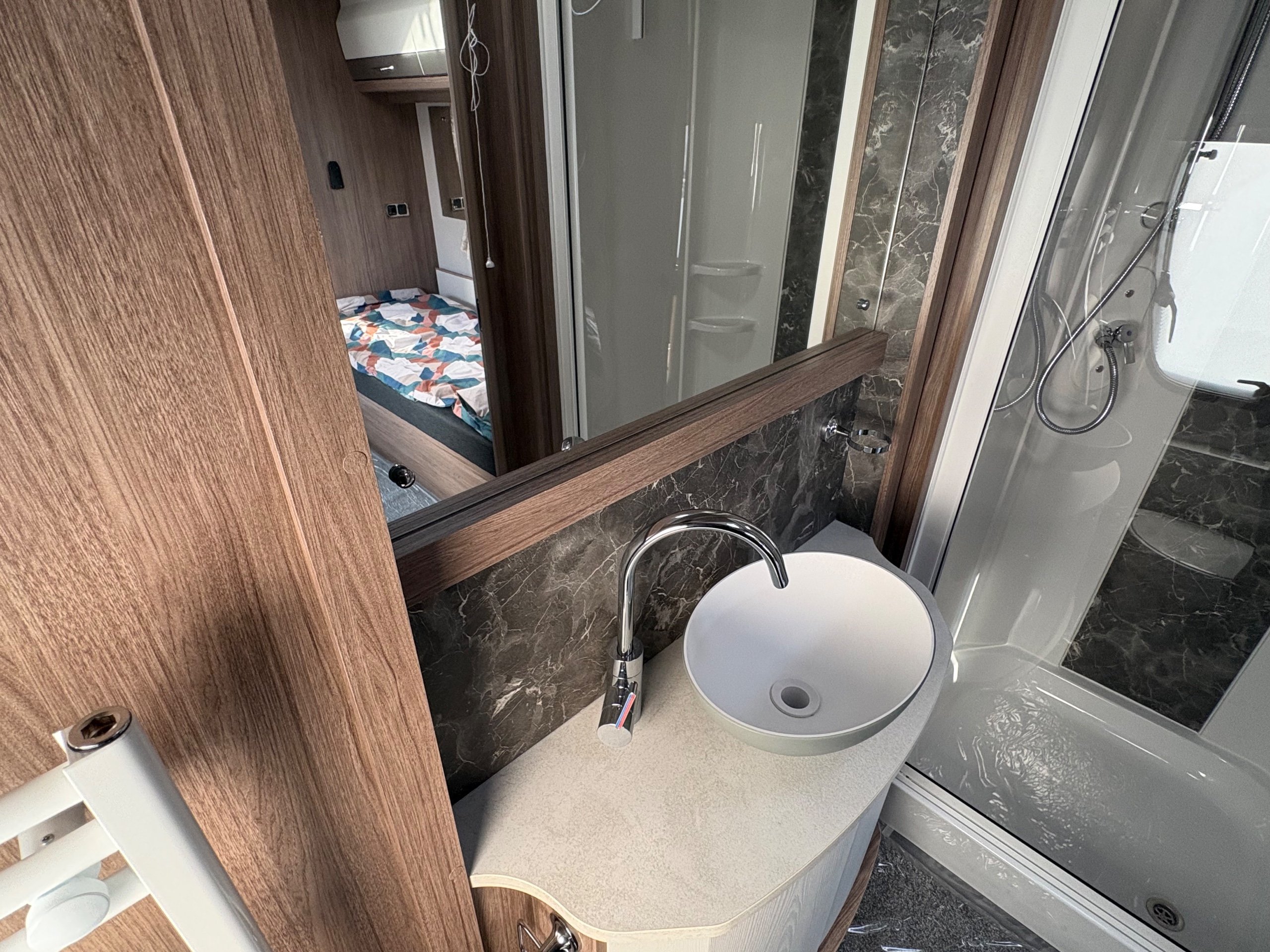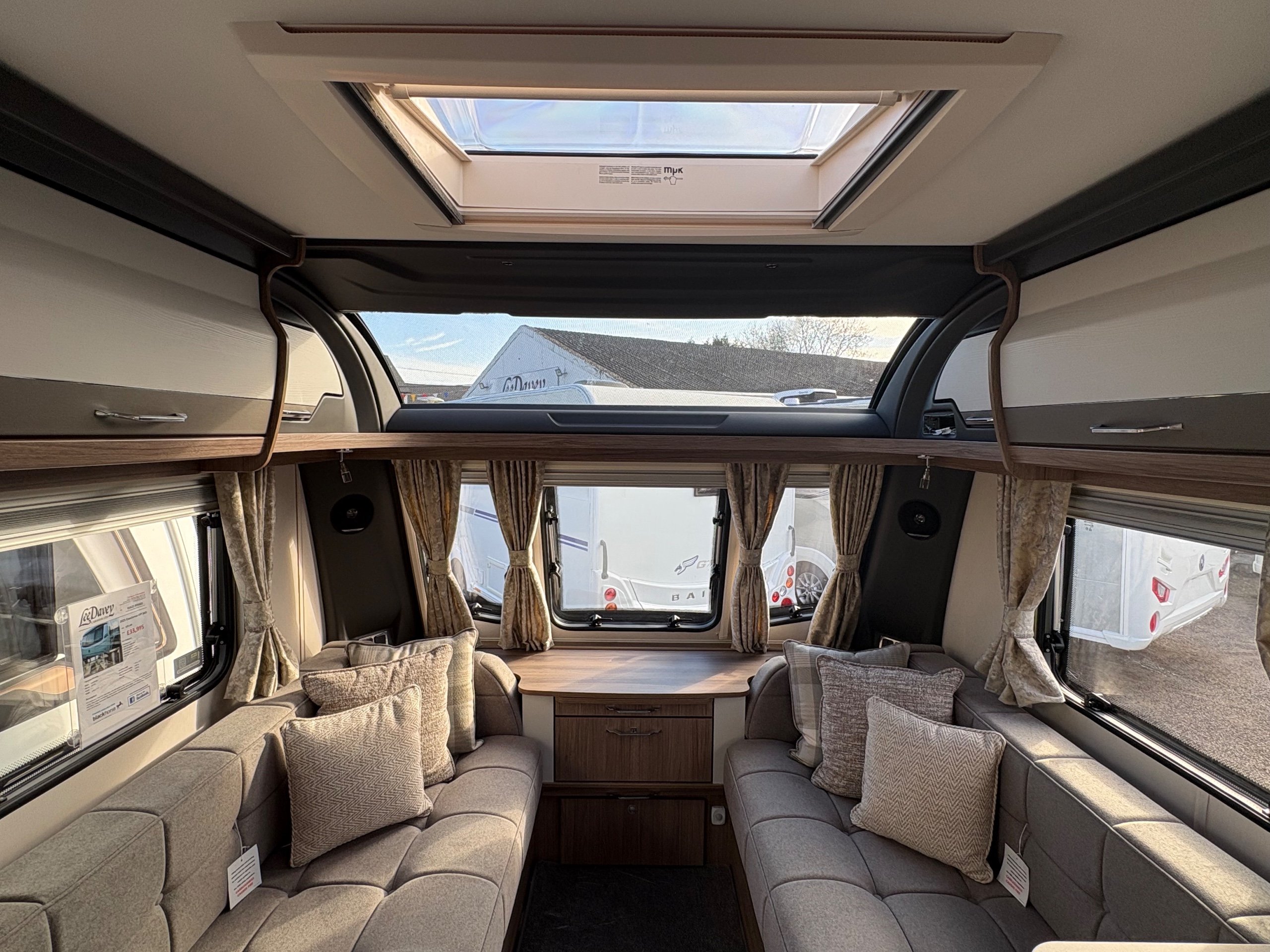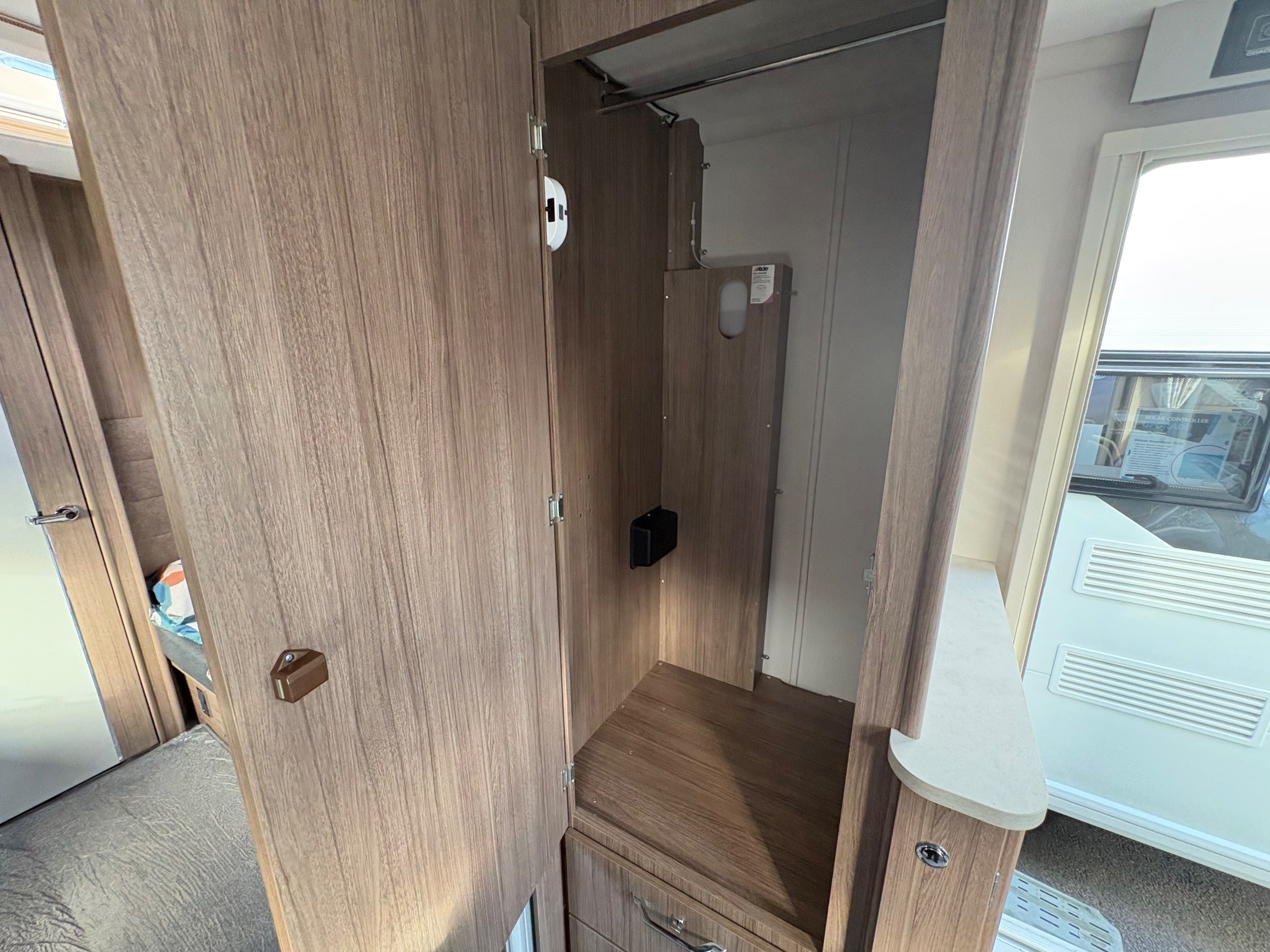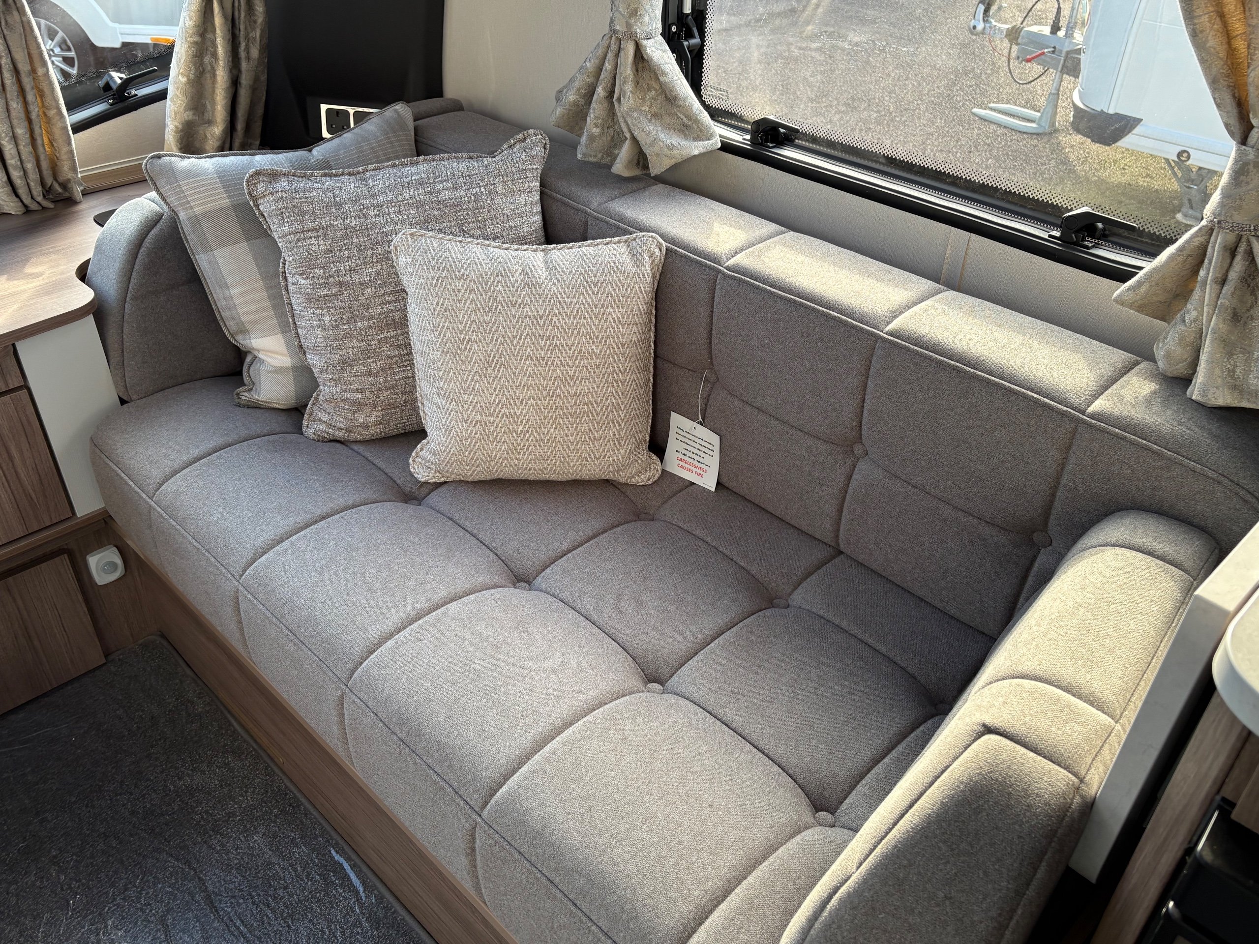 Year: 2025, Berth: 4, Internal length: 5.74m / 18'10", External length: 7.37m / 24'2", Width: 2.31m / 7'7", Unladen weight: 1483kg, MTPLM: 1638kg, Awning size: 10.20m, Warranty: 3 years major components, 10 year bodyshell ( terms and conditions apply ). Twin rear fixed single beds and an end washroom are featured in this model. With the wardrobe midships, it frees up more space in the washroom providing freedom of movement. Mainly used as a two berth it will sleep up to four dependant on requirements, allowing for individual access to either bed, perfect for those who are up in the night! Being on the 7'7" bodyshell and with the help of the big front sunroof, this model always feel bright and airy with a nice open plan feel. -