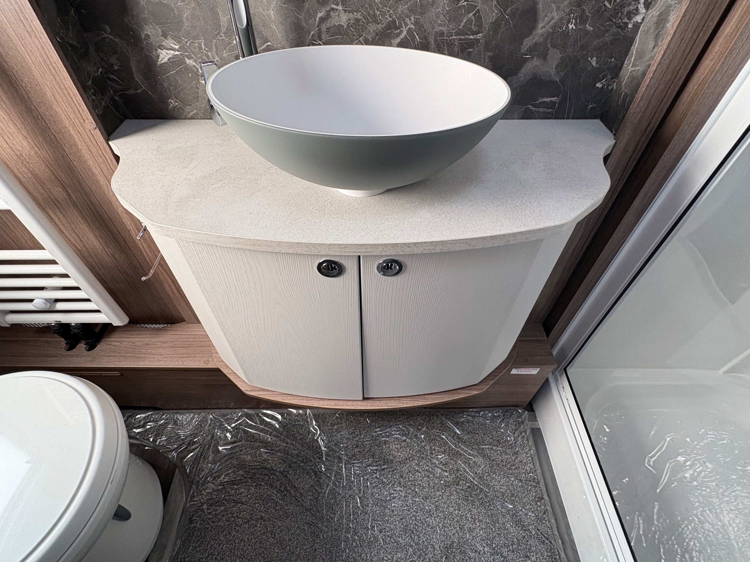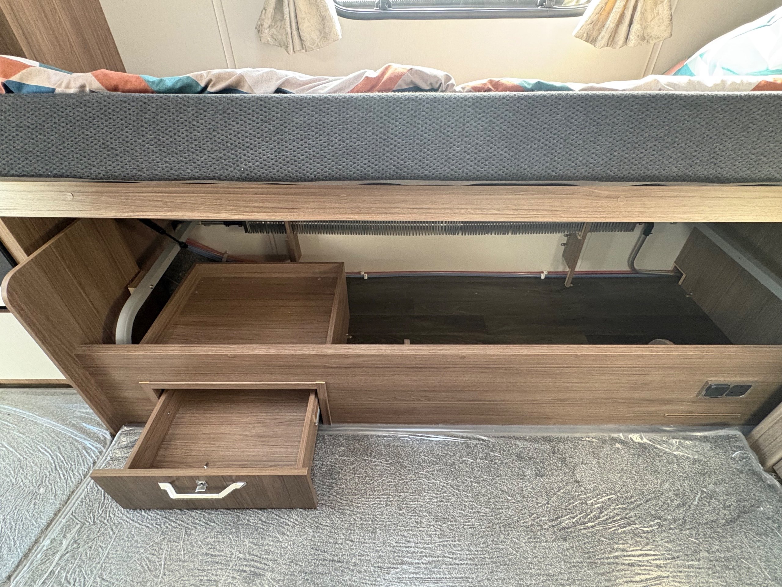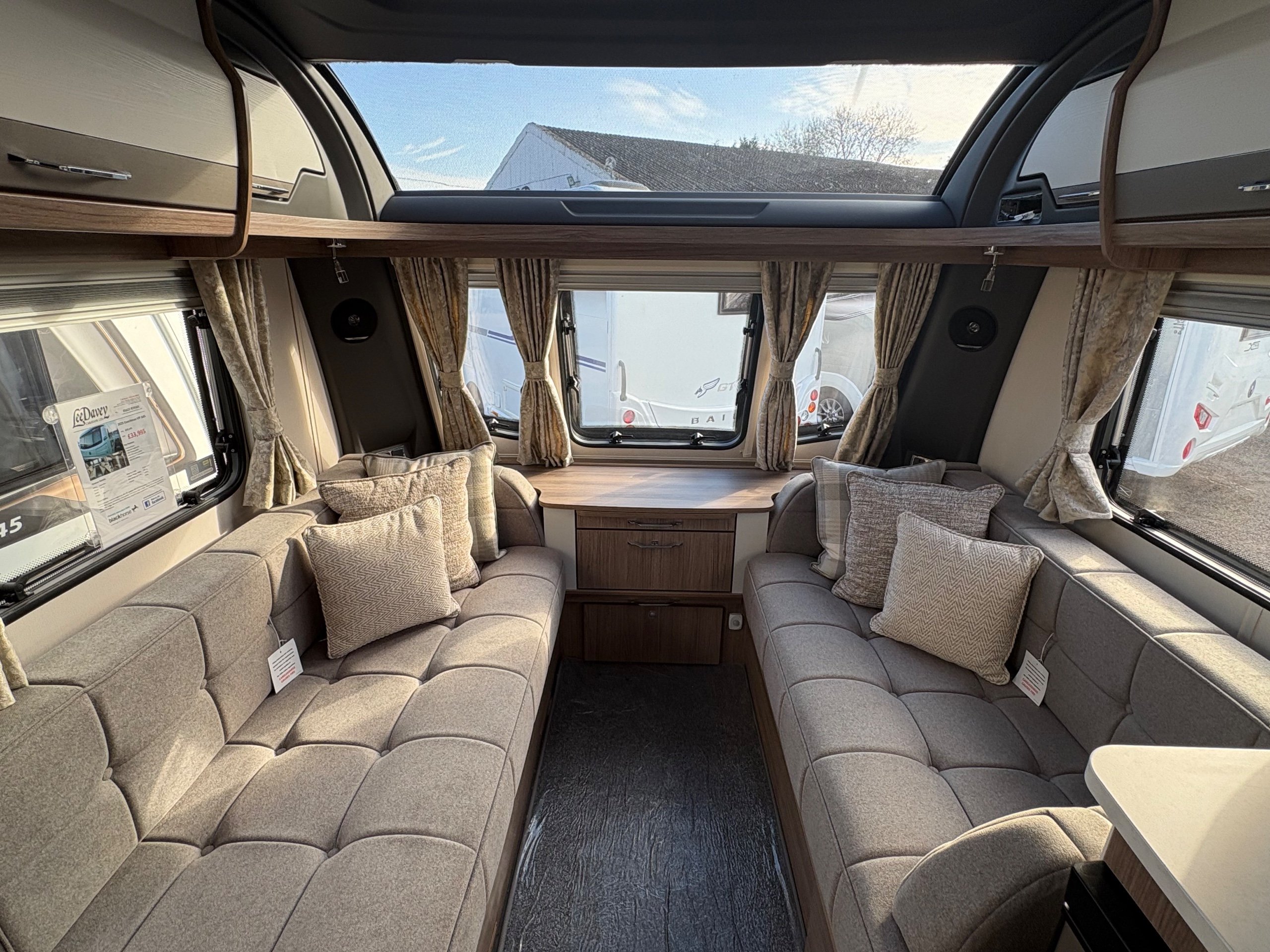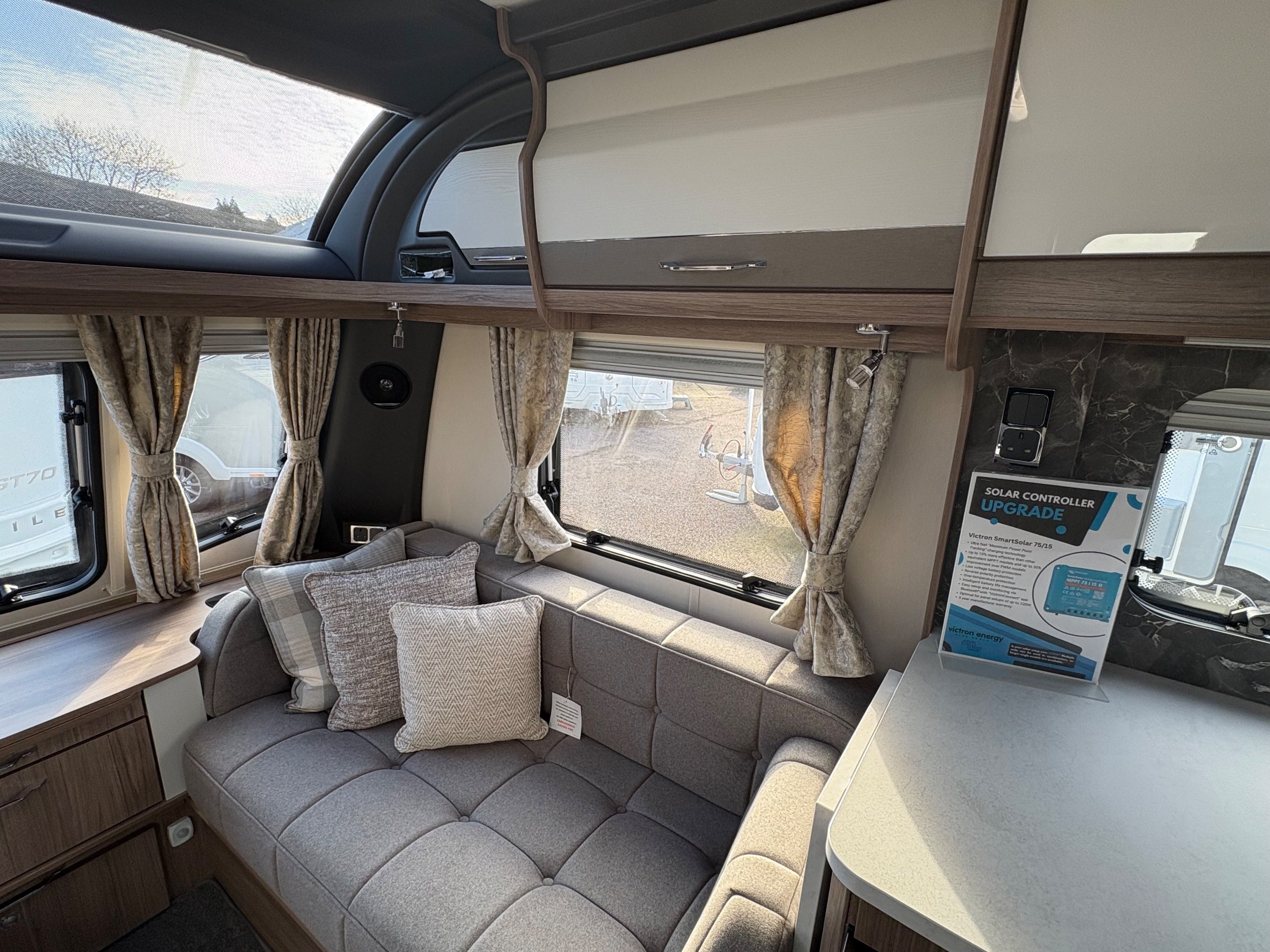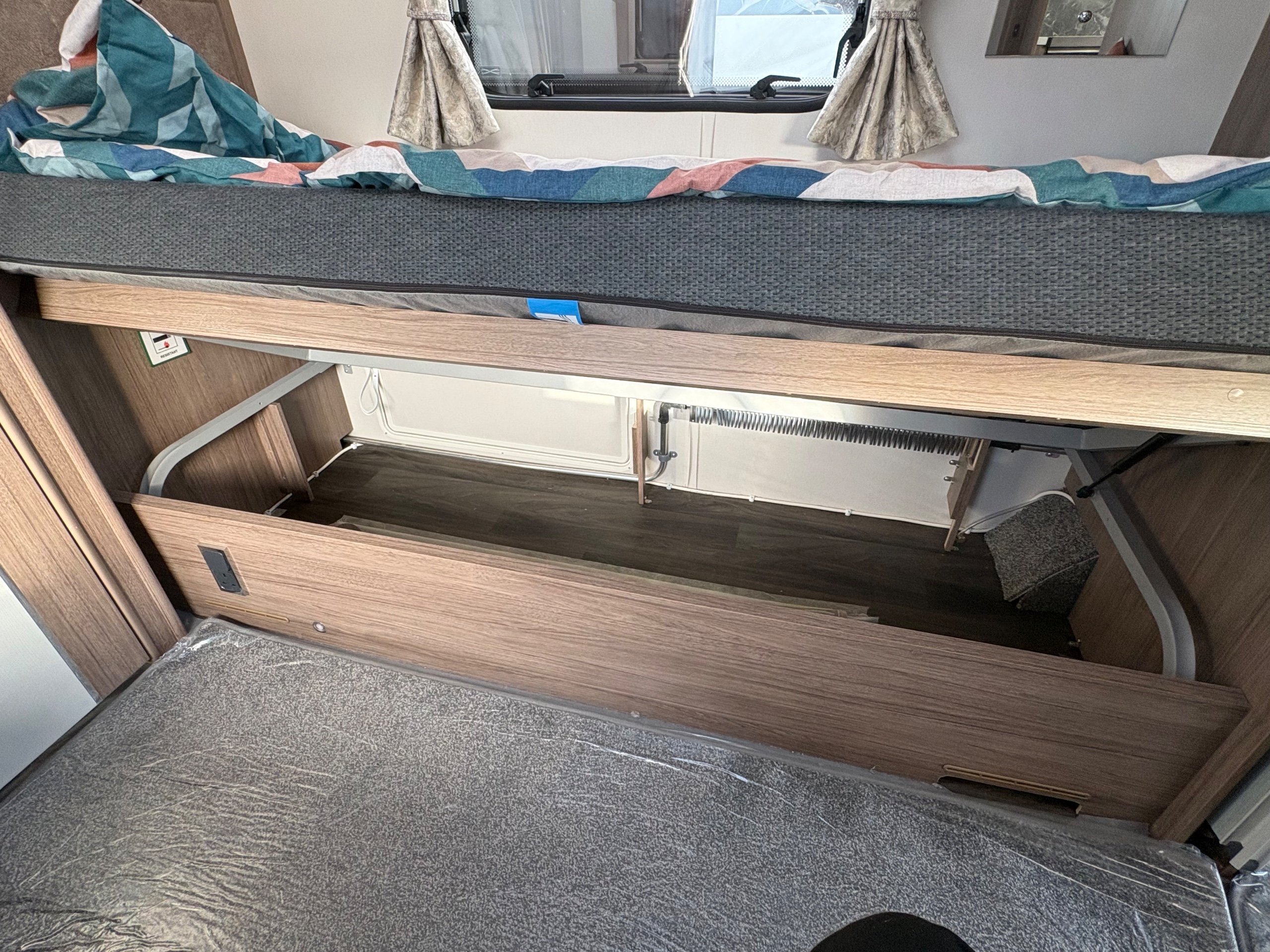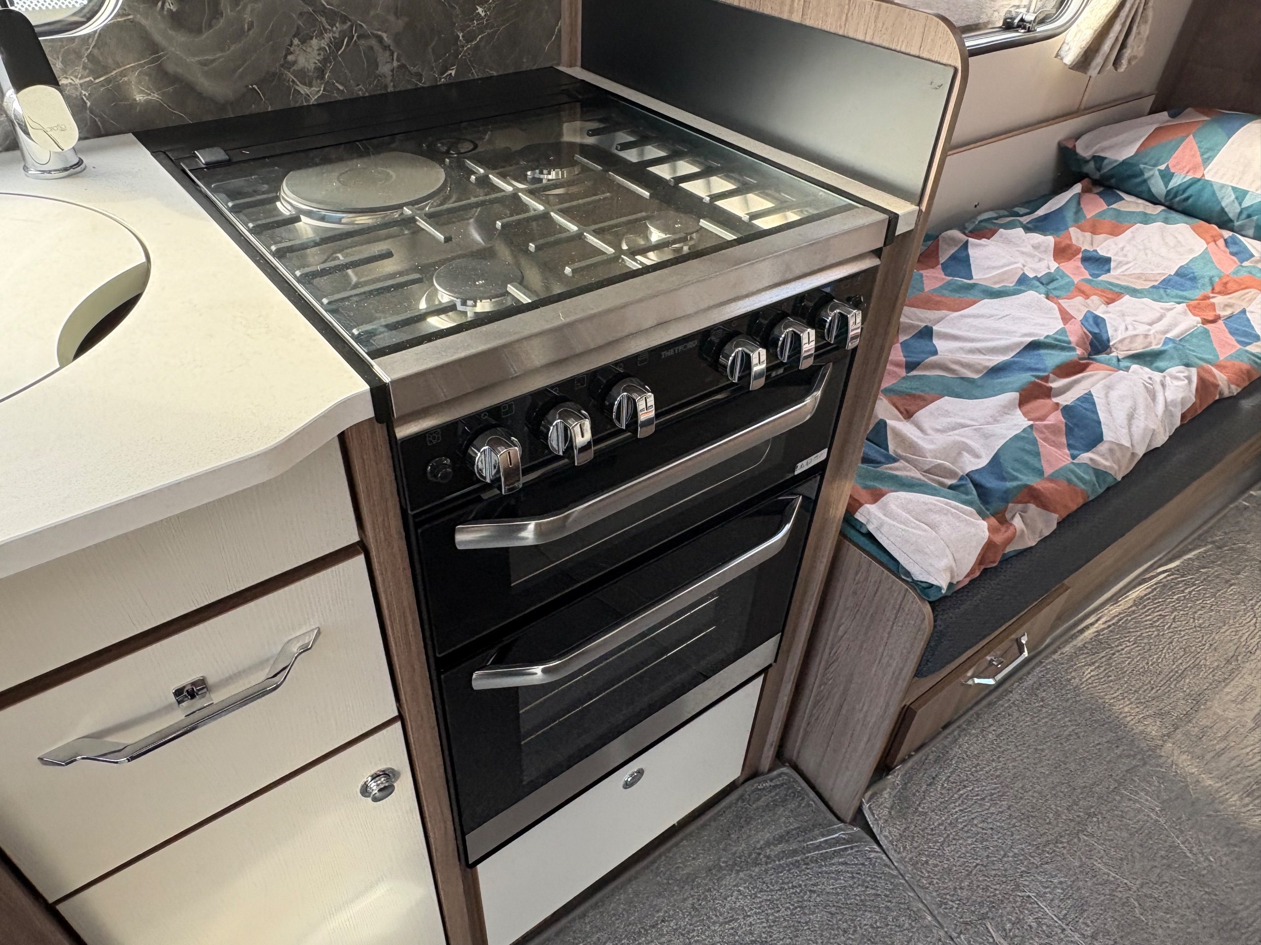 Year: 2025, Berth: 4, Internal length: 5.74m / 18'10", External length: 7.37m / 24'2", Width: 2.31m / 7'7", Unladen weight: 1483kg, MTPLM: 1638kg, Awning size: 10.20m, Warranty: 3 years major components, 10 year bodyshell ( terms and conditions apply ). Twin rear fixed single beds and an end washroom are featured in this model. With the wardrobe midships, it frees up more space in the washroom providing freedom of movement. Mainly used as a two berth it will sleep up to four dependant on requirements, allowing for individual access to either bed, perfect for those who are up in the night! Being on the 7'7" bodyshell and with the help of the big front sunroof, this model always feel bright and airy with a nice open plan feel. -