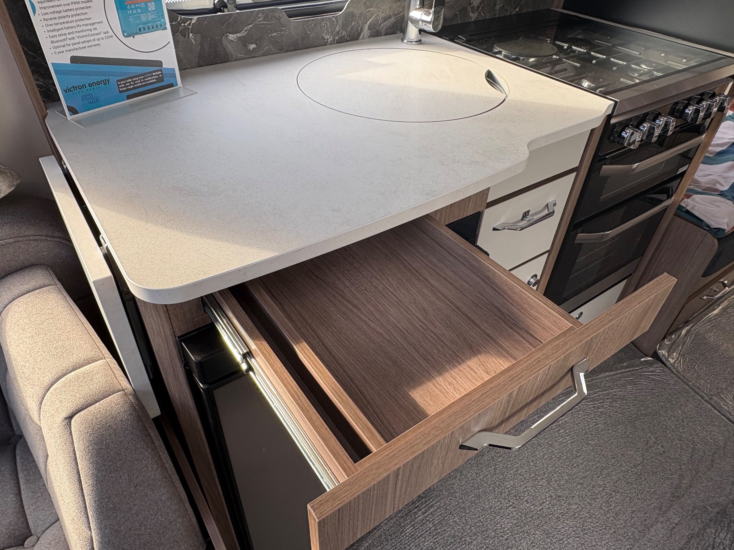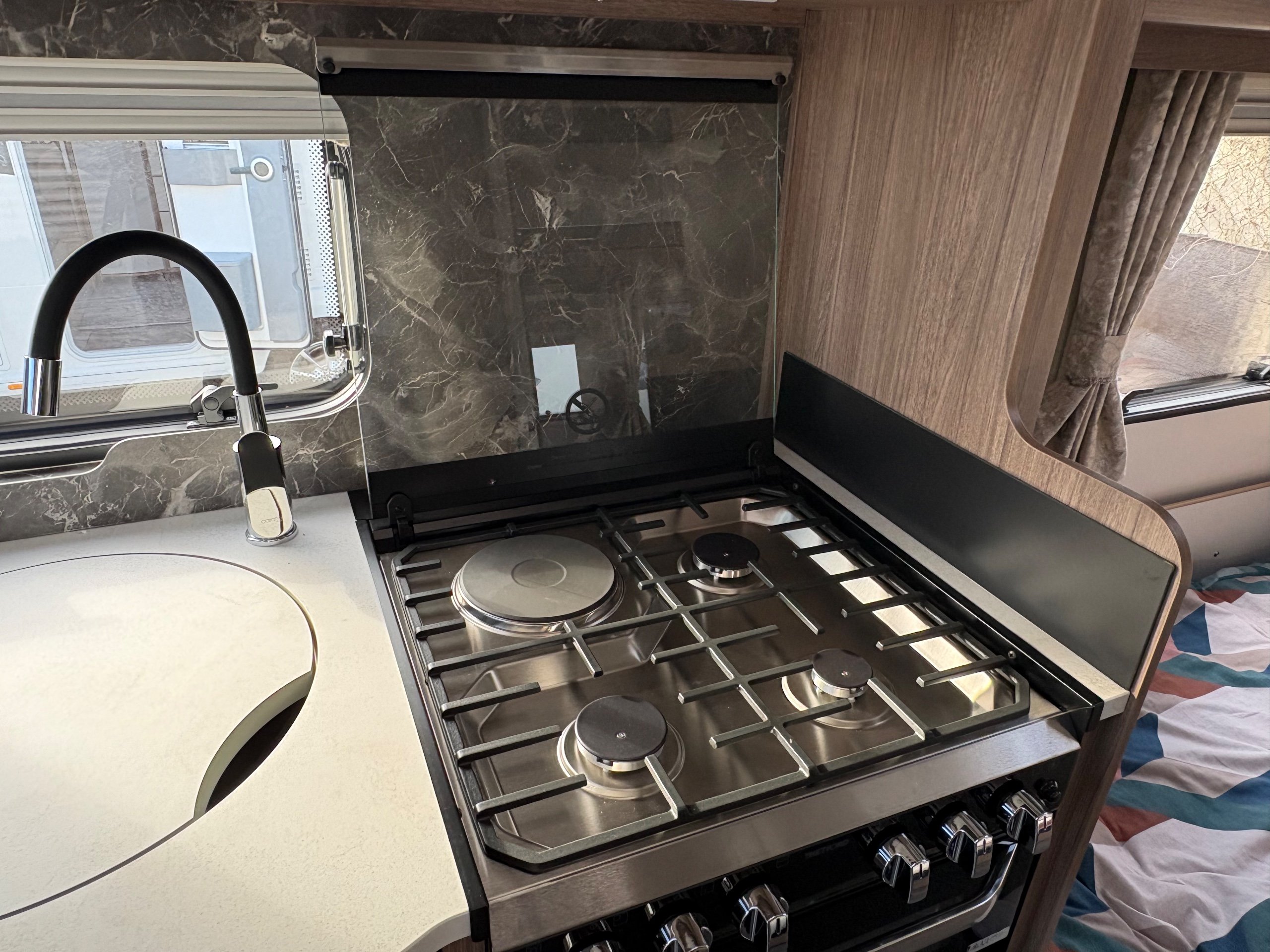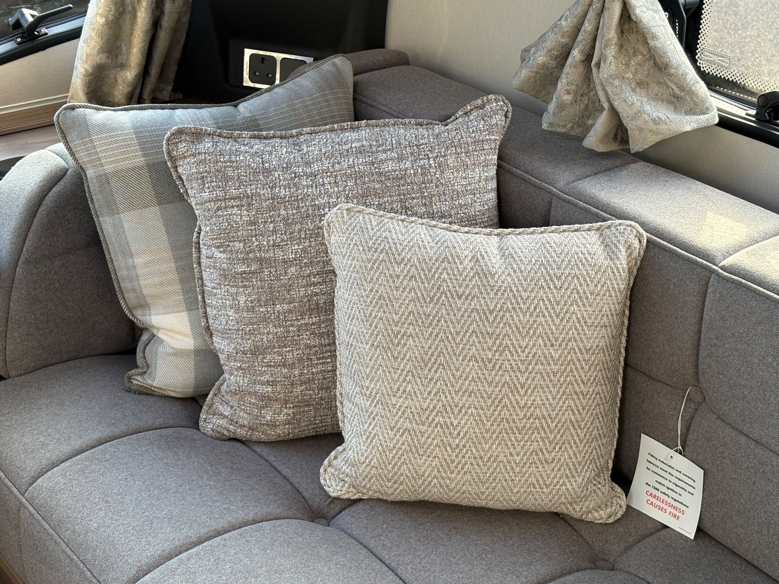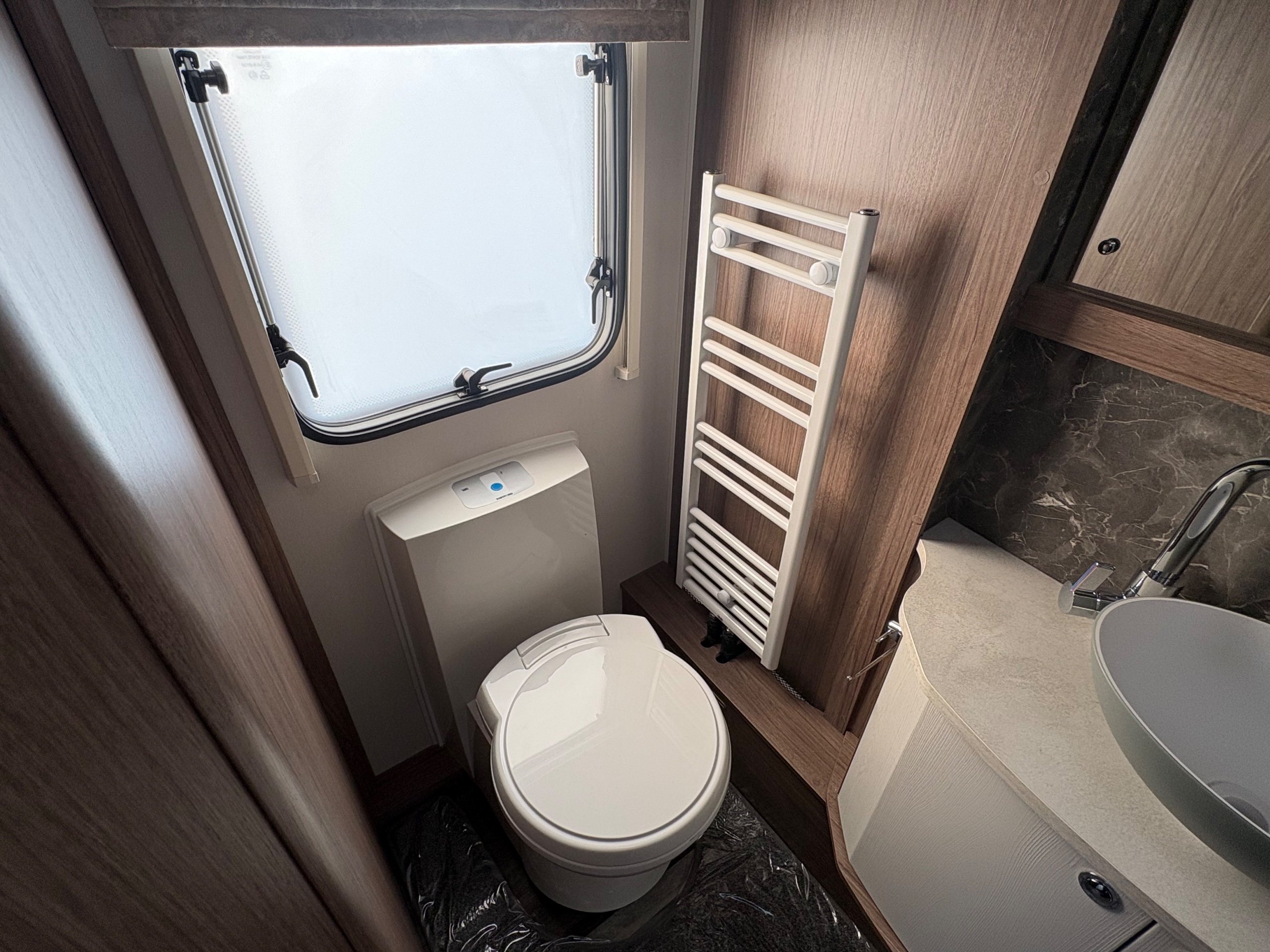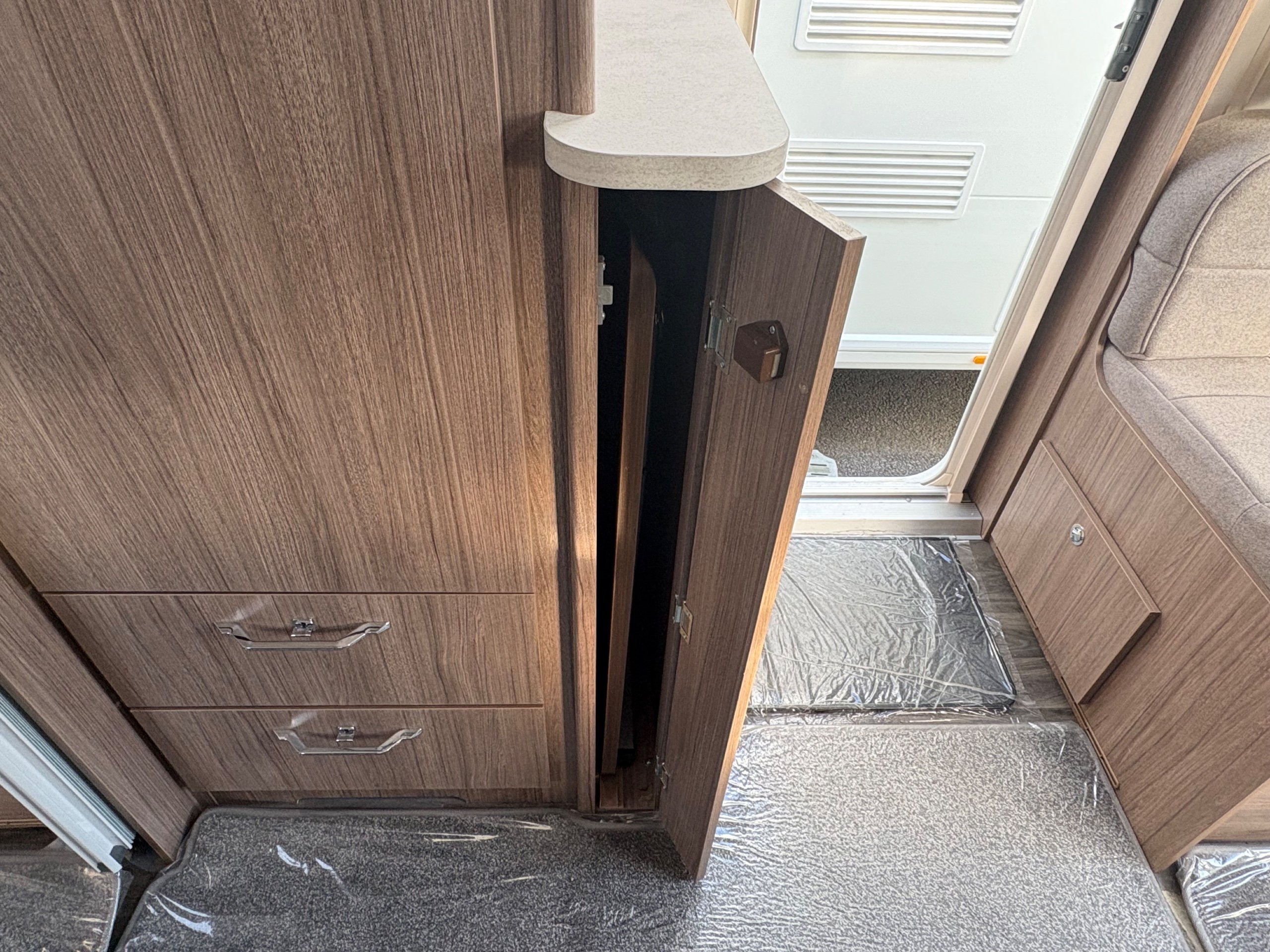 Year: 2025, Berth: 4, Internal length: 5.74m / 18'10", External length: 7.37m / 24'2", Width: 2.31m / 7'7", Unladen weight: 1483kg, MTPLM: 1638kg, Awning size: 10.20m, Warranty: 3 years major components, 10 year bodyshell ( terms and conditions apply ). Twin rear fixed single beds and an end washroom are featured in this model. With the wardrobe midships, it frees up more space in the washroom providing freedom of movement. Mainly used as a two berth it will sleep up to four dependant on requirements, allowing for individual access to either bed, perfect for those who are up in the night! Being on the 7'7" bodyshell and with the help of the big front sunroof, this model always feel bright and airy with a nice open plan feel. -