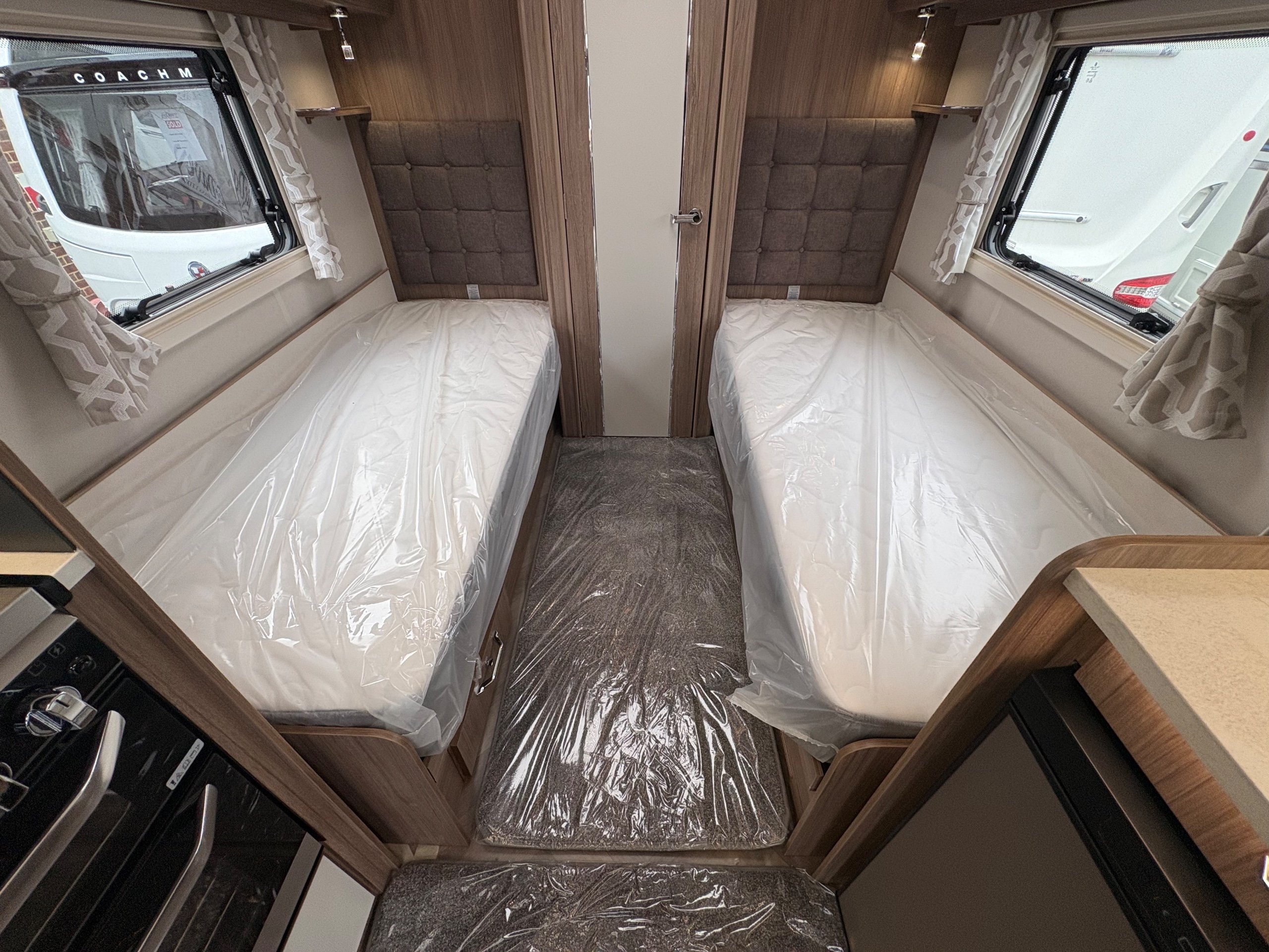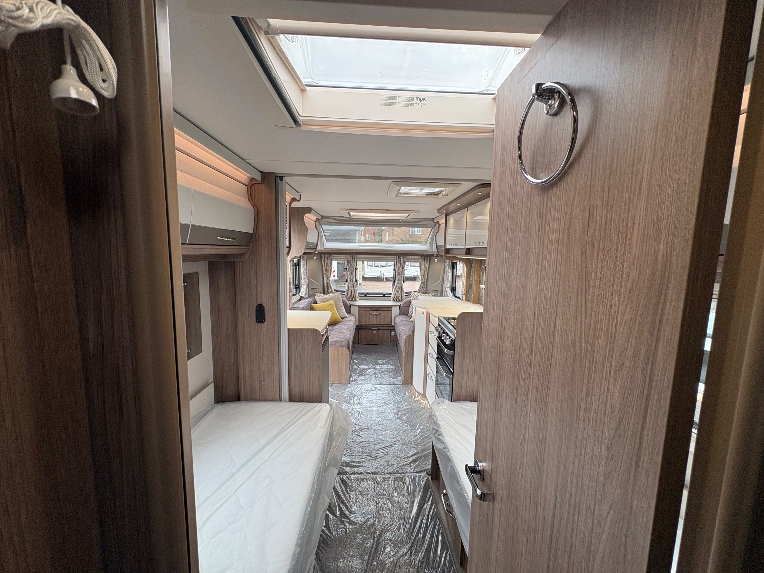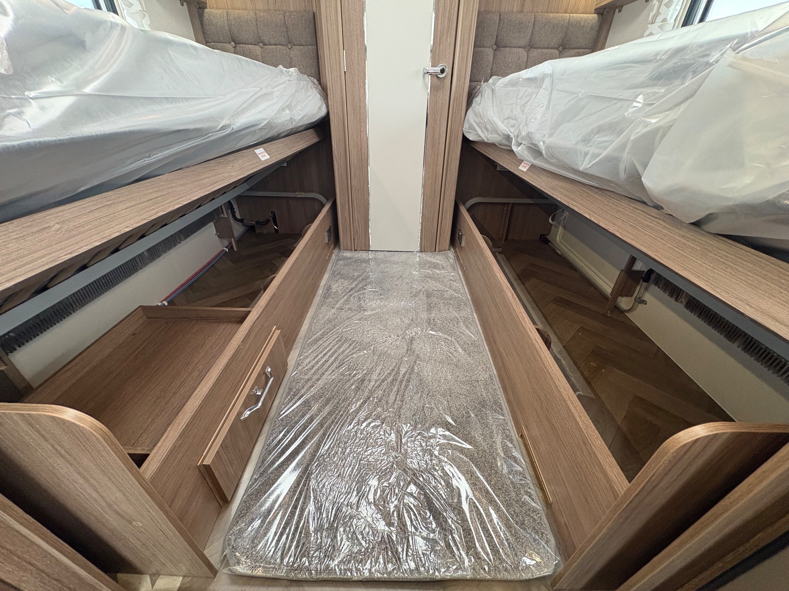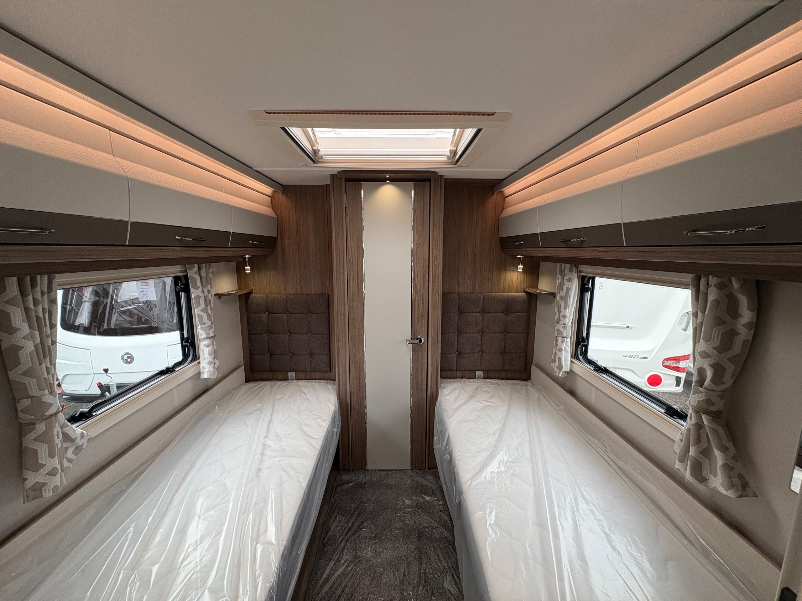 Year: 2026, Berth: 4, Internal length: 5.74m / 18'10", External length: 7.37m / 24'2", Width: 2.31m / 7'7", Unladen weight: 1483kg ( Upgraded MTPLM: 1700kg ), MTPLM: 1638kg, Awning size: 10.20m, Warranty: 3 years major components, 10 year bodyshell ( subject to terms and conditions ). This model features twin rear fixed single beds, and a rear washroom. Alde heating , atc braking, alko wheel locks and external mains and gas points are just a few of the items supplied with this caravan as standard. A bright and spacious lounge with sprung seats, provide a pleasant environment in which to spend your day. The single beds offer convenience of not disturbing others when getting in and out of bed. The square shower in the washroom provides plenty of room to use your own facilities if you wish, along with enough room to access the toilet etc. -