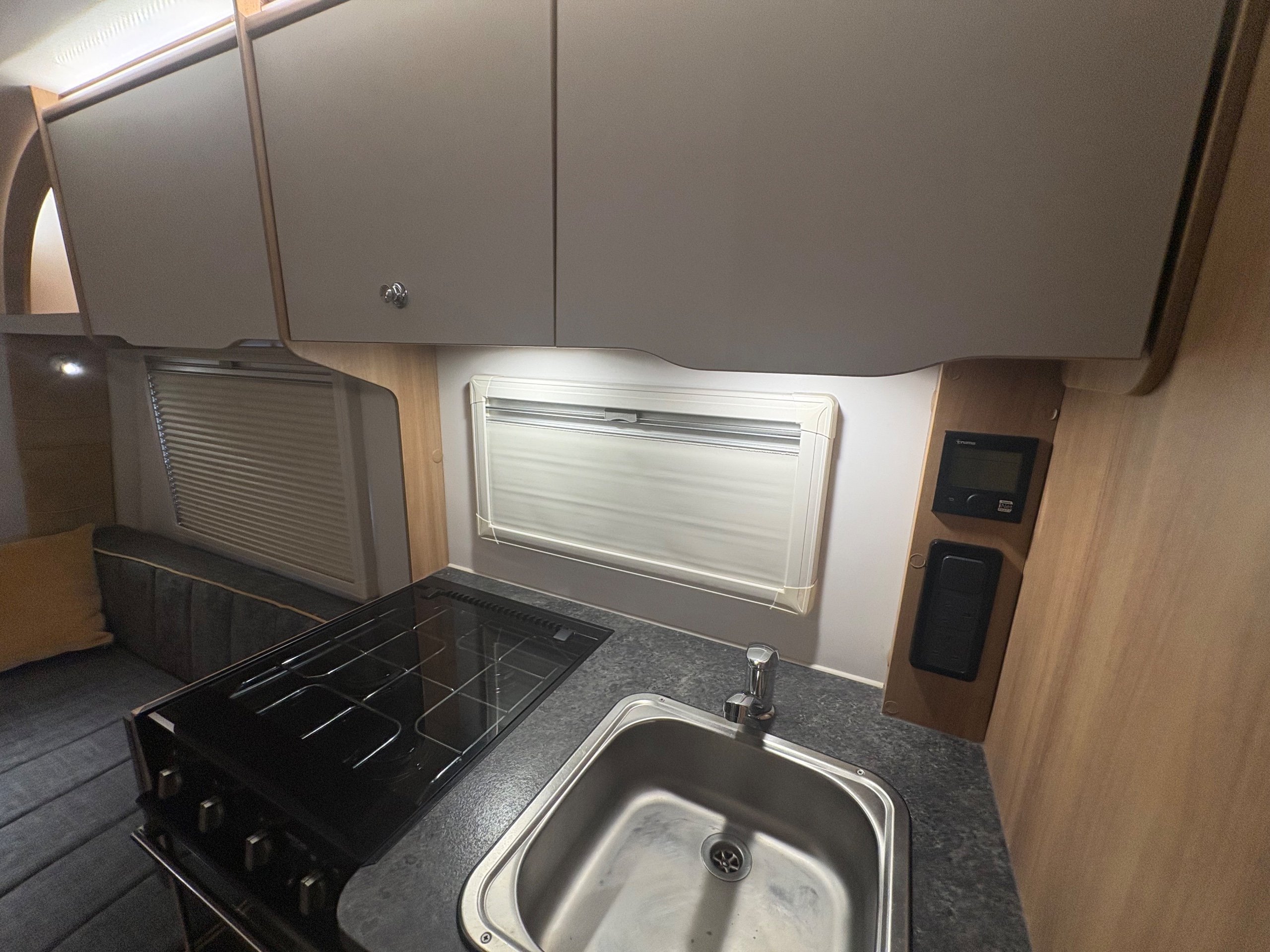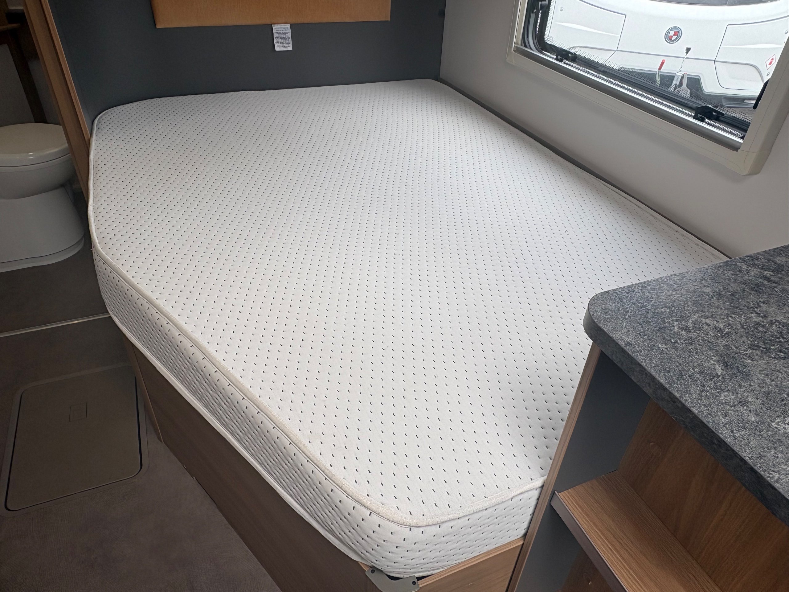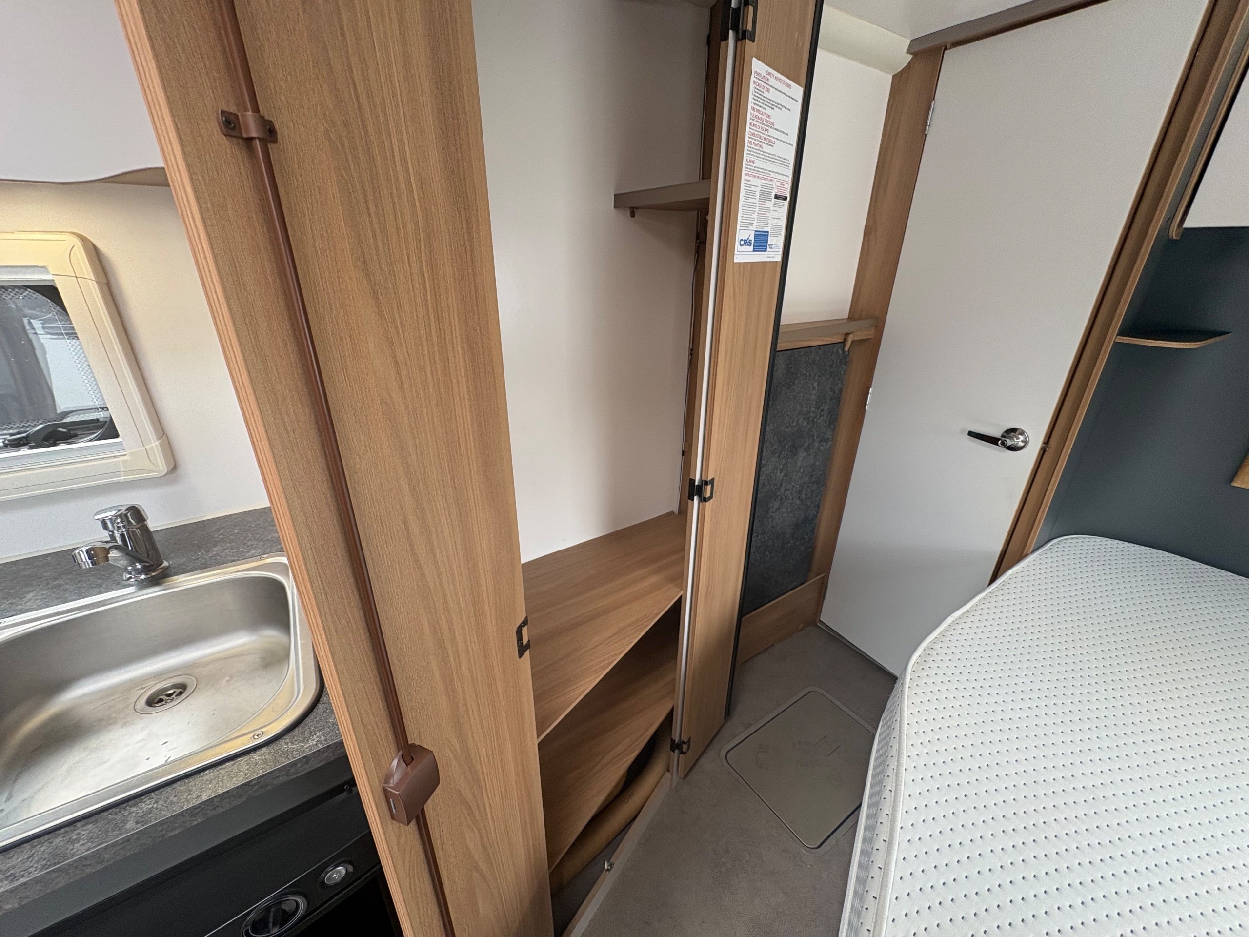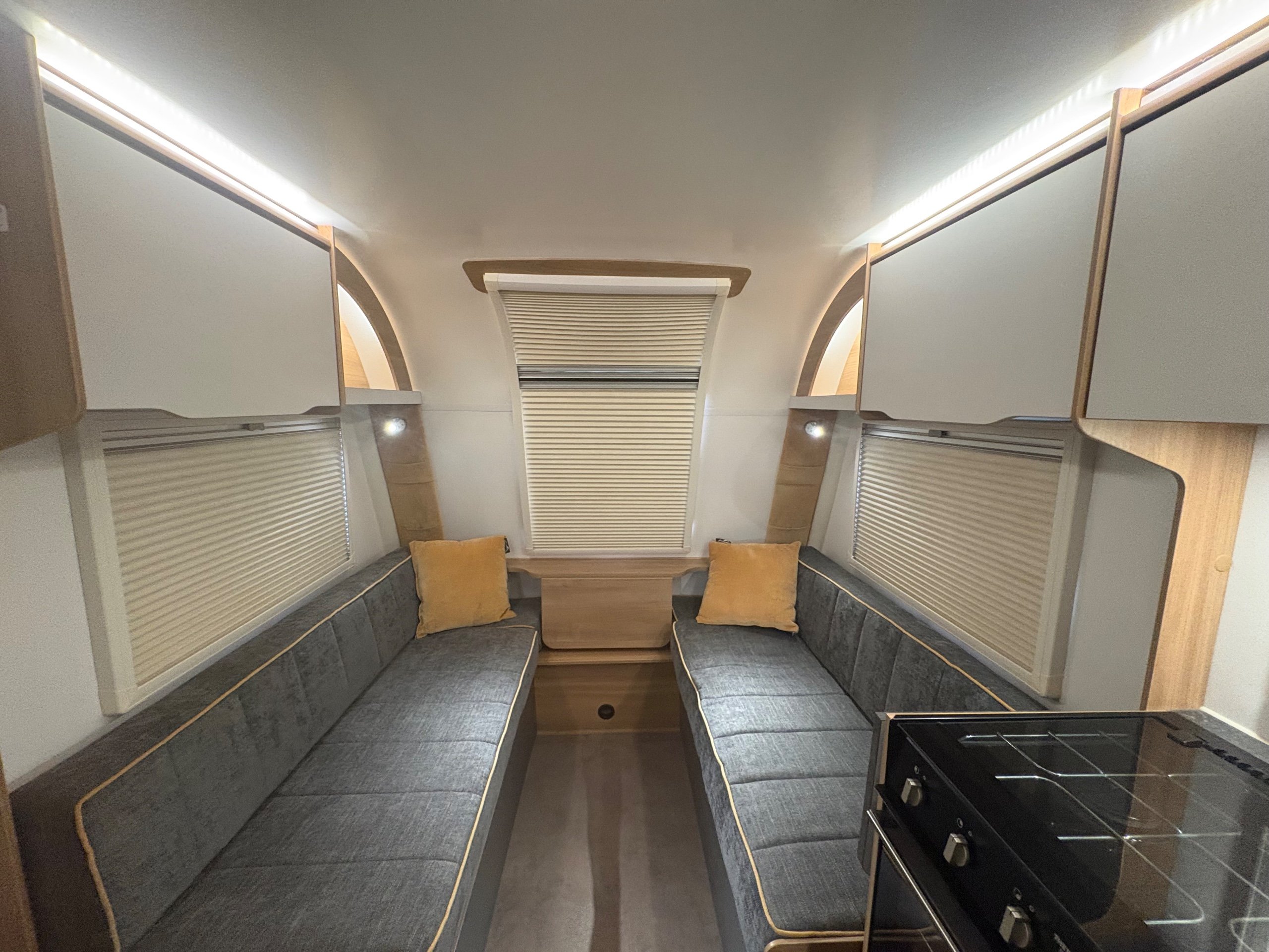 Year: 2021, Berth: 4, Internal length: 5.31m / 17'4", External length: 7.15m / 23'5", Width: 2.28m / 7'4", Unladen weight: 1059kg, MTPLM: 1206kg, Warranty: 12 months. This light weight caravan is perfect for customers looking to use lighter or hybrid vehicles, who still want a fixed bed caravan. The truma heater and full end washroom, allow customers to be self contained if they wish, whenever they want to use their caravan. The long euro A frame provides space for a cycle carrier to be fitted, with enough space to keep the bicycles safe when towing. -