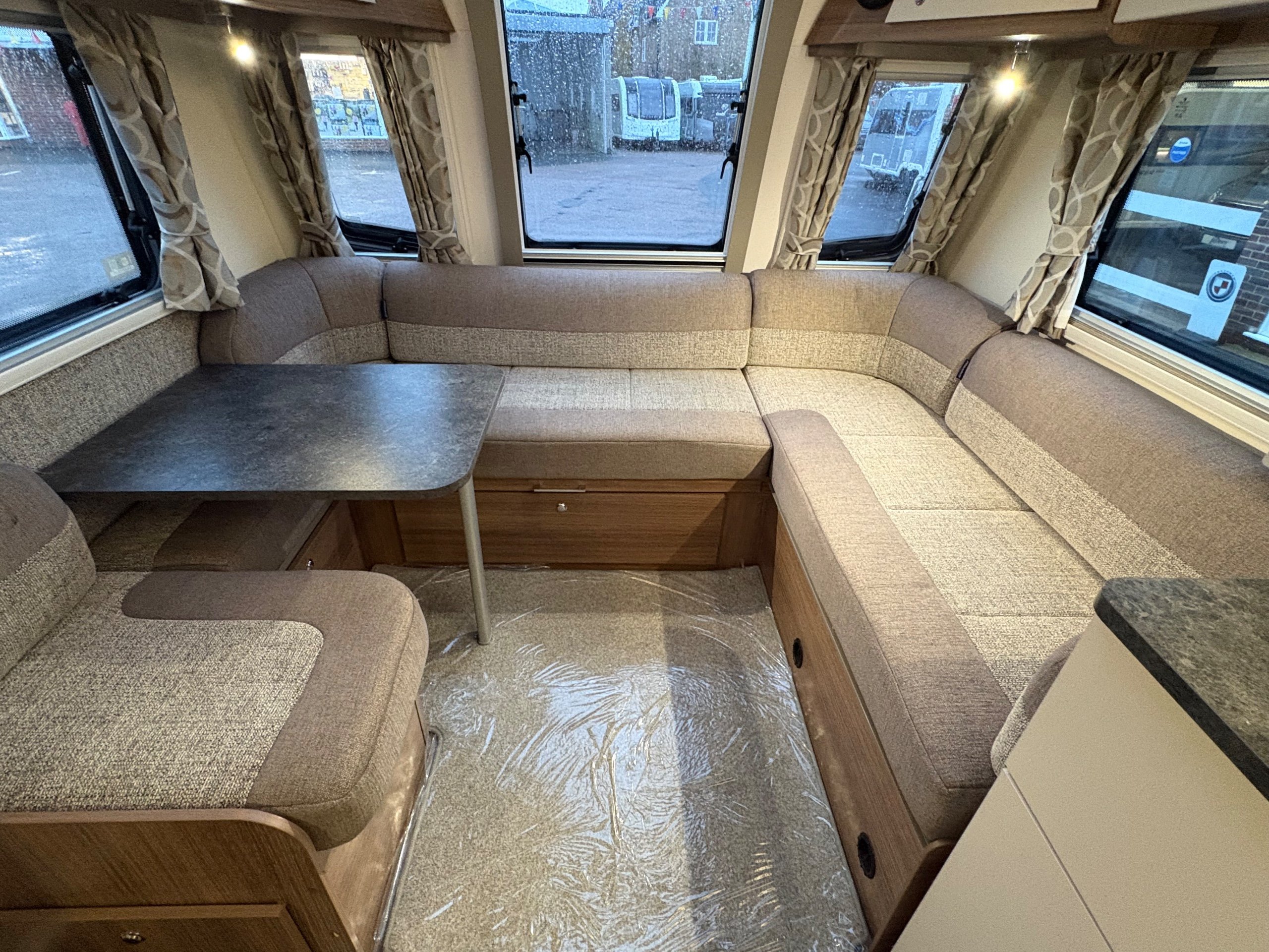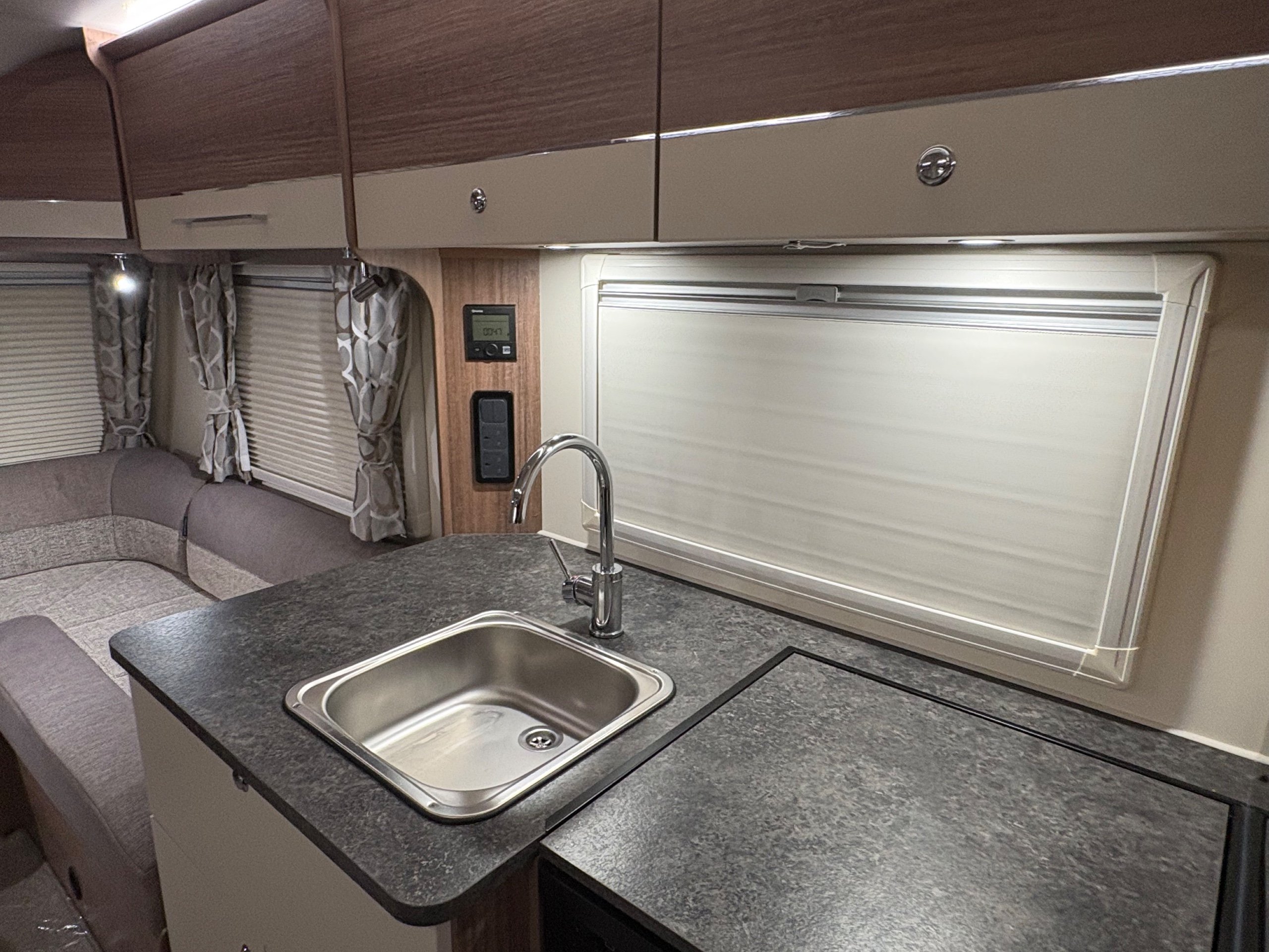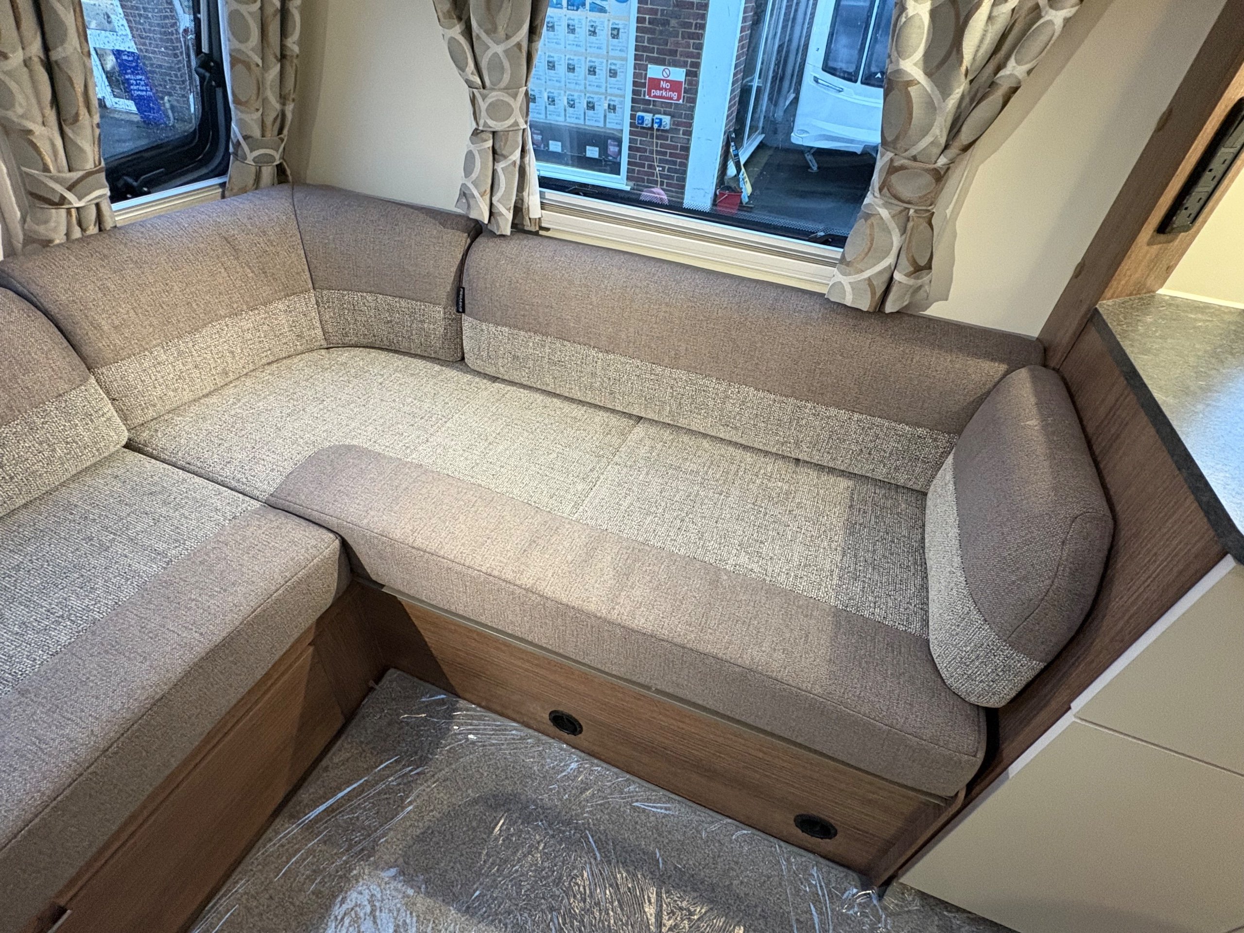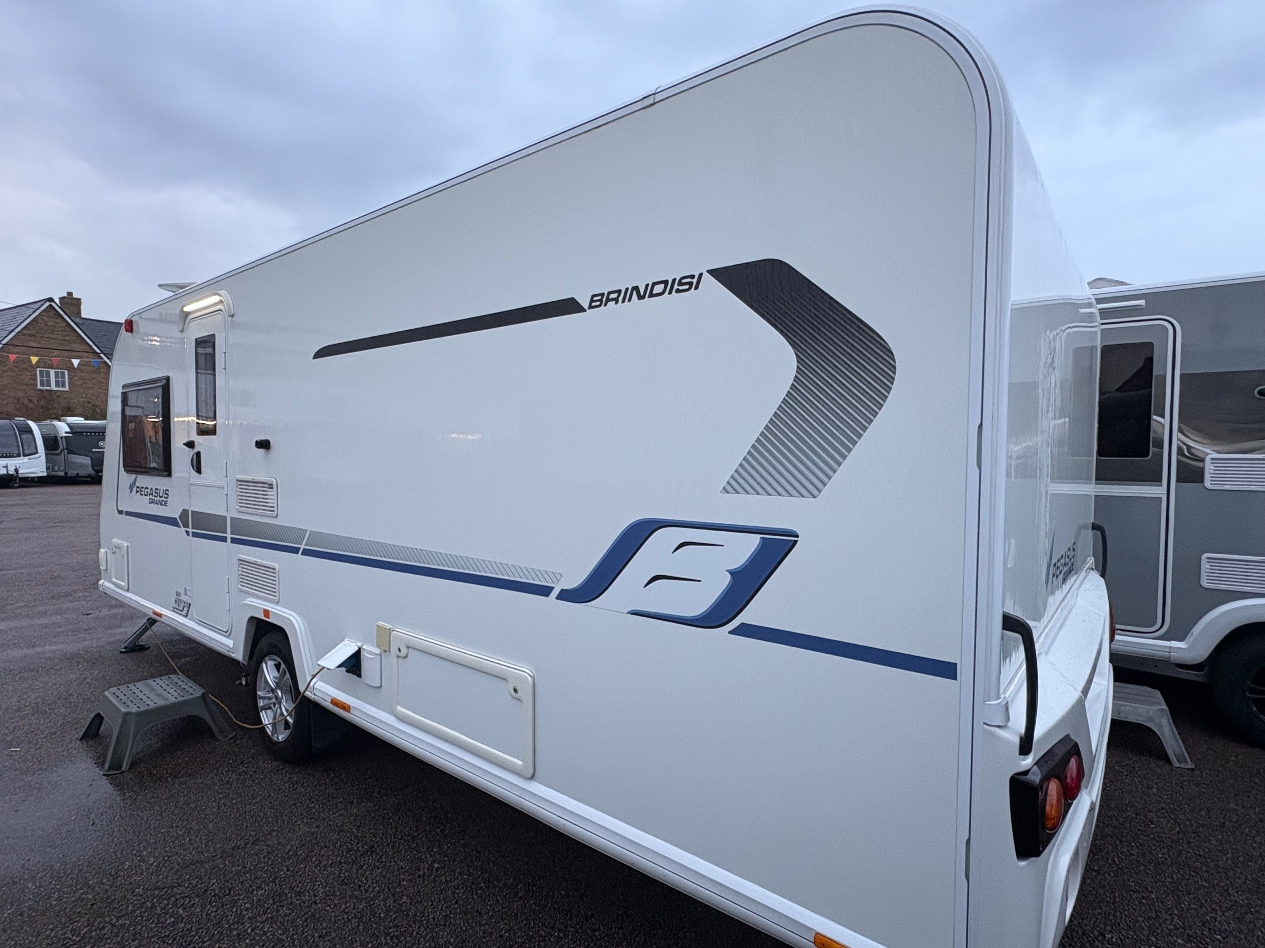 Year: 2020, Berth: 4, Internal length: 5.90m / 19'4", External length: 7.38m / 24'2", Width: 2.45m / 8', Unladen weight: 1350kg, MTPLM: 1499kg, Awning size: 10.33m, Warranty: 12 months. The Brindisi provides plenty of living space through its eight foot wide bodyshell, This is very noticeable where in conjunction with the G shaped front lounge, it provides lots of room for numerous people to sit together around a table, or just to chill out and watch the world go by. The transverse double bed slides back during the day to improve access to the rear washroom during the day, and then extending to provide a double bed at night. The rear washroom has a roomy corner shower, and enough space to use as a dressing room should you wish to. This model also comes with a caravan mover to assist in positioning the caravan. -