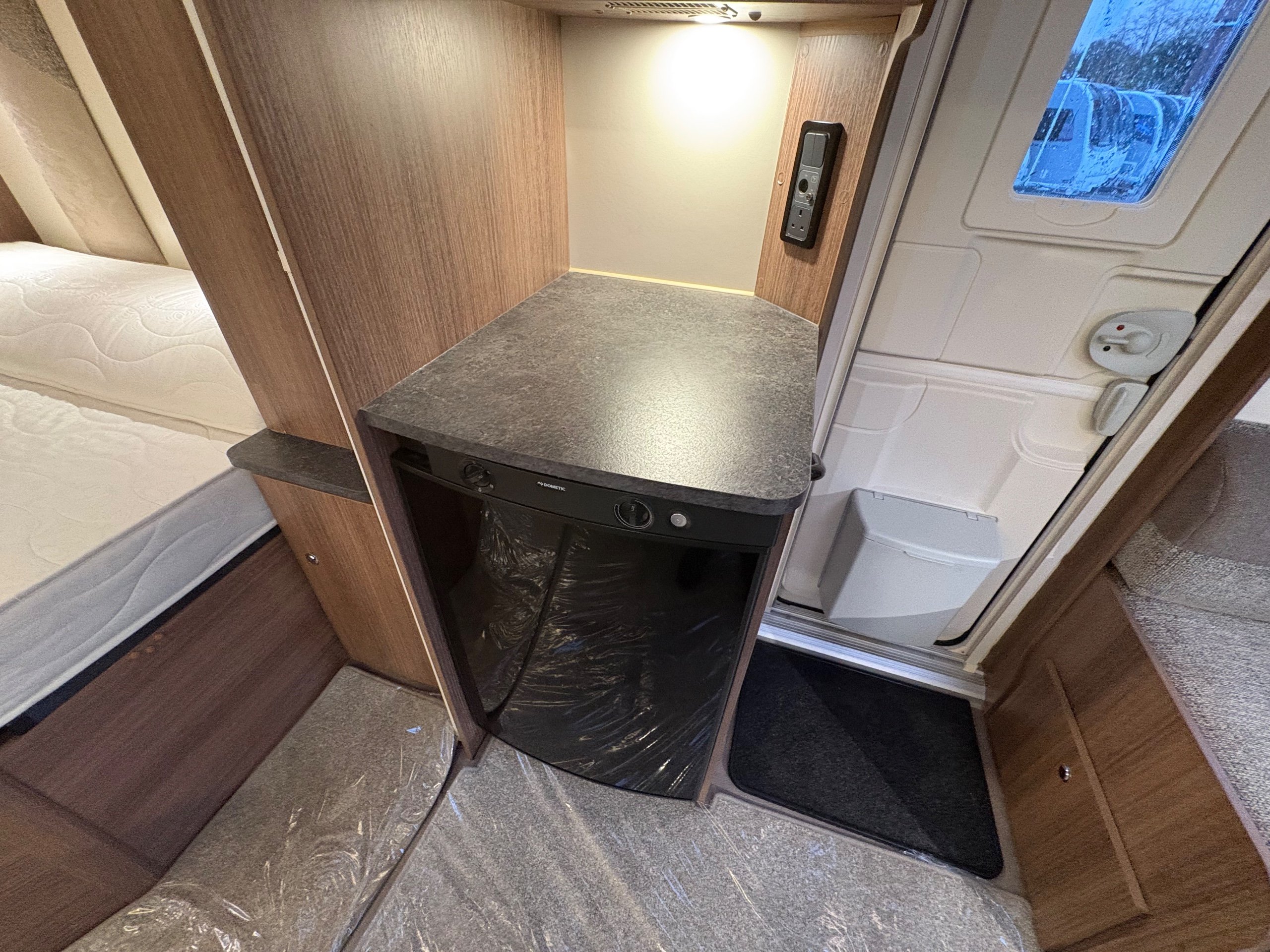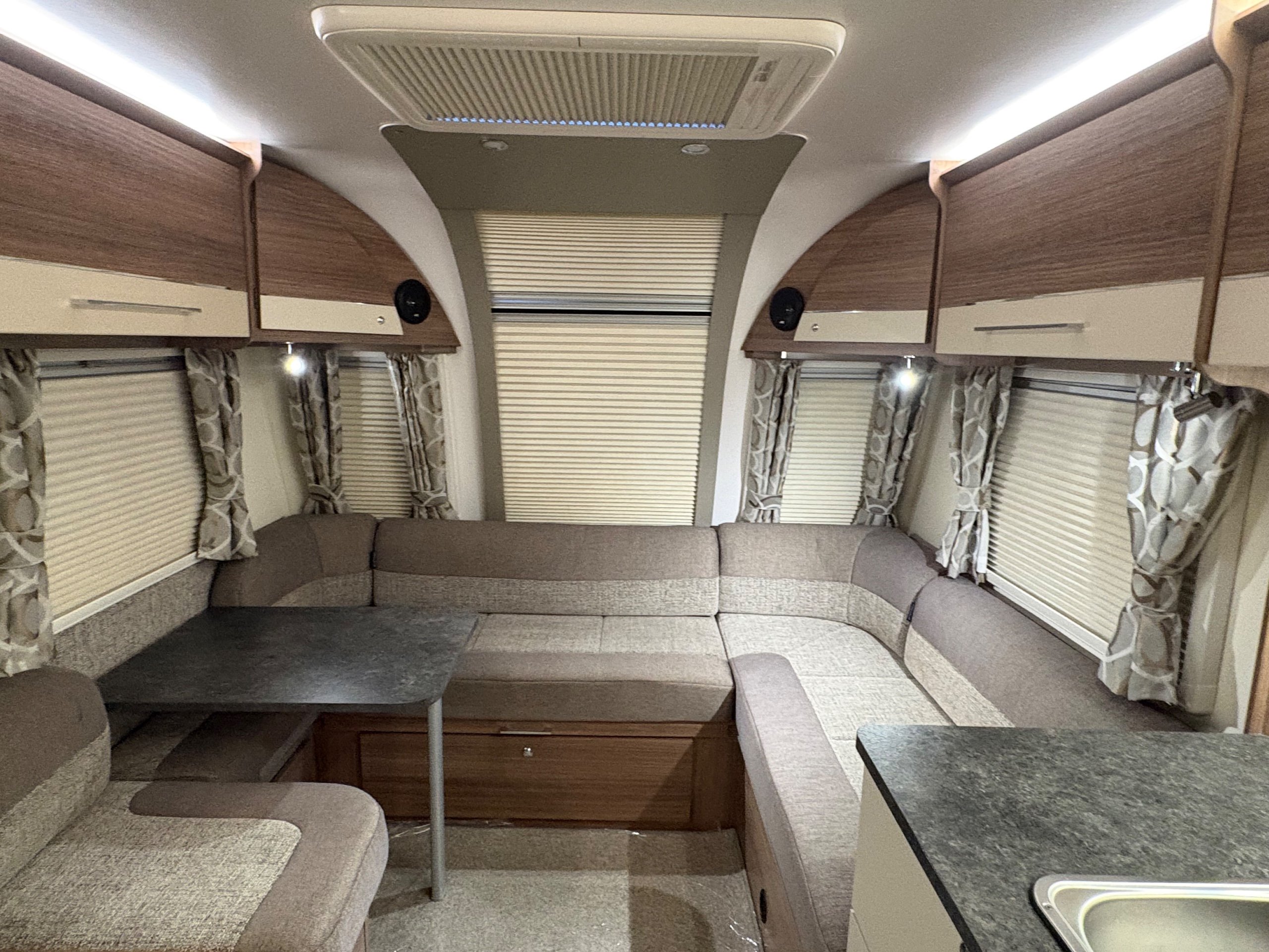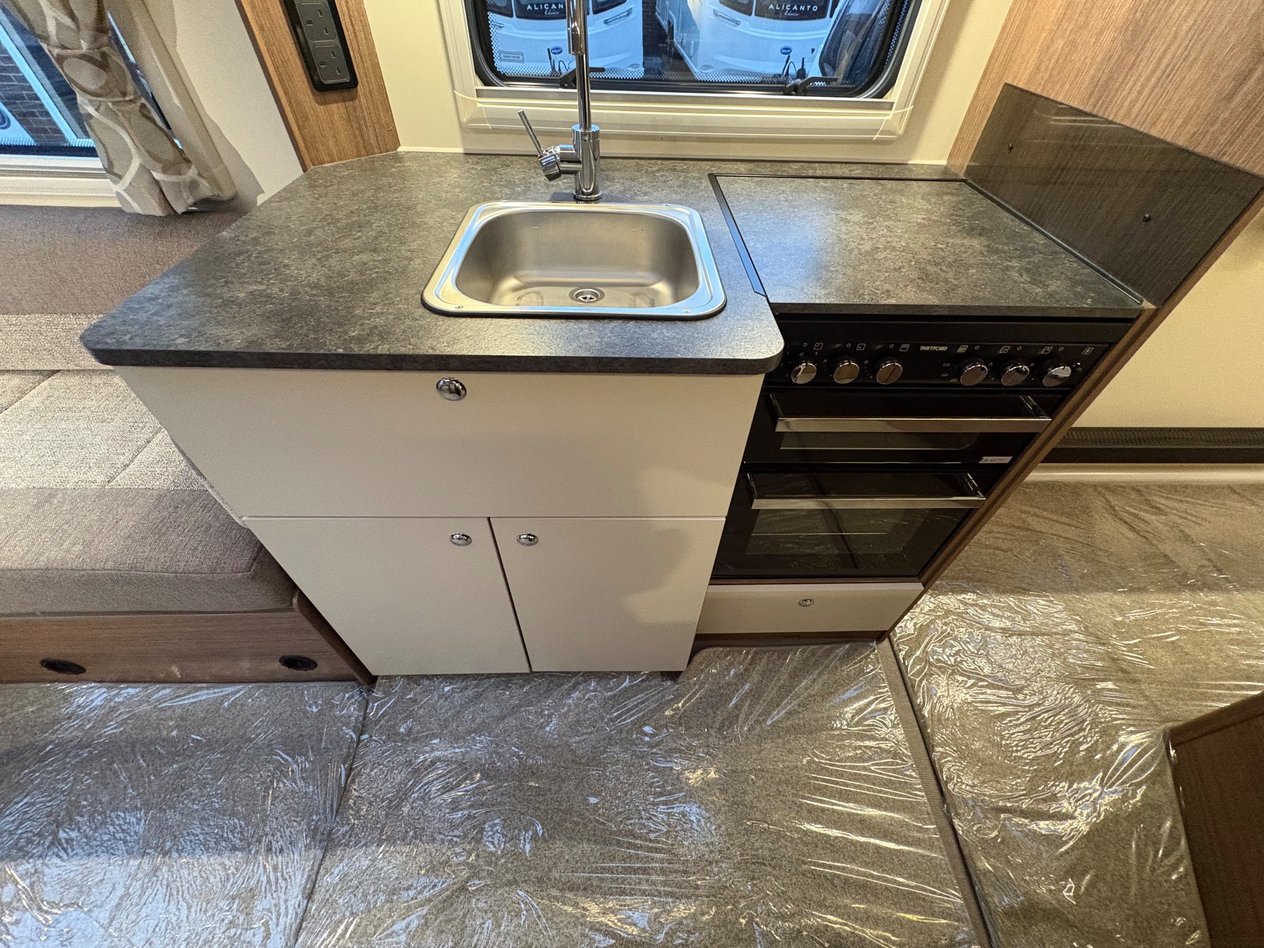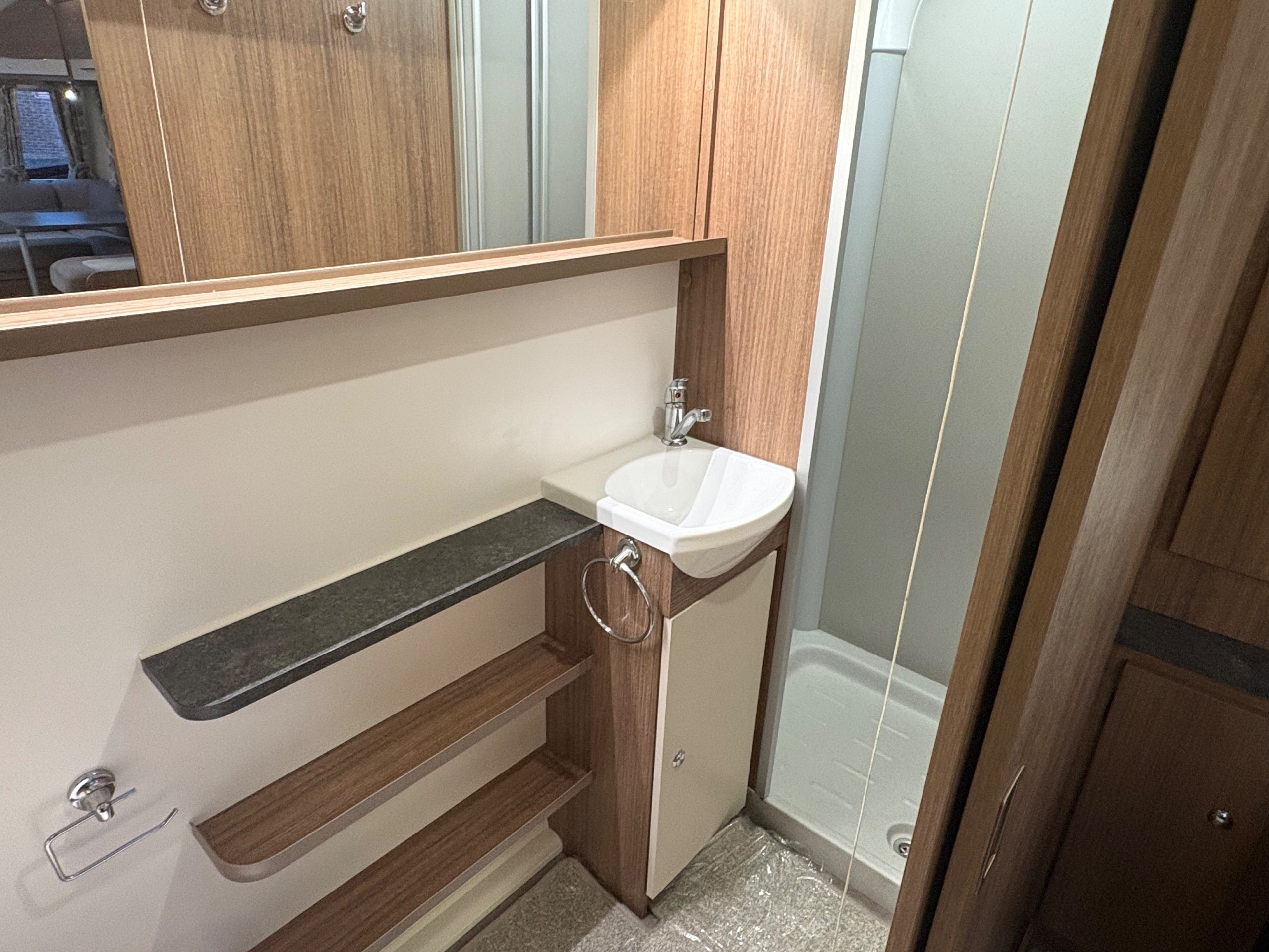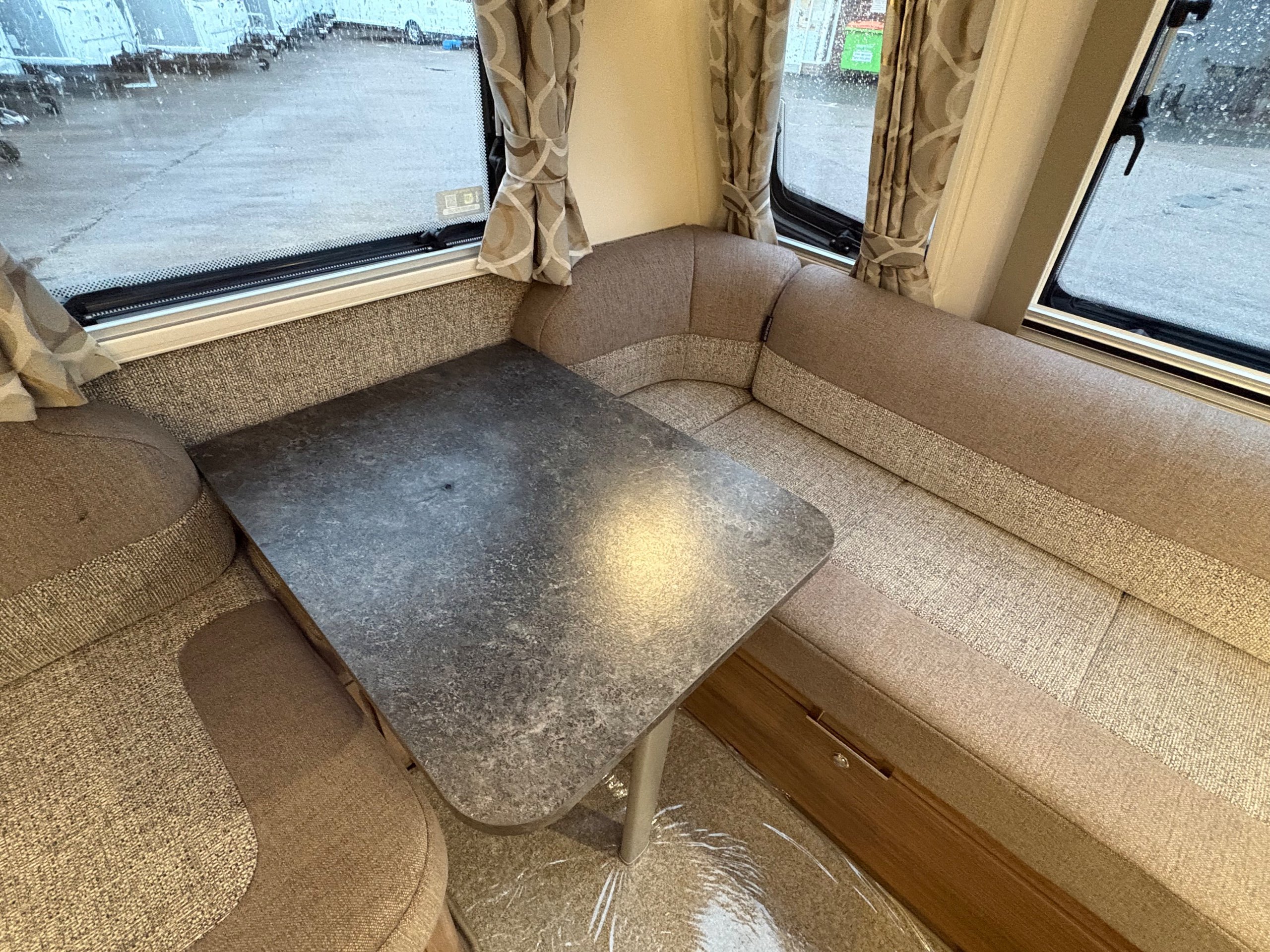 Year: 2020, Berth: 4, Internal length: 5.90m / 19'4", External length: 7.38m / 24'2", Width: 2.45m / 8', Unladen weight: 1350kg, MTPLM: 1499kg, Awning size: 10.33m, Warranty: 12 months. The Brindisi provides plenty of living space through its eight foot wide bodyshell, This is very noticeable where in conjunction with the G shaped front lounge, it provides lots of room for numerous people to sit together around a table, or just to chill out and watch the world go by. The transverse double bed slides back during the day to improve access to the rear washroom during the day, and then extending to provide a double bed at night. The rear washroom has a roomy corner shower, and enough space to use as a dressing room should you wish to. This model also comes with a caravan mover to assist in positioning the caravan. -