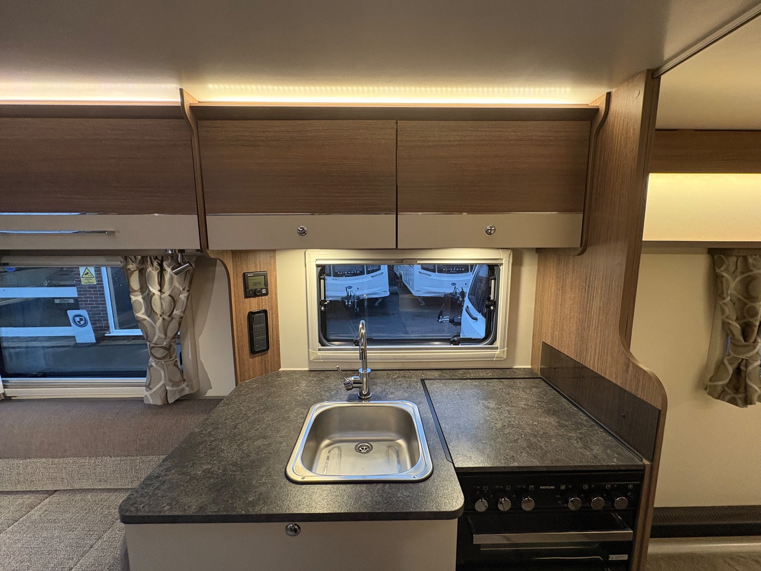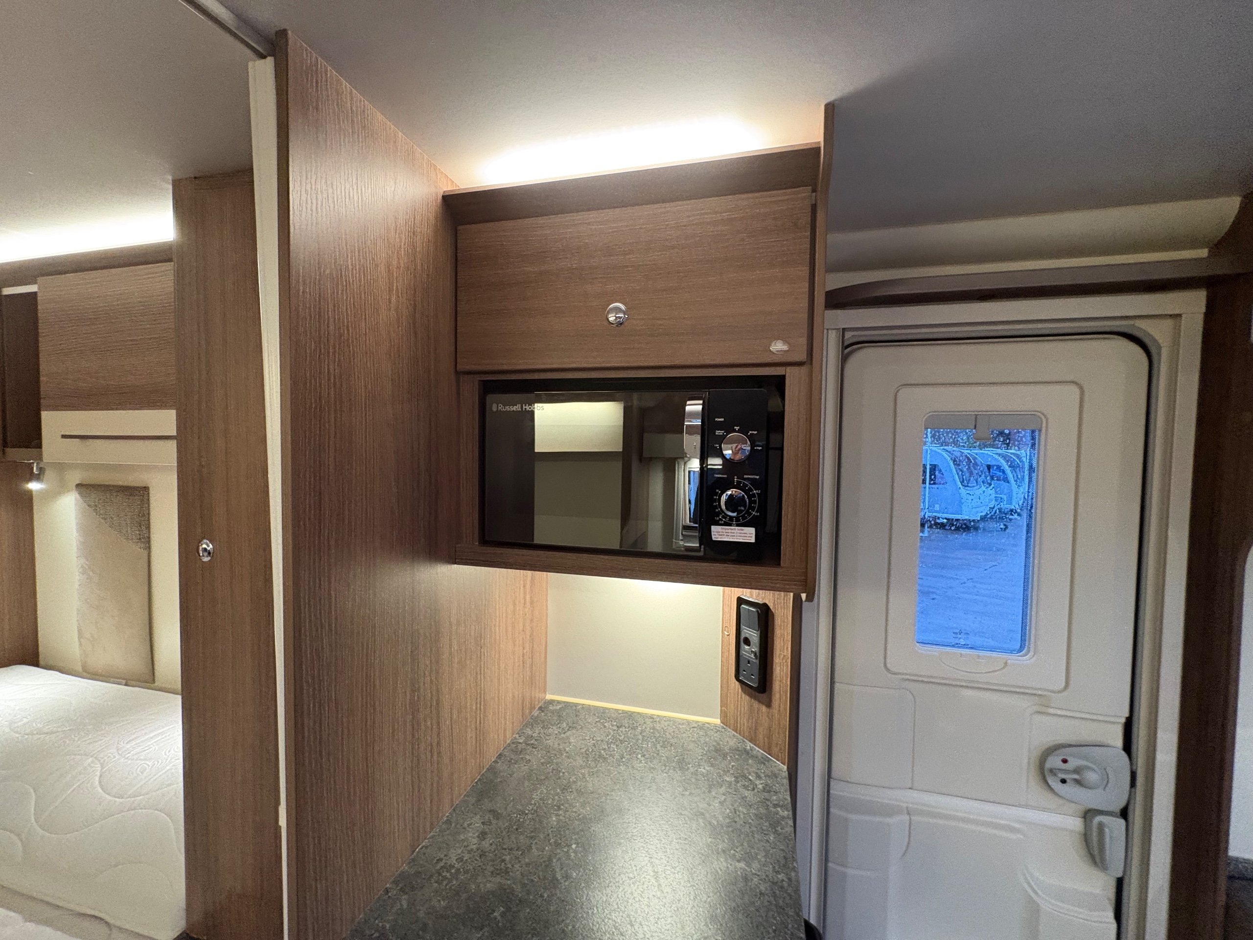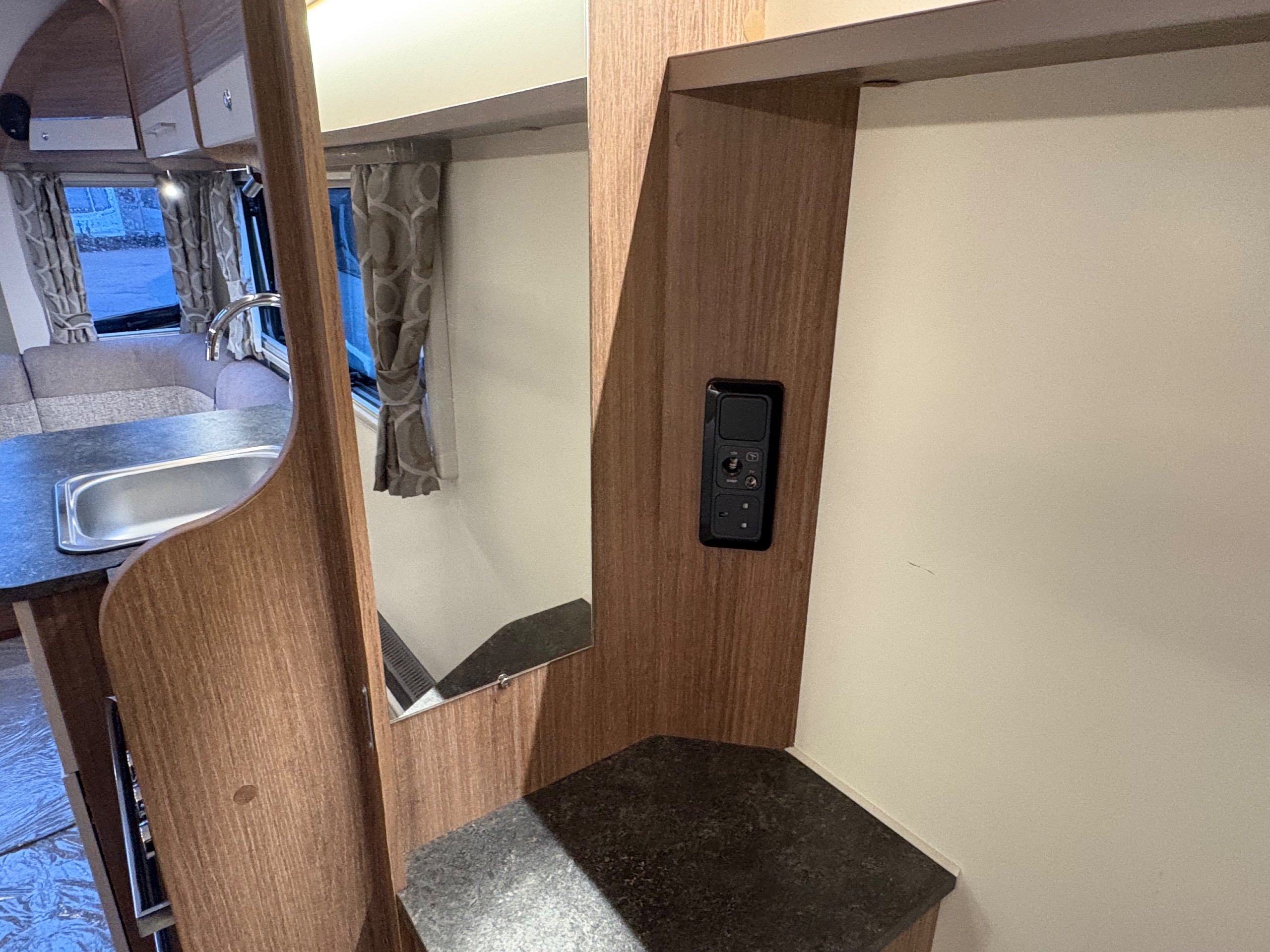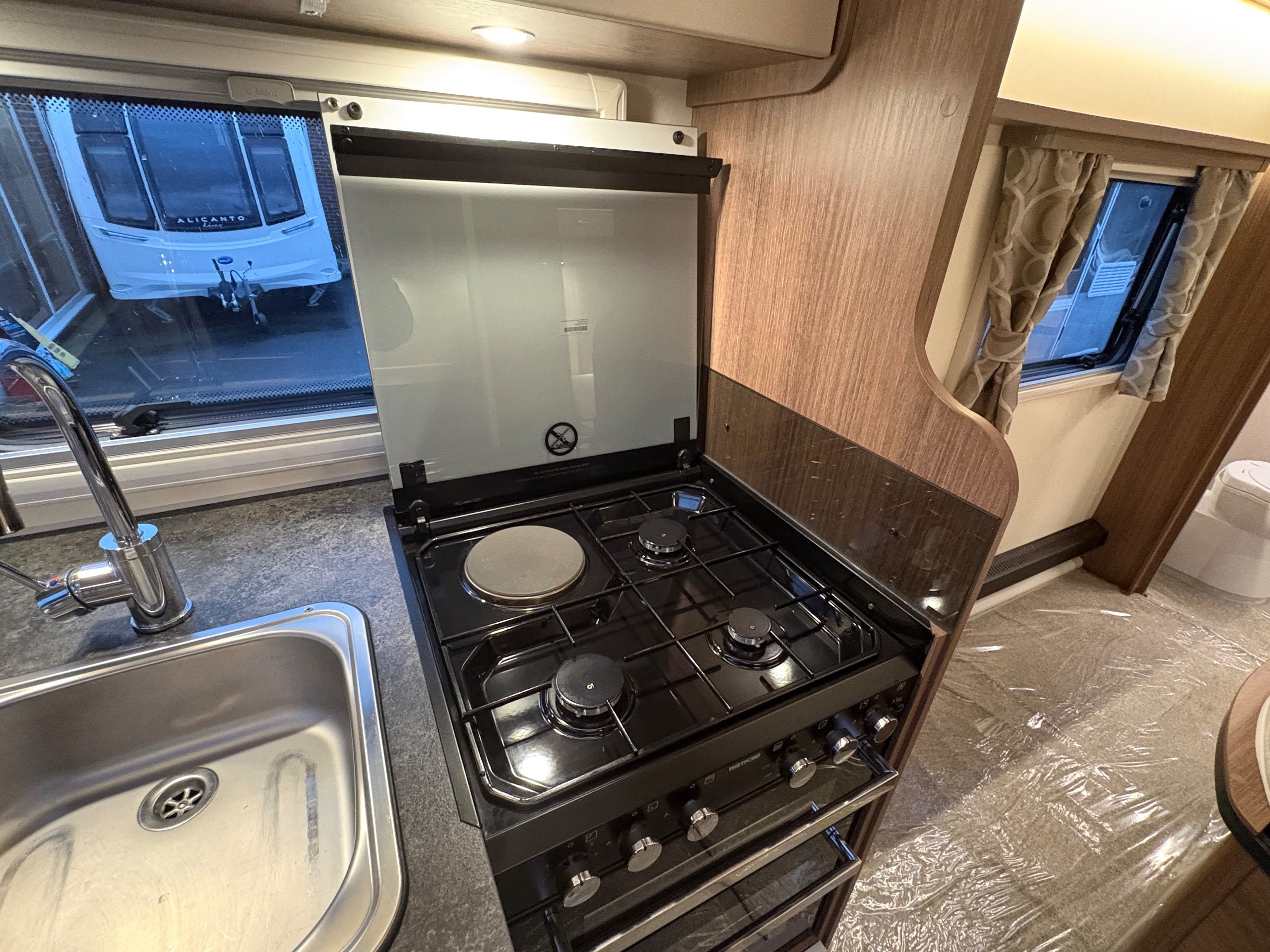 Year: 2020, Berth: 4, Internal length: 5.90m / 19'4", External length: 7.38m / 24'2", Width: 2.45m / 8', Unladen weight: 1350kg, MTPLM: 1499kg, Awning size: 10.33m, Warranty: 12 months. The Brindisi provides plenty of living space through its eight foot wide bodyshell, This is very noticeable where in conjunction with the G shaped front lounge, it provides lots of room for numerous people to sit together around a table, or just to chill out and watch the world go by. The transverse double bed slides back during the day to improve access to the rear washroom during the day, and then extending to provide a double bed at night. The rear washroom has a roomy corner shower, and enough space to use as a dressing room should you wish to. This model also comes with a caravan mover to assist in positioning the caravan. -