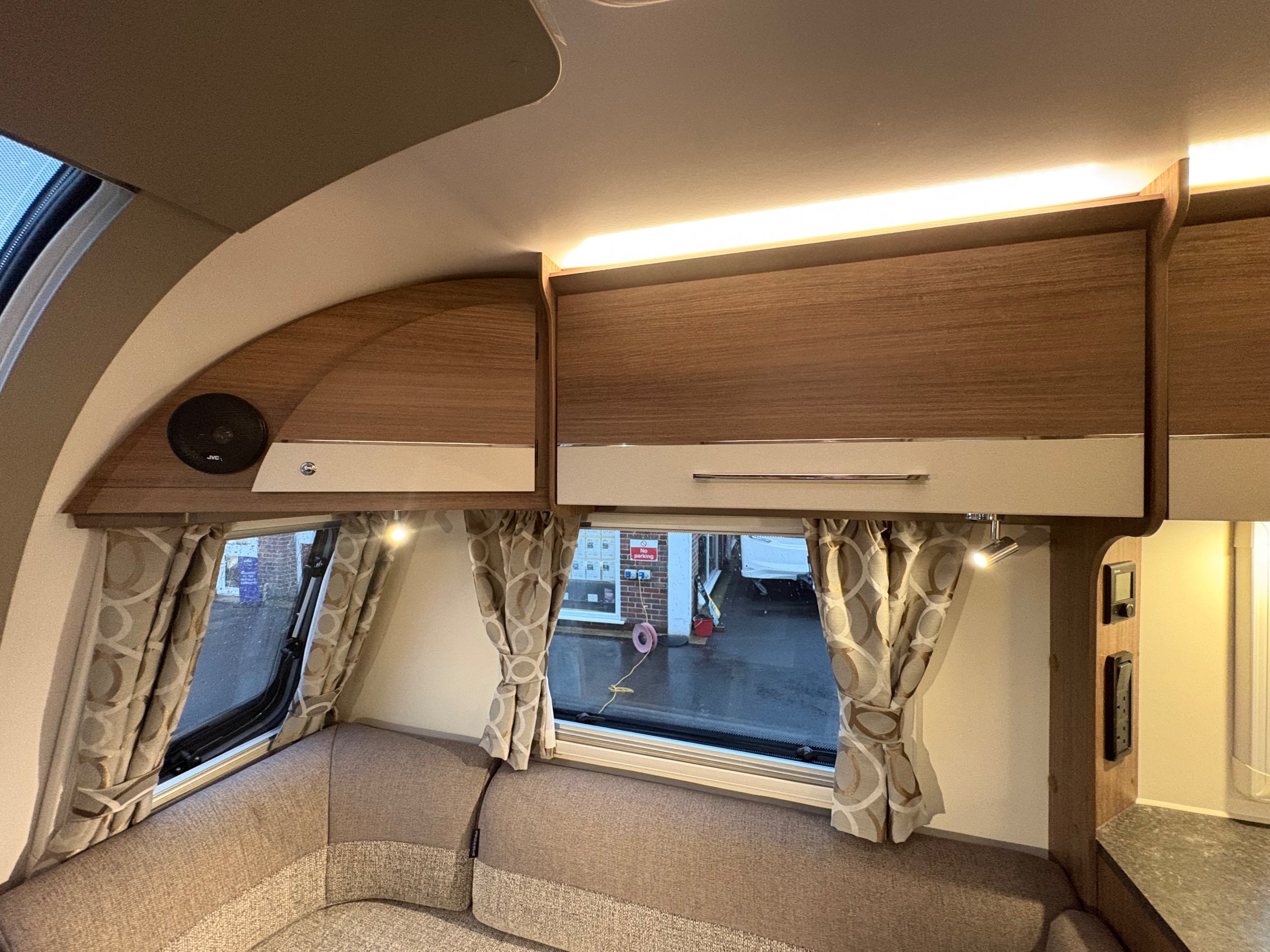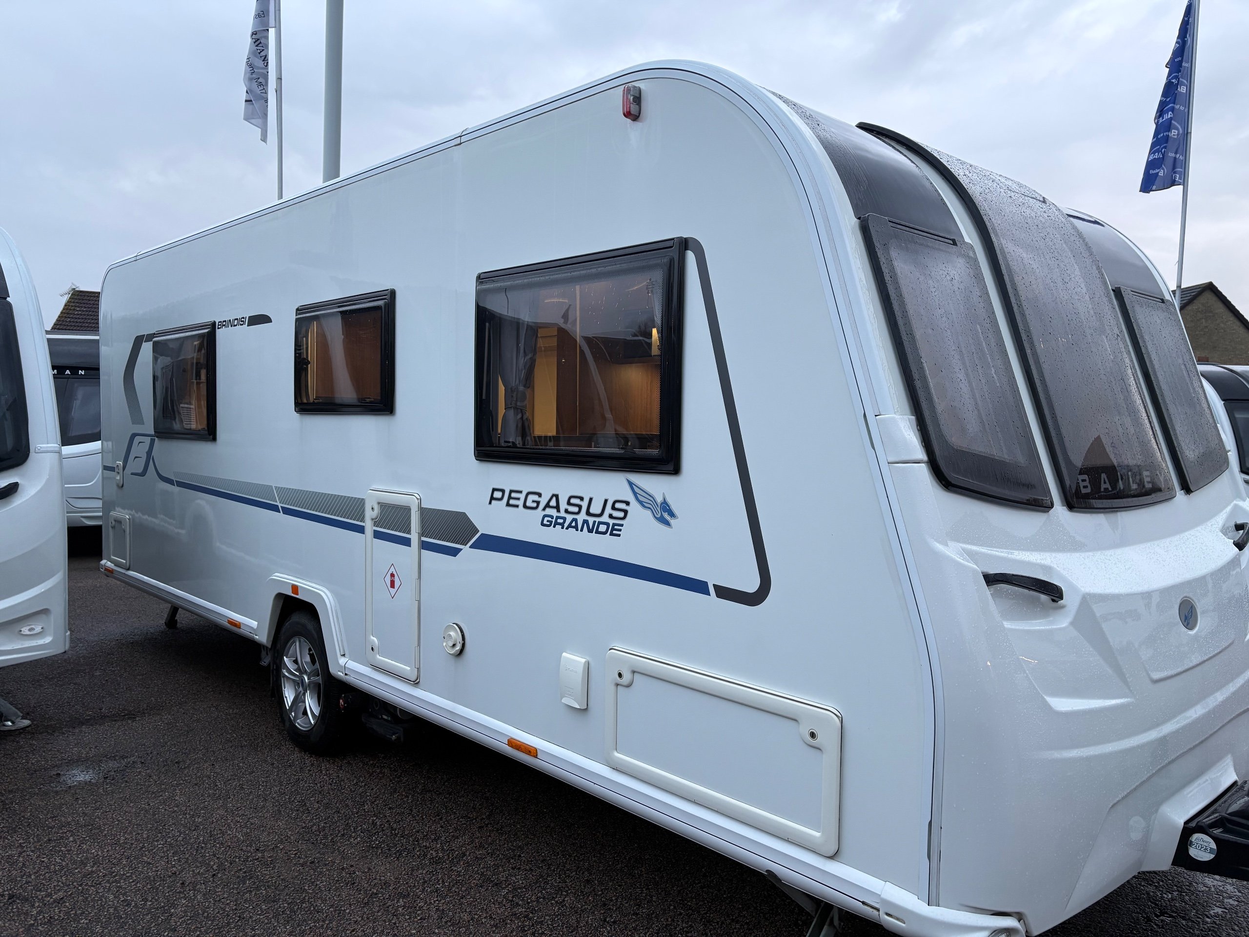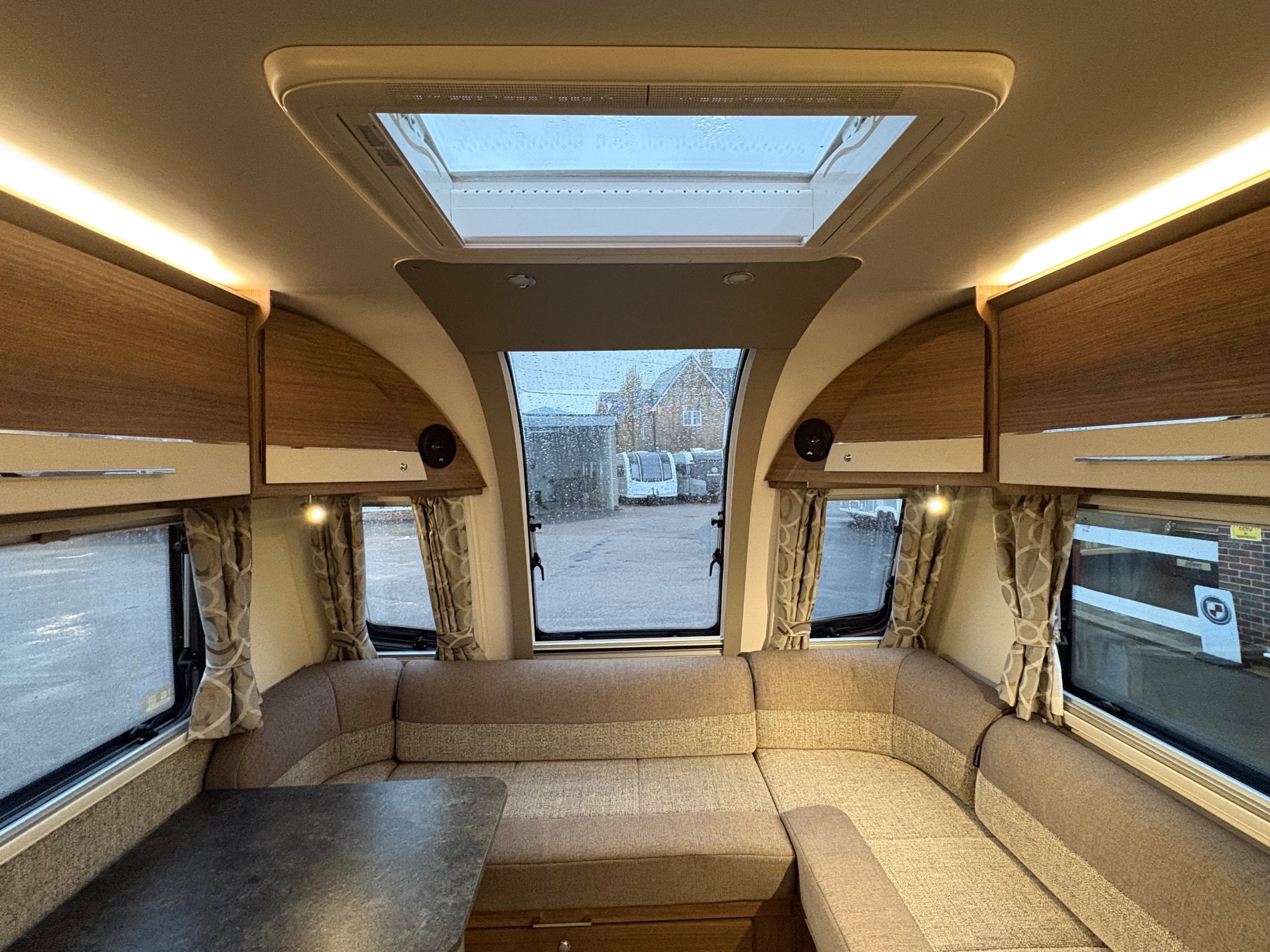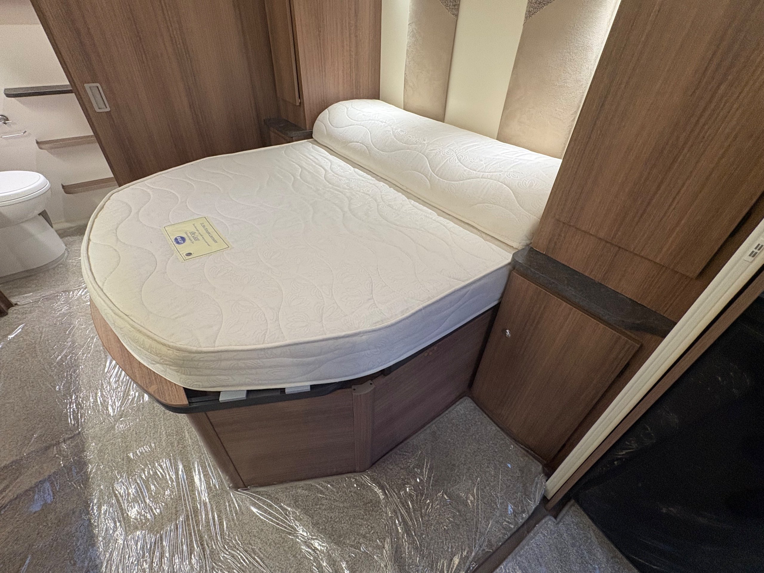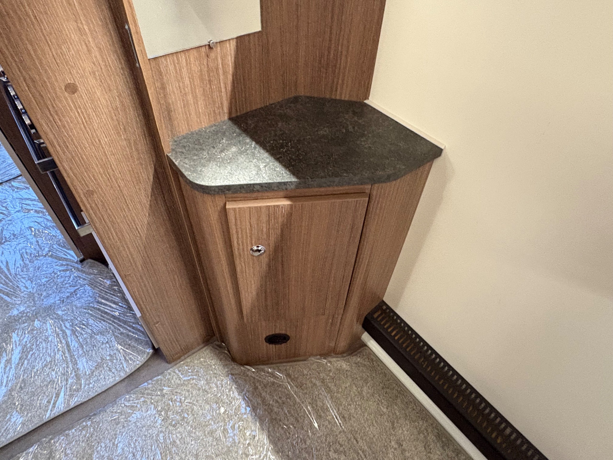 Year: 2020, Berth: 4, Internal length: 5.90m / 19'4", External length: 7.38m / 24'2", Width: 2.45m / 8', Unladen weight: 1350kg, MTPLM: 1499kg, Awning size: 10.33m, Warranty: 12 months. The Brindisi provides plenty of living space through its eight foot wide bodyshell, This is very noticeable where in conjunction with the G shaped front lounge, it provides lots of room for numerous people to sit together around a table, or just to chill out and watch the world go by. The transverse double bed slides back during the day to improve access to the rear washroom during the day, and then extending to provide a double bed at night. The rear washroom has a roomy corner shower, and enough space to use as a dressing room should you wish to. This model also comes with a caravan mover to assist in positioning the caravan. -