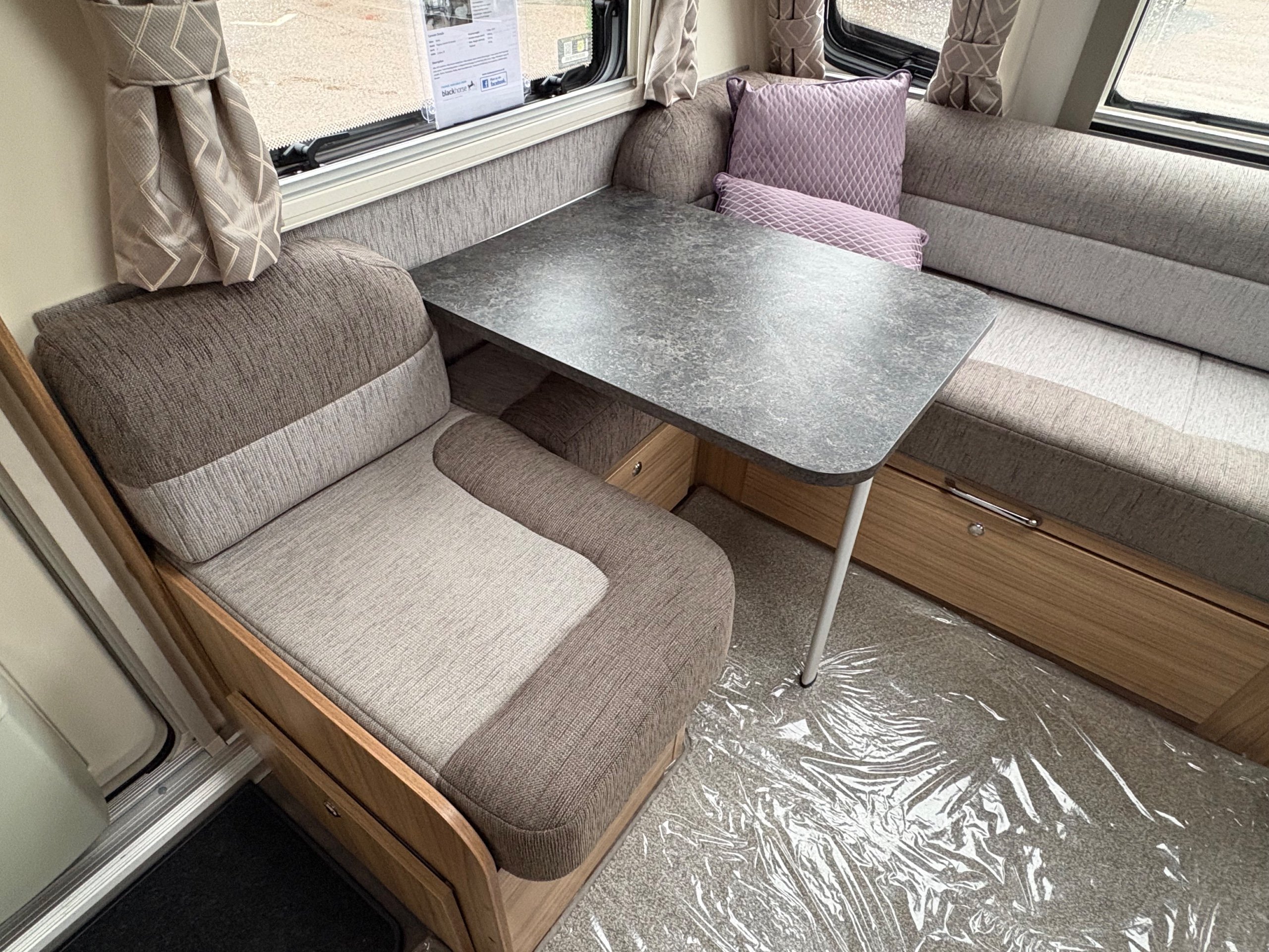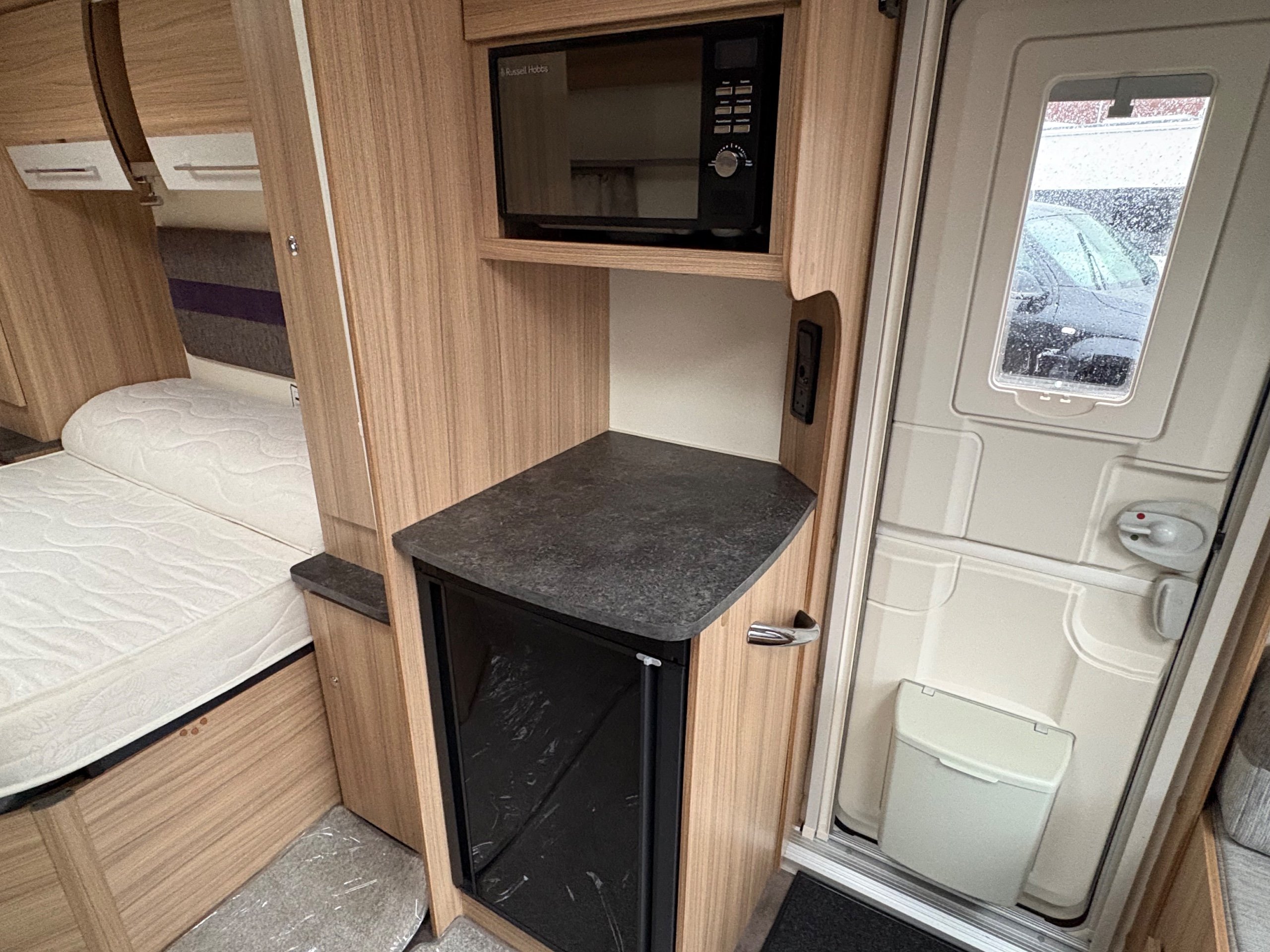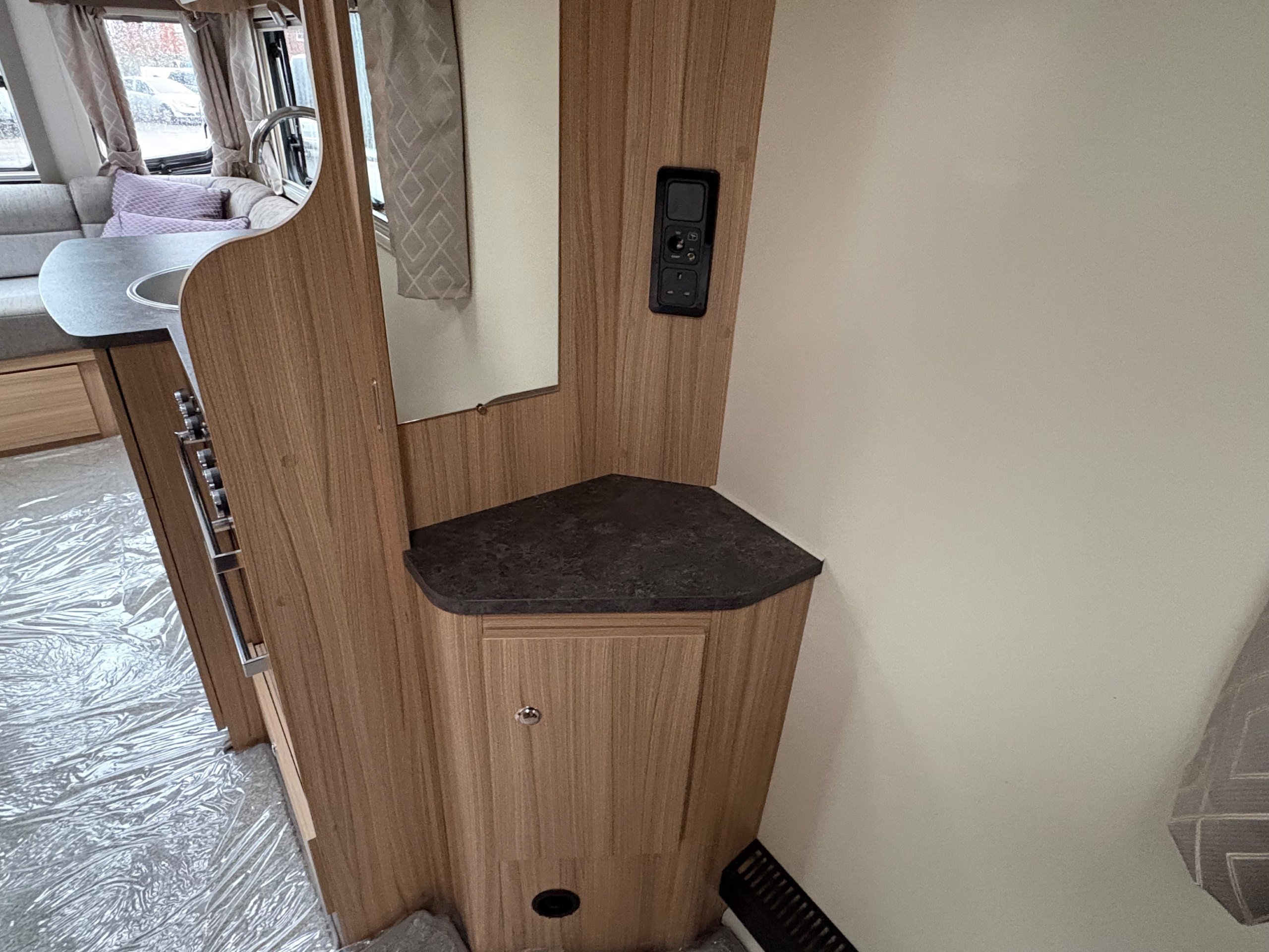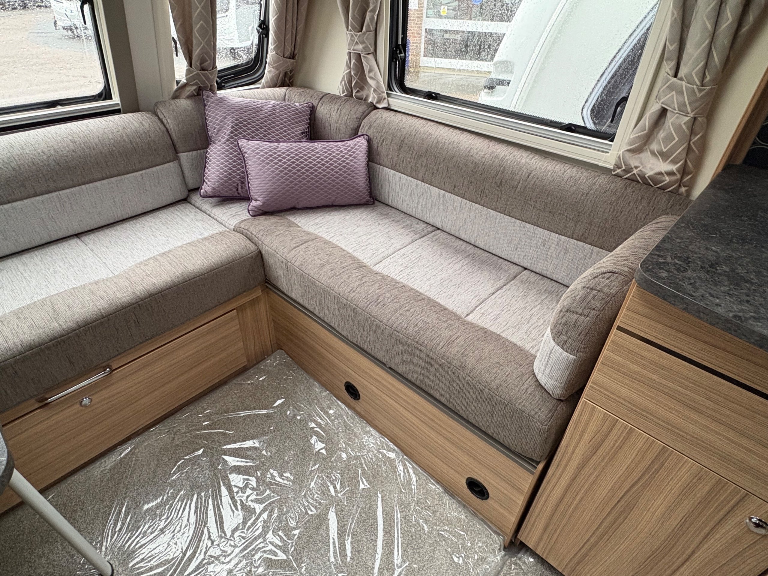 Year: 2023, Berth: 4, Internal length: 5.90m / 19'4", External length: 7.38m / 24'2", Width: 2.45m / 8', Unladen weight: 1384kg, MTPLM: 1539kg, Awning size: 10.33m, Warranty: 12 months. This model features a transverse double bed with an end washroom layout, with the wide 8' body width. The extra room is noticeable throughout the caravan, allowing for the bed to be left extended in night mode, while providing plenty of access to the washroom. The 'G' shaped lounge provides not only another double bed, but also generous amounts of living space whether eating, entertaining or just chilling out. The free standing table is the same height as the side table, enabling a number of adults to sit together around a big L shaped table. The solid top to the hob top gives people lots of work top space during the day, for food preparation etc. The truma heating provides effective heating and hot water, the external mains and gas points are perfect for outdoor living, while the roof mounted solar panel helps to look after your leisure battery. The rear washroom features a cubicle shower, hand basin and cassette toilet, all allowing owners to be self contained if they wish. -