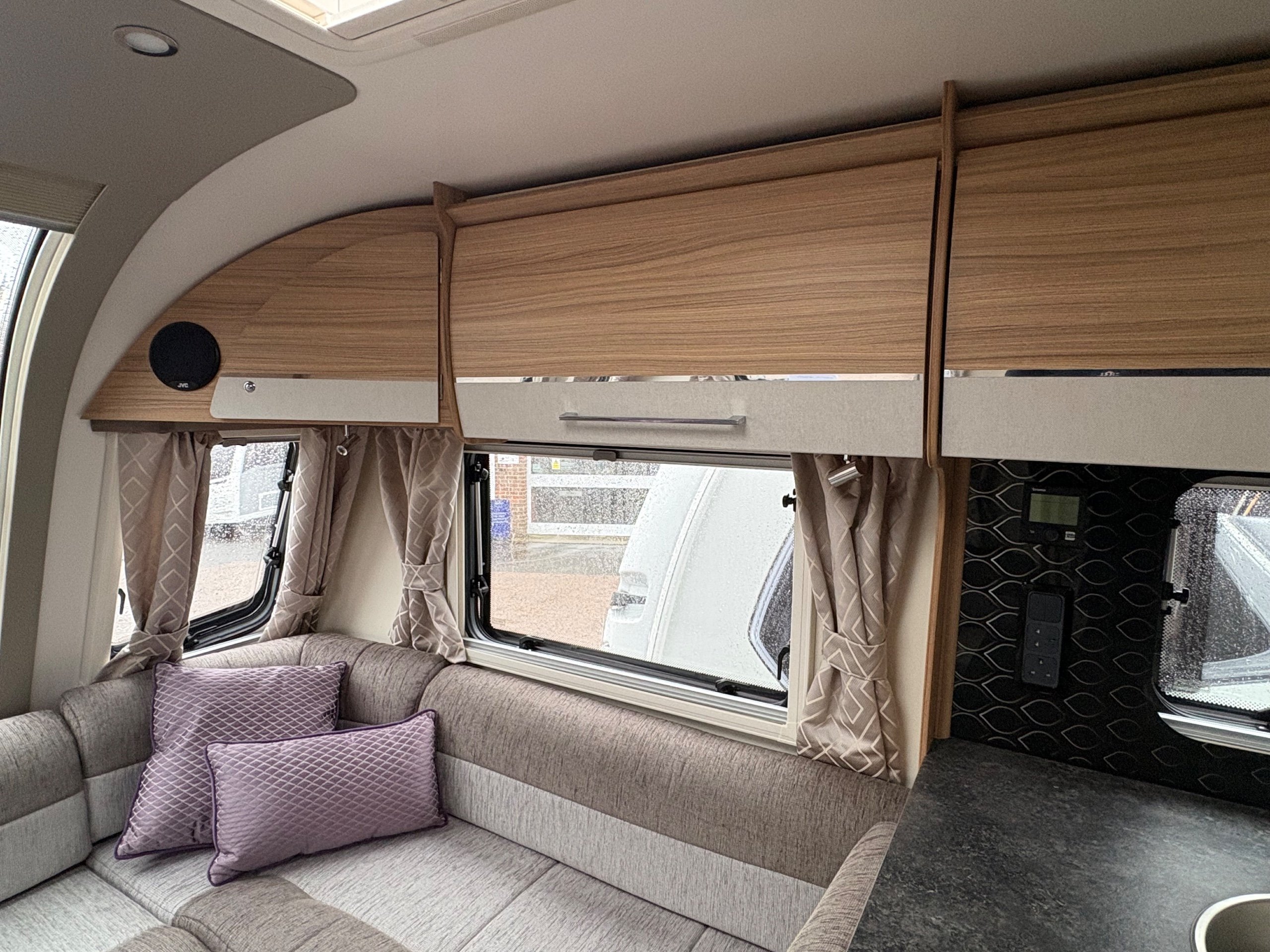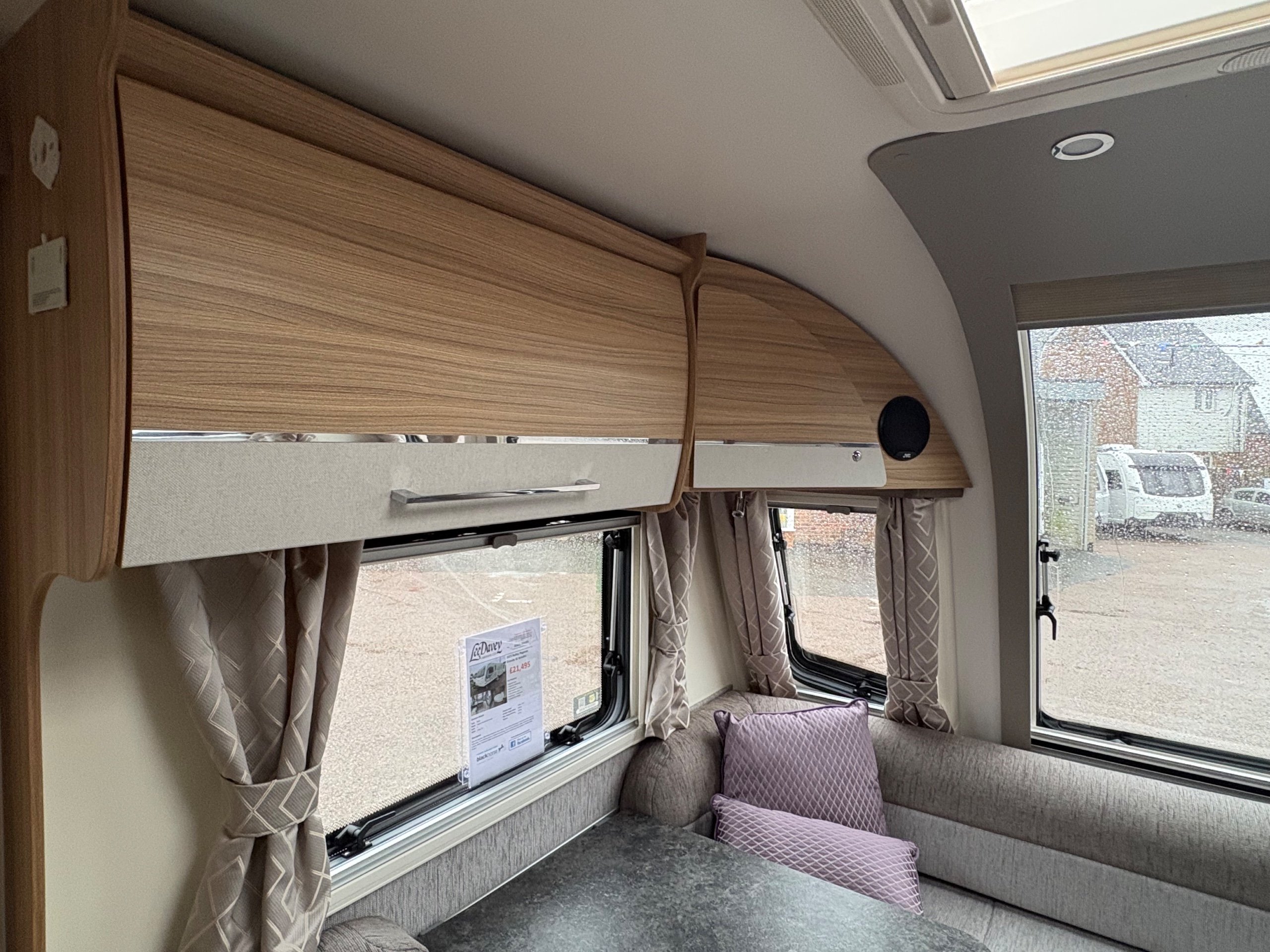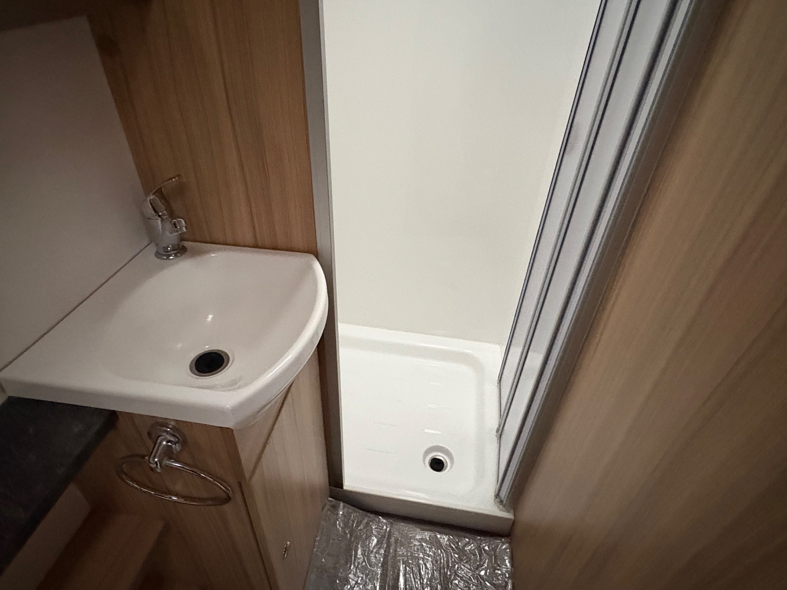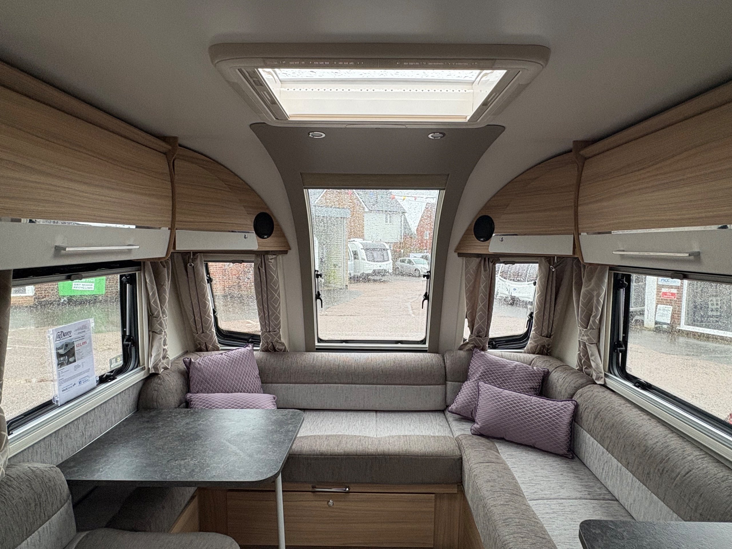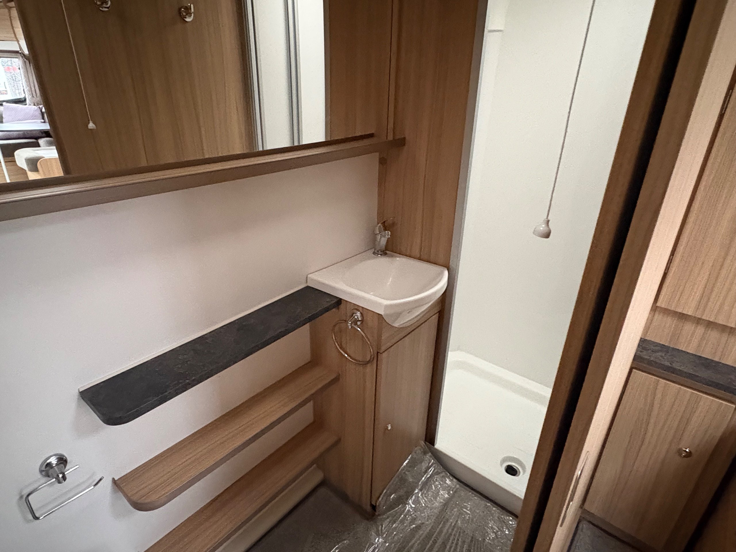 Year: 2023, Berth: 4, Internal length: 5.90m / 19'4", External length: 7.38m / 24'2", Width: 2.45m / 8', Unladen weight: 1384kg, MTPLM: 1539kg, Awning size: 10.33m, Warranty: 12 months. This model features a transverse double bed with an end washroom layout, with the wide 8' body width. The extra room is noticeable throughout the caravan, allowing for the bed to be left extended in night mode, while providing plenty of access to the washroom. The 'G' shaped lounge provides not only another double bed, but also generous amounts of living space whether eating, entertaining or just chilling out. The free standing table is the same height as the side table, enabling a number of adults to sit together around a big L shaped table. The solid top to the hob top gives people lots of work top space during the day, for food preparation etc. The truma heating provides effective heating and hot water, the external mains and gas points are perfect for outdoor living, while the roof mounted solar panel helps to look after your leisure battery. The rear washroom features a cubicle shower, hand basin and cassette toilet, all allowing owners to be self contained if they wish. -