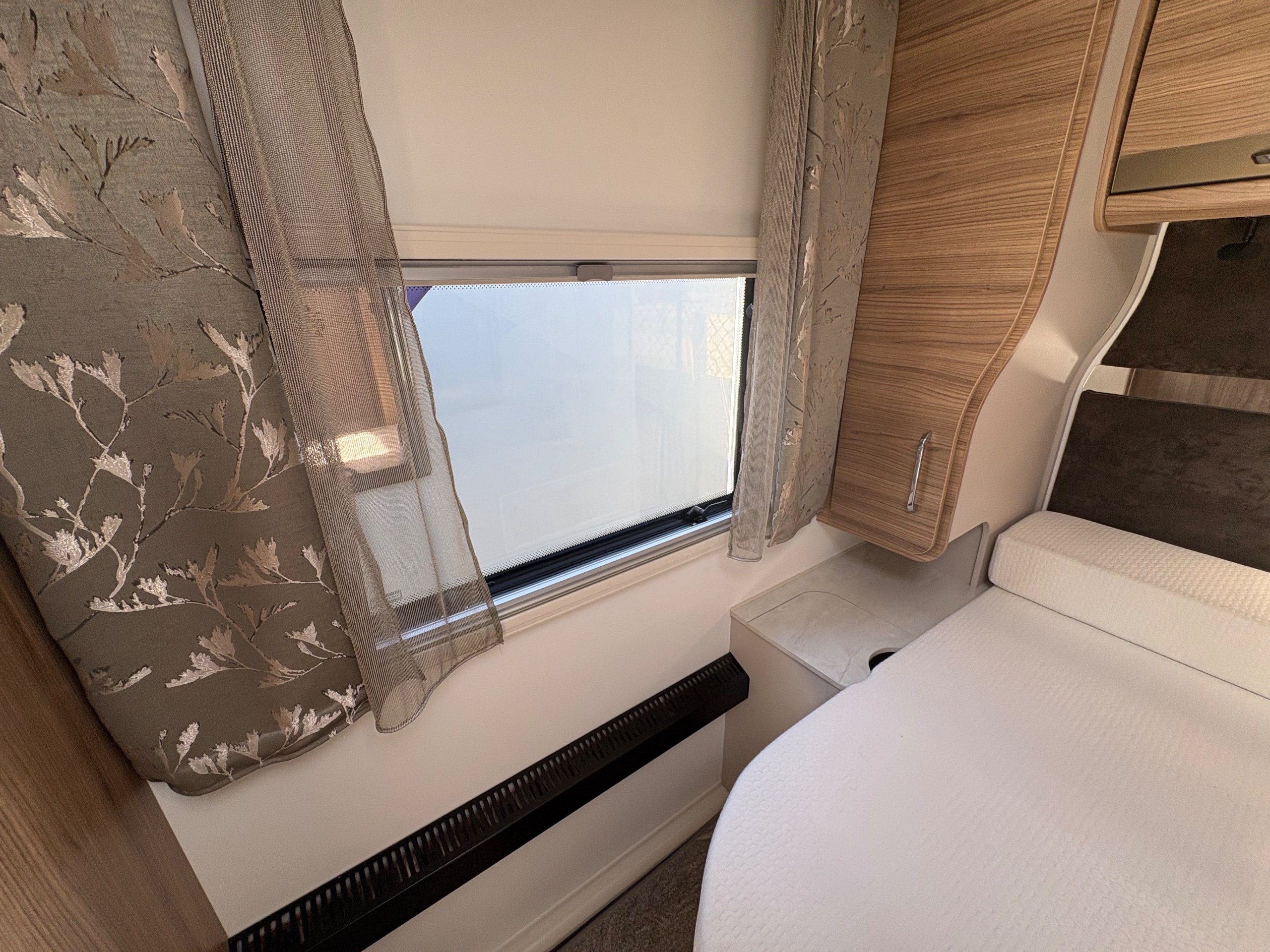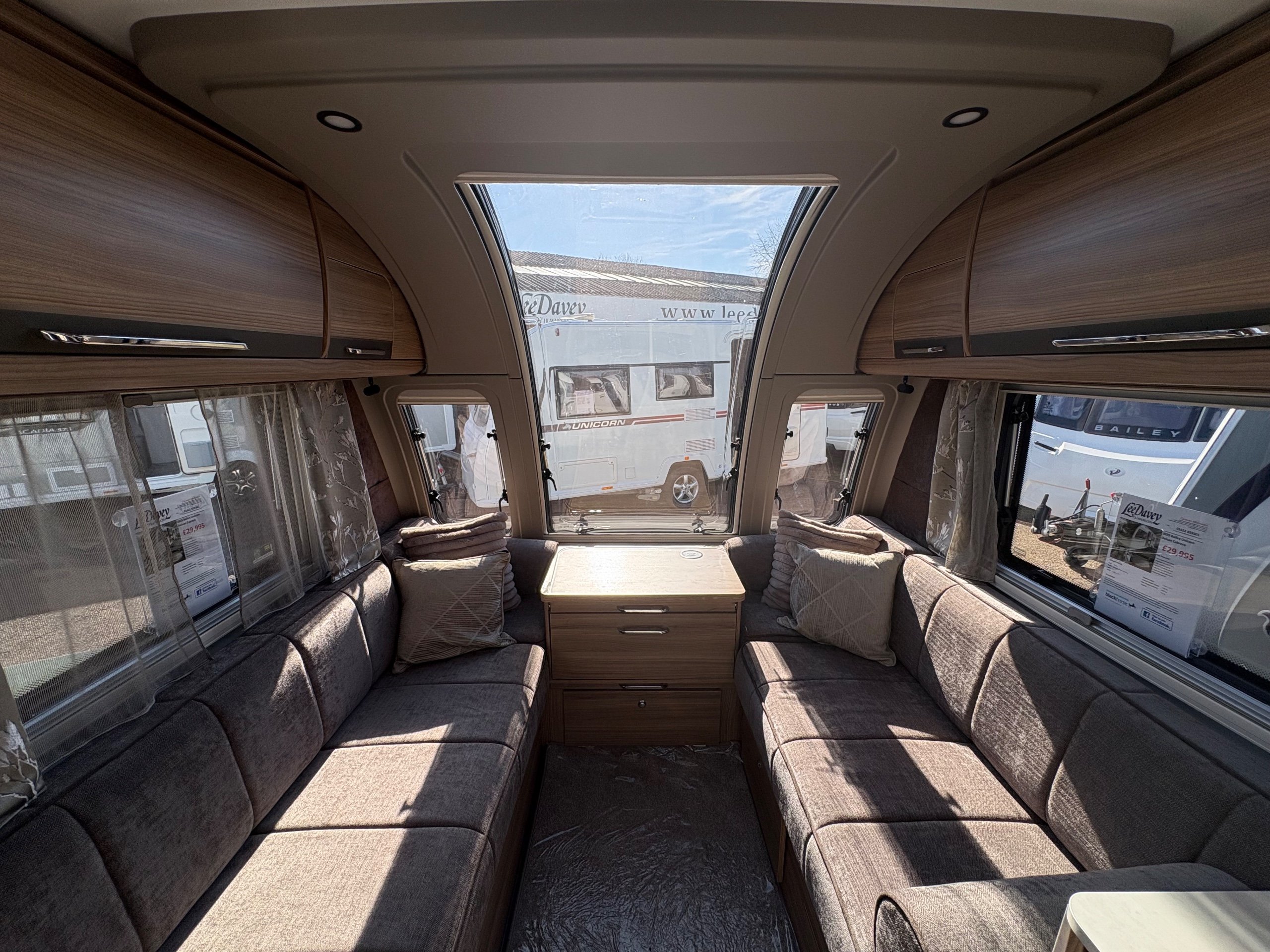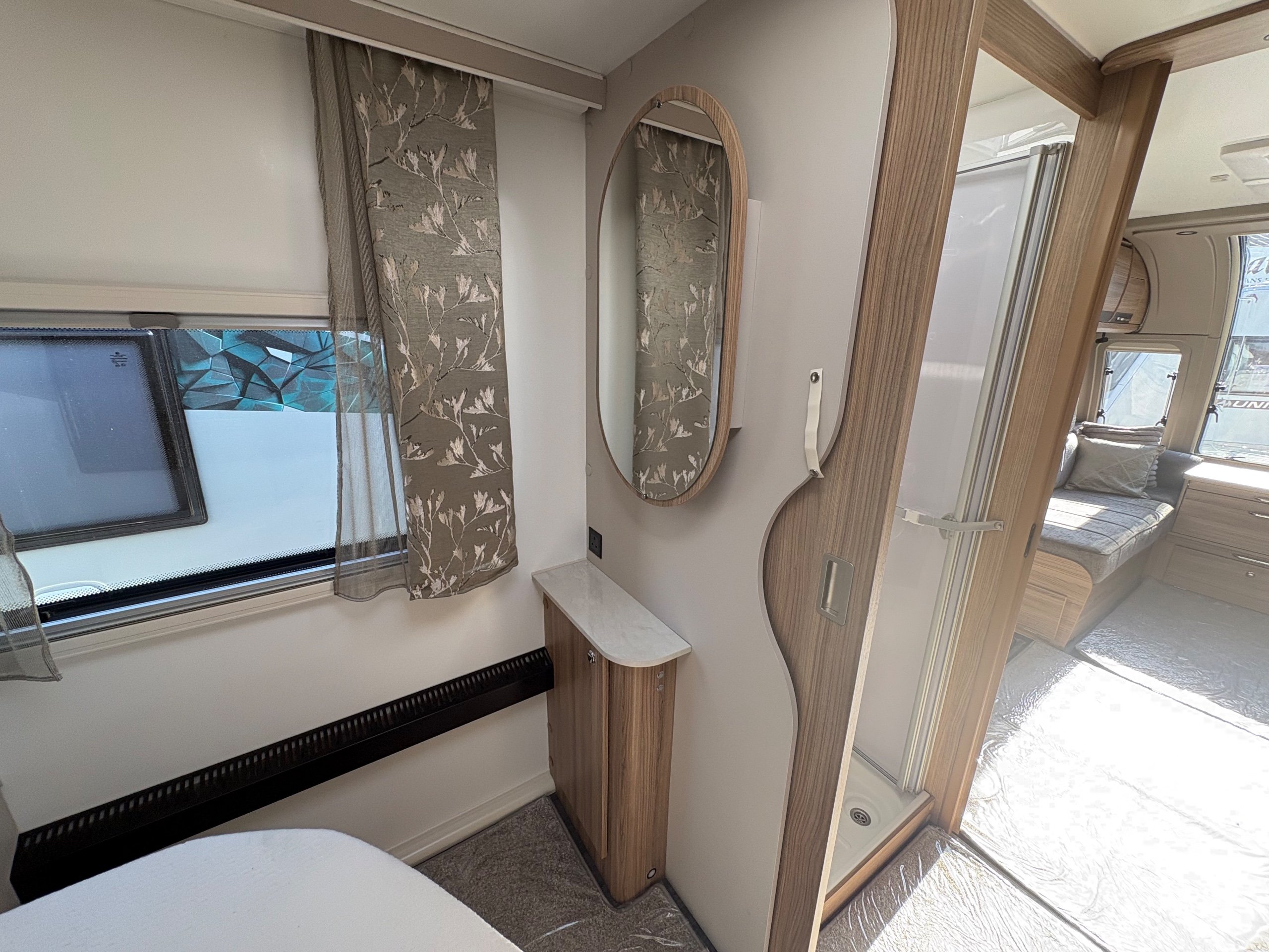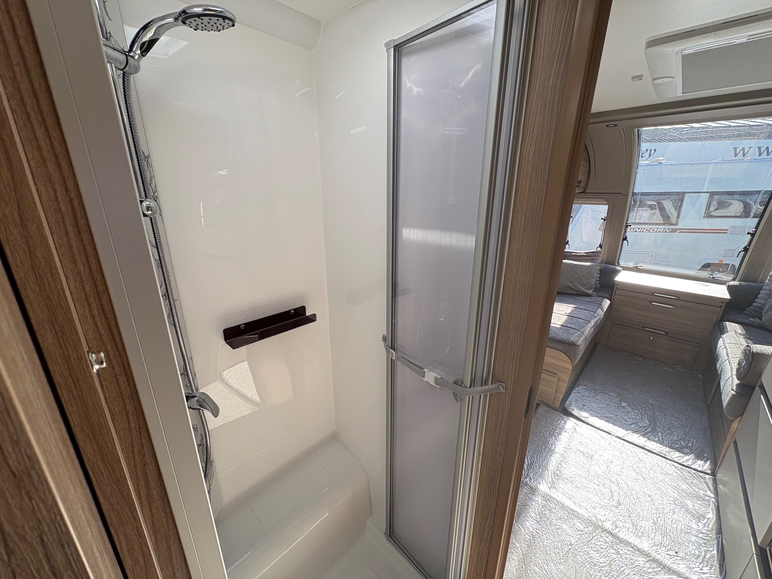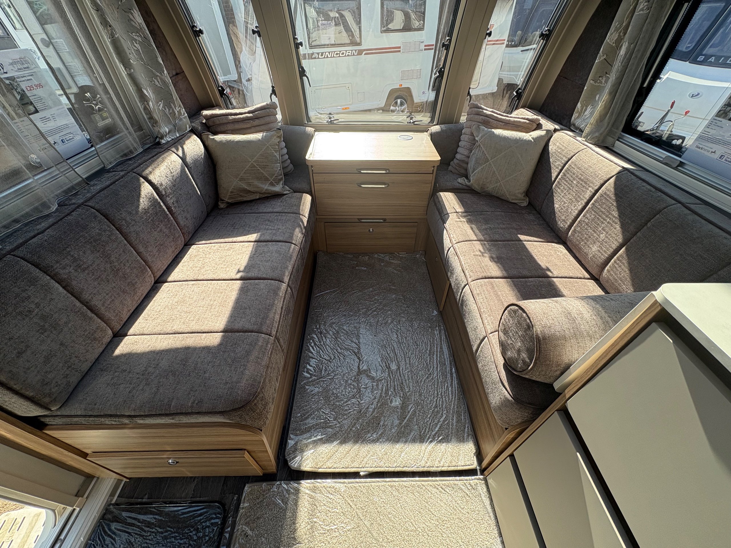 Year: 2025, Berth: 4, Internal length: 6.07m / 19'11", External length: 7.34m / 24'1", Width: 2.26m / 7'5", Unladen weight: 1439kg, MTPLM: 1600kg, Awning size: 10.23m, warranty: 12 months. This model from the popular Unicorn range, features a mid washroom and a 5' wide rear island bed. A high specification of equipment is supplied with this caravan, such as alde heating, roof mounted solar panels, alko secure wheel locks, ATC braking, External gas / mains points, dual fuel hob etc as standard, along with a powered caravan mover to make positioning the caravan easier as well. The rear island bed at 5' width, makes it wider than other makes leading to a comfortable night sleep, along with plenty of storage space below. The front lounge is flooded with light through the large front and side windows, creating an airy feel year all year round. -