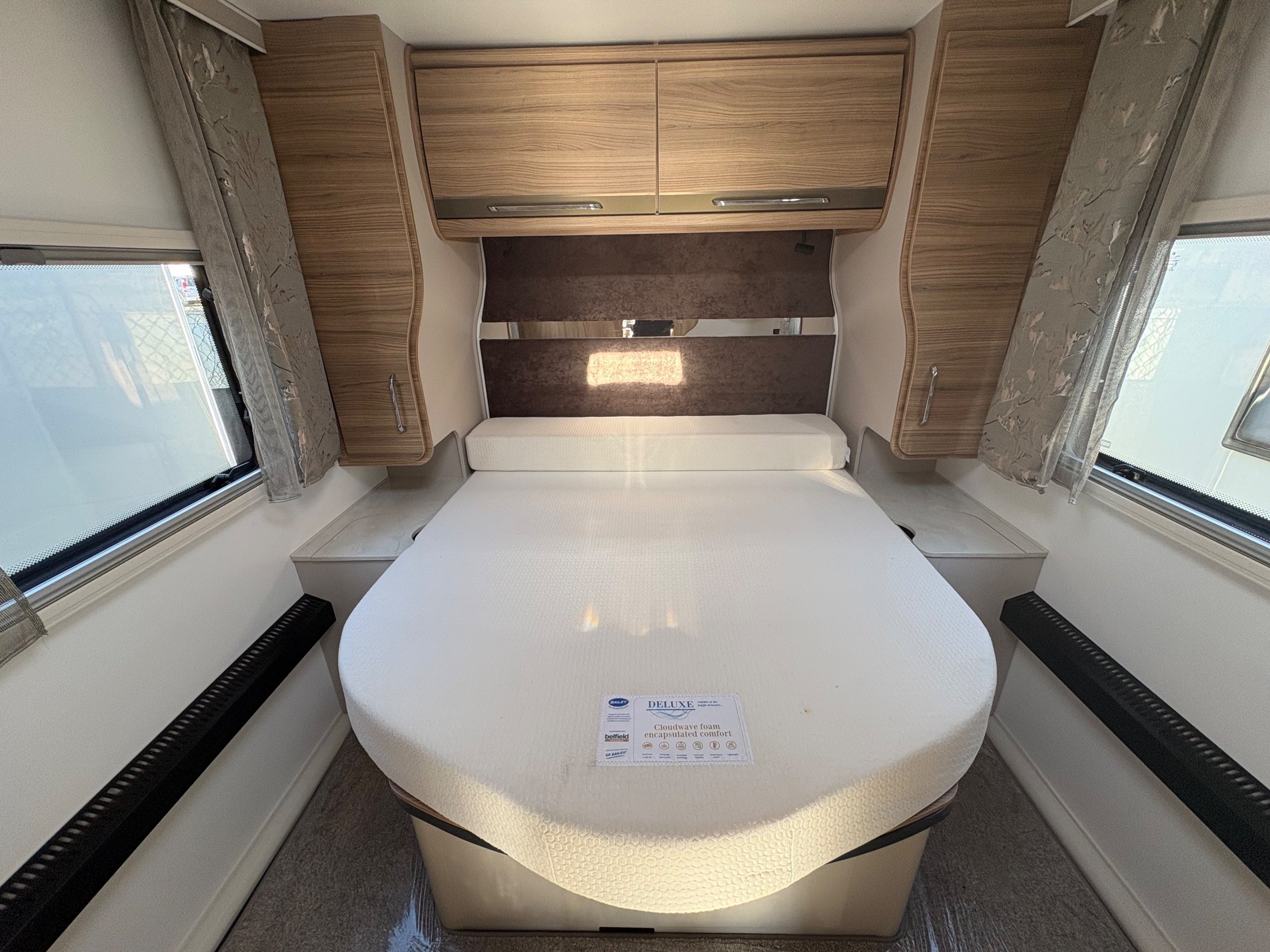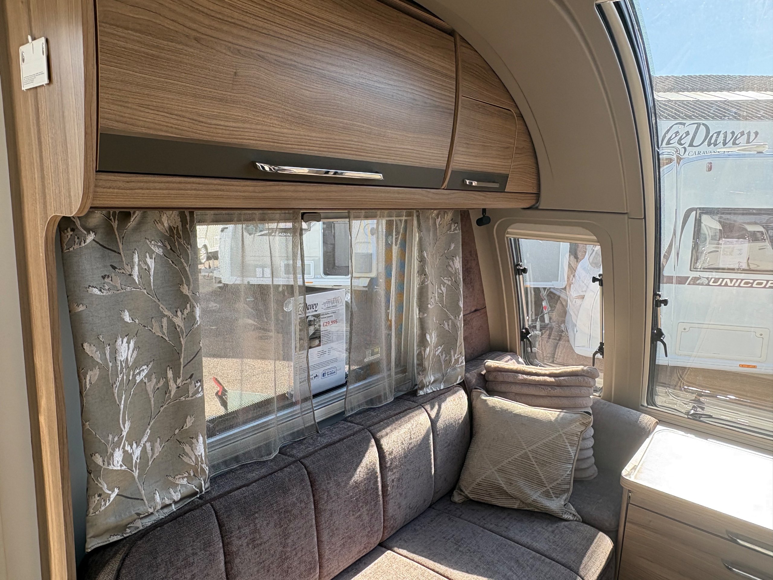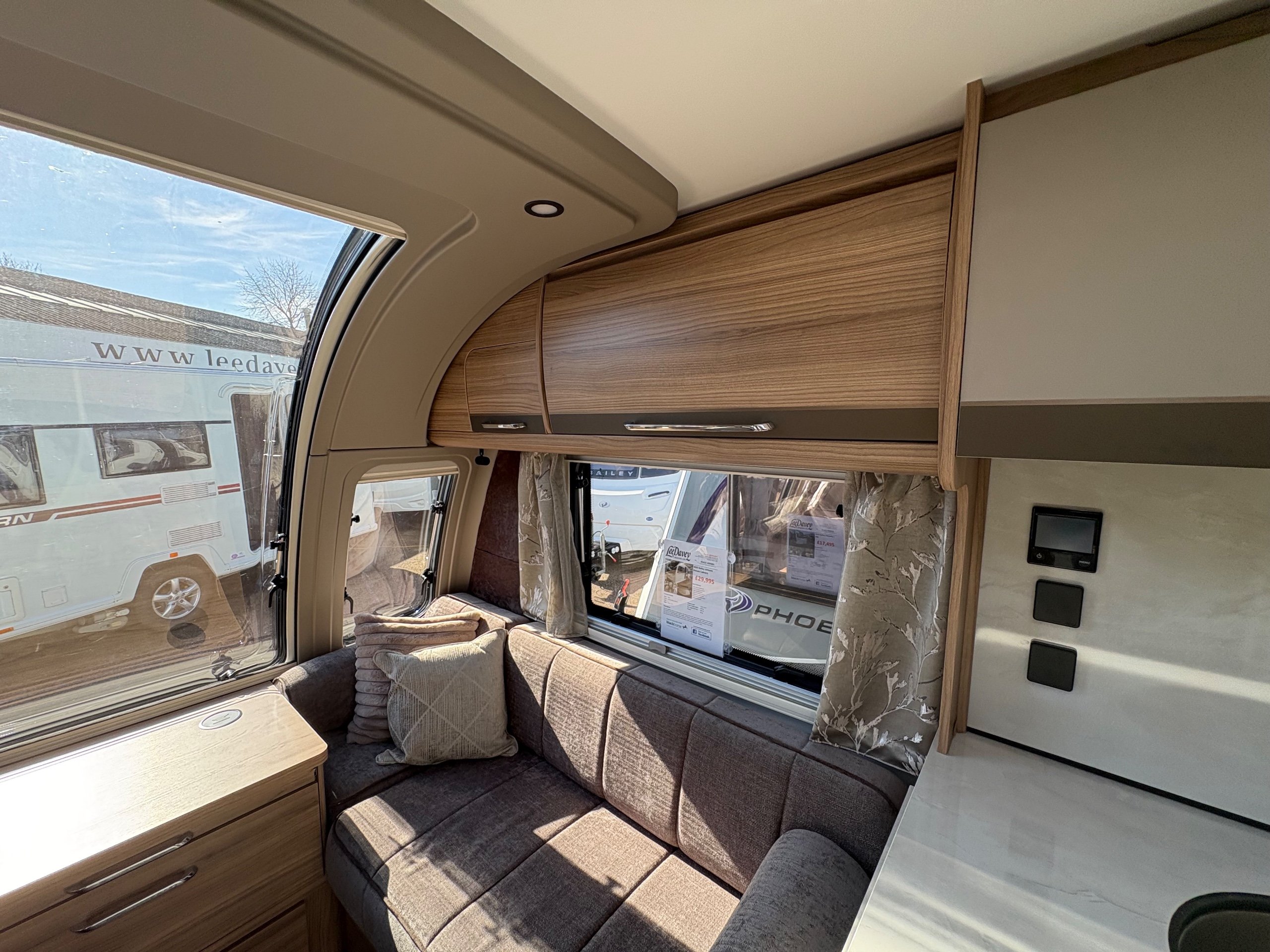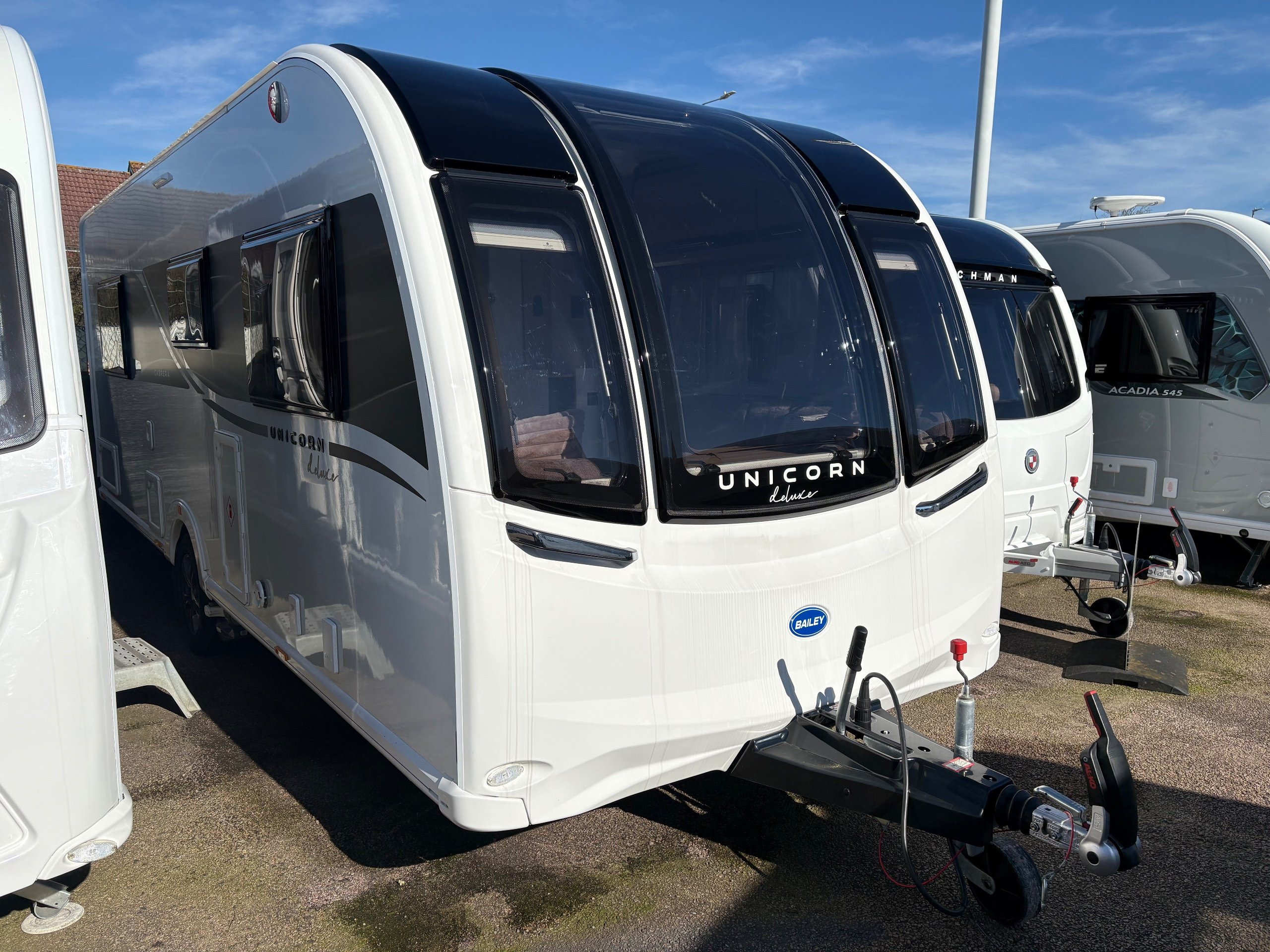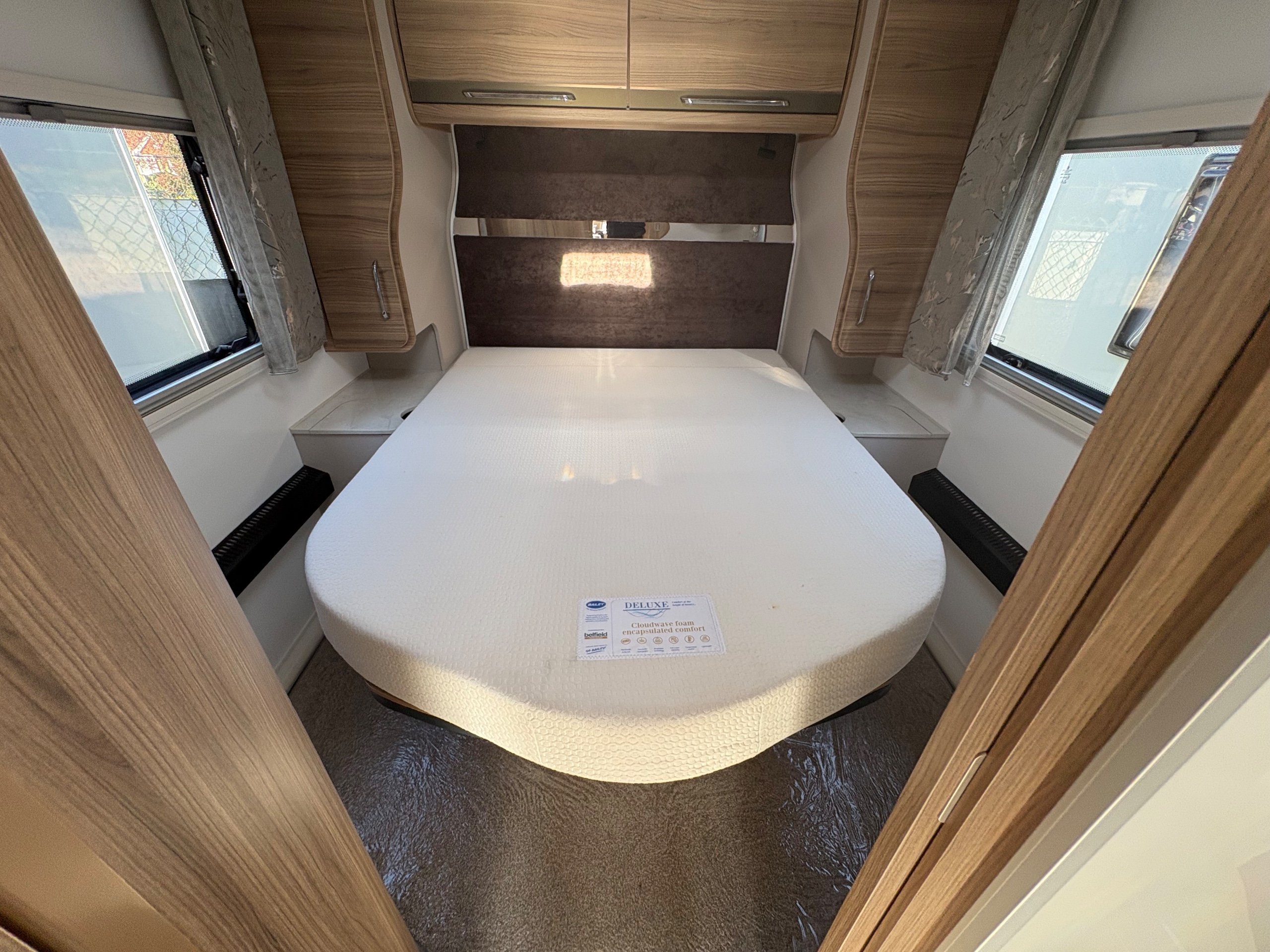 Year: 2025, Berth: 4, Internal length: 6.07m / 19'11", External length: 7.34m / 24'1", Width: 2.26m / 7'5", Unladen weight: 1439kg, MTPLM: 1600kg, Awning size: 10.23m, warranty: 12 months. This model from the popular Unicorn range, features a mid washroom and a 5' wide rear island bed. A high specification of equipment is supplied with this caravan, such as alde heating, roof mounted solar panels, alko secure wheel locks, ATC braking, External gas / mains points, dual fuel hob etc as standard, along with a powered caravan mover to make positioning the caravan easier as well. The rear island bed at 5' width, makes it wider than other makes leading to a comfortable night sleep, along with plenty of storage space below. The front lounge is flooded with light through the large front and side windows, creating an airy feel year all year round. -