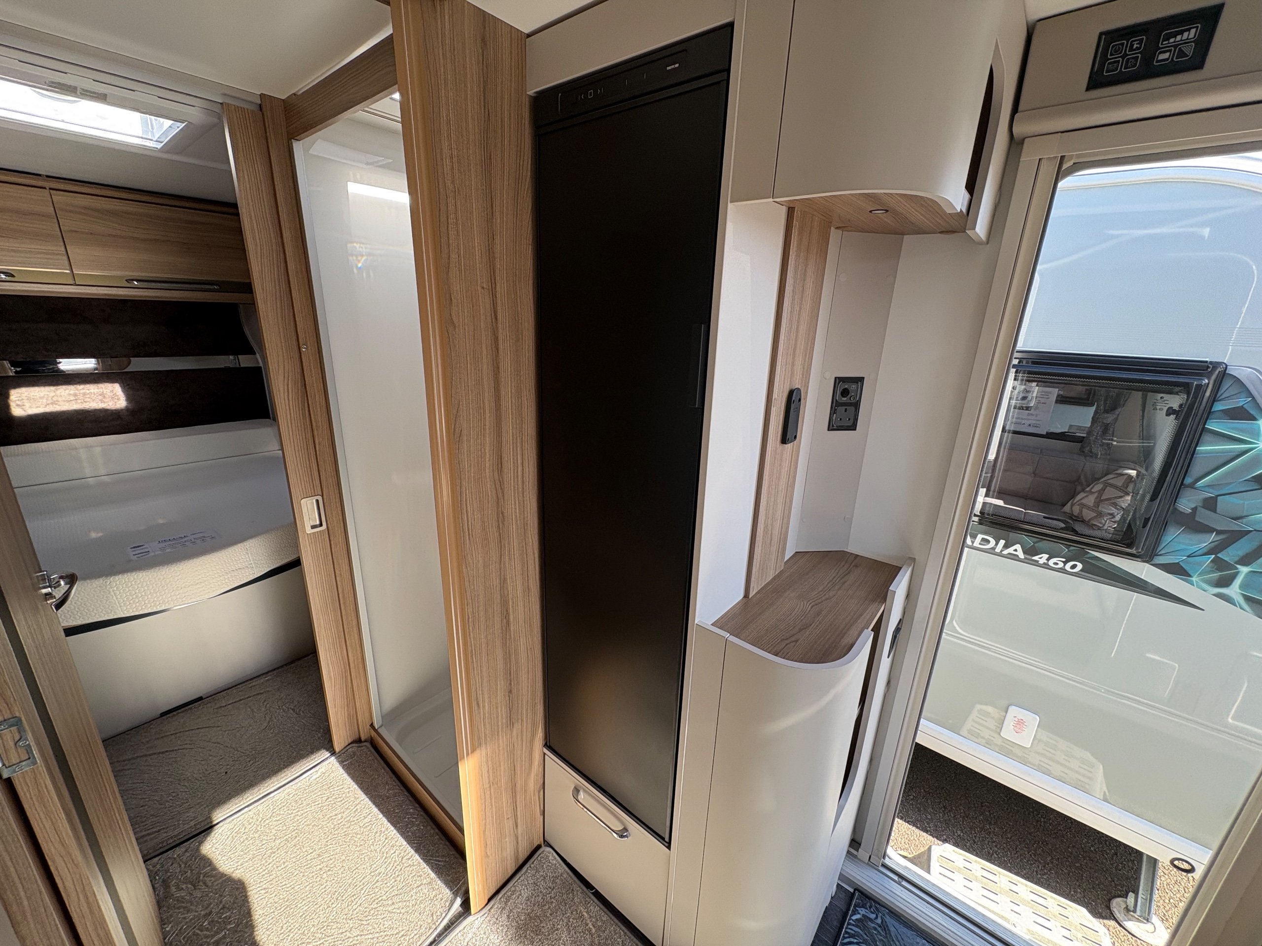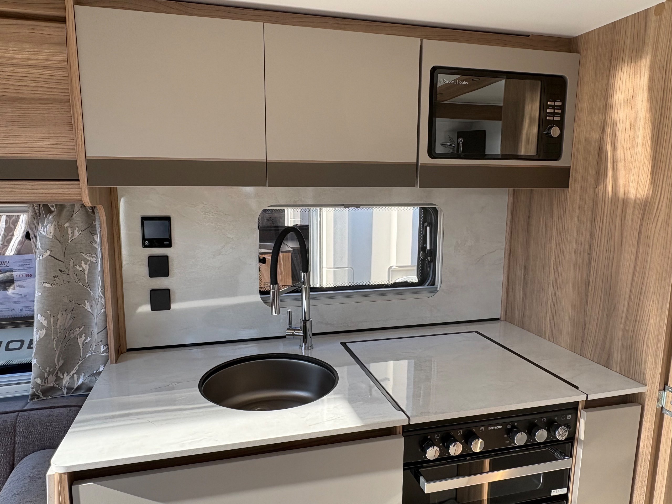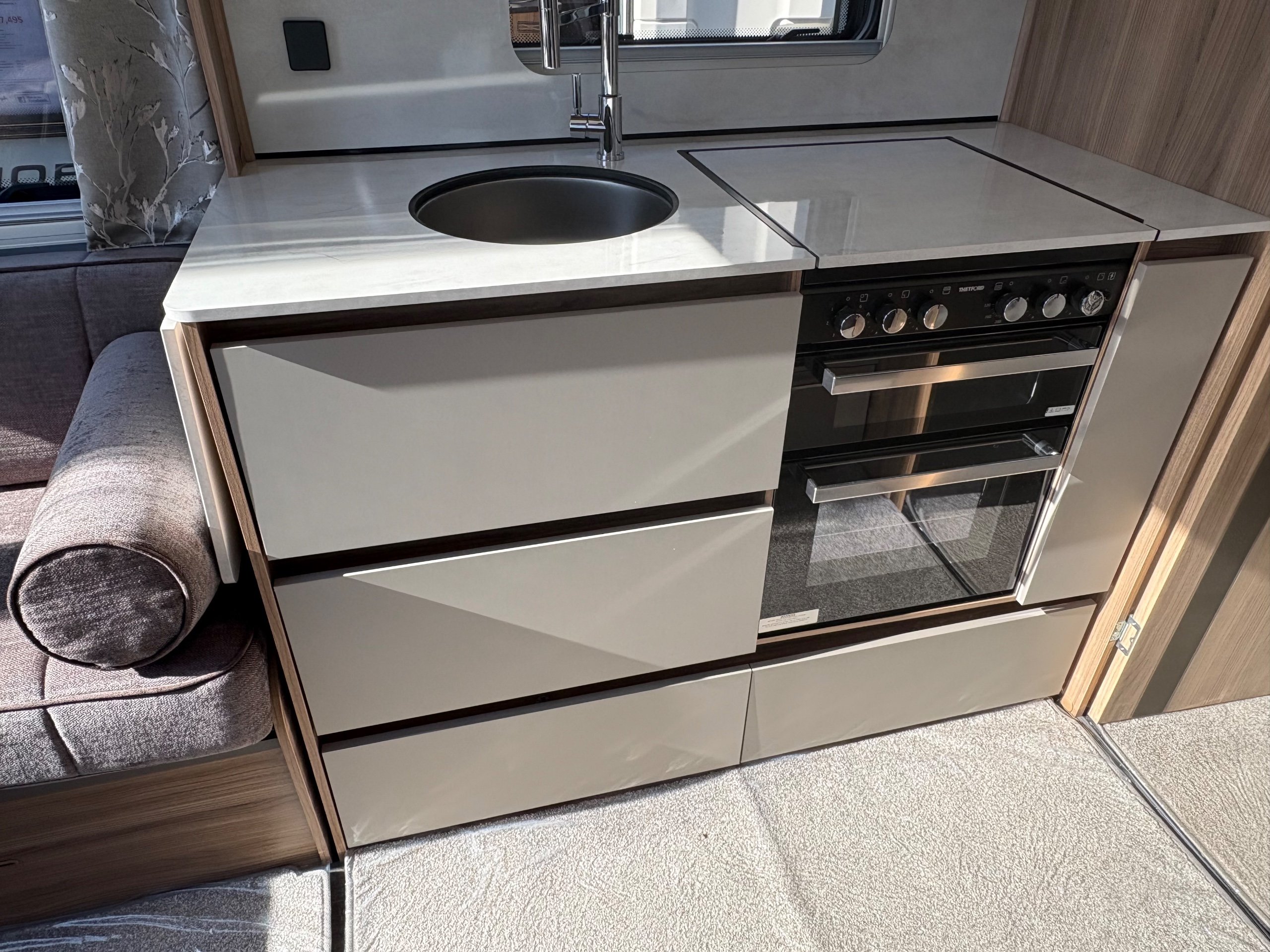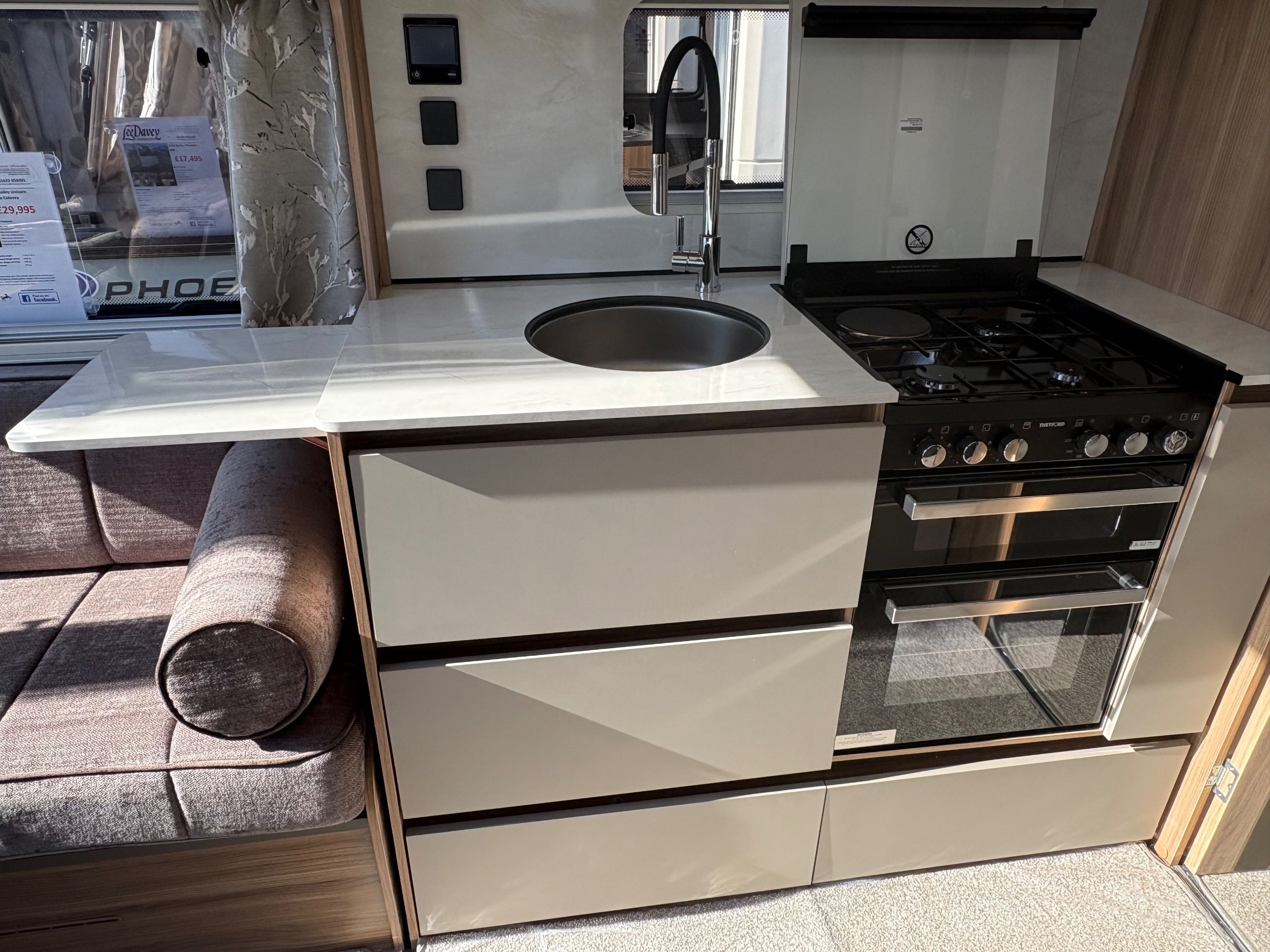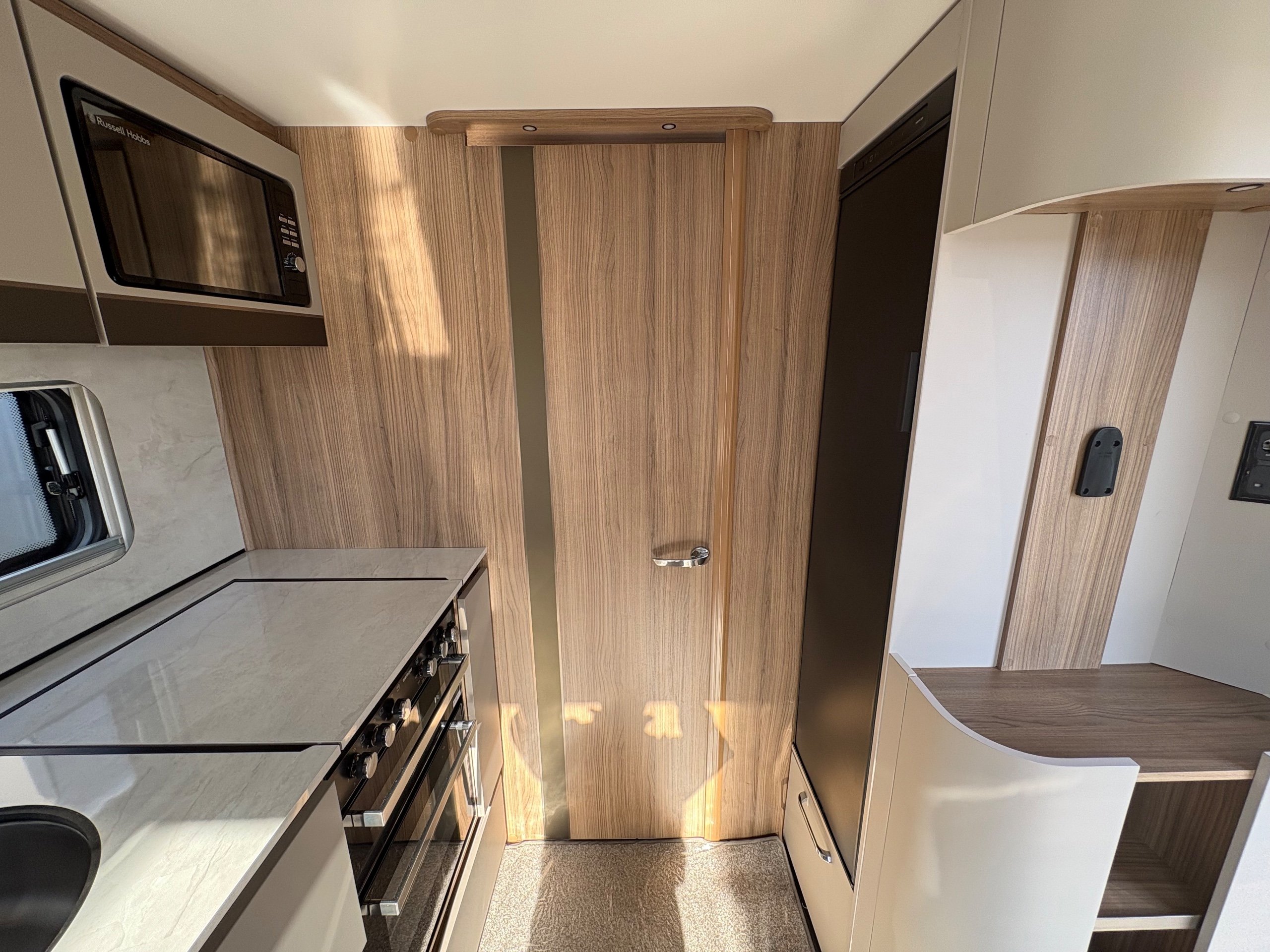 Year: 2025, Berth: 4, Internal length: 6.07m / 19'11", External length: 7.34m / 24'1", Width: 2.26m / 7'5", Unladen weight: 1439kg, MTPLM: 1600kg, Awning size: 10.23m, warranty: 12 months. This model from the popular Unicorn range, features a mid washroom and a 5' wide rear island bed. A high specification of equipment is supplied with this caravan, such as alde heating, roof mounted solar panels, alko secure wheel locks, ATC braking, External gas / mains points, dual fuel hob etc as standard, along with a powered caravan mover to make positioning the caravan easier as well. The rear island bed at 5' width, makes it wider than other makes leading to a comfortable night sleep, along with plenty of storage space below. The front lounge is flooded with light through the large front and side windows, creating an airy feel year all year round. -