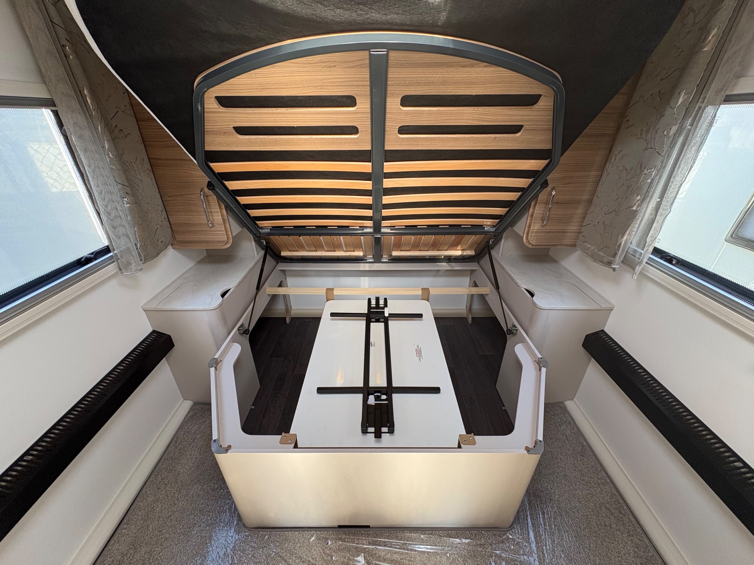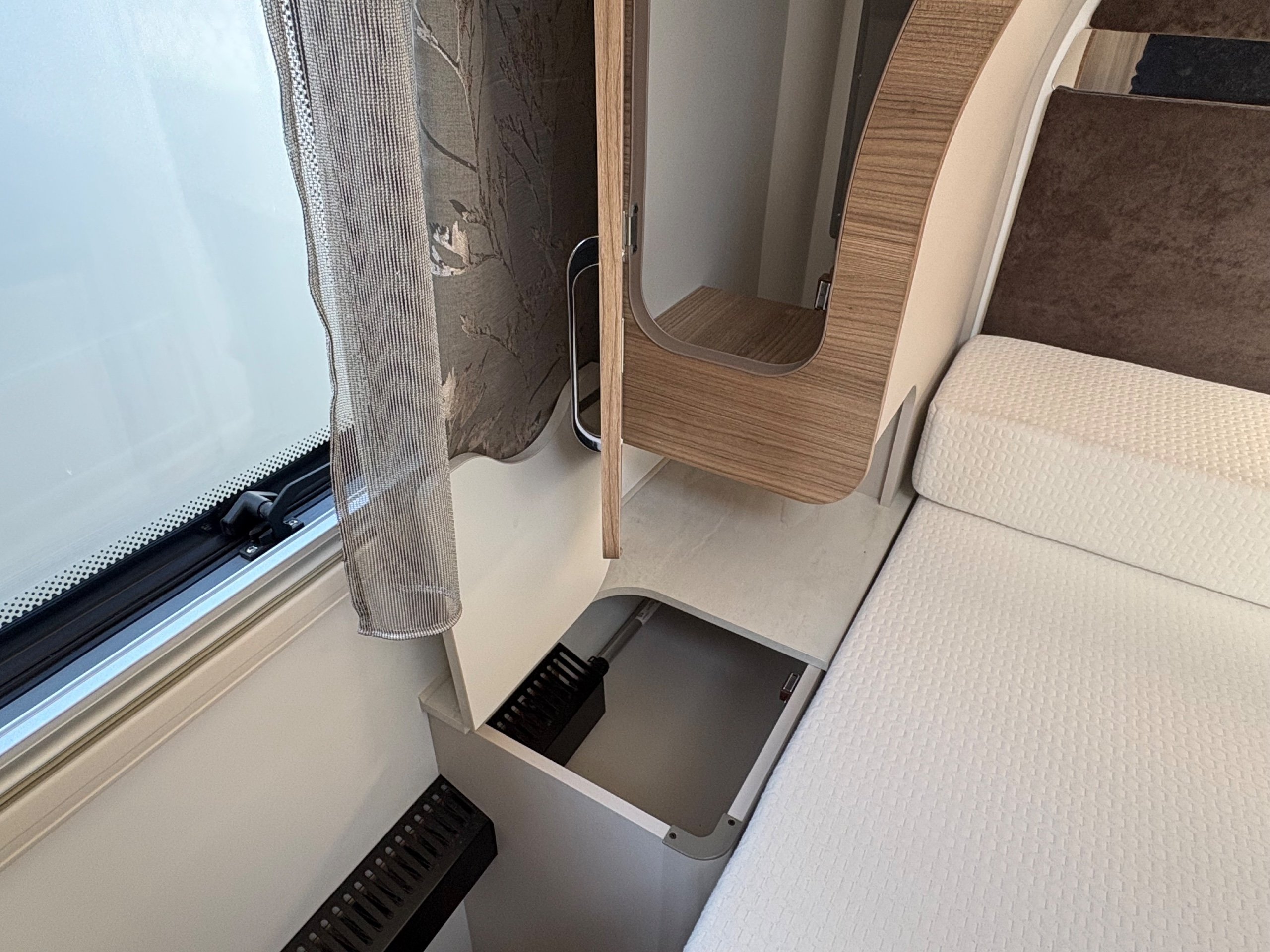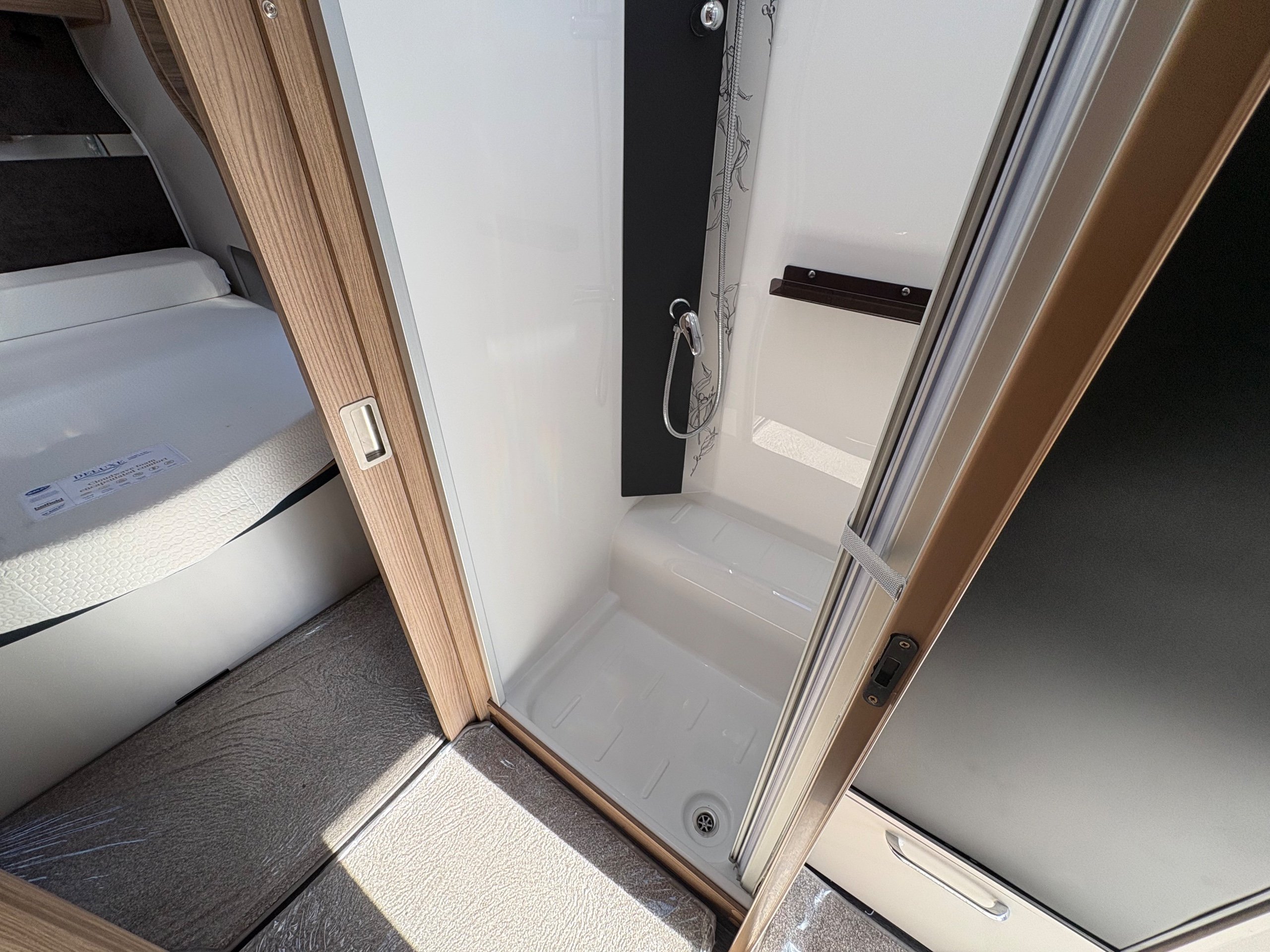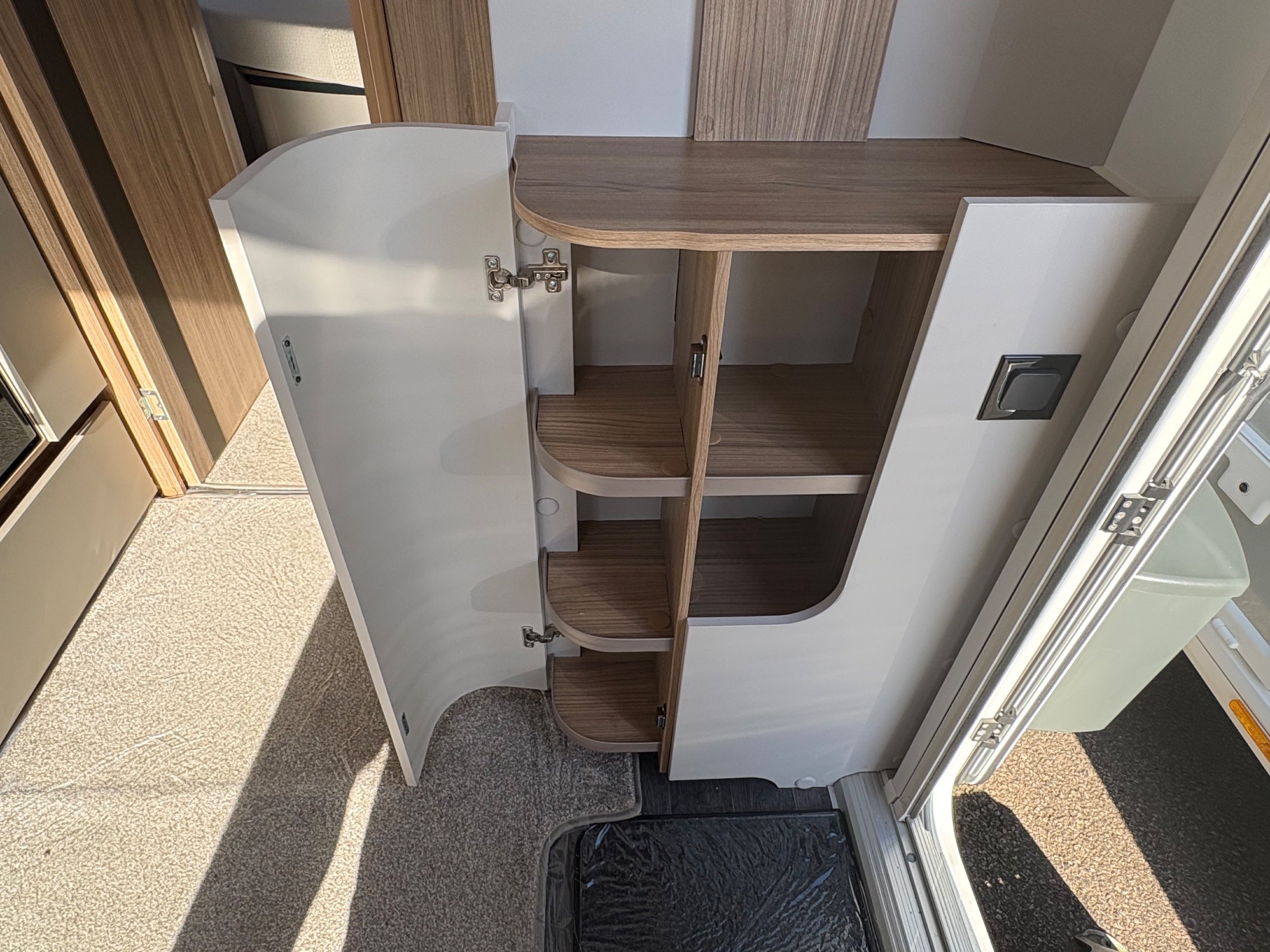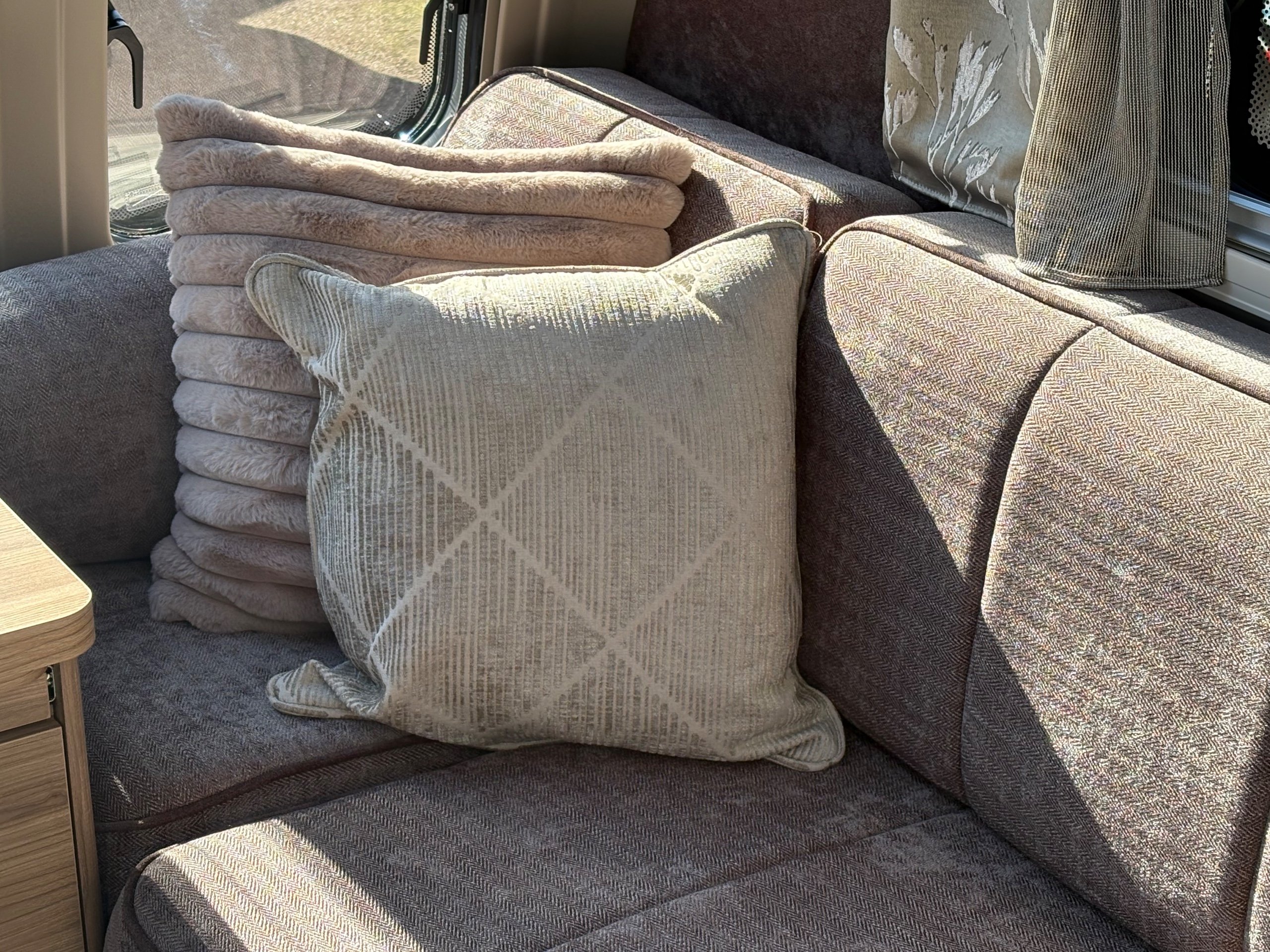 Year: 2025, Berth: 4, Internal length: 6.07m / 19'11", External length: 7.34m / 24'1", Width: 2.26m / 7'5", Unladen weight: 1439kg, MTPLM: 1600kg, Awning size: 10.23m, warranty: 12 months. This model from the popular Unicorn range, features a mid washroom and a 5' wide rear island bed. A high specification of equipment is supplied with this caravan, such as alde heating, roof mounted solar panels, alko secure wheel locks, ATC braking, External gas / mains points, dual fuel hob etc as standard, along with a powered caravan mover to make positioning the caravan easier as well. The rear island bed at 5' width, makes it wider than other makes leading to a comfortable night sleep, along with plenty of storage space below. The front lounge is flooded with light through the large front and side windows, creating an airy feel year all year round. -