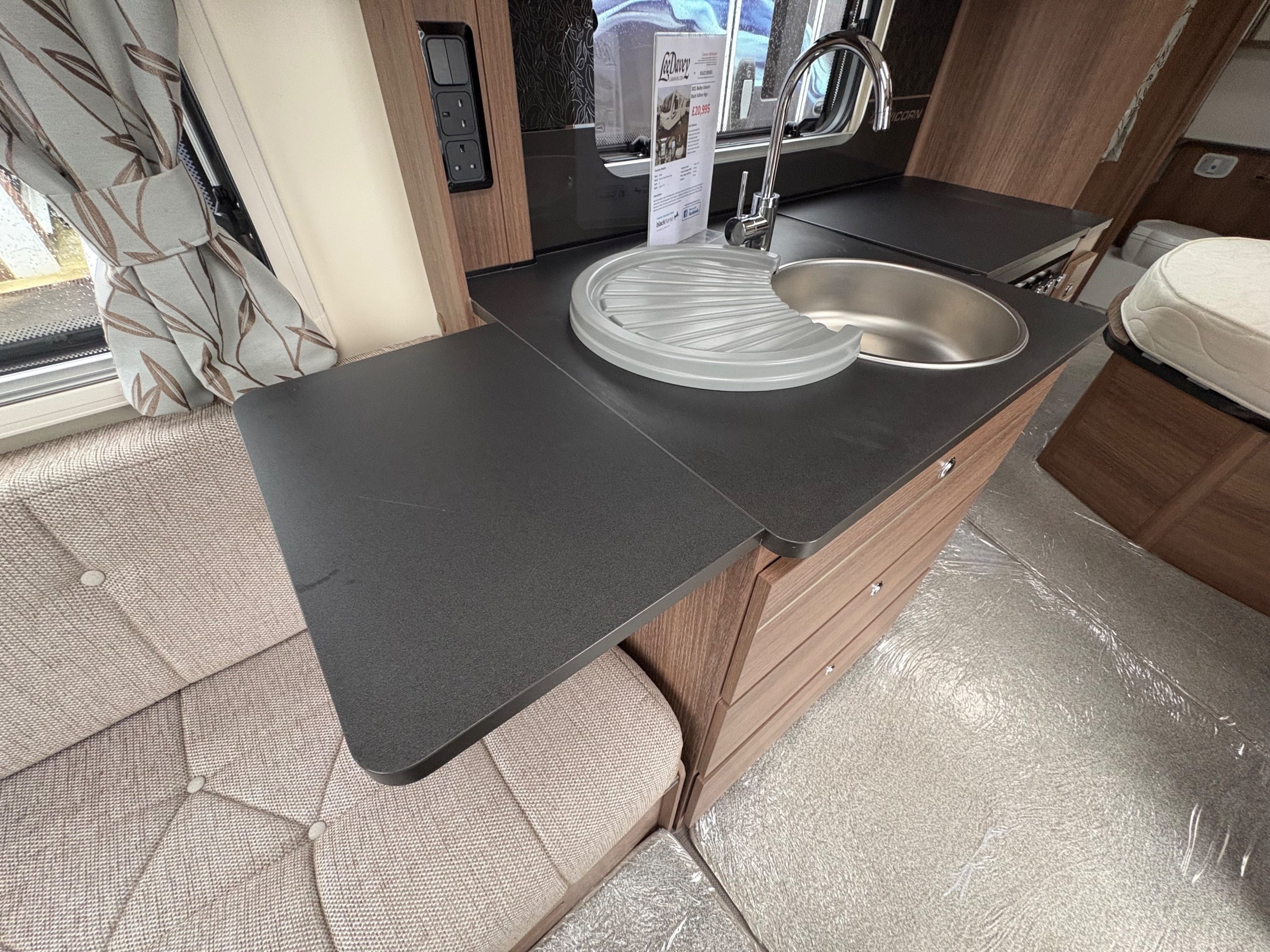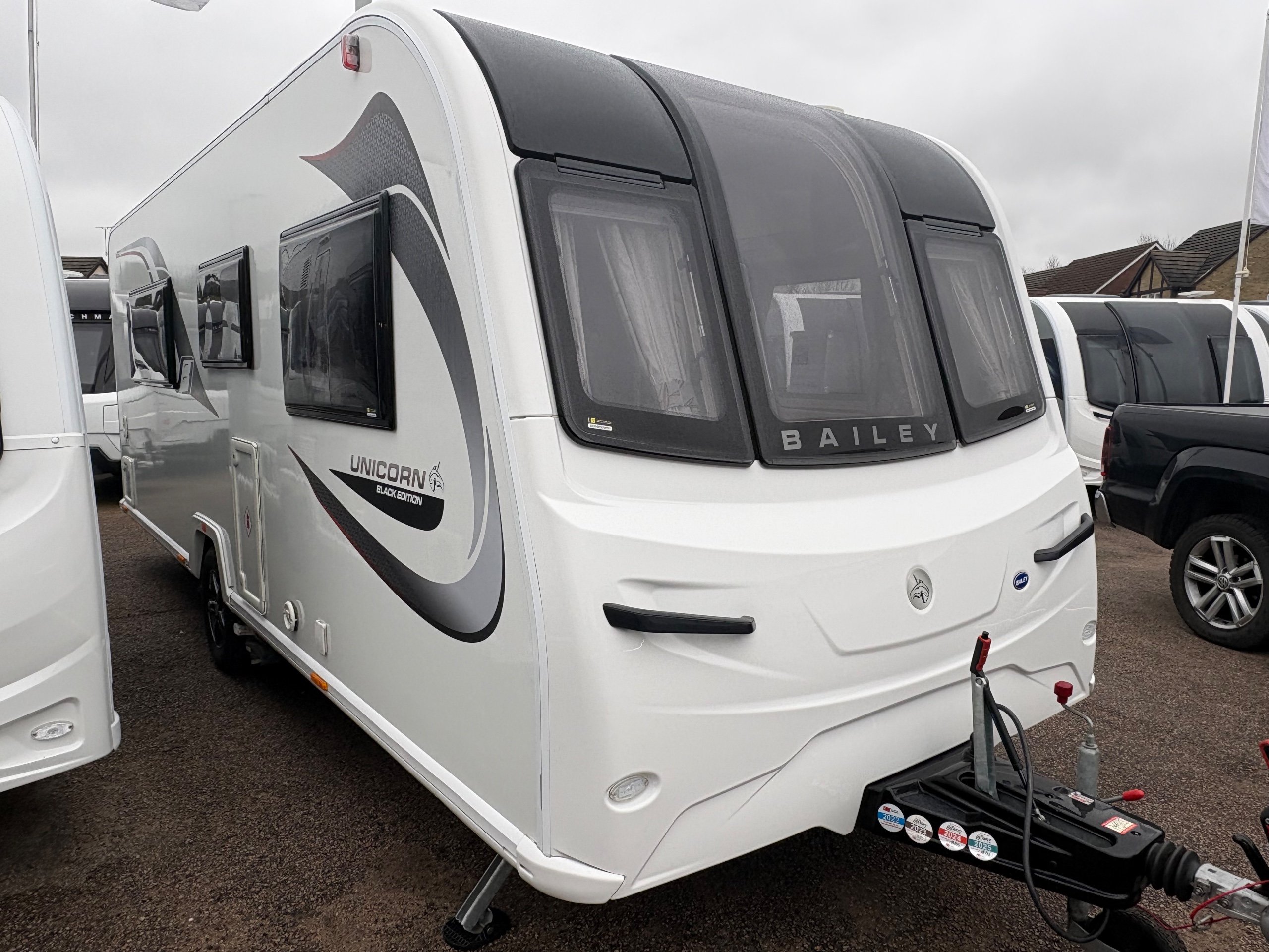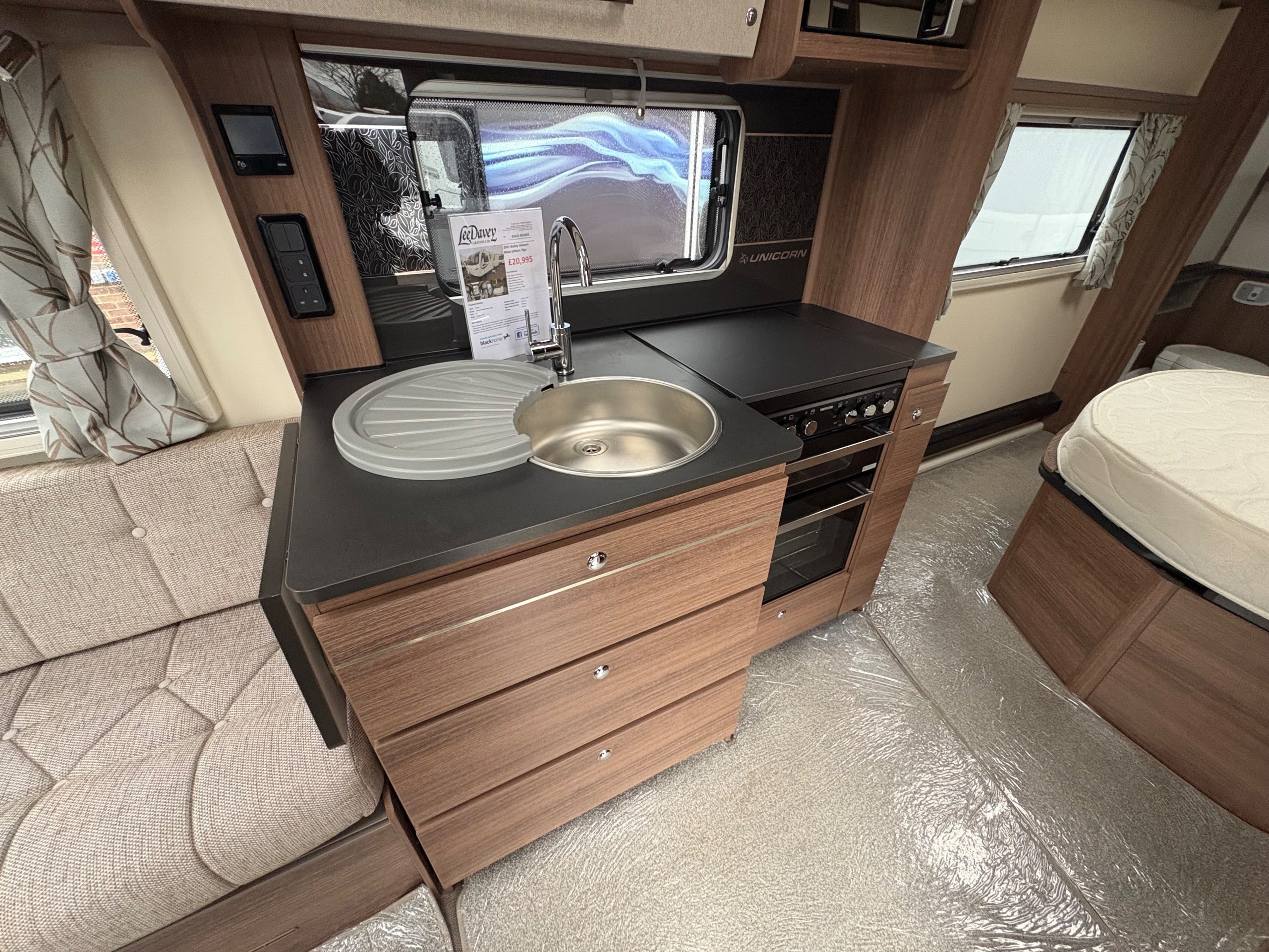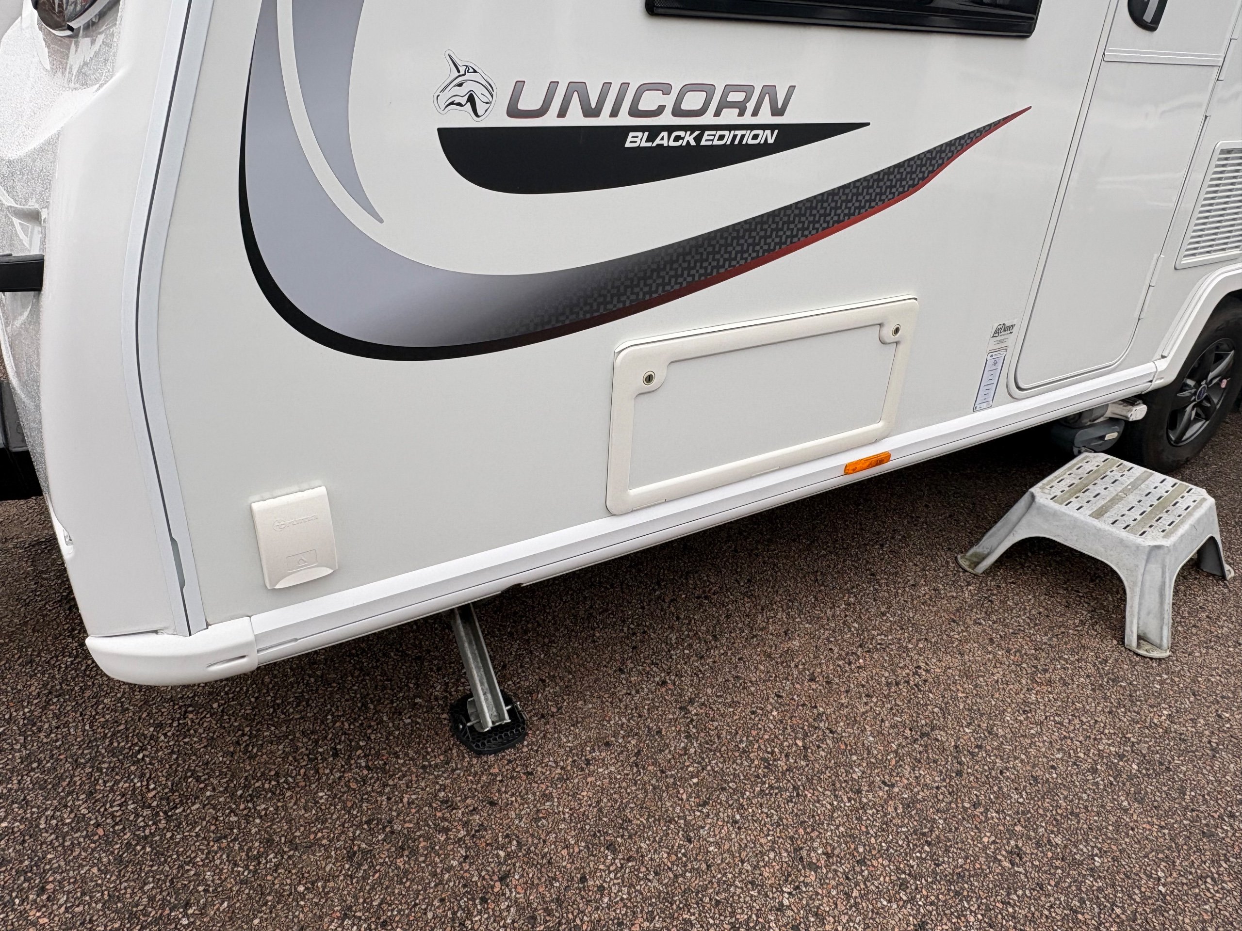 Year: 2021, Berth: 4, Internal length: 5.83m / 19'1", External length: 7.36m / 24'1", Width: 2.28m / 7'5", Unladen weight: 1344kg, MTPLM: 1499kg, Awning size: 10.27m, Warranty: 12 months. The Unicorn Black Vigo features a transverse bed with a rear washroom. Being from the Unicorn range it comes with a high level of specification, such as alde heating, alko atc braking and wheel lock, dual fuel hob, solar panel, DAB radio, external gas and mains points to name but a few. This model also comes with a Powrtouch Evolution caravan mover to it, to make moving the caravan around even easier. This caravan makes a great two berth caravan, however the front will convert into a double bed if needed. -