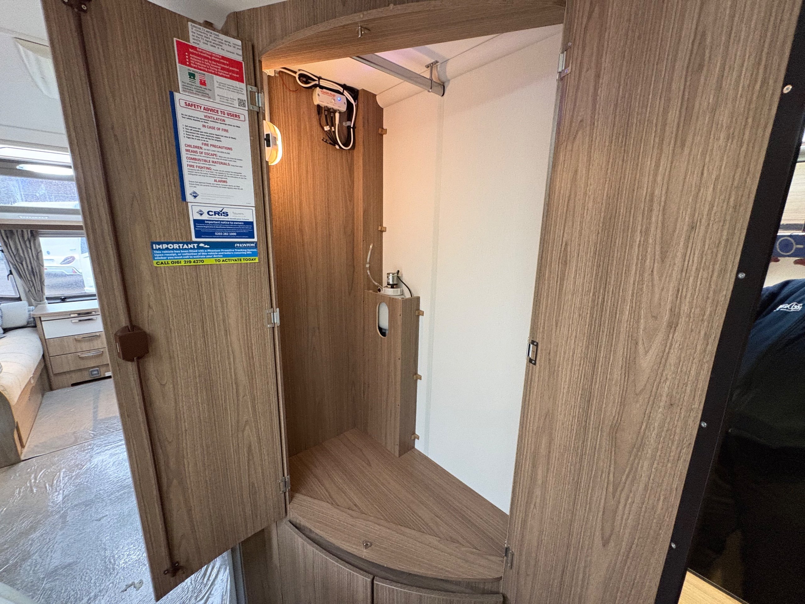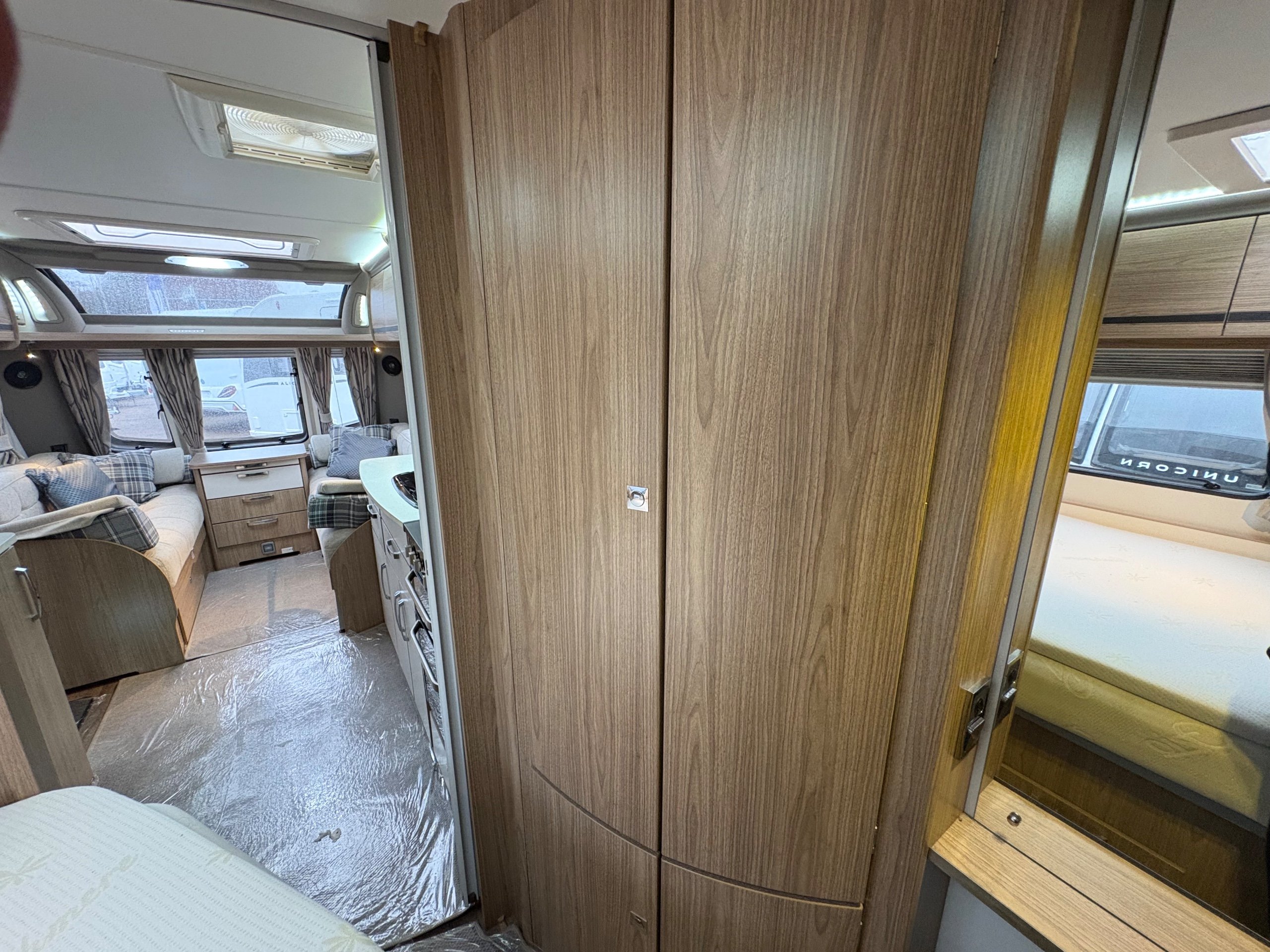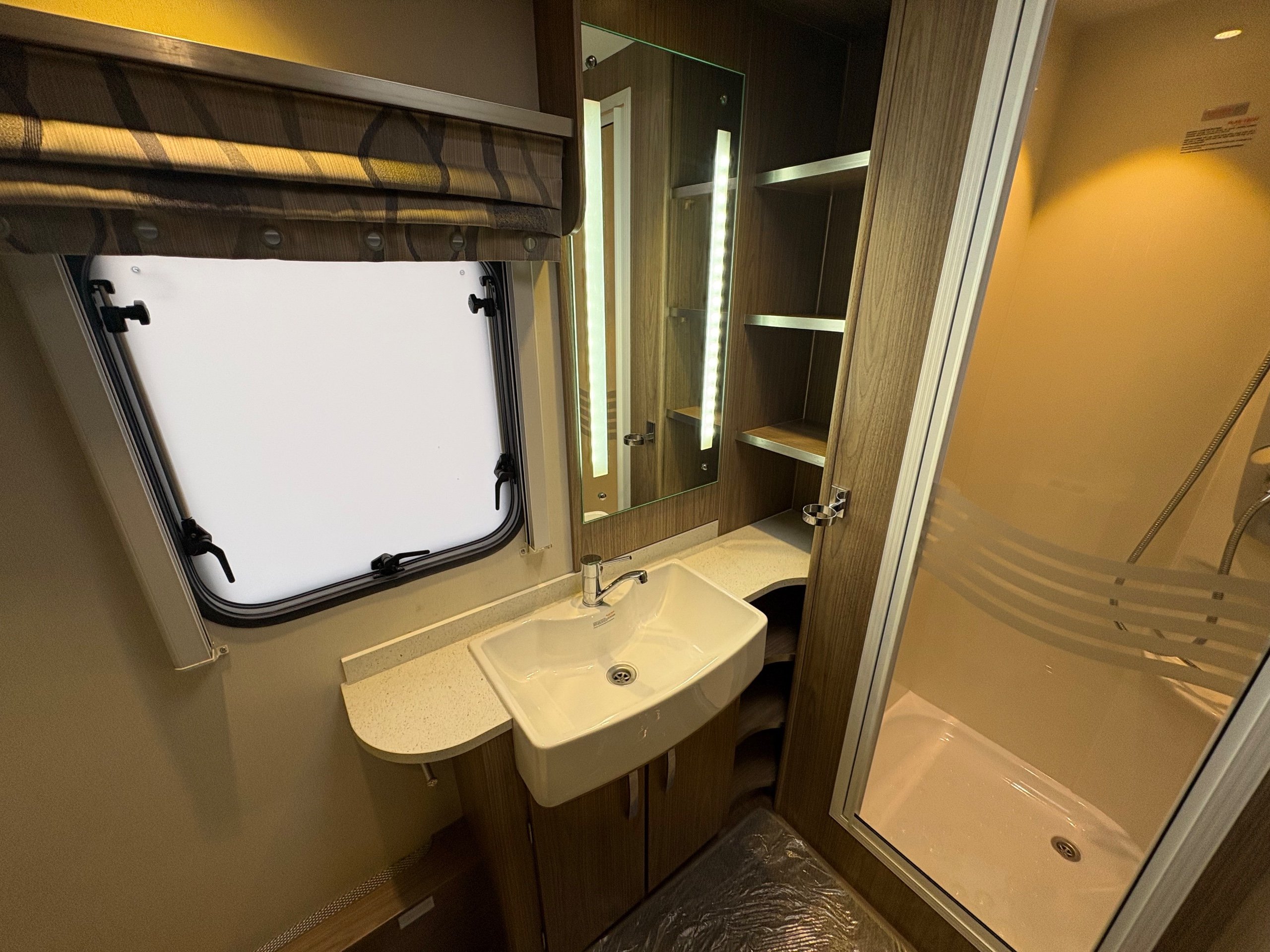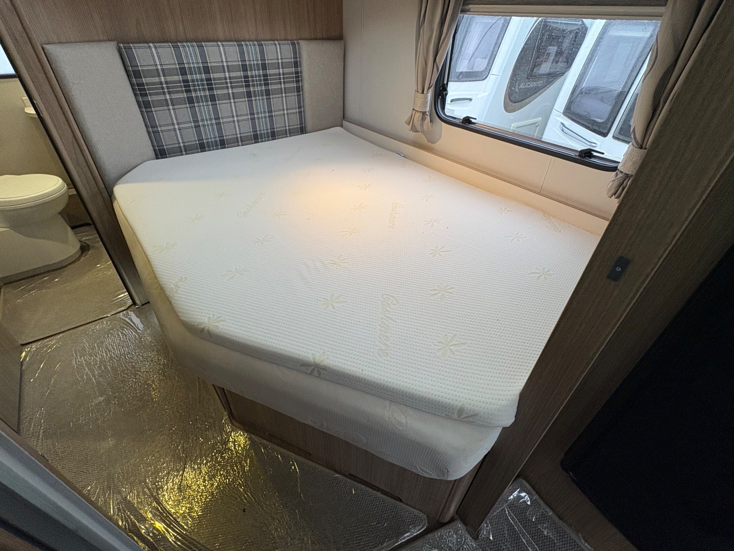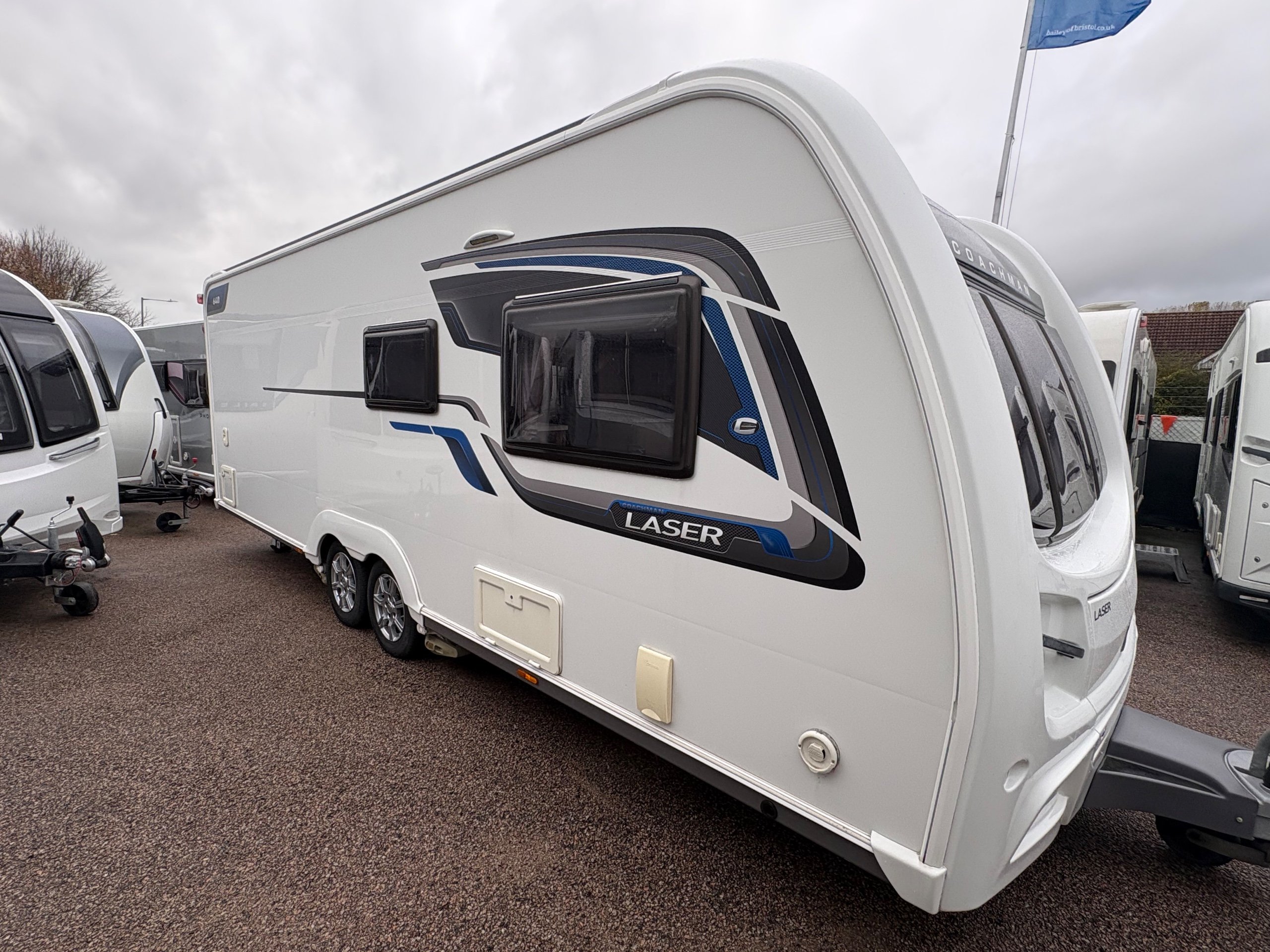 Year: 2916, Berth: 4, Internal length: 6.22m / 20'5", External length: 7.87m / 25'10", Width: 2.32m / 7'7", Unladen weight: 1642kg, MTPLM: 1800kg, Awning size: 10.70m, Warranty: 6 months. The Laser 640 is a twin axle caravan, featuring a fixed near side double bed and an end washroom. This top of the range has many features such as alde heating, external gas and mains points, alarms, wheel locks etc, and also featuring a powered caravan mover to help to position the caravan. Being four berth it has a lot of storage space inside the caravan as well as under the double bed, which can accessed via an external door for convenience. This model also features a generous payload, perfect for those longer trips as a couple or with the family. -