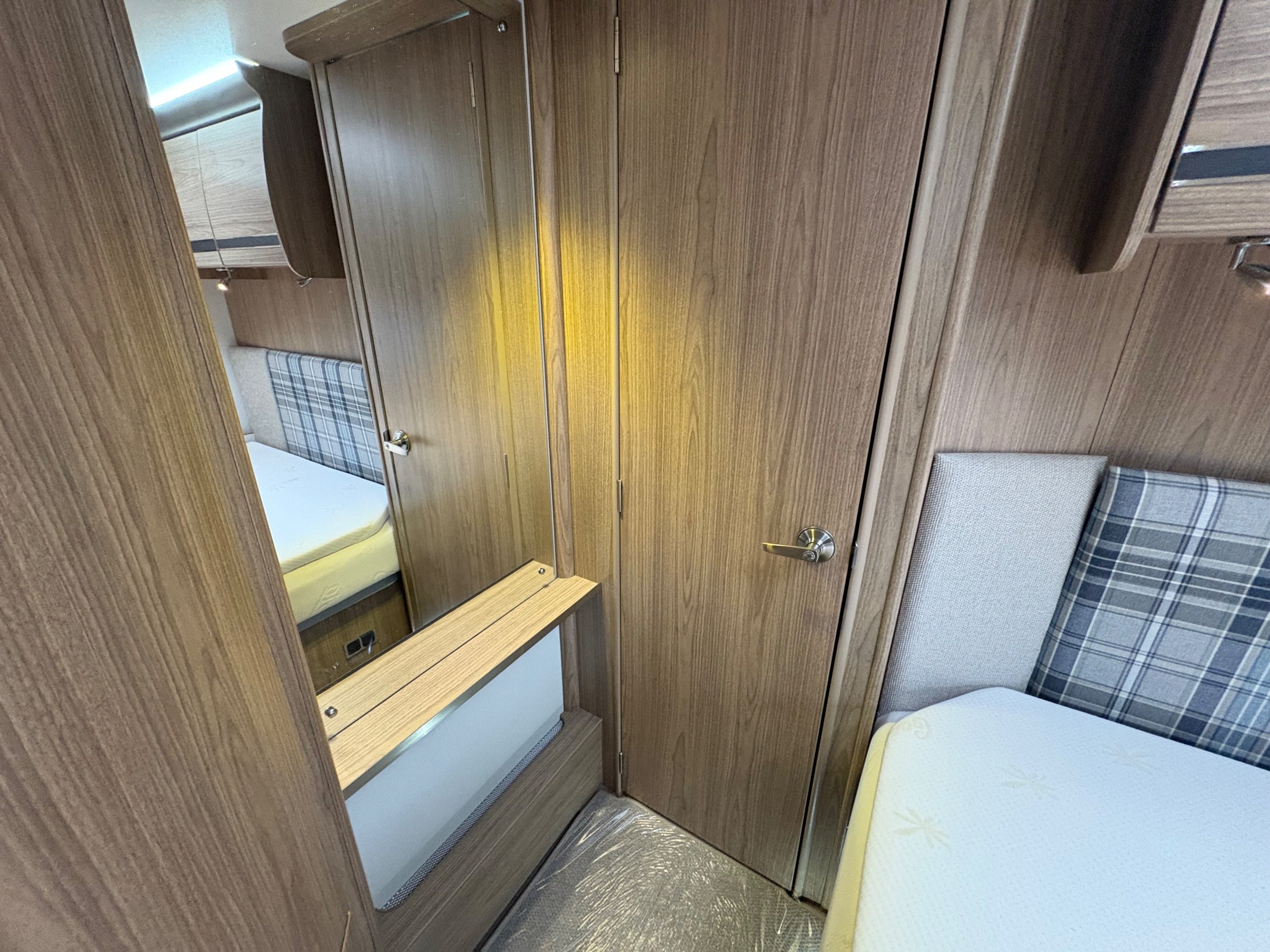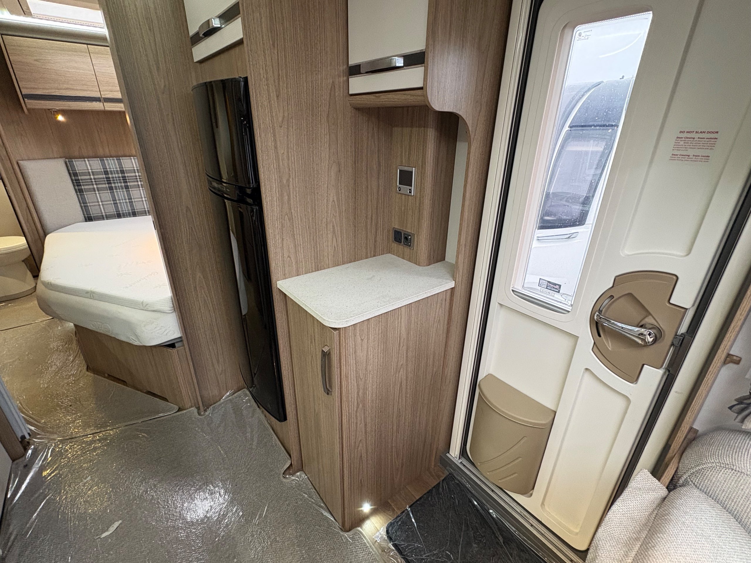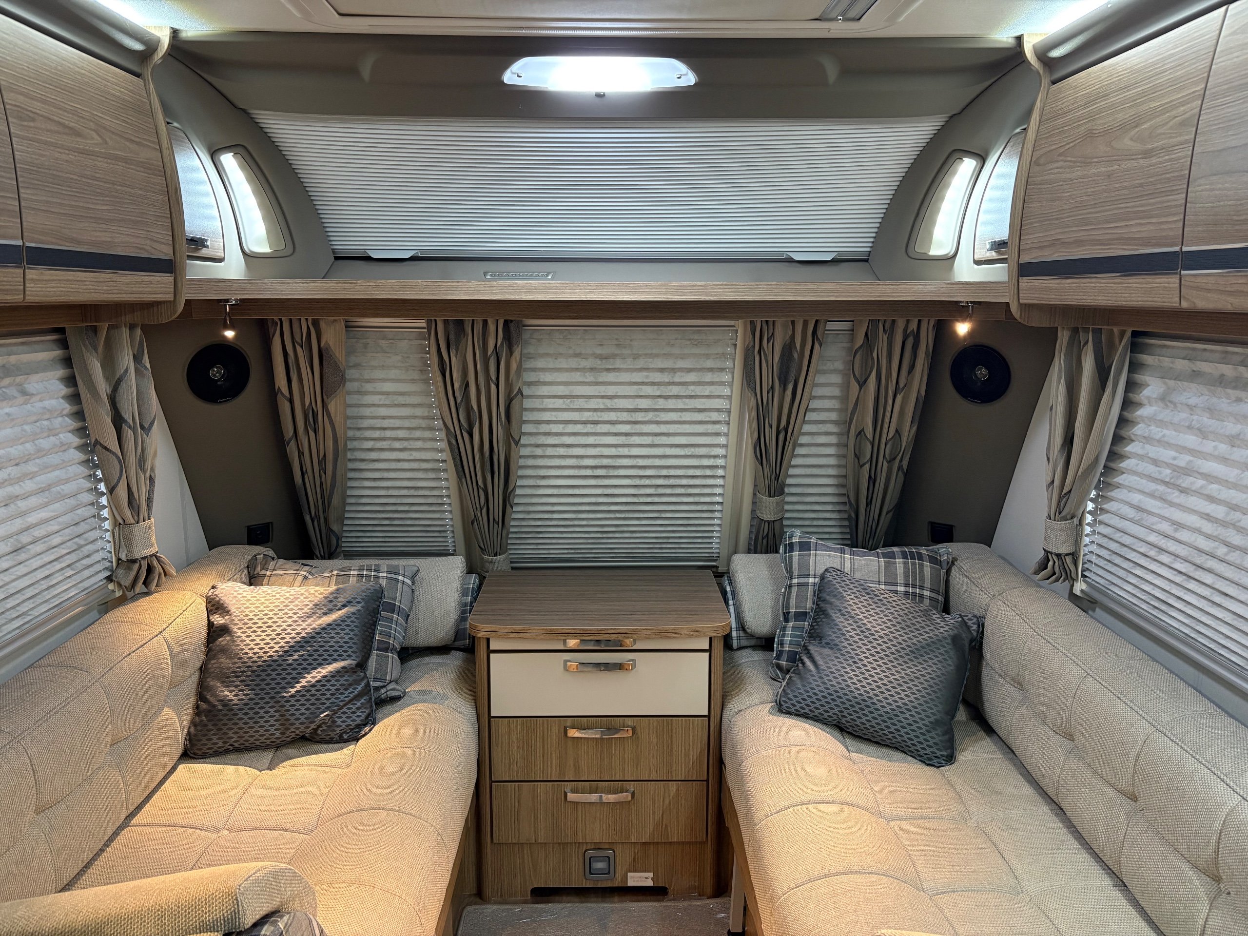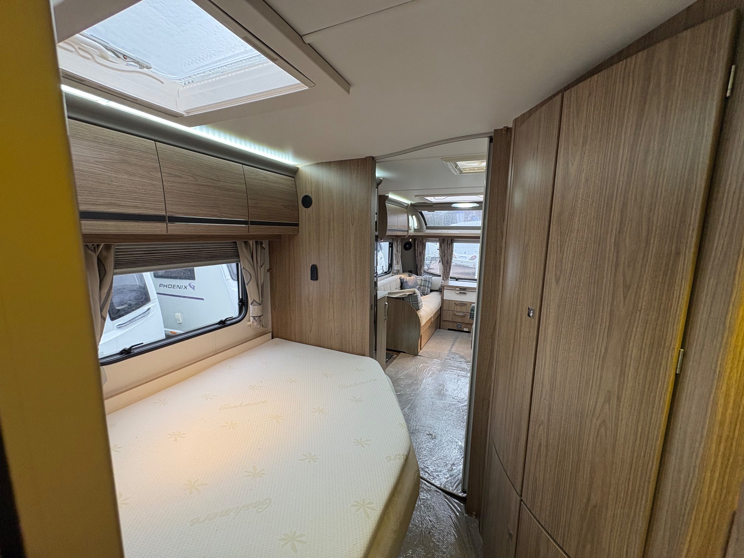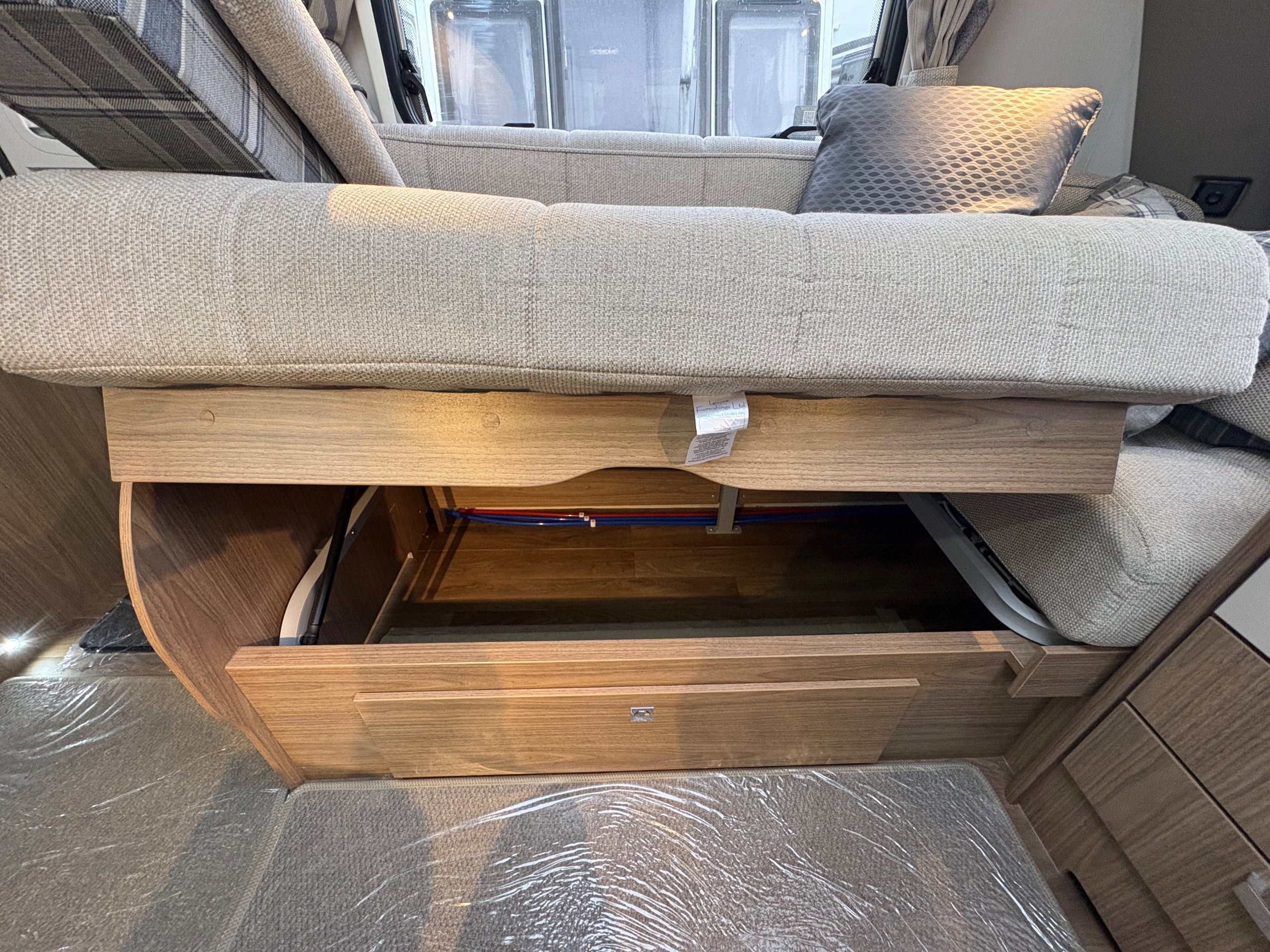 Year: 2916, Berth: 4, Internal length: 6.22m / 20'5", External length: 7.87m / 25'10", Width: 2.32m / 7'7", Unladen weight: 1642kg, MTPLM: 1800kg, Awning size: 10.70m, Warranty: 6 months. The Laser 640 is a twin axle caravan, featuring a fixed near side double bed and an end washroom. This top of the range has many features such as alde heating, external gas and mains points, alarms, wheel locks etc, and also featuring a powered caravan mover to help to position the caravan. Being four berth it has a lot of storage space inside the caravan as well as under the double bed, which can accessed via an external door for convenience. This model also features a generous payload, perfect for those longer trips as a couple or with the family. -