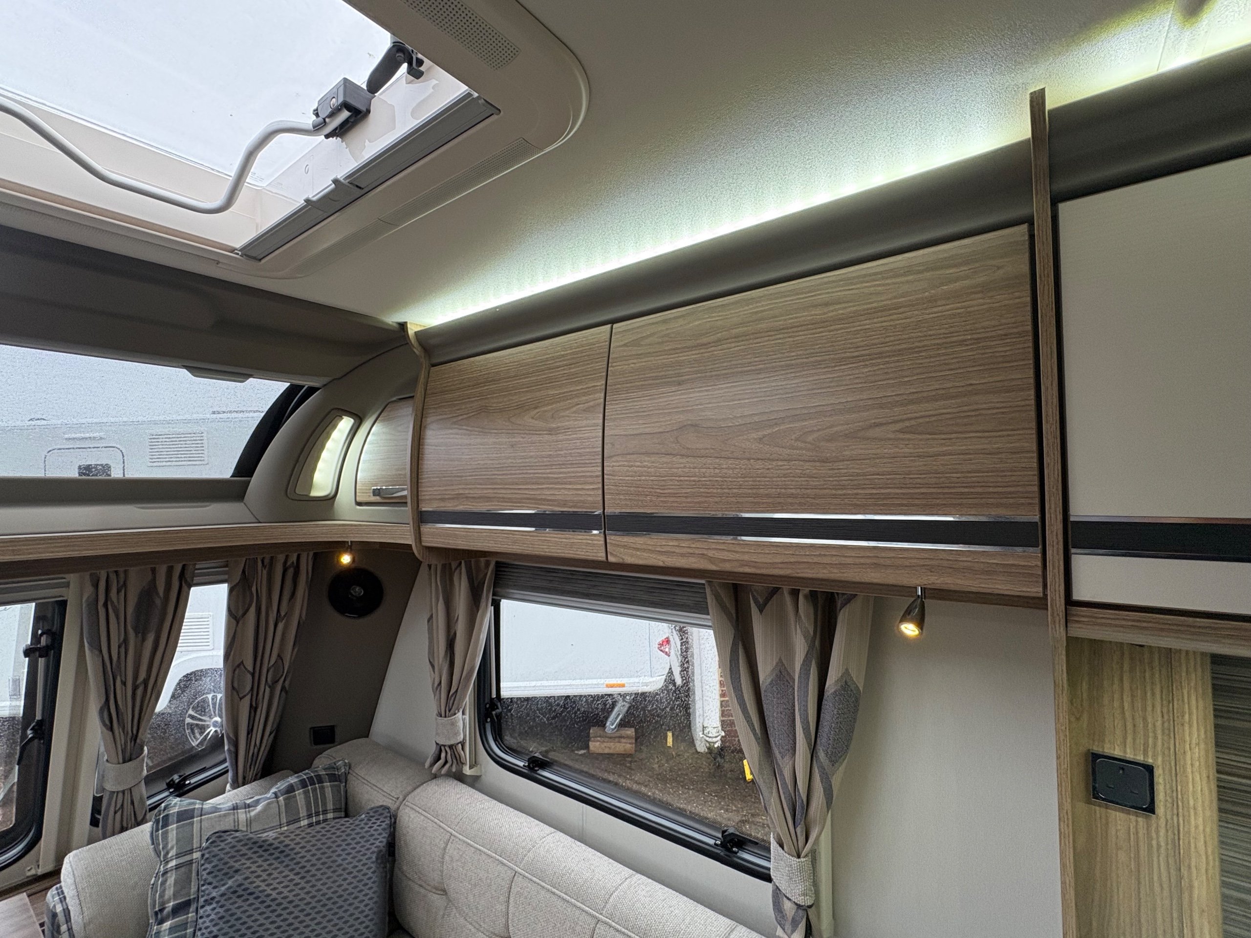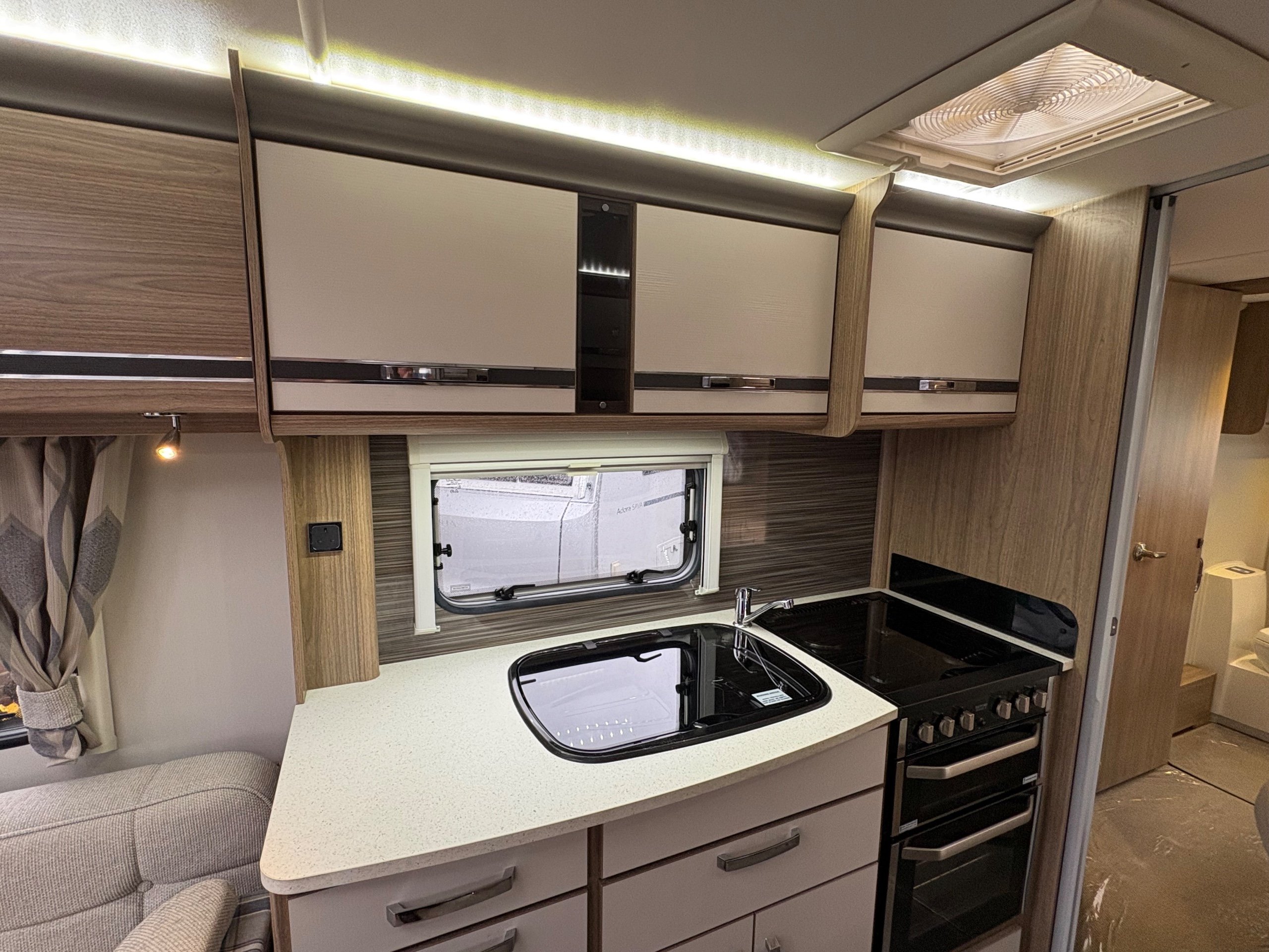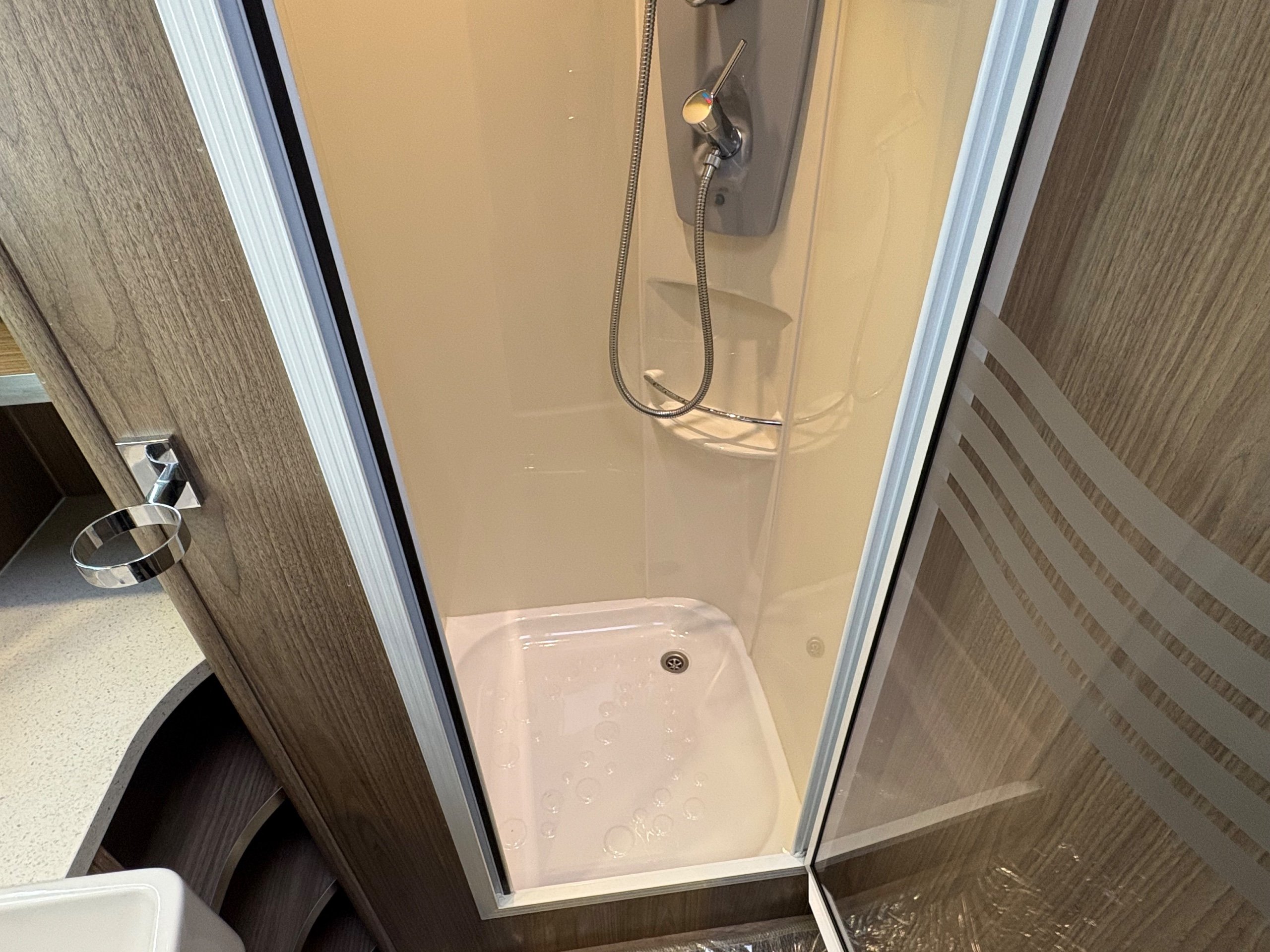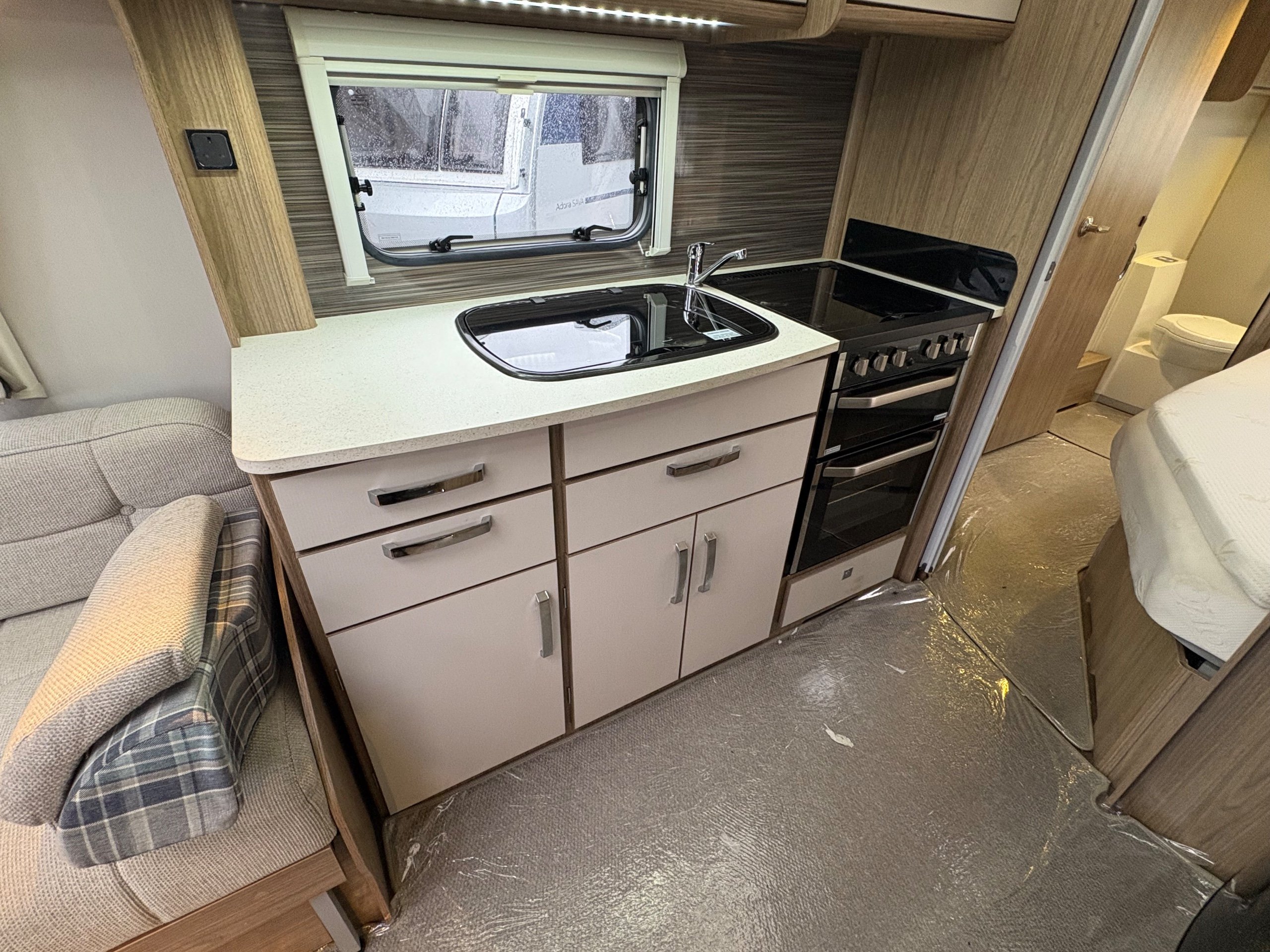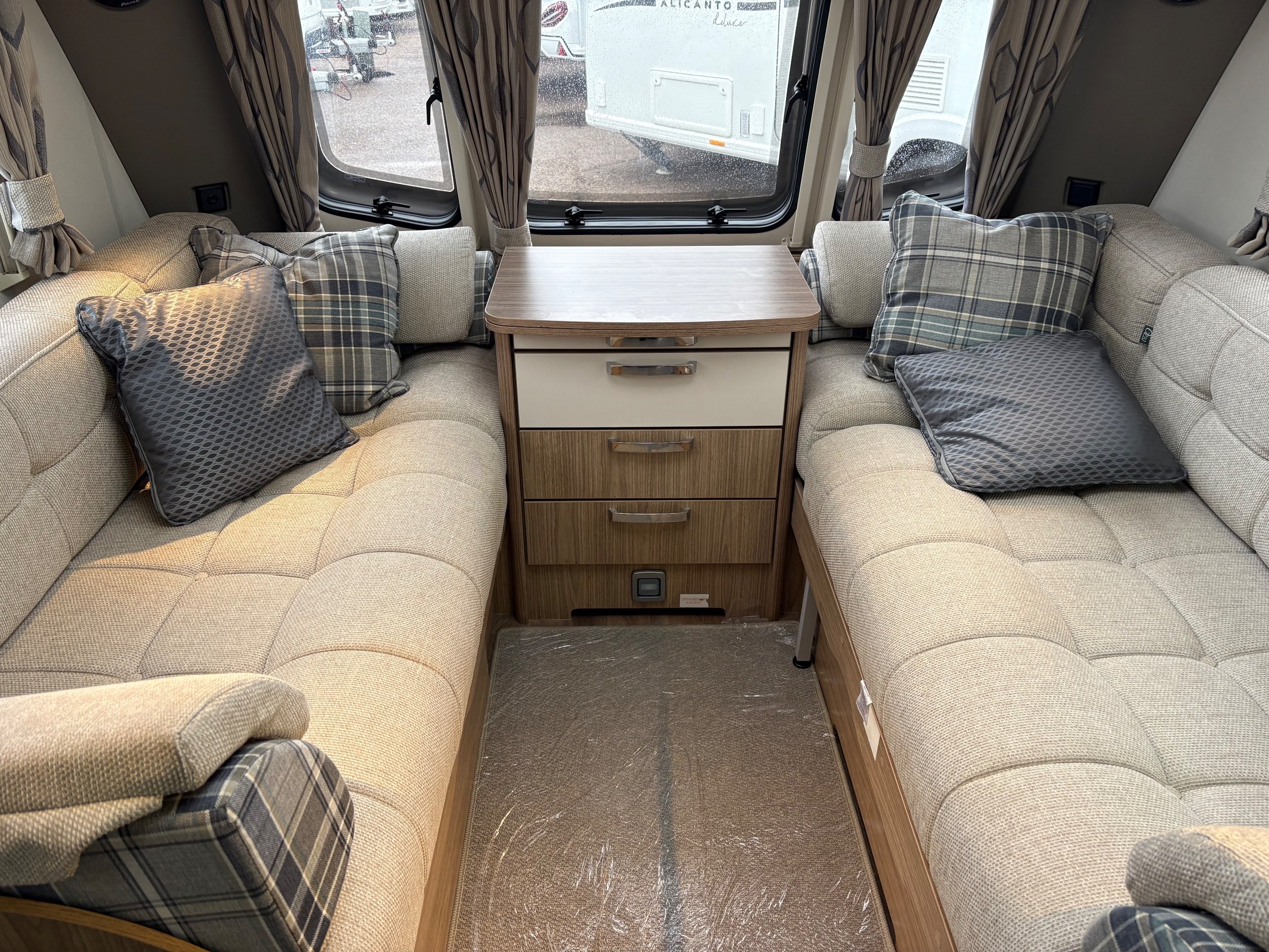 Year: 2916, Berth: 4, Internal length: 6.22m / 20'5", External length: 7.87m / 25'10", Width: 2.32m / 7'7", Unladen weight: 1642kg, MTPLM: 1800kg, Awning size: 10.70m, Warranty: 6 months. The Laser 640 is a twin axle caravan, featuring a fixed near side double bed and an end washroom. This top of the range has many features such as alde heating, external gas and mains points, alarms, wheel locks etc, and also featuring a powered caravan mover to help to position the caravan. Being four berth it has a lot of storage space inside the caravan as well as under the double bed, which can accessed via an external door for convenience. This model also features a generous payload, perfect for those longer trips as a couple or with the family. -