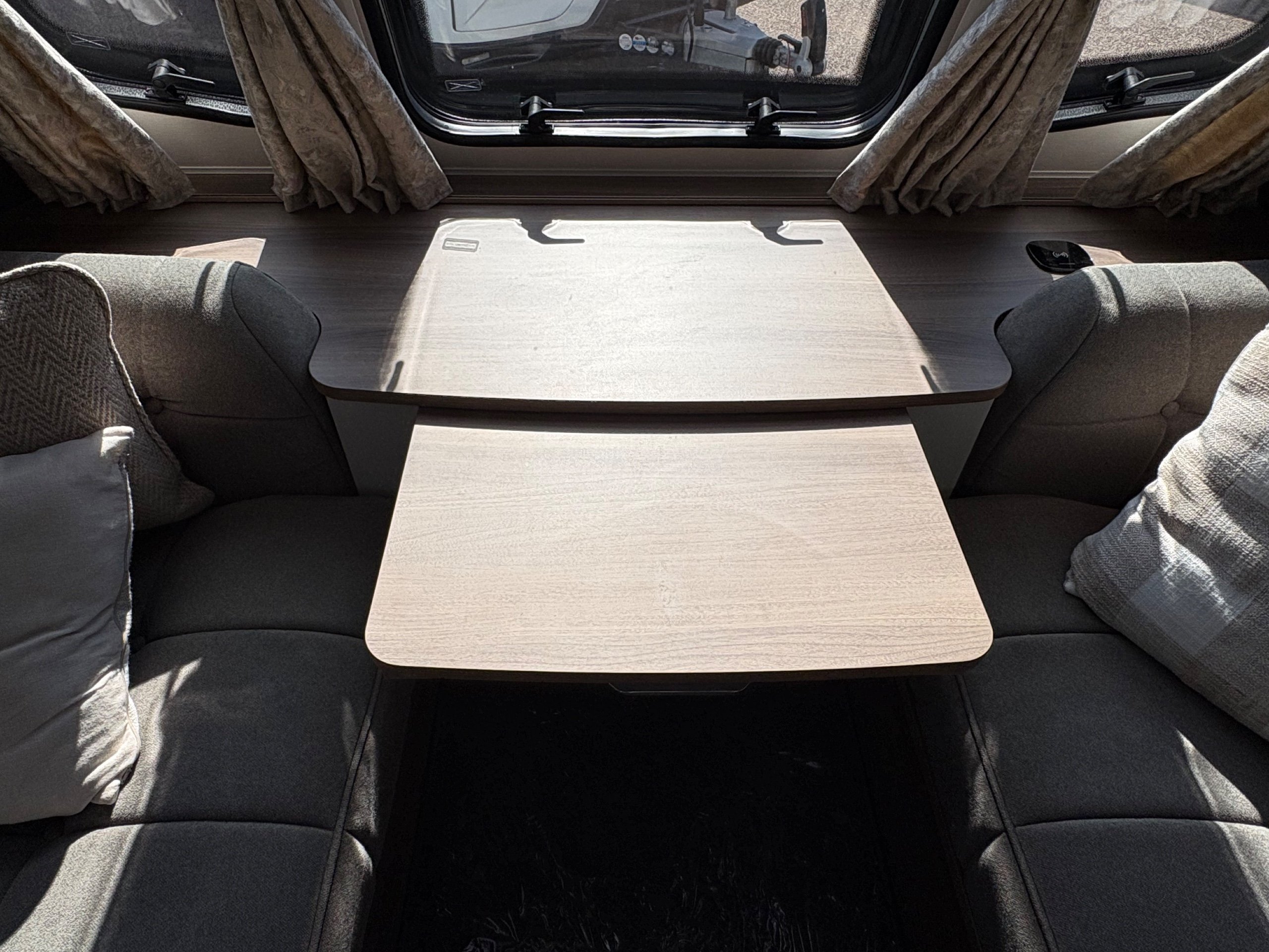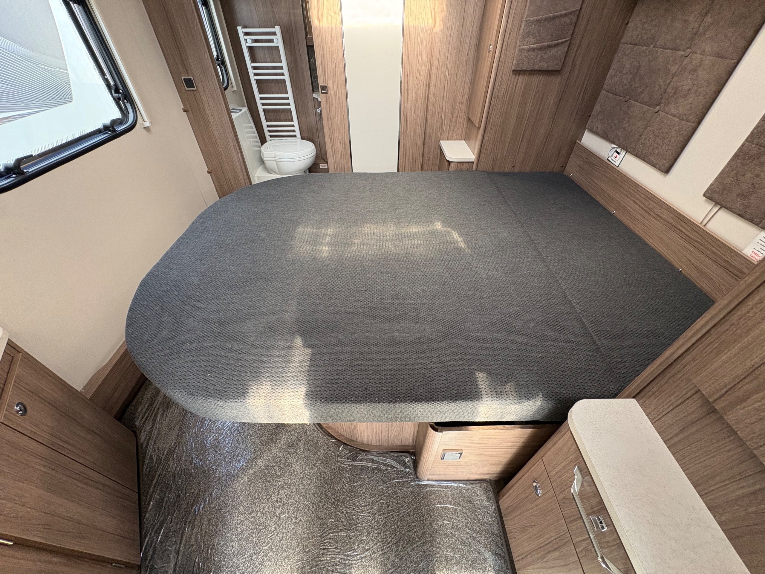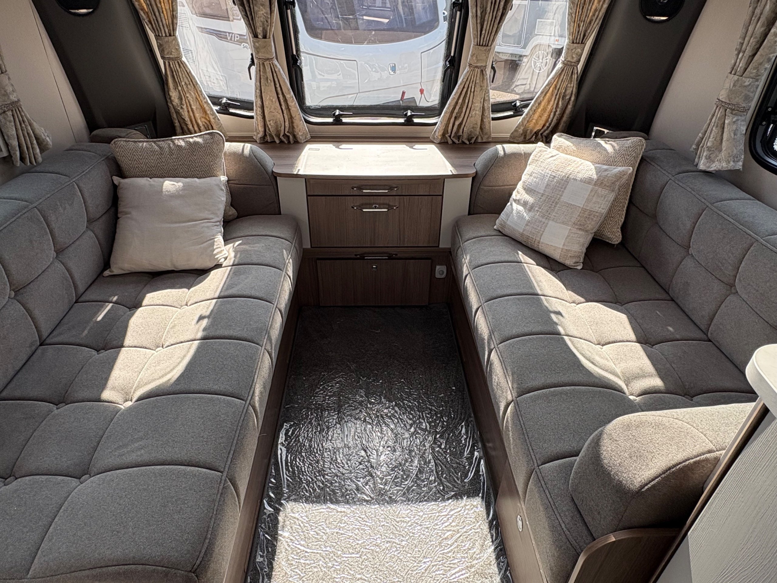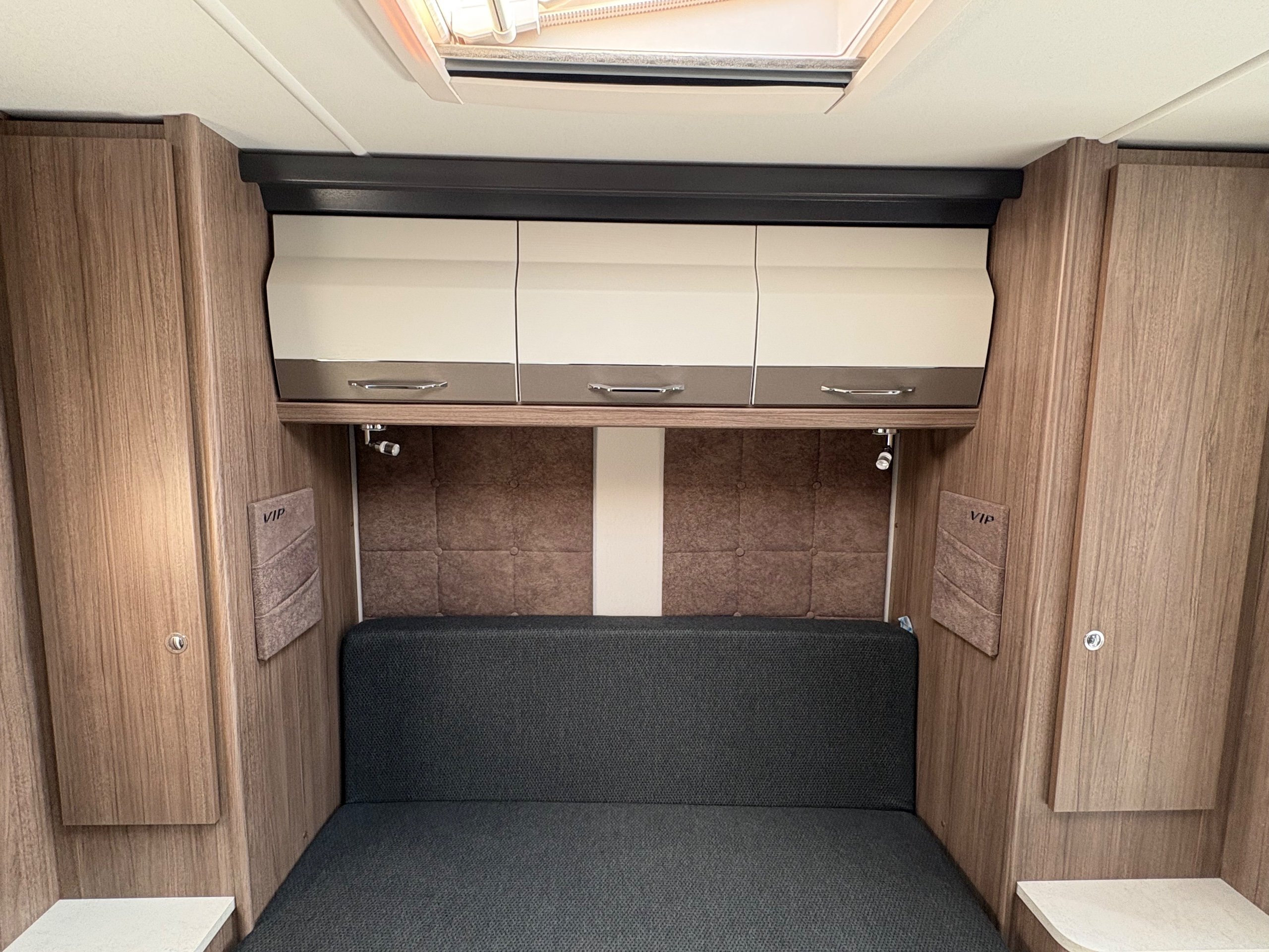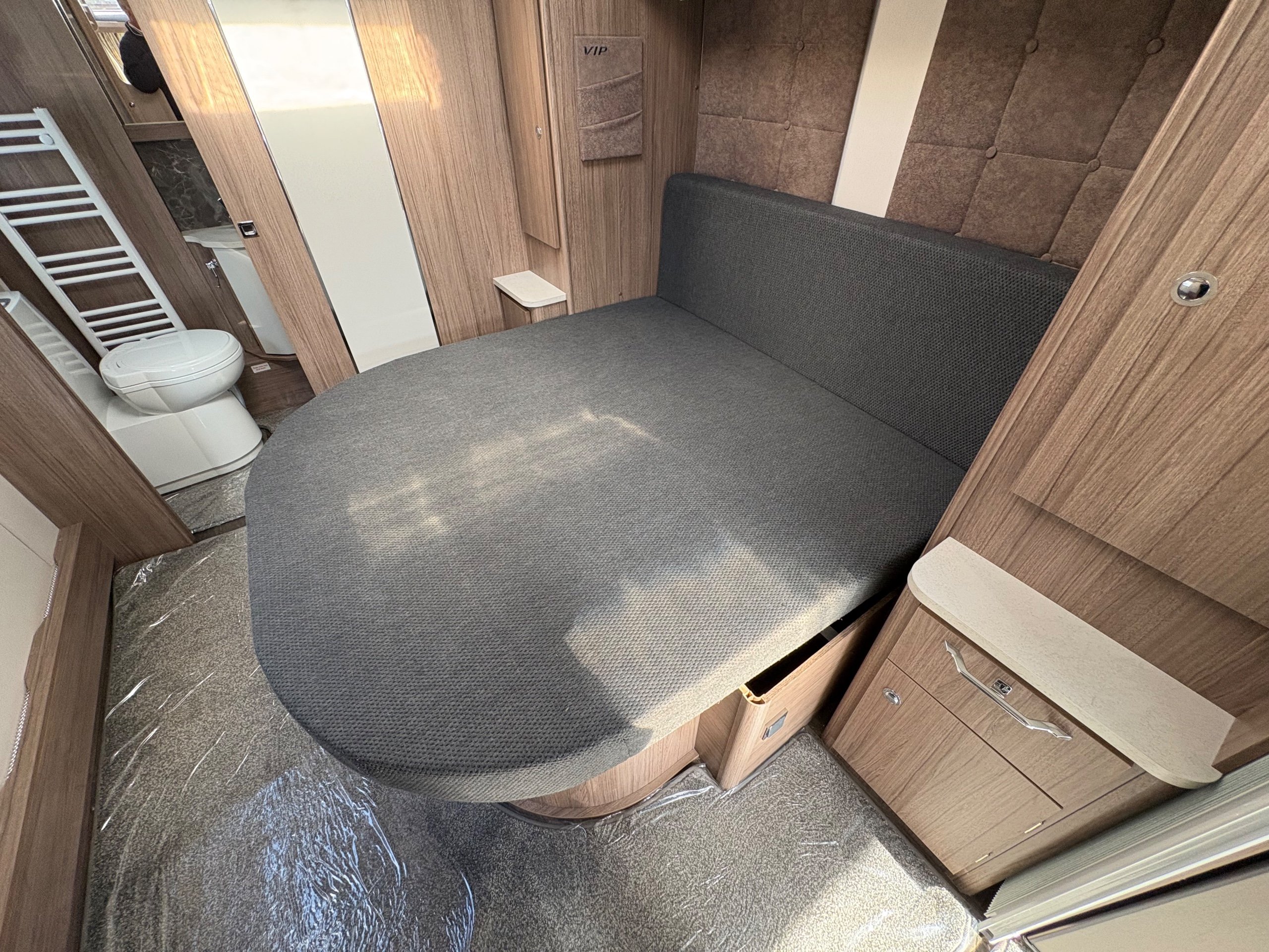 Year: 2024, Berth: 4, Internal length: 5.80m / 19', External length: 7.43m / 24'5", Width: 7'7", Unladen weight: 1504kg, MTPLM: 1700kg, Awning size:10.34m, Warranty: Balance of manufacturers warranty ( subject to terms and conditions ). One of the most successful transverse double bed, end washroom caravans. The Vip has a slightly wider body width of 7'7", which helps to get around the double bed when extended, and for more space in the front lounge. The powered caravan mover fitted to this model, make sit easier to move around at home, storage or when away on site. Alde heating, alko atc braking, alko wheel locks, external gas and mains points, alarm or just some of the features fitted on this model. -