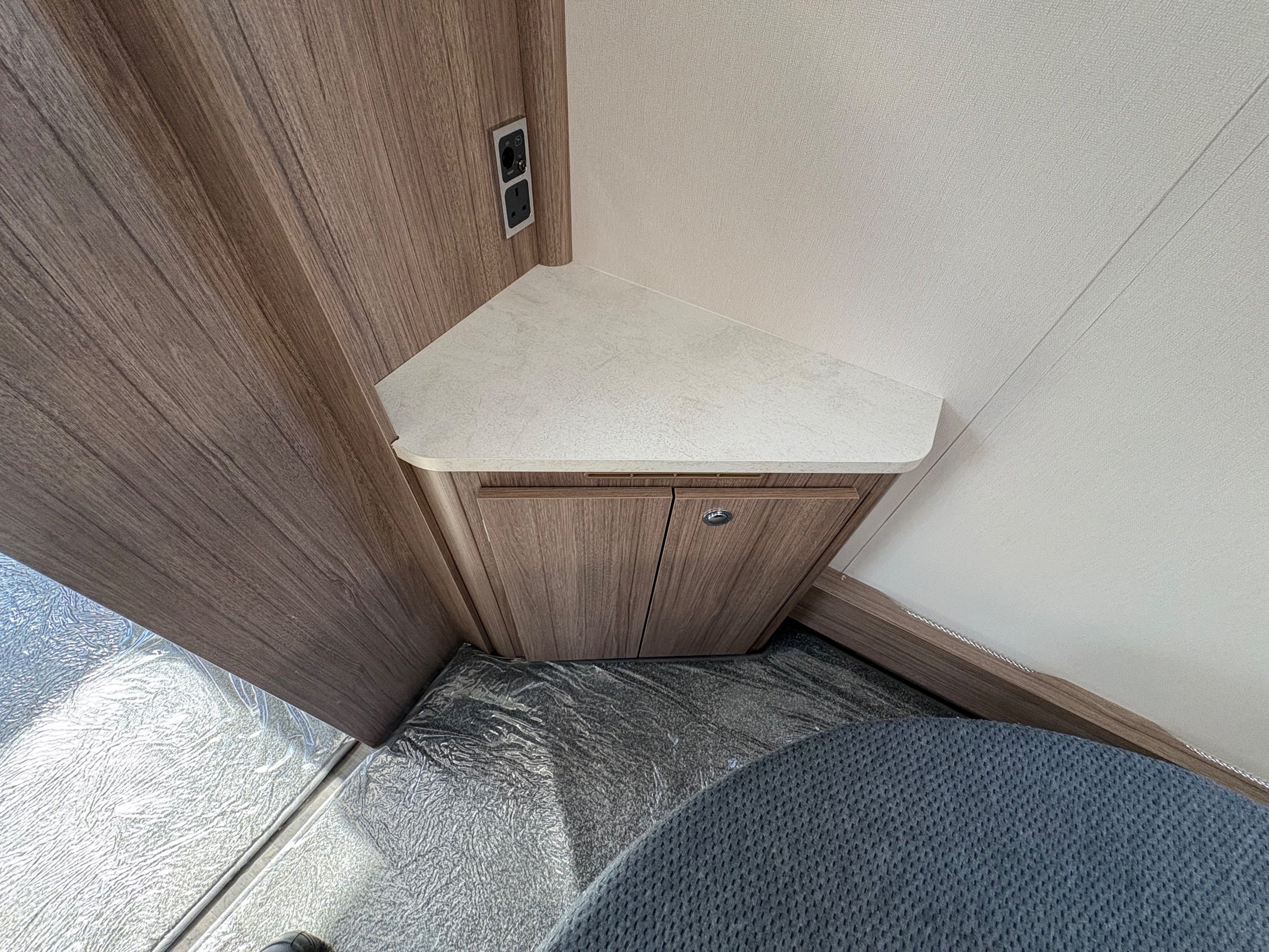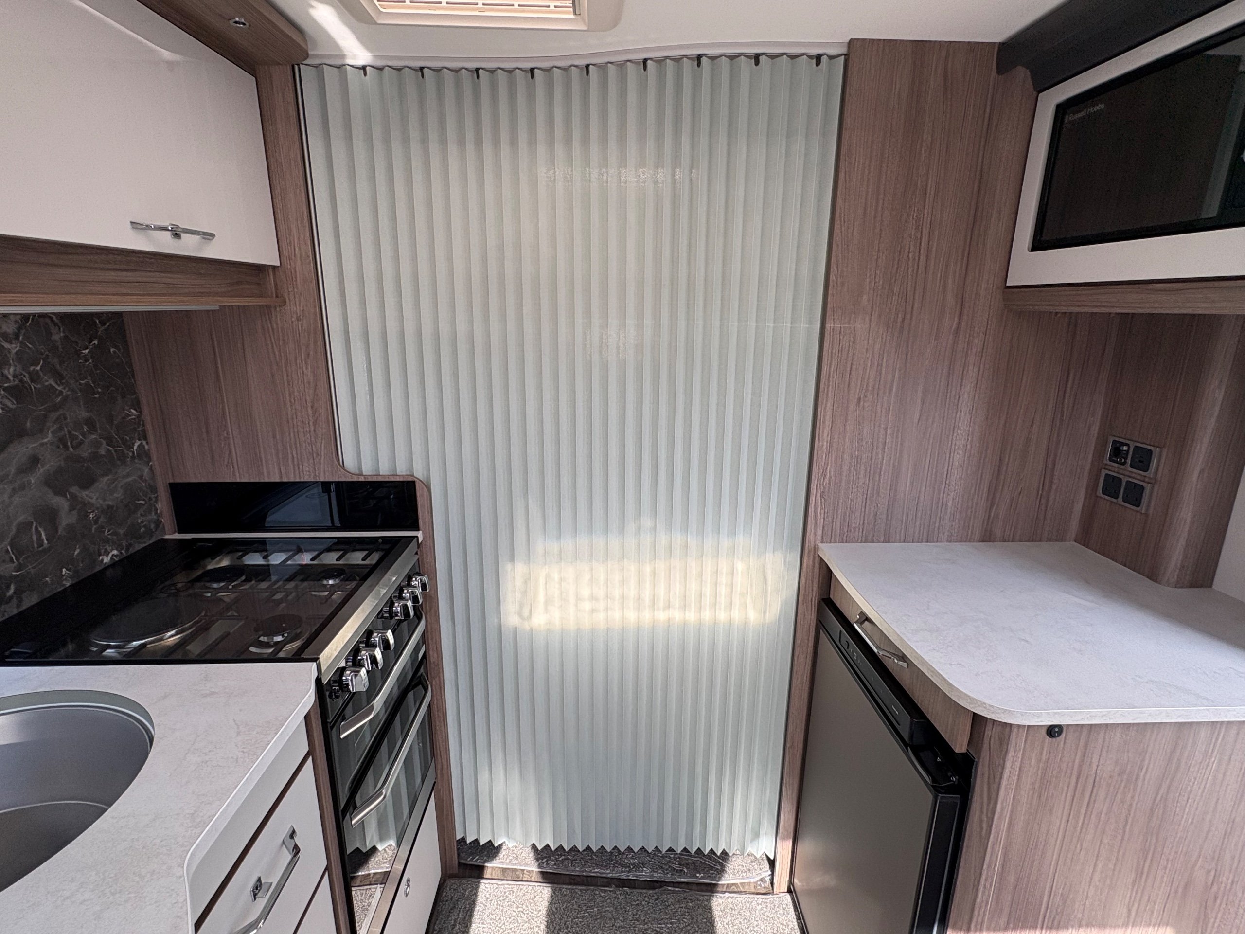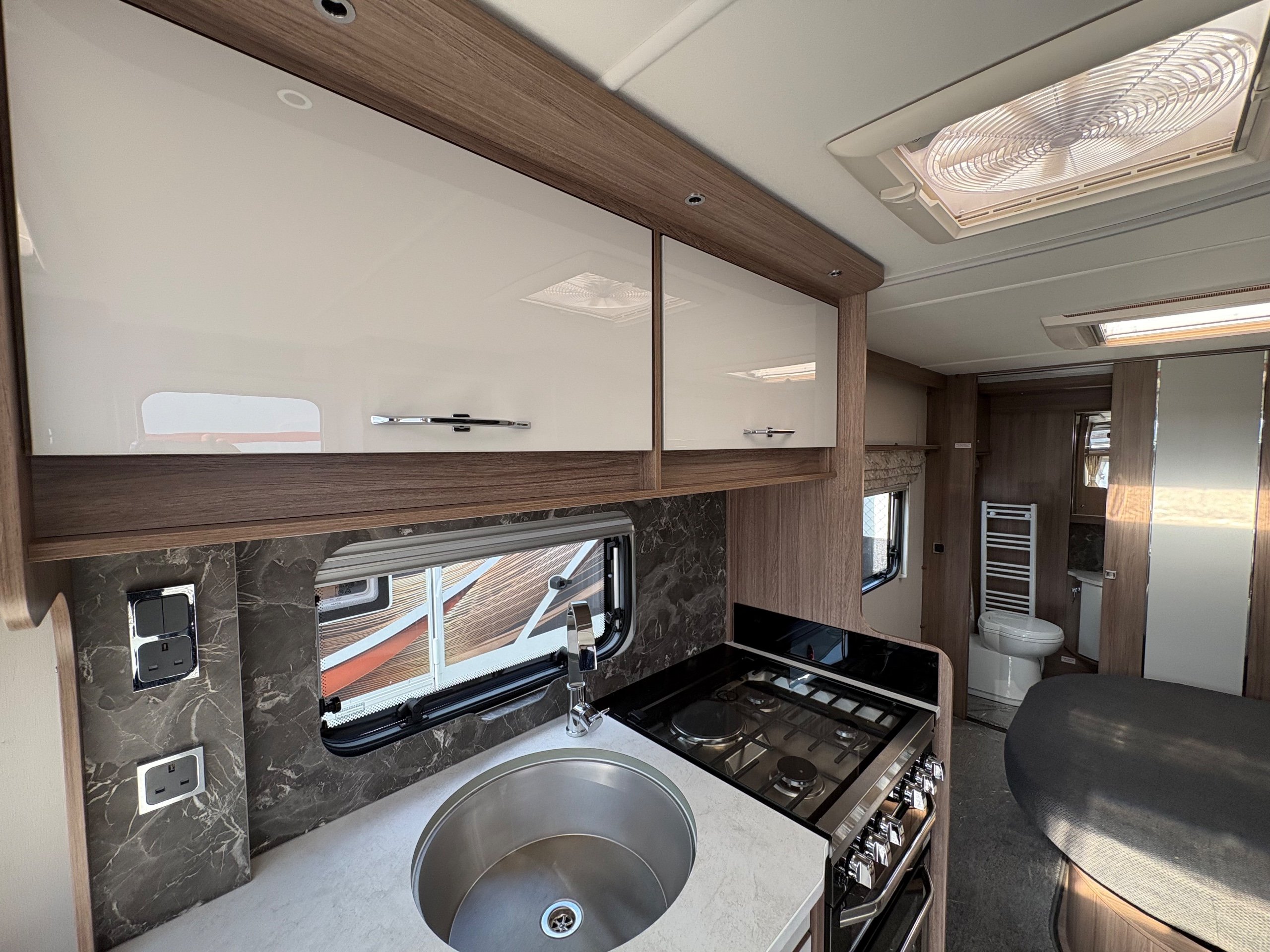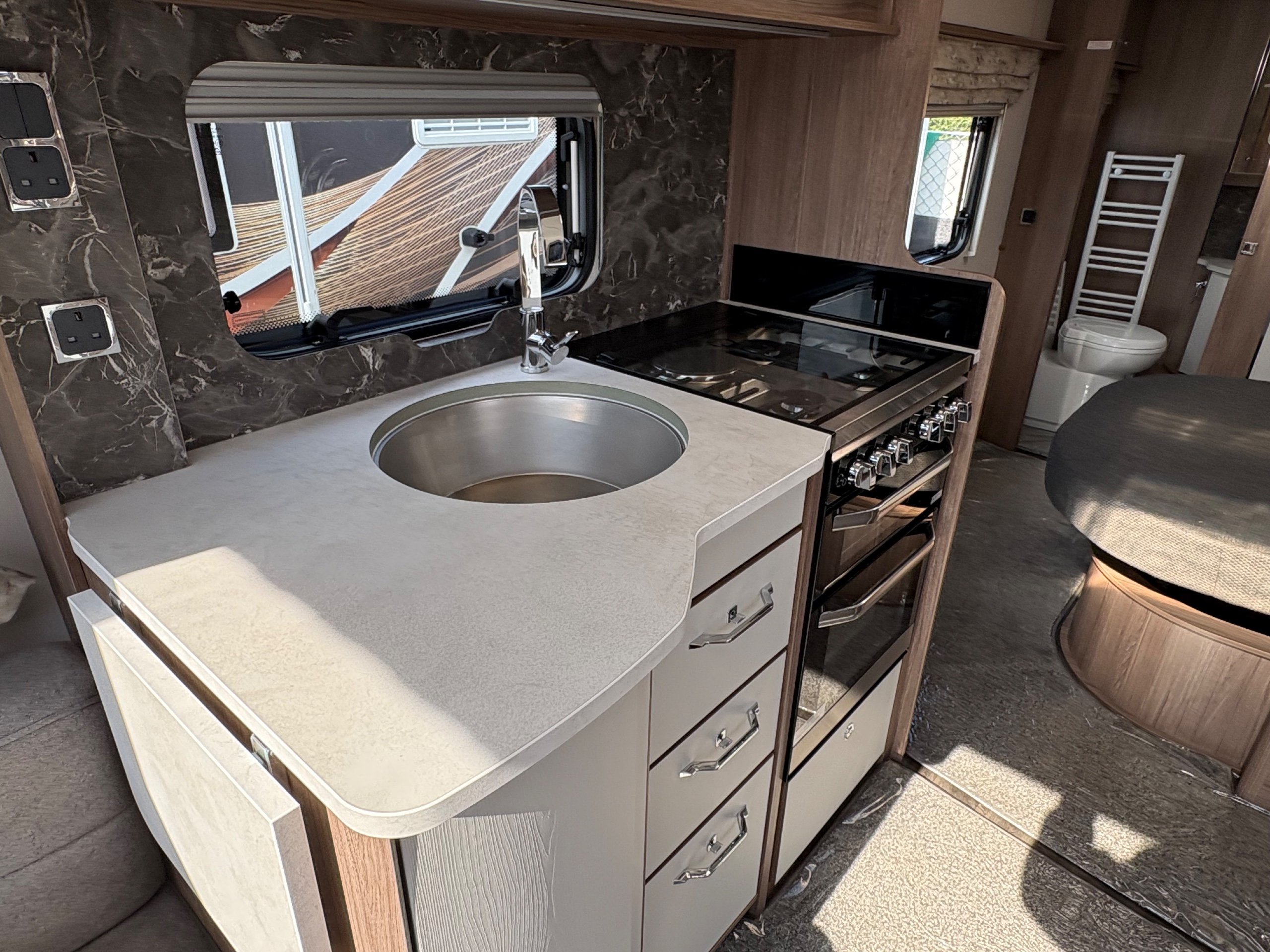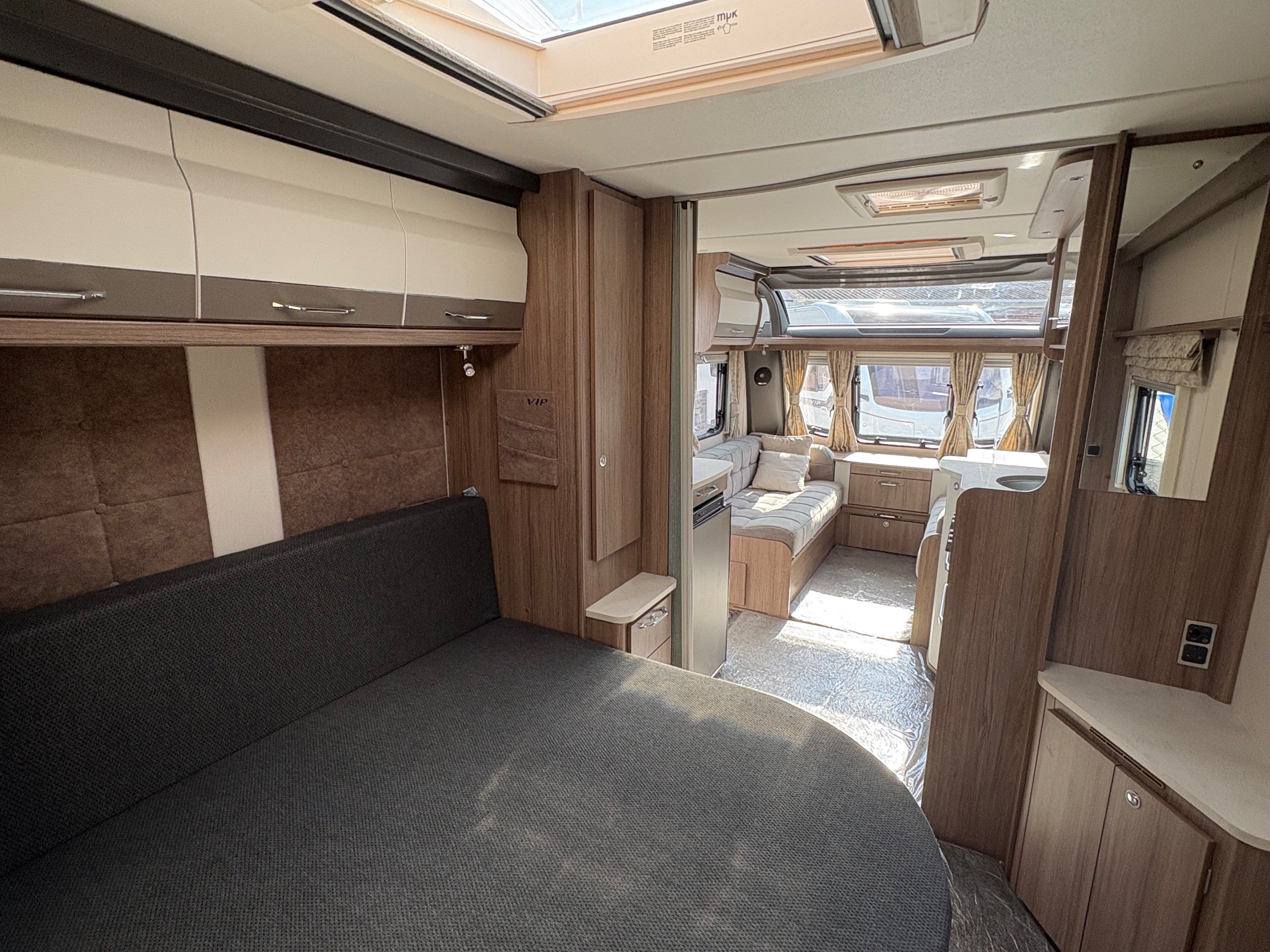 Year: 2024, Berth: 4, Internal length: 5.80m / 19', External length: 7.43m / 24'5", Width: 7'7", Unladen weight: 1504kg, MTPLM: 1700kg, Awning size:10.34m, Warranty: Balance of manufacturers warranty ( subject to terms and conditions ). One of the most successful transverse double bed, end washroom caravans. The Vip has a slightly wider body width of 7'7", which helps to get around the double bed when extended, and for more space in the front lounge. The powered caravan mover fitted to this model, make sit easier to move around at home, storage or when away on site. Alde heating, alko atc braking, alko wheel locks, external gas and mains points, alarm or just some of the features fitted on this model. -