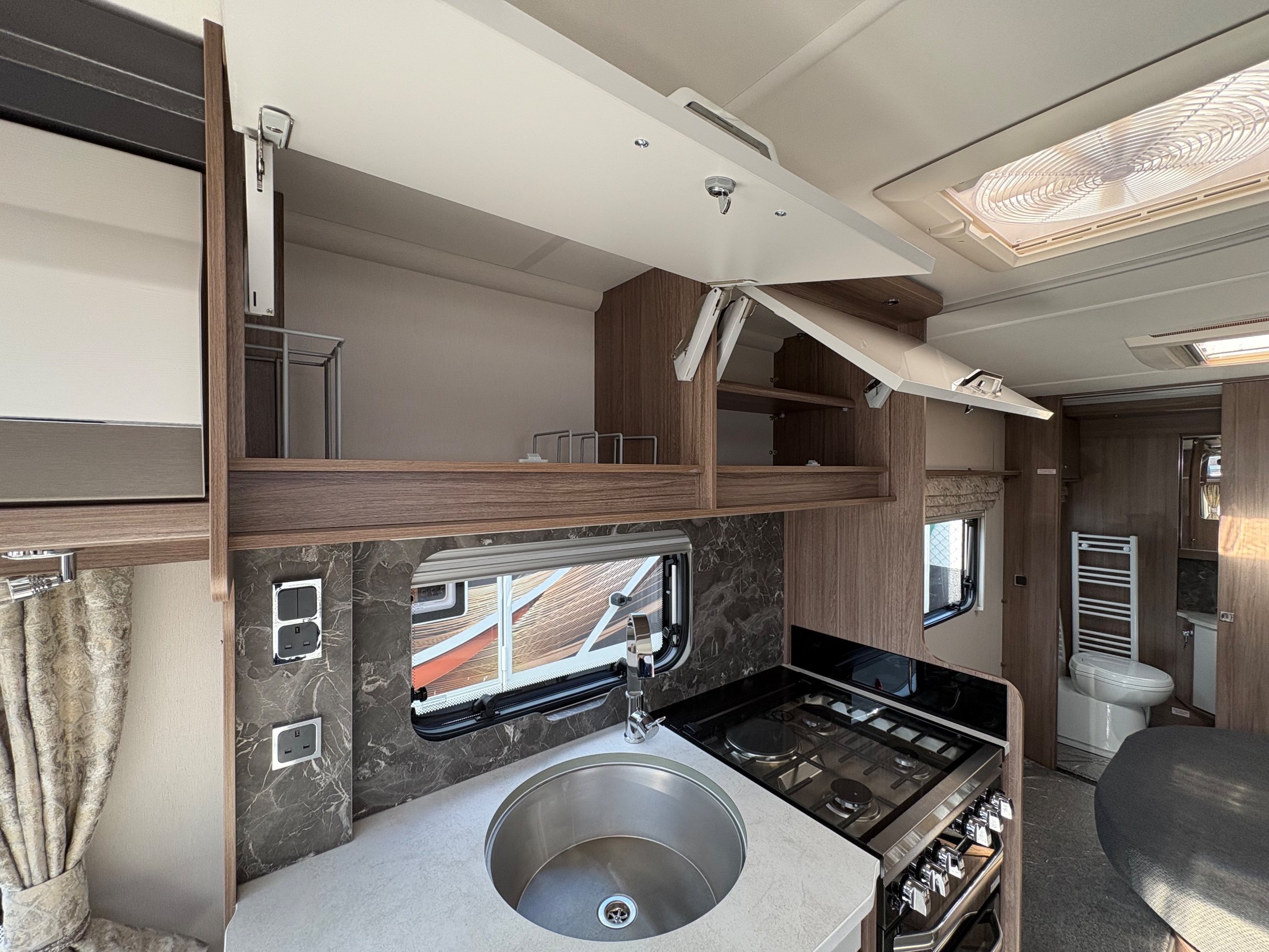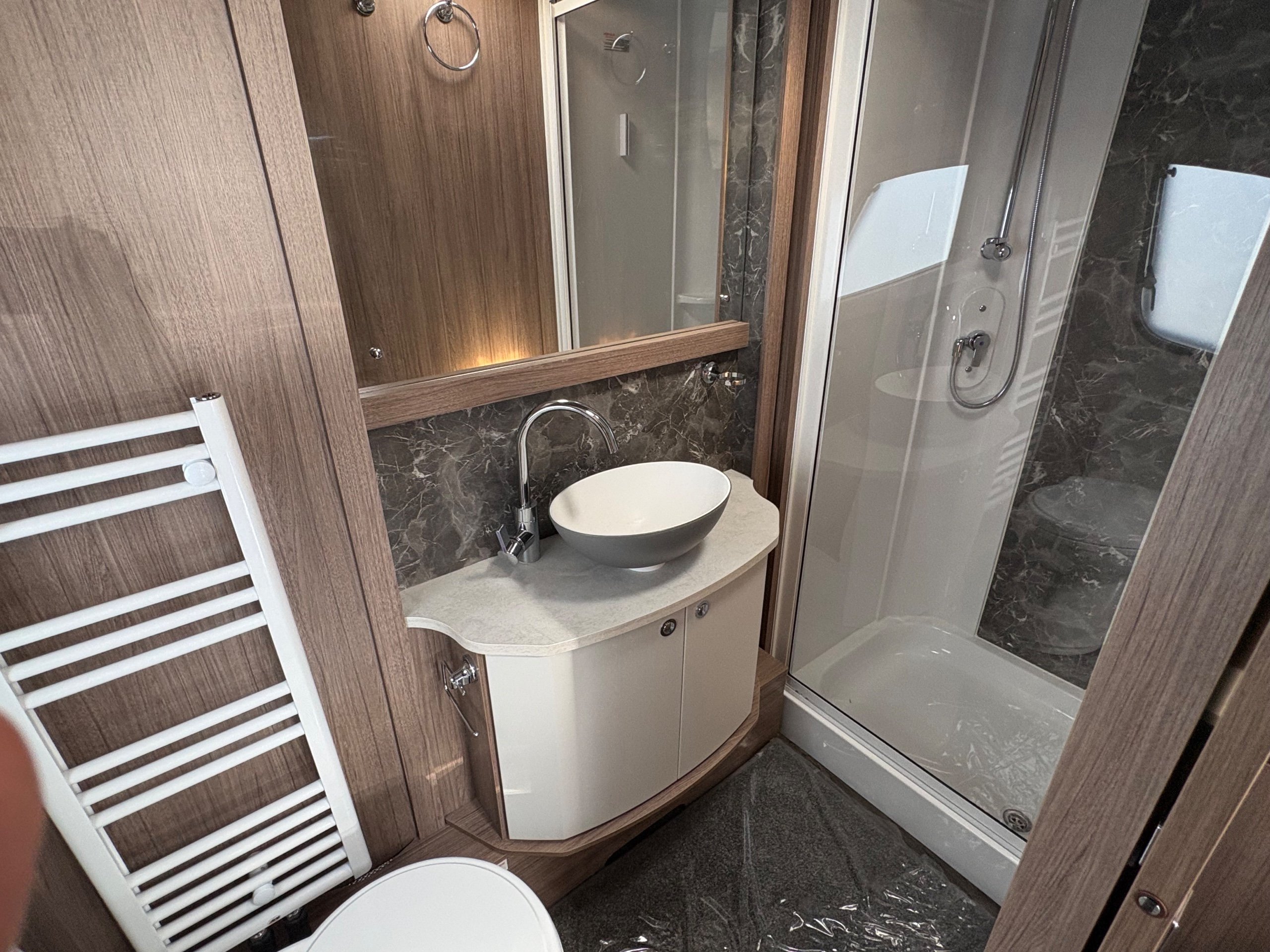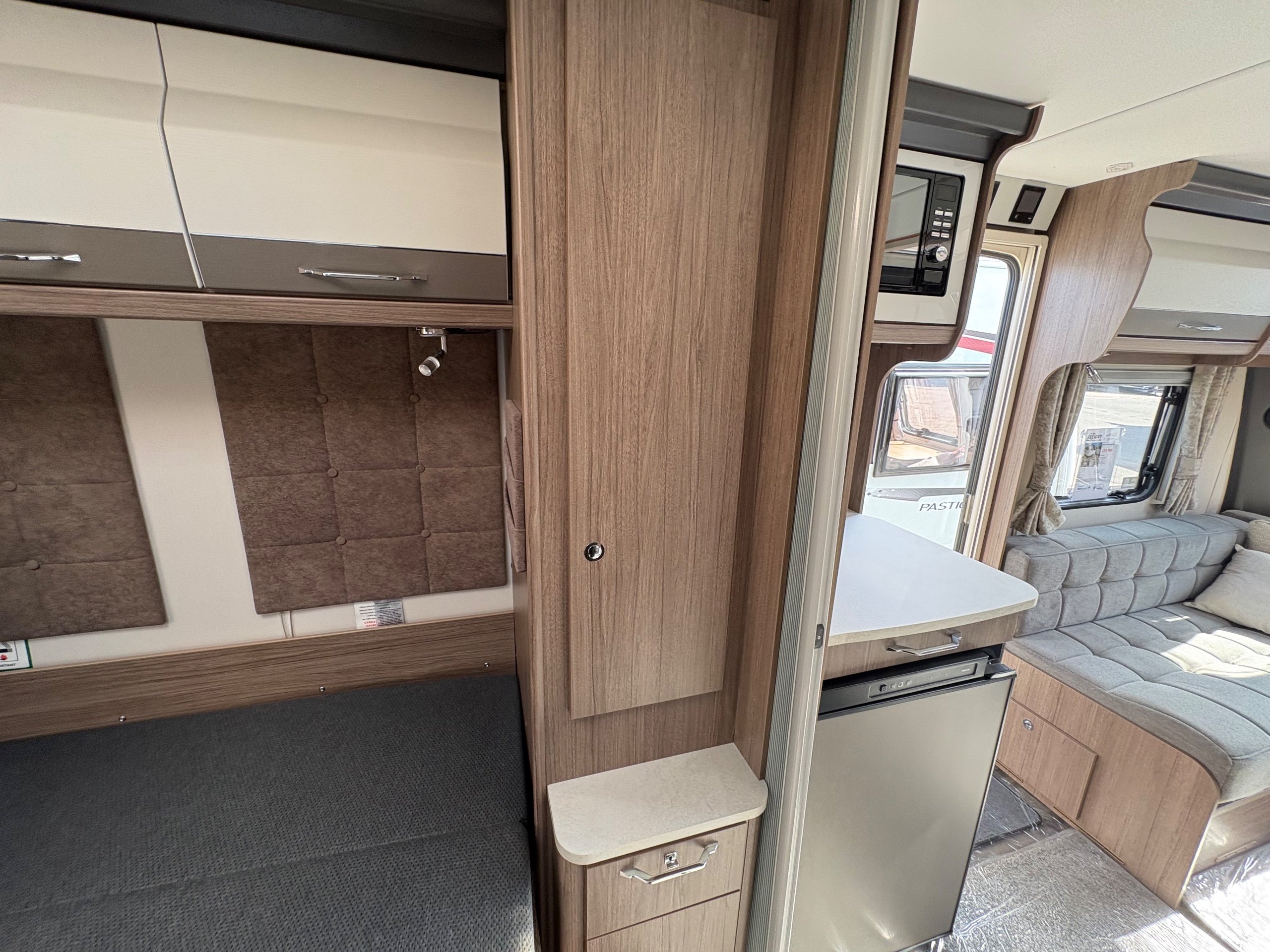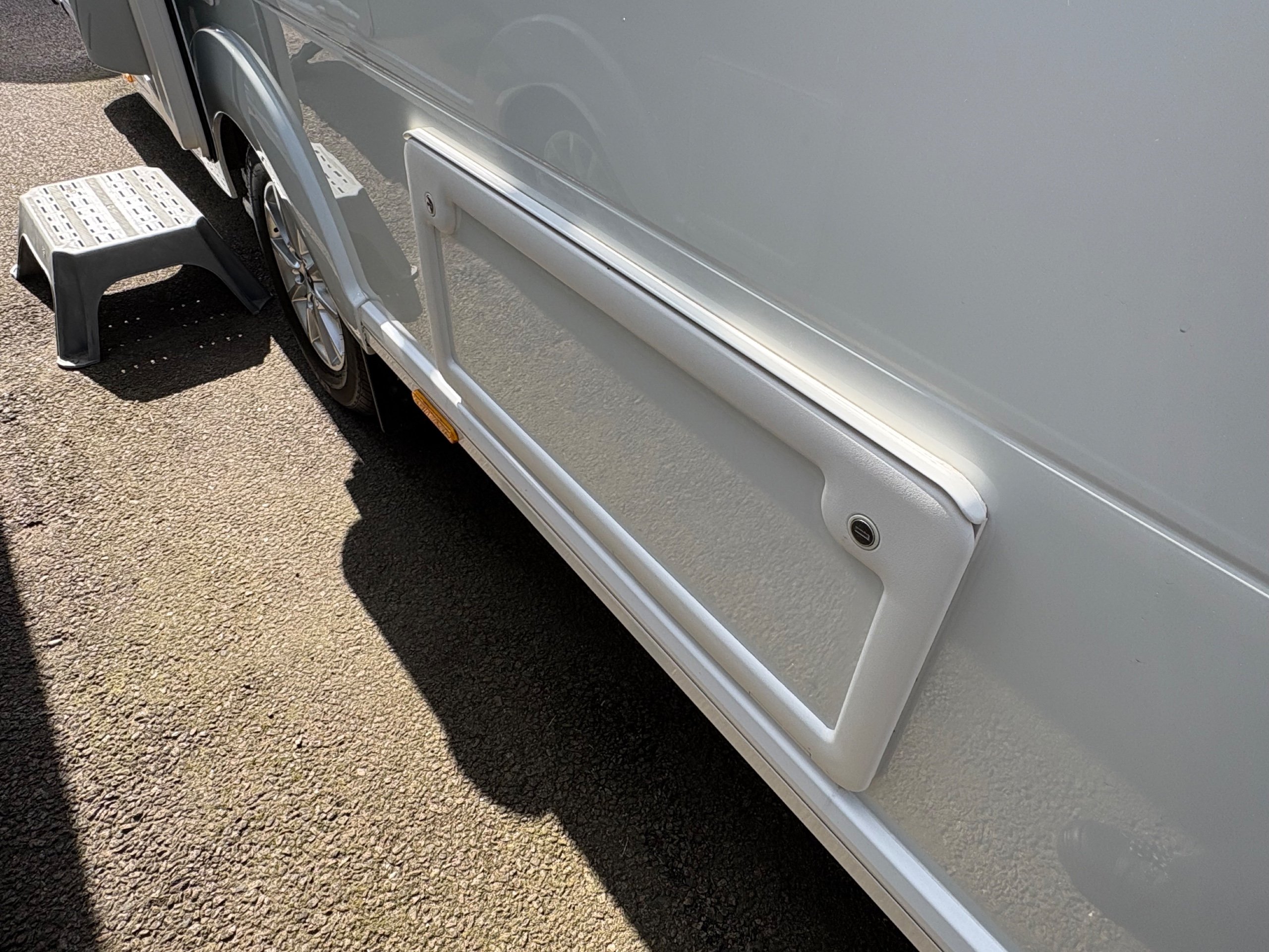 Year: 2024, Berth: 4, Internal length: 5.80m / 19', External length: 7.43m / 24'5", Width: 7'7", Unladen weight: 1504kg, MTPLM: 1700kg, Awning size:10.34m, Warranty: Balance of manufacturers warranty ( subject to terms and conditions ). One of the most successful transverse double bed, end washroom caravans. The Vip has a slightly wider body width of 7'7", which helps to get around the double bed when extended, and for more space in the front lounge. The powered caravan mover fitted to this model, make sit easier to move around at home, storage or when away on site. Alde heating, alko atc braking, alko wheel locks, external gas and mains points, alarm or just some of the features fitted on this model. -