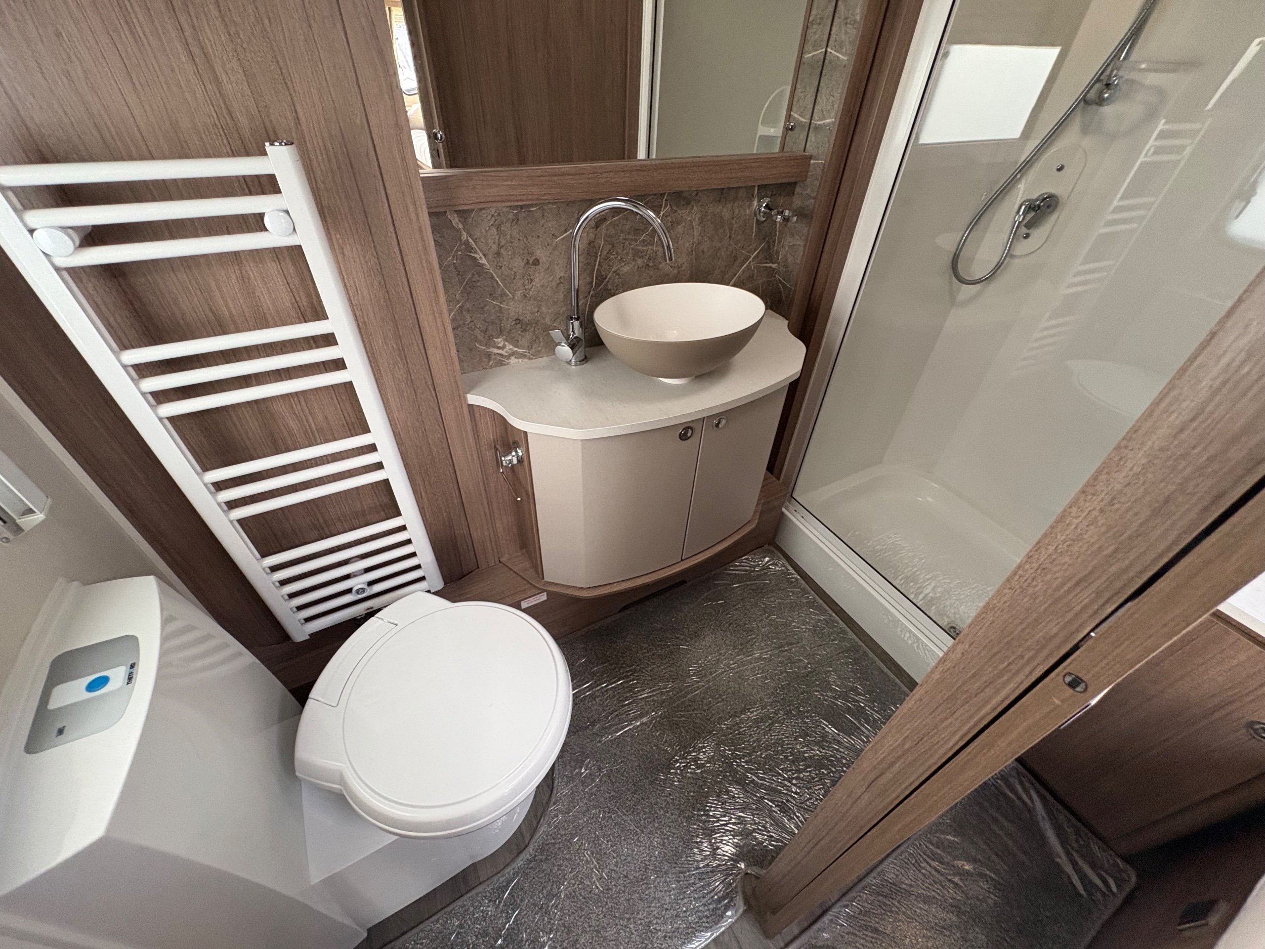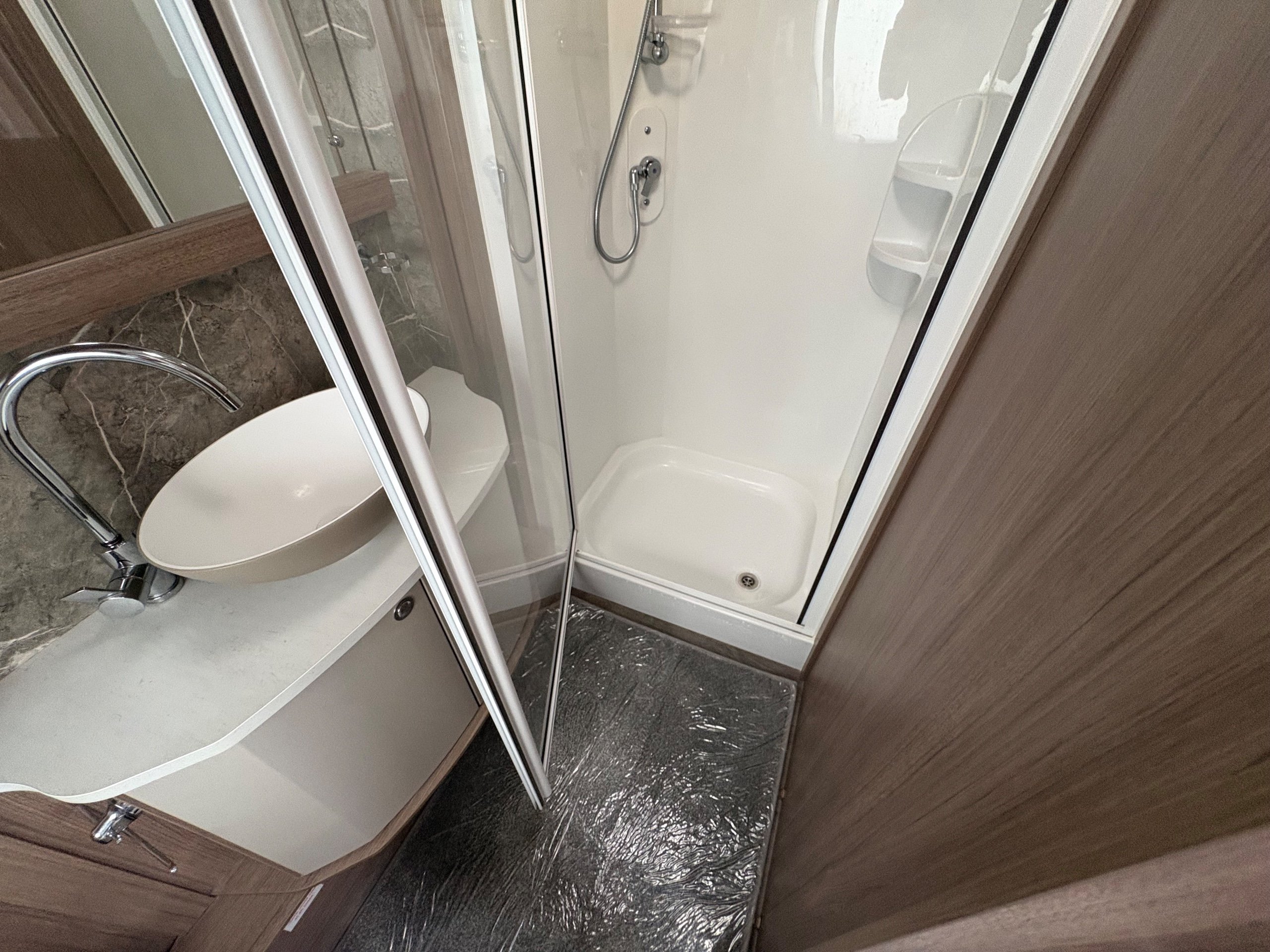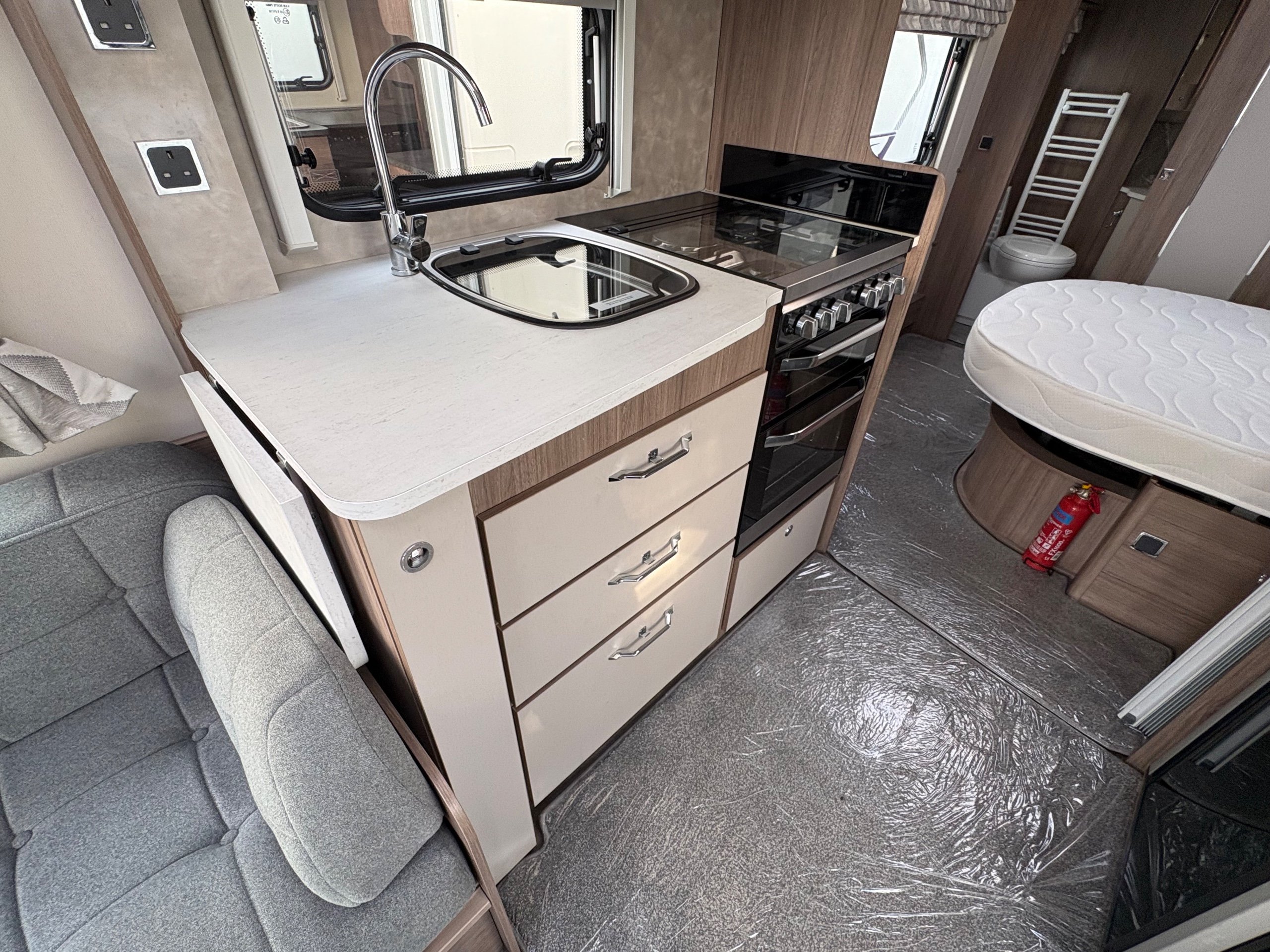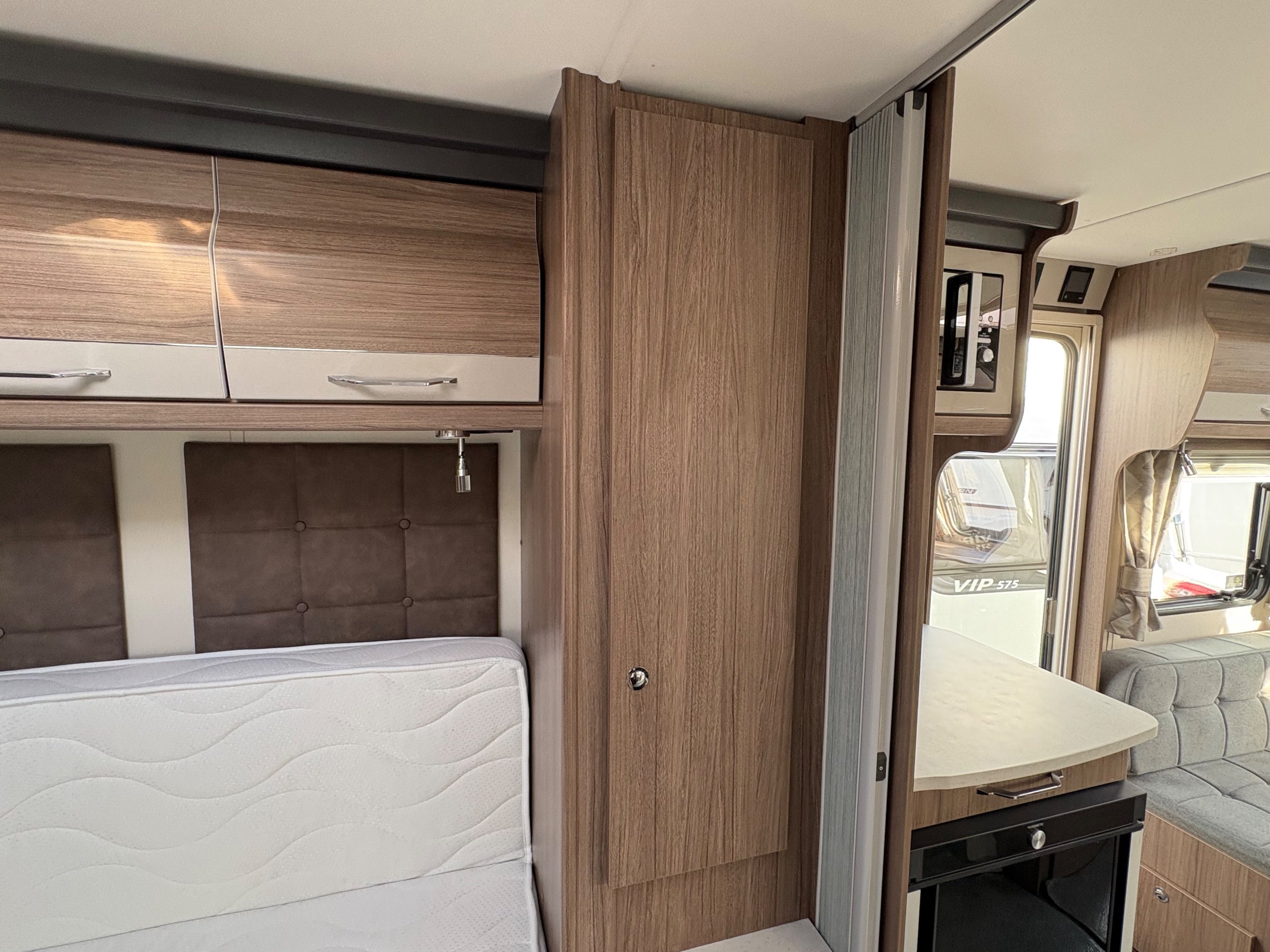 Year: 2022, Berth: 4, Internal length: 5.80m / 19', External length: 7.43m / 24'5", Width: 2.31m / 7'7", Unladen weight: 1502kg, MTPLM: 1700kg, Awning size: 10.14m, Warranty: 12 months. One of the most successful models of recent times , Vip 575 has a width of 7'7", a transverse double bed and a good sized end washroom. Alde heating , ATC braking, alko secure wheel locks are only some of the features that come with this model as standard. The powered caravan mover fitted will make it easier to move this caravan around, either at home, on site or in storage. The front sunroof and large windows flood the front of this caravan with light, perfect for relaxing and enjoying your break. -