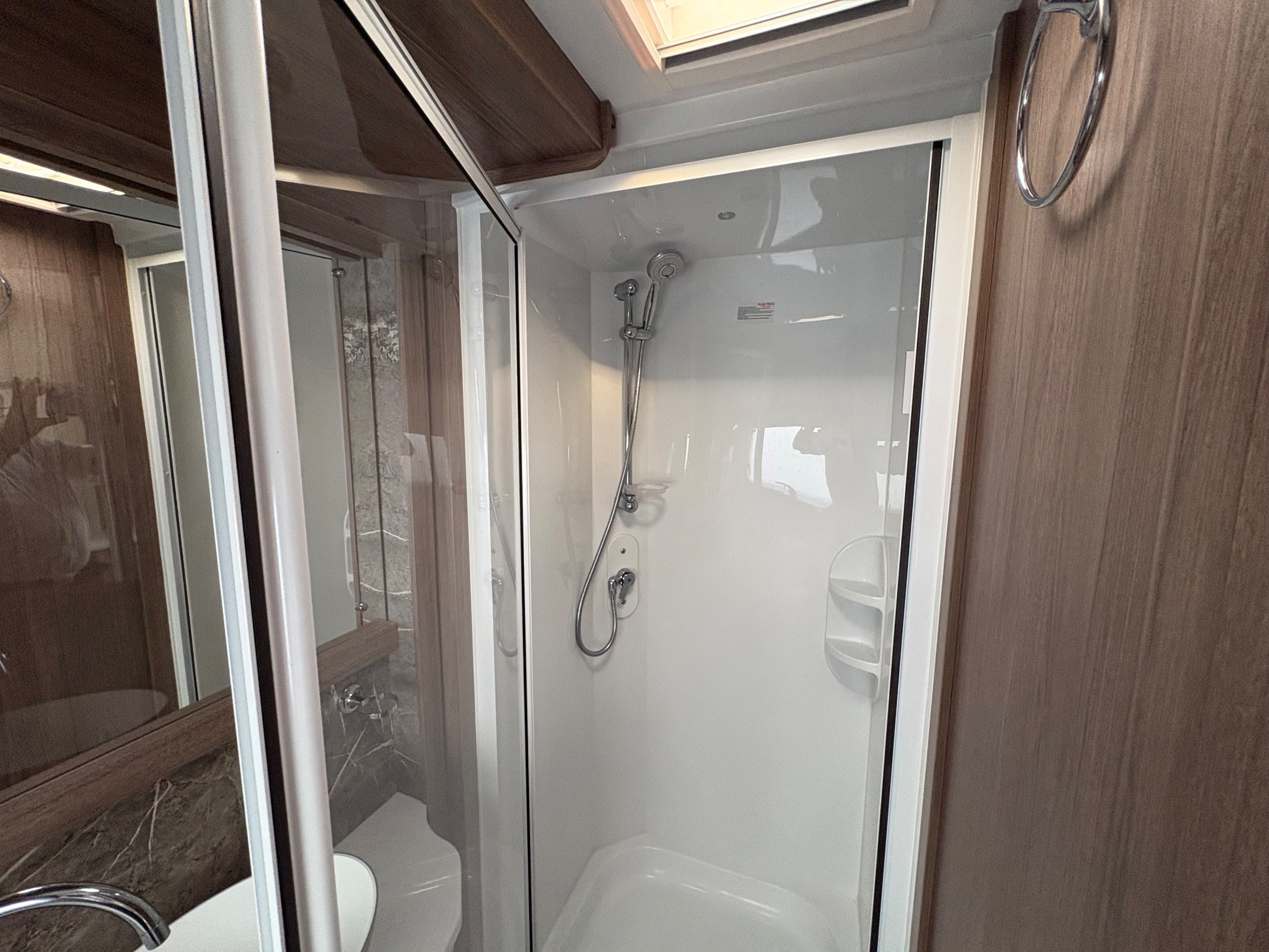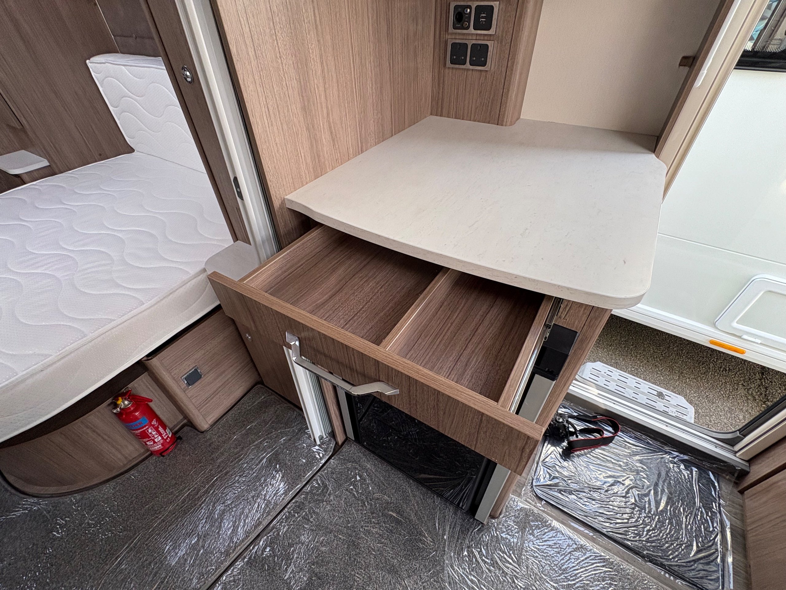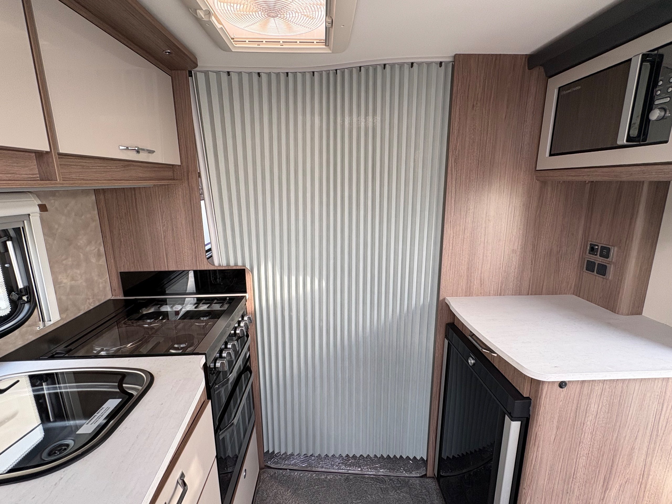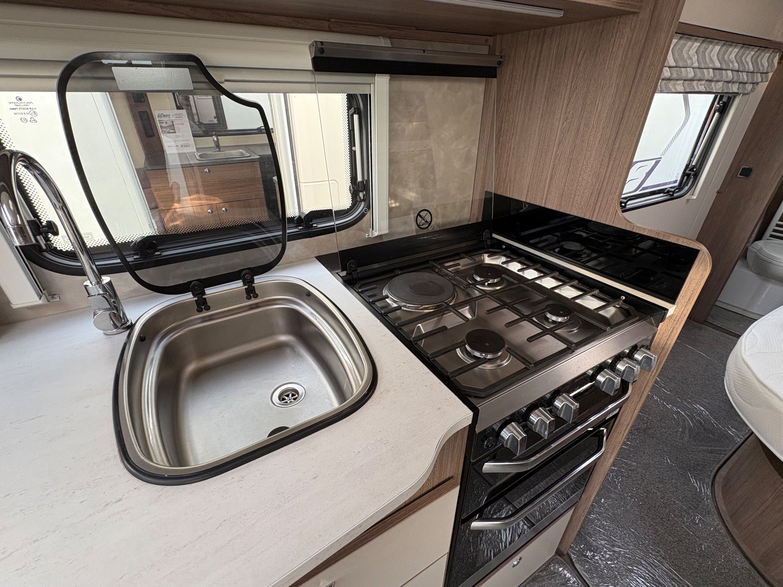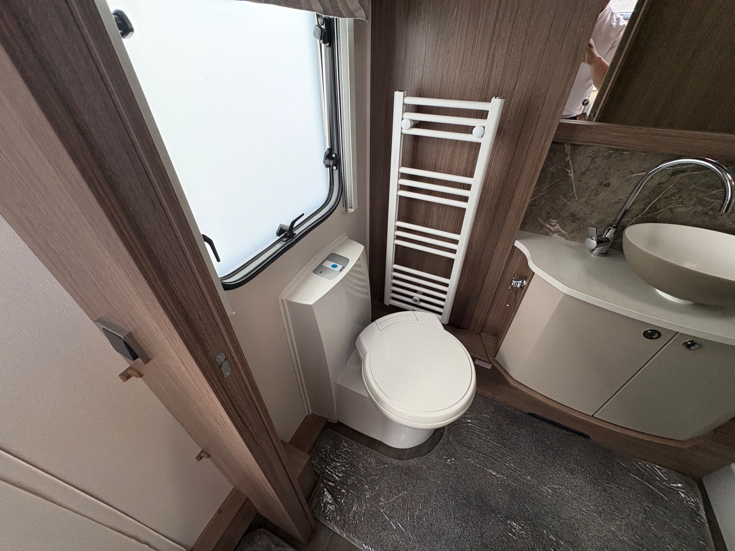Year: 2022, Berth: 4, Internal length: 5.80m / 19', External length: 7.43m / 24'5", Width: 2.31m / 7'7", Unladen weight: 1502kg, MTPLM: 1700kg, Awning size: 10.14m, Warranty: 12 months. One of the most successful models of recent times , Vip 575 has a width of 7'7", a transverse double bed and a good sized end washroom. Alde heating , ATC braking, alko secure wheel locks are only some of the features that come with this model as standard. The powered caravan mover fitted will make it easier to move this caravan around, either at home, on site or in storage. The front sunroof and large windows flood the front of this caravan with light, perfect for relaxing and enjoying your break. -