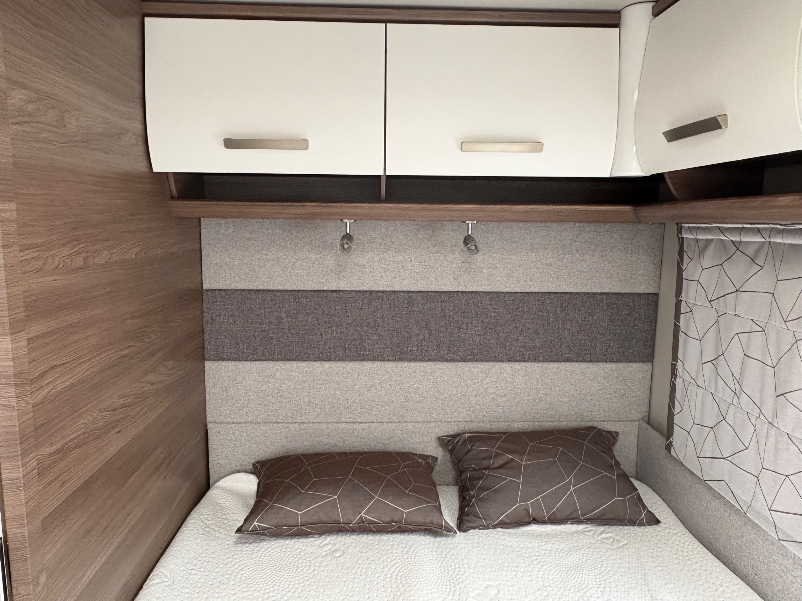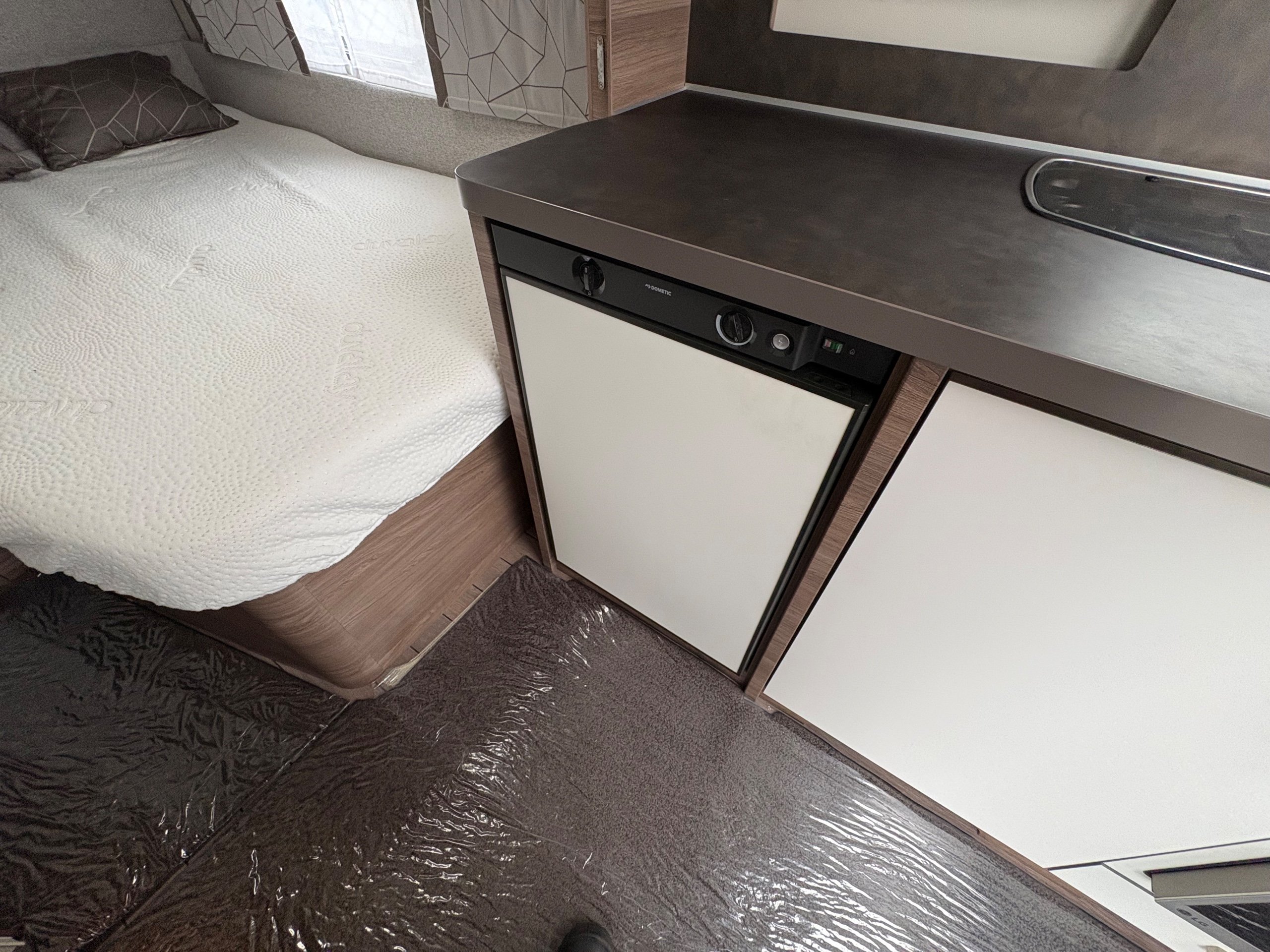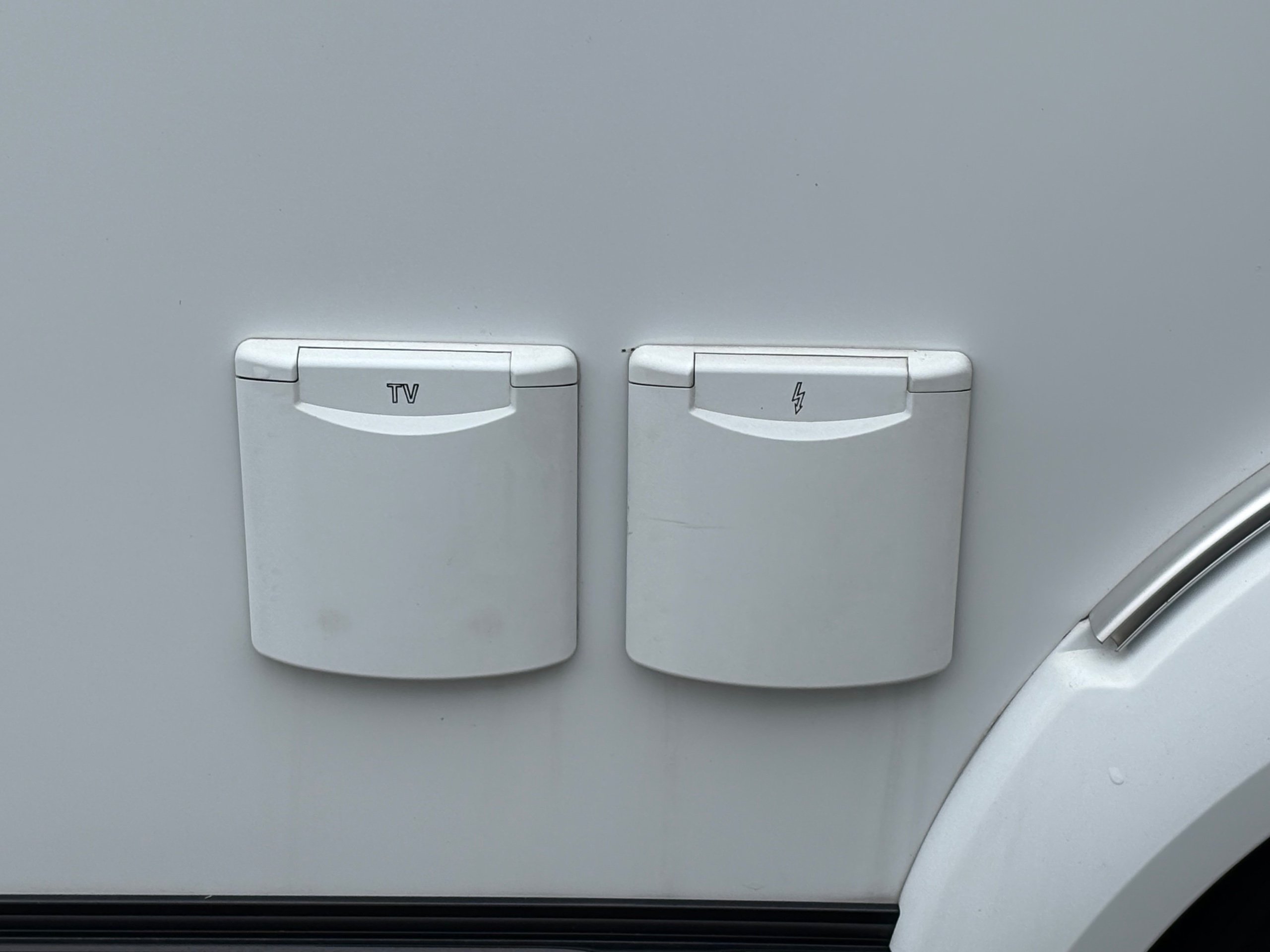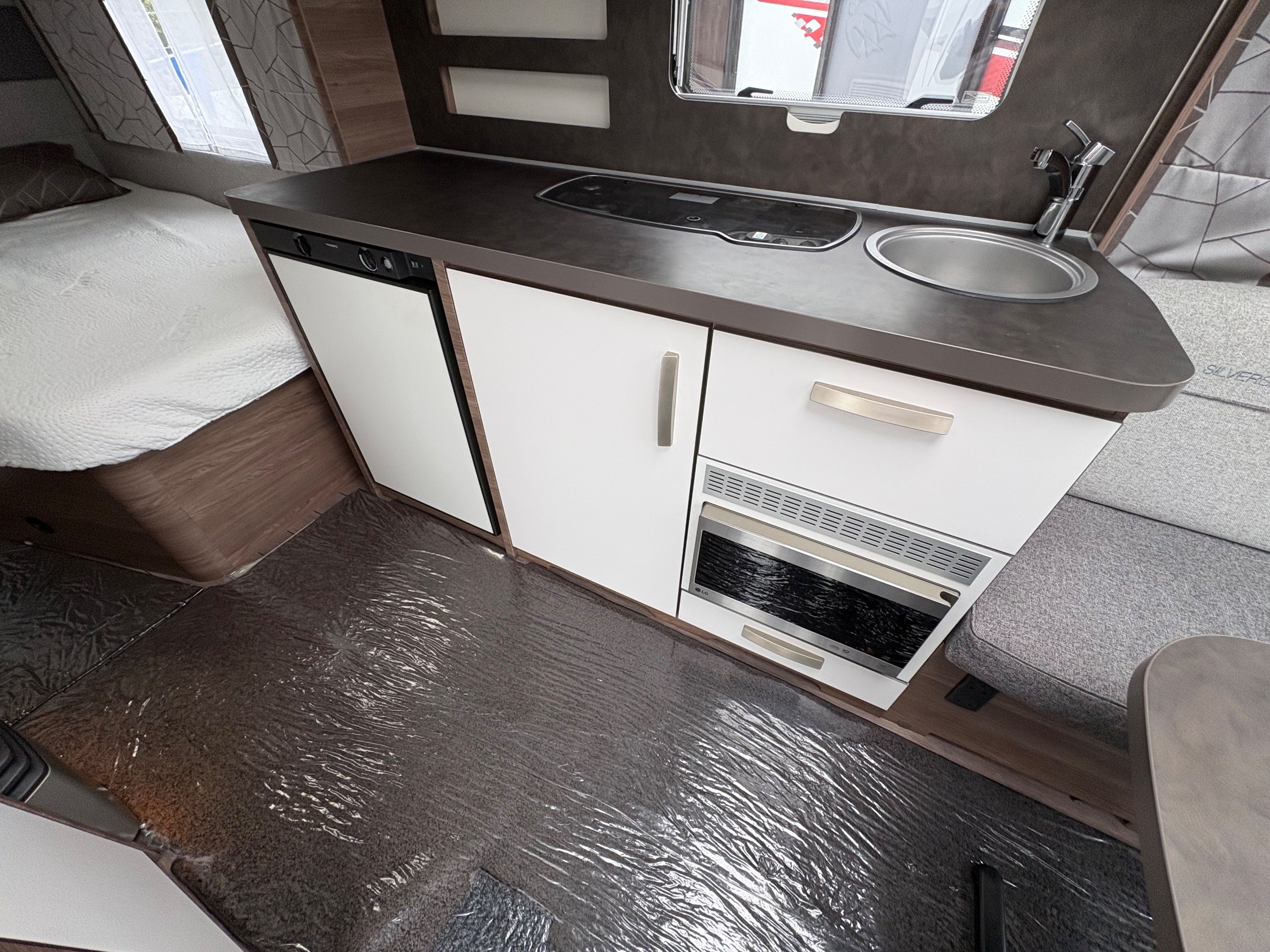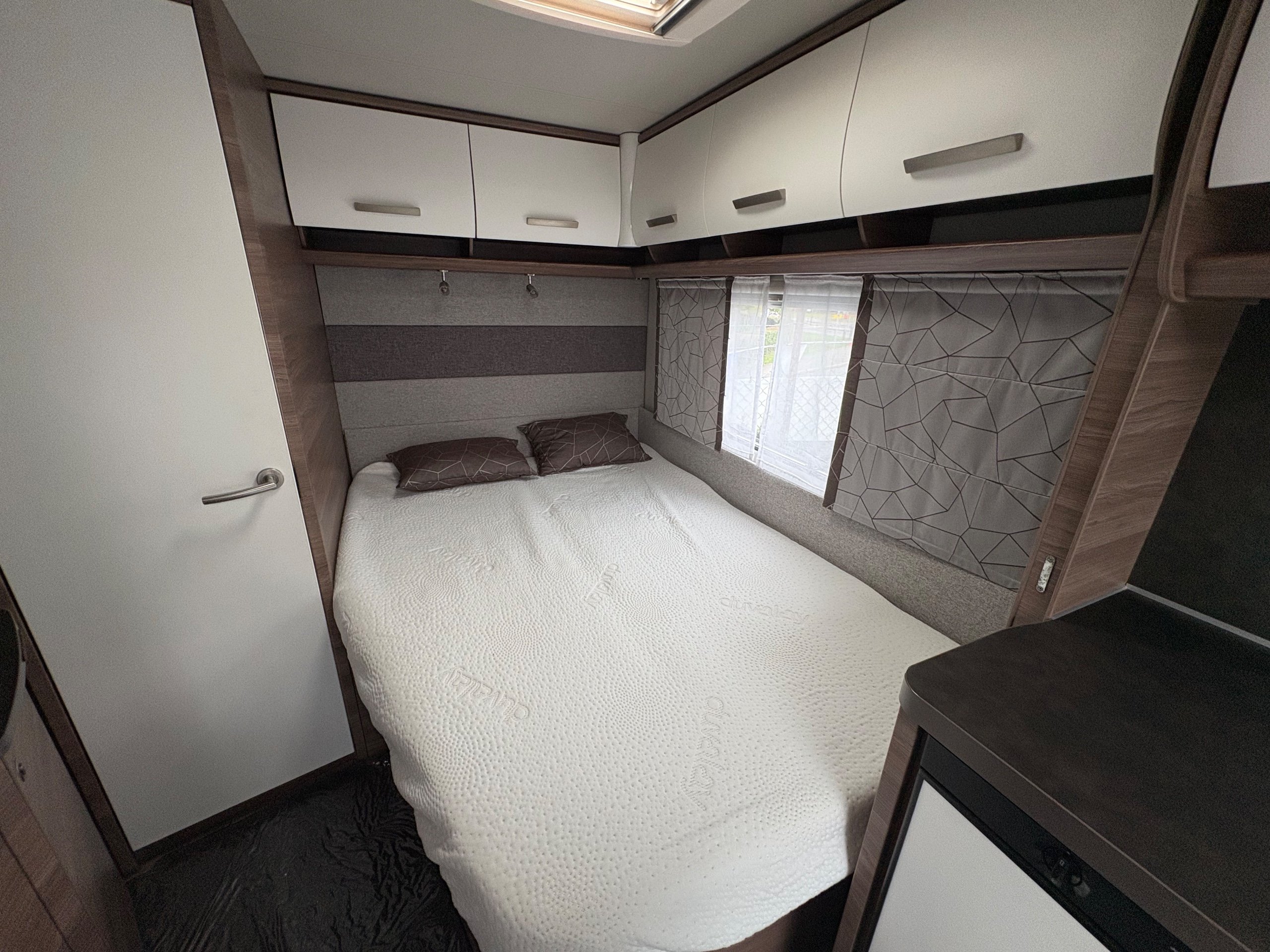 Year: 2019, Berth: 4, Internal length: 5.32m / 17'4", External length: 7.31m / 23'9", Width: 2.32m / 7'6", Unladen weight: 1170kg, MTPLM: 1500kg, Awning size: 9.60m, Warranty: 12 months. This fixed bed caravan is continental specification so the door is on the off side not the near side. This model is designed for running from a mains hook up, with the leisure battery solely for the caravan mover and the water pump. A gas space heater is fitted along with a three burner gas hob and a three way fridge, while the hot water and microwave are purely mains. This caravan also has a caravan mover fitted to it, and also comes with both a storage cover and a Kampa air awning. The fixed double bed is at the rear while the wrap around front seats, make into another generous double bed. -