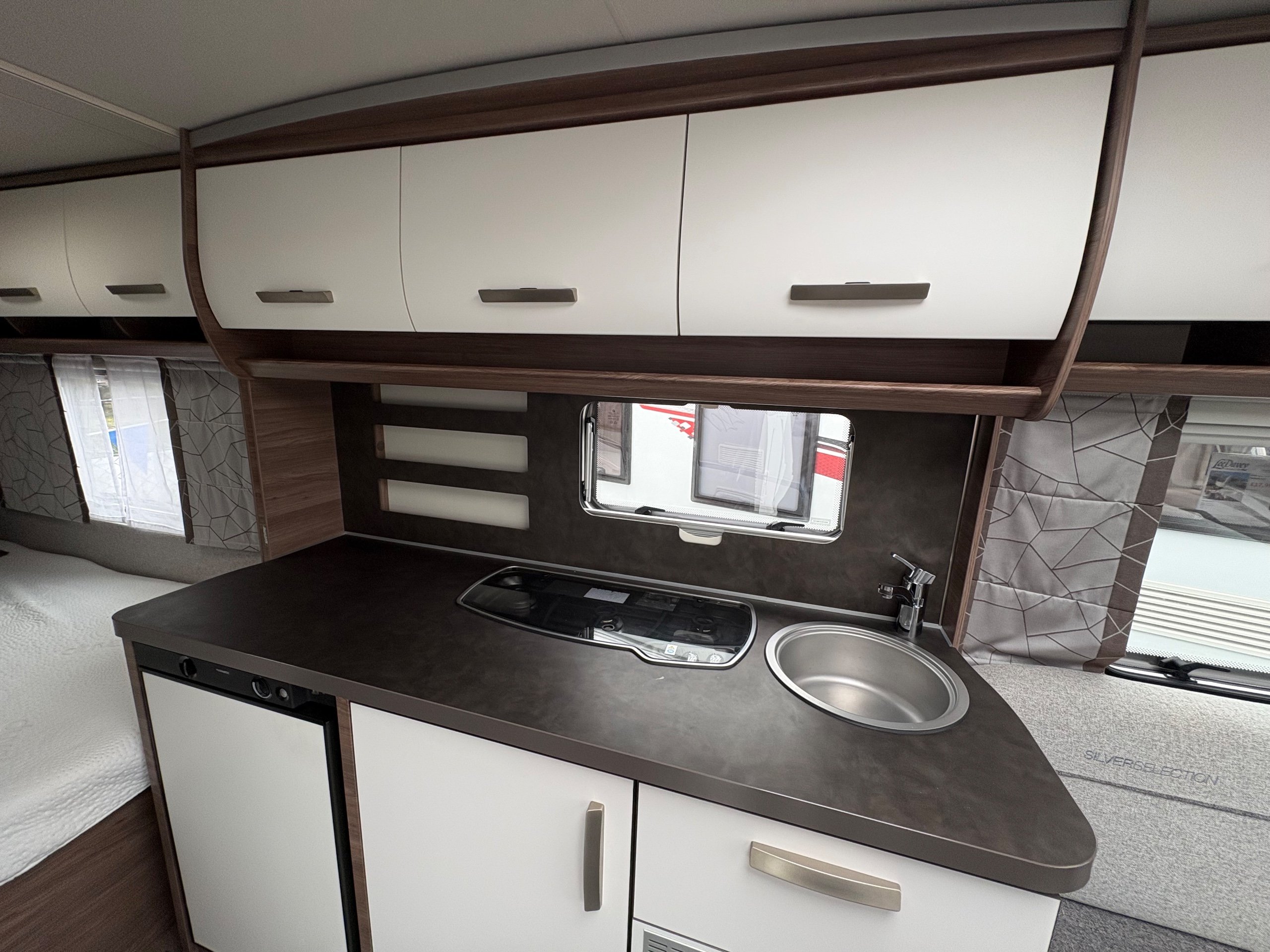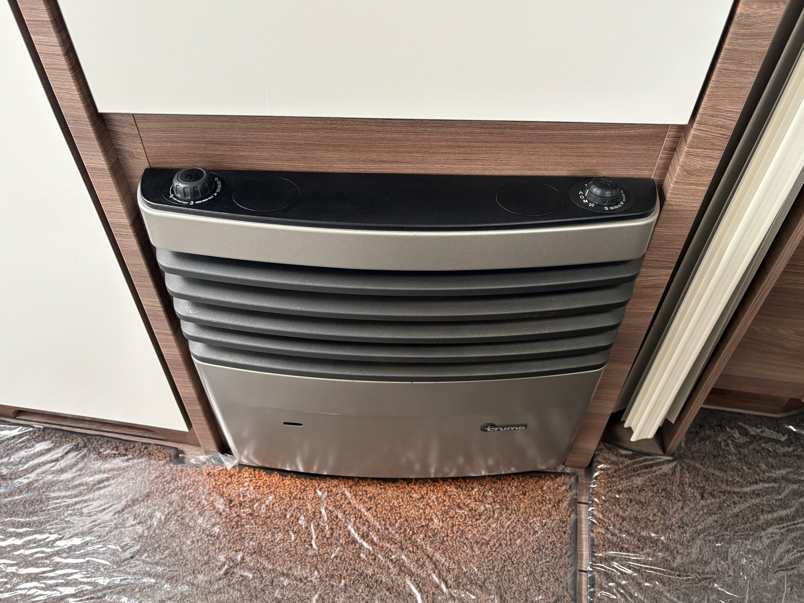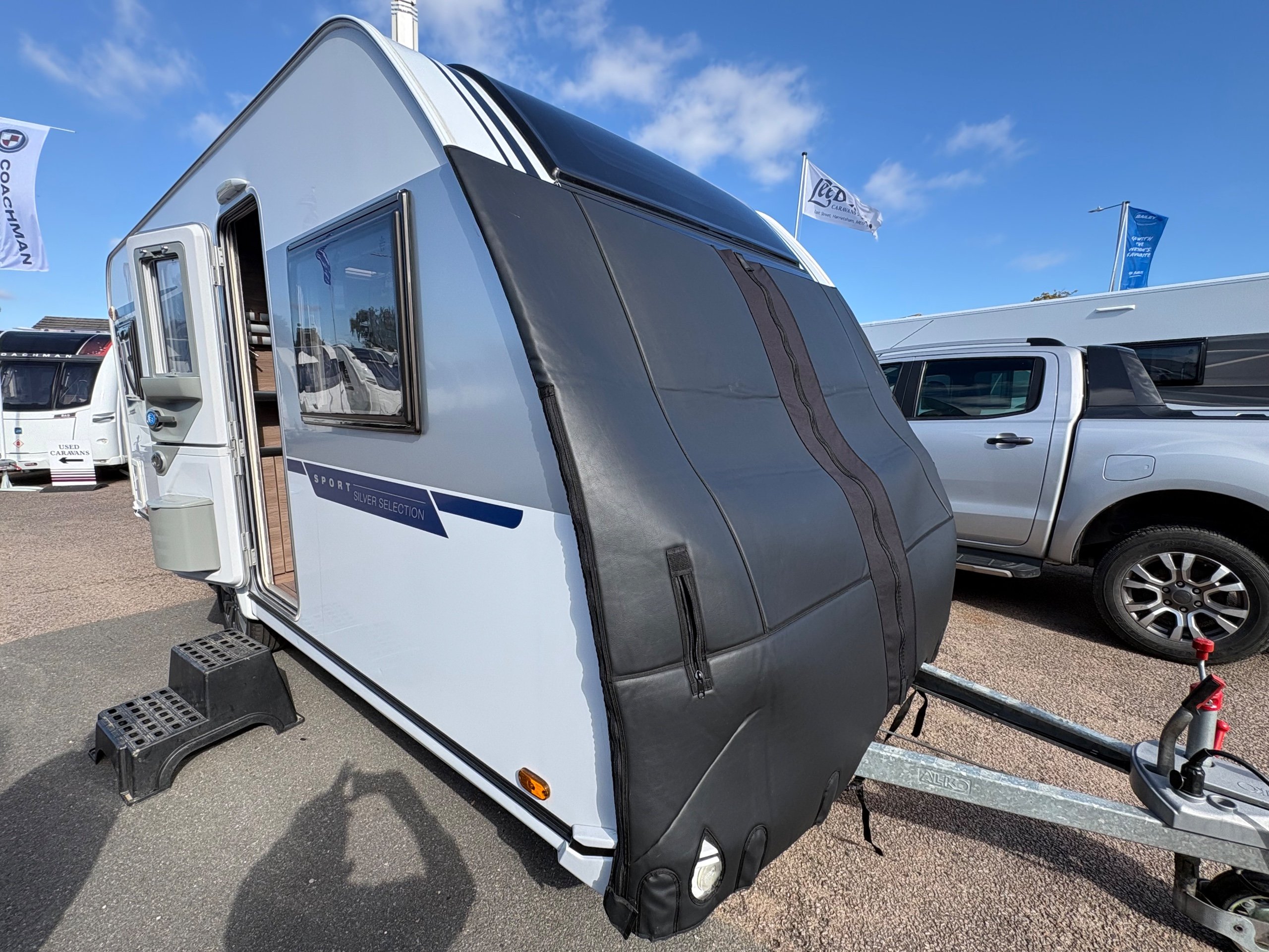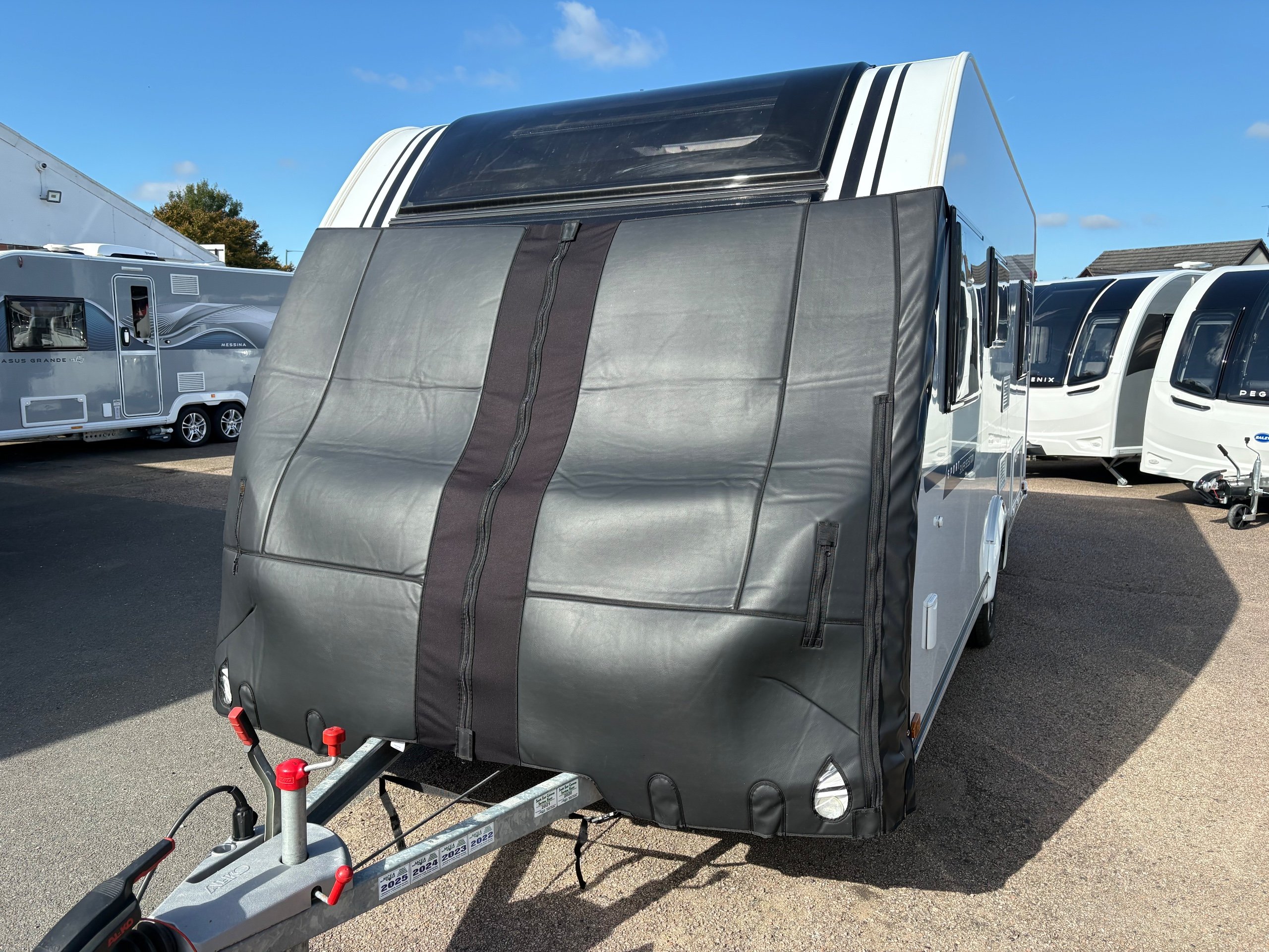 Year: 2019, Berth: 4, Internal length: 5.32m / 17'4", External length: 7.31m / 23'9", Width: 2.32m / 7'6", Unladen weight: 1170kg, MTPLM: 1500kg, Awning size: 9.60m, Warranty: 12 months. This fixed bed caravan is continental specification so the door is on the off side not the near side. This model is designed for running from a mains hook up, with the leisure battery solely for the caravan mover and the water pump. A gas space heater is fitted along with a three burner gas hob and a three way fridge, while the hot water and microwave are purely mains. This caravan also has a caravan mover fitted to it, and also comes with both a storage cover and a Kampa air awning. The fixed double bed is at the rear while the wrap around front seats, make into another generous double bed. -