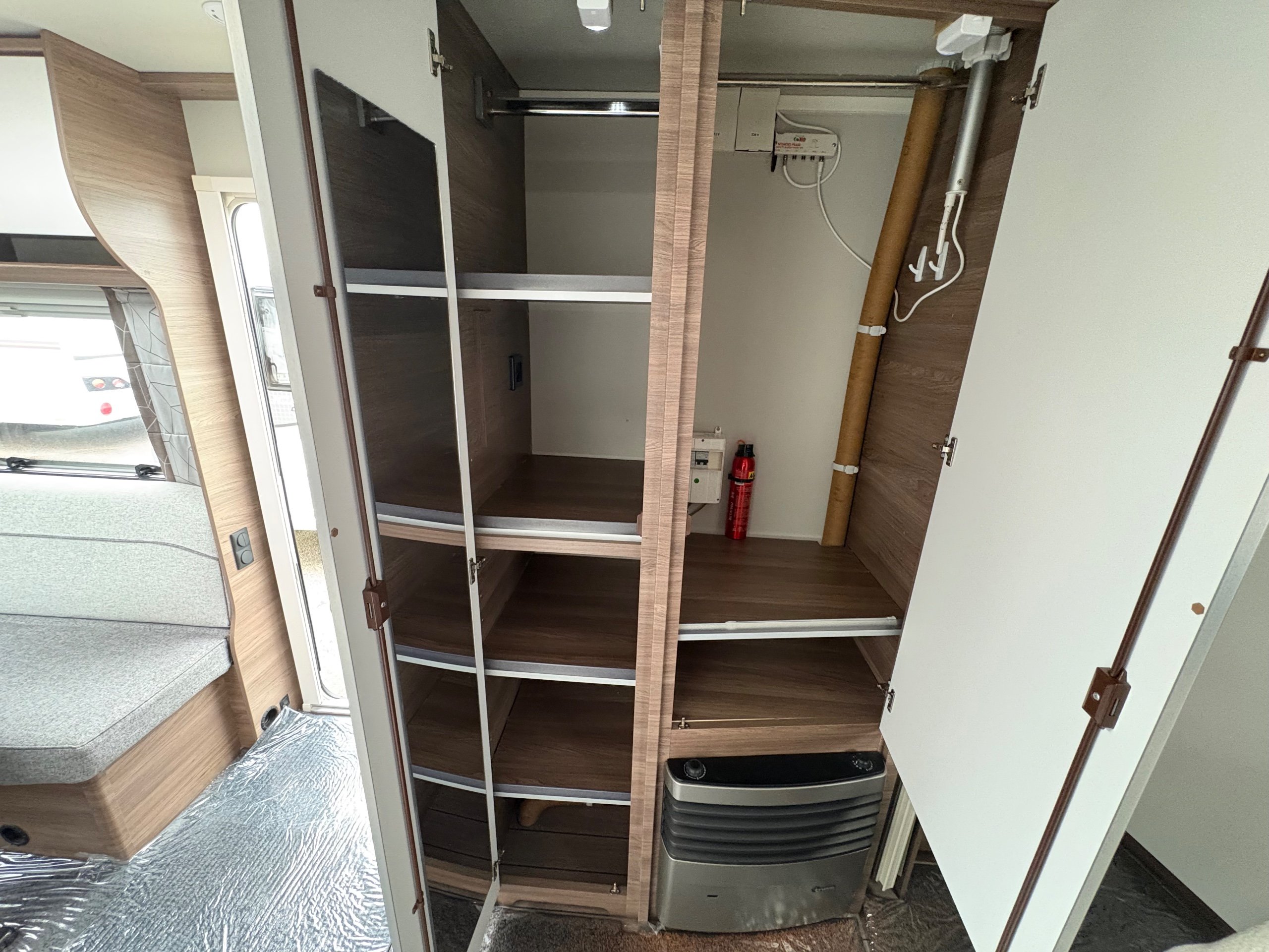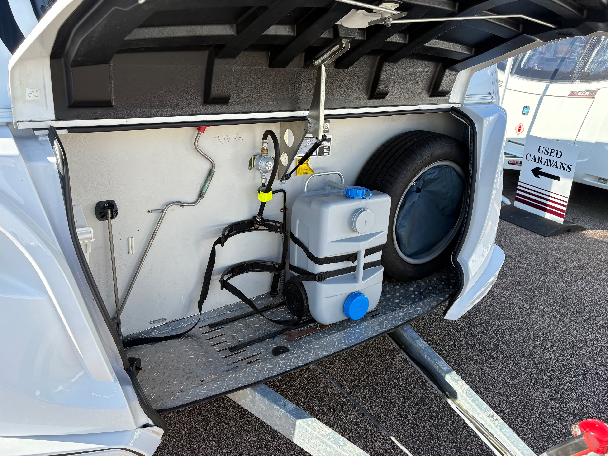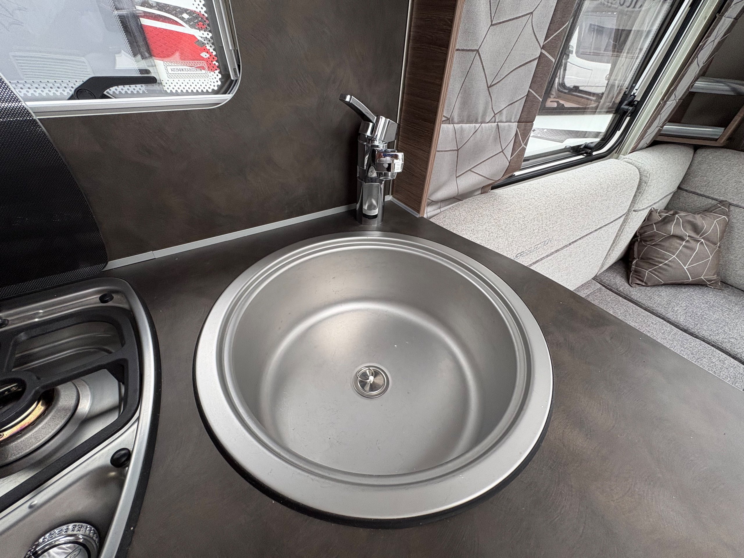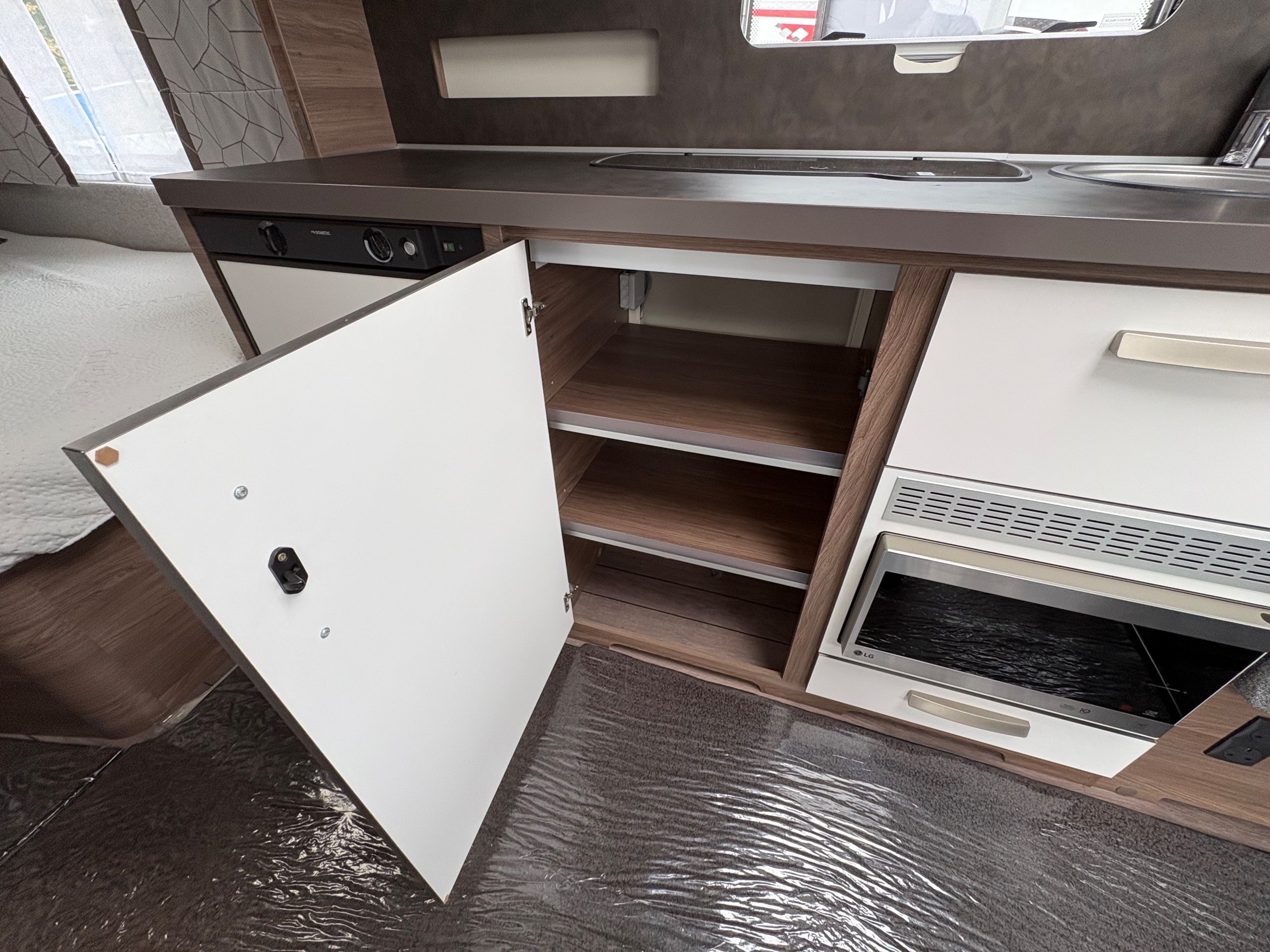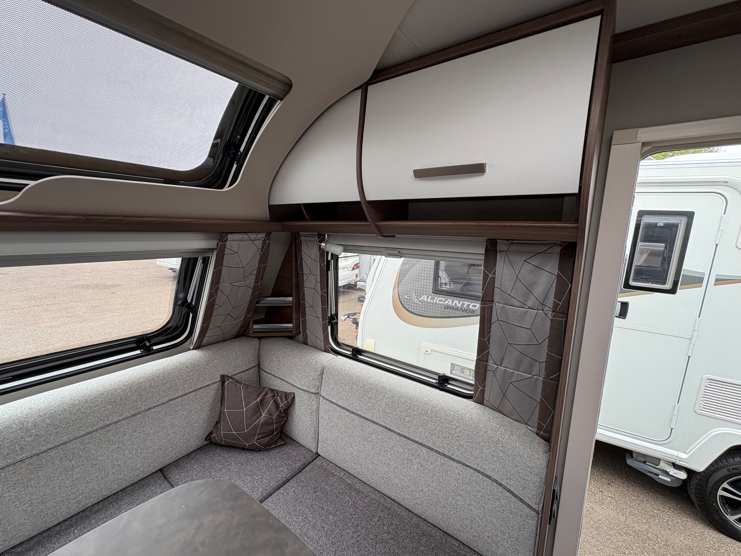 Year: 2019, Berth: 4, Internal length: 5.32m / 17'4", External length: 7.31m / 23'9", Width: 2.32m / 7'6", Unladen weight: 1170kg, MTPLM: 1500kg, Awning size: 9.60m, Warranty: 12 months. This fixed bed caravan is continental specification so the door is on the off side not the near side. This model is designed for running from a mains hook up, with the leisure battery solely for the caravan mover and the water pump. A gas space heater is fitted along with a three burner gas hob and a three way fridge, while the hot water and microwave are purely mains. This caravan also has a caravan mover fitted to it, and also comes with both a storage cover and a Kampa air awning. The fixed double bed is at the rear while the wrap around front seats, make into another generous double bed. -