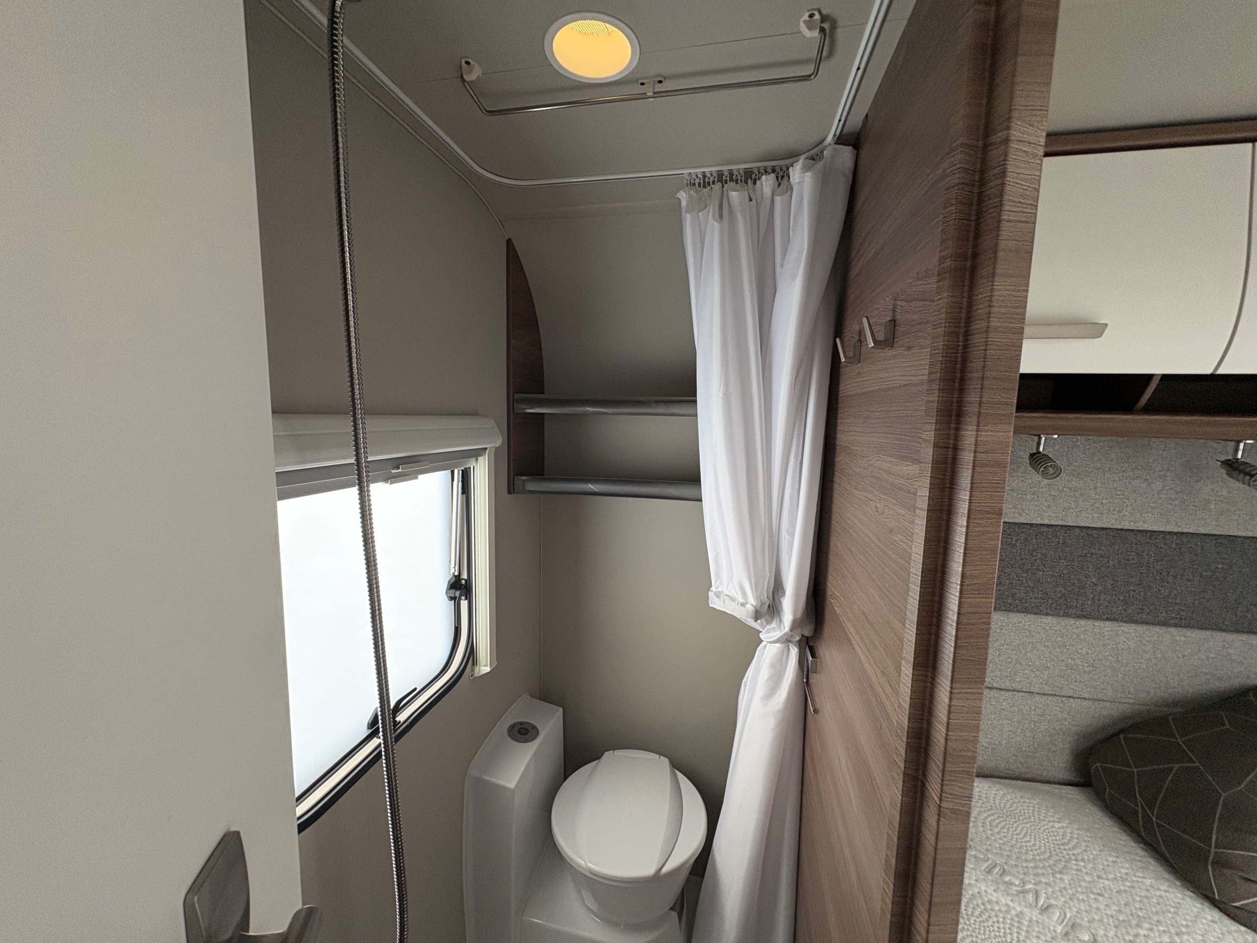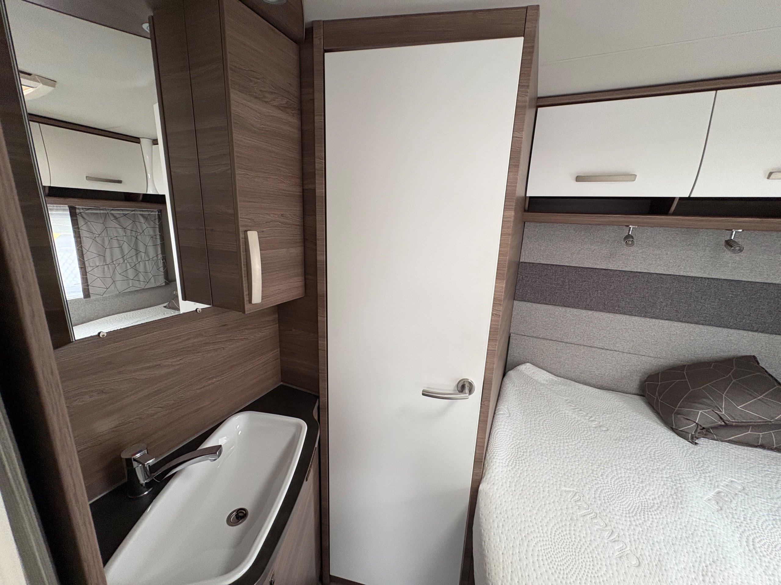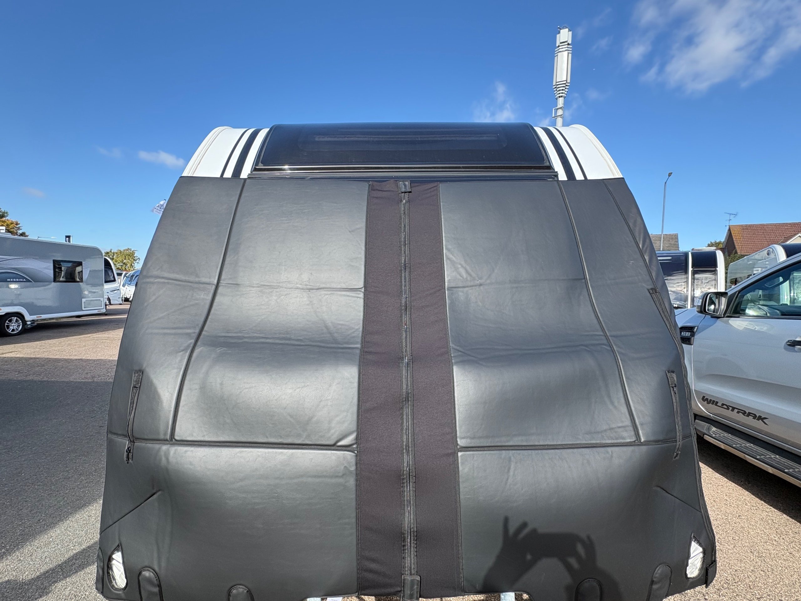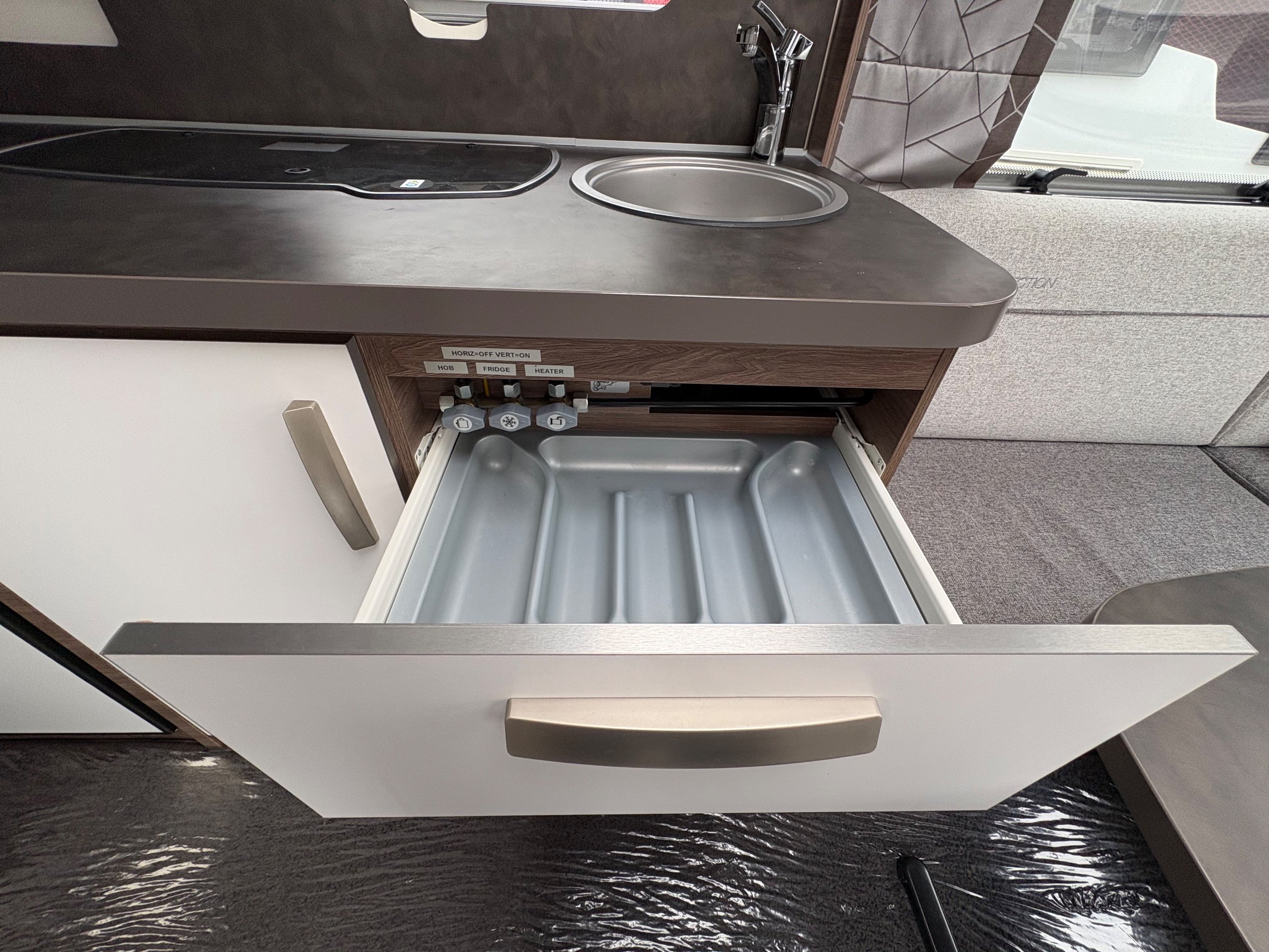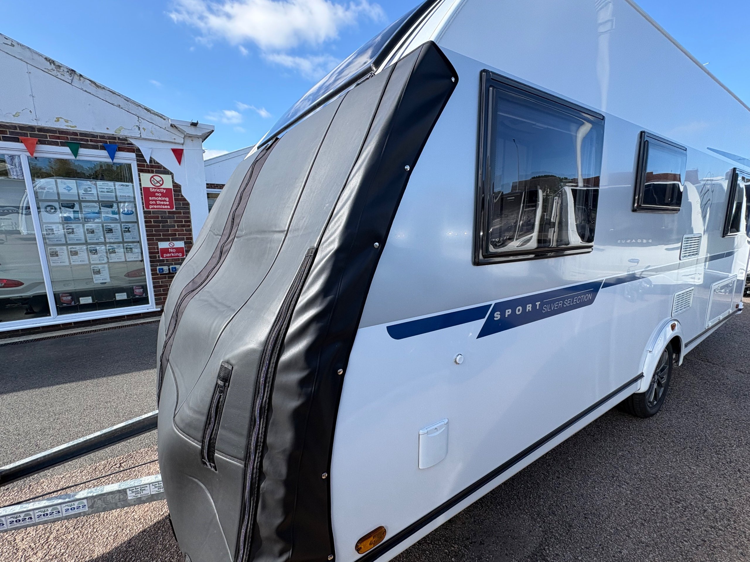 Year: 2019, Berth: 4, Internal length: 5.32m / 17'4", External length: 7.31m / 23'9", Width: 2.32m / 7'6", Unladen weight: 1170kg, MTPLM: 1500kg, Awning size: 9.60m, Warranty: 12 months. This fixed bed caravan is continental specification so the door is on the off side not the near side. This model is designed for running from a mains hook up, with the leisure battery solely for the caravan mover and the water pump. A gas space heater is fitted along with a three burner gas hob and a three way fridge, while the hot water and microwave are purely mains. This caravan also has a caravan mover fitted to it, and also comes with both a storage cover and a Kampa air awning. The fixed double bed is at the rear while the wrap around front seats, make into another generous double bed. -