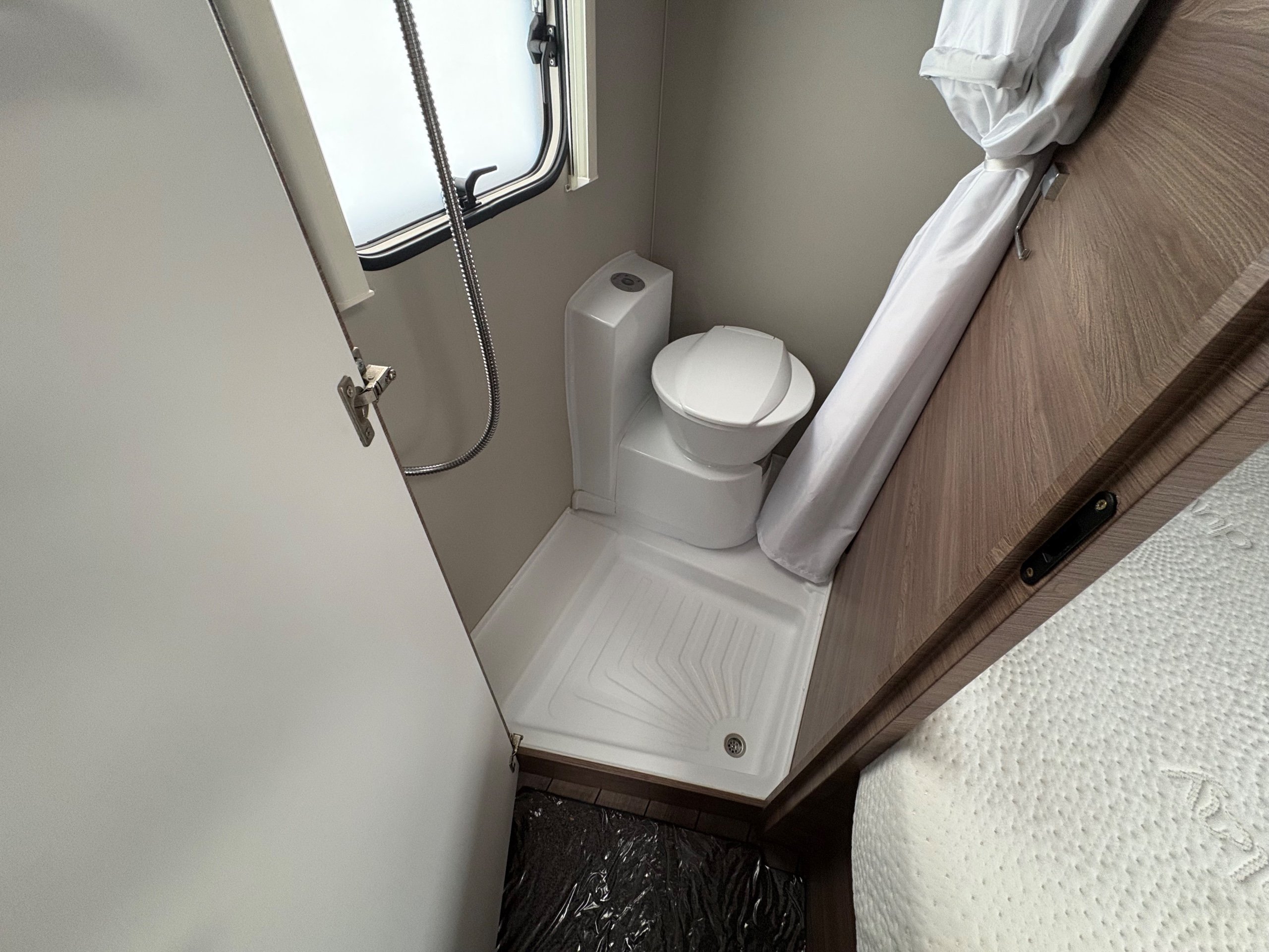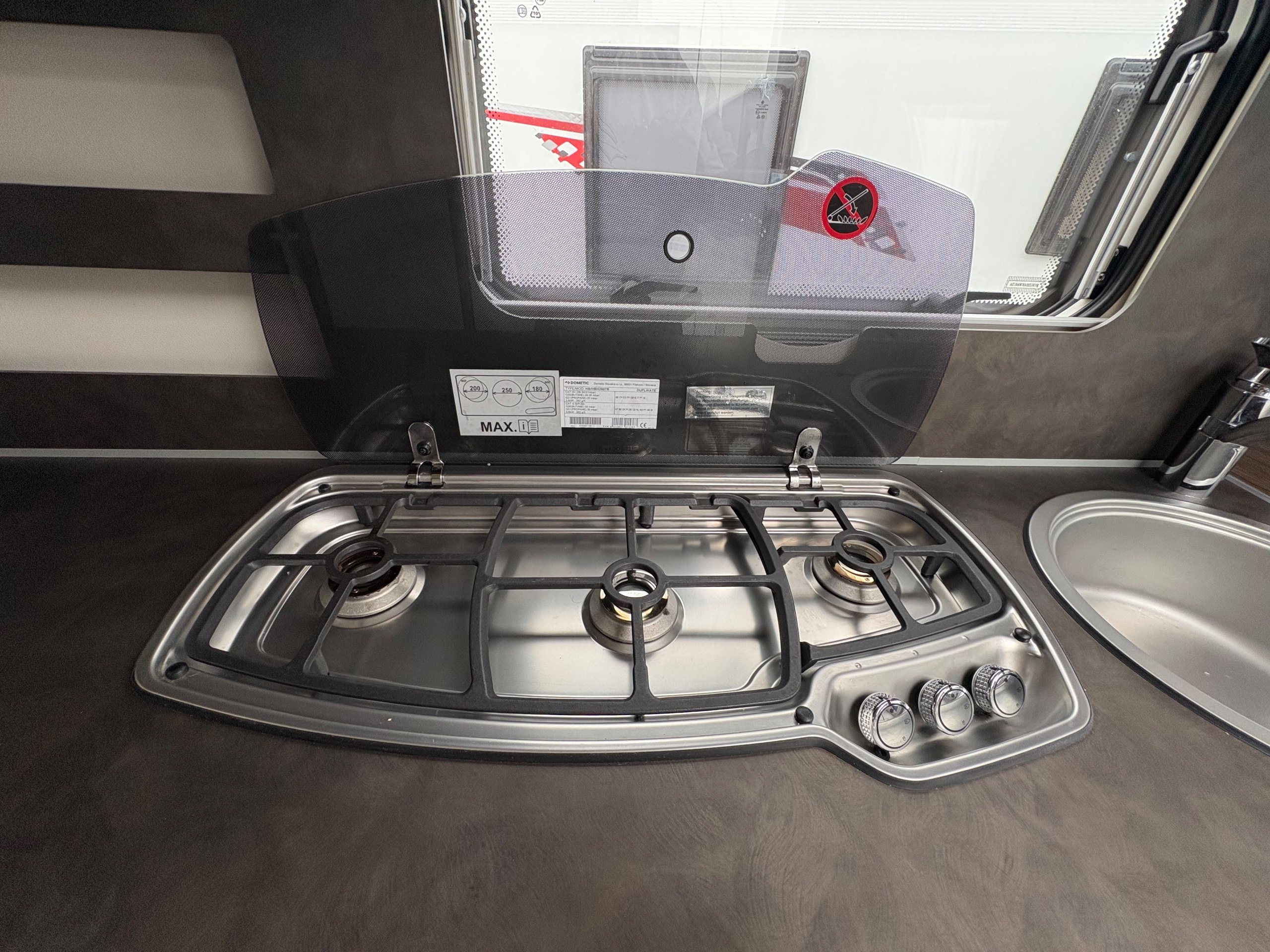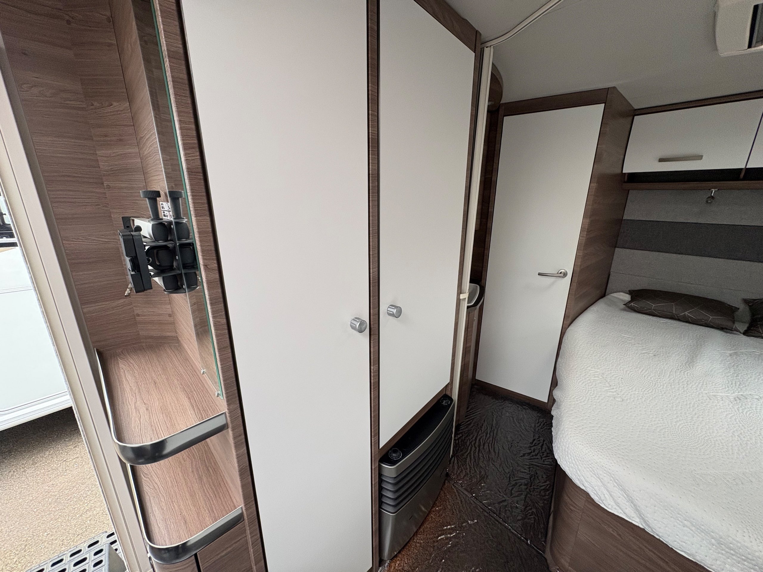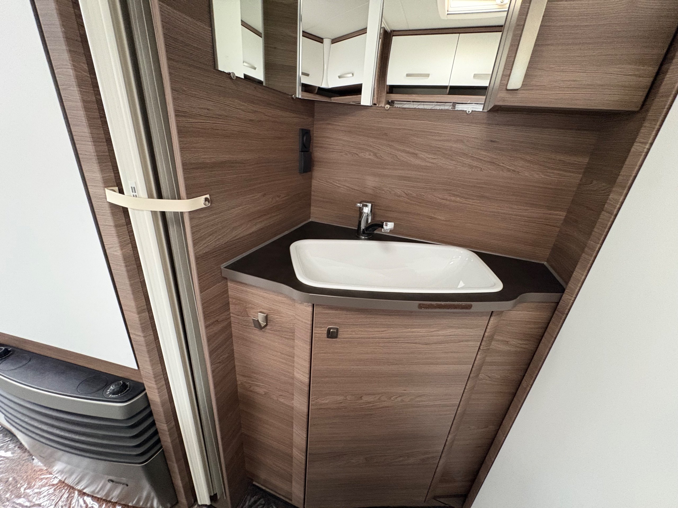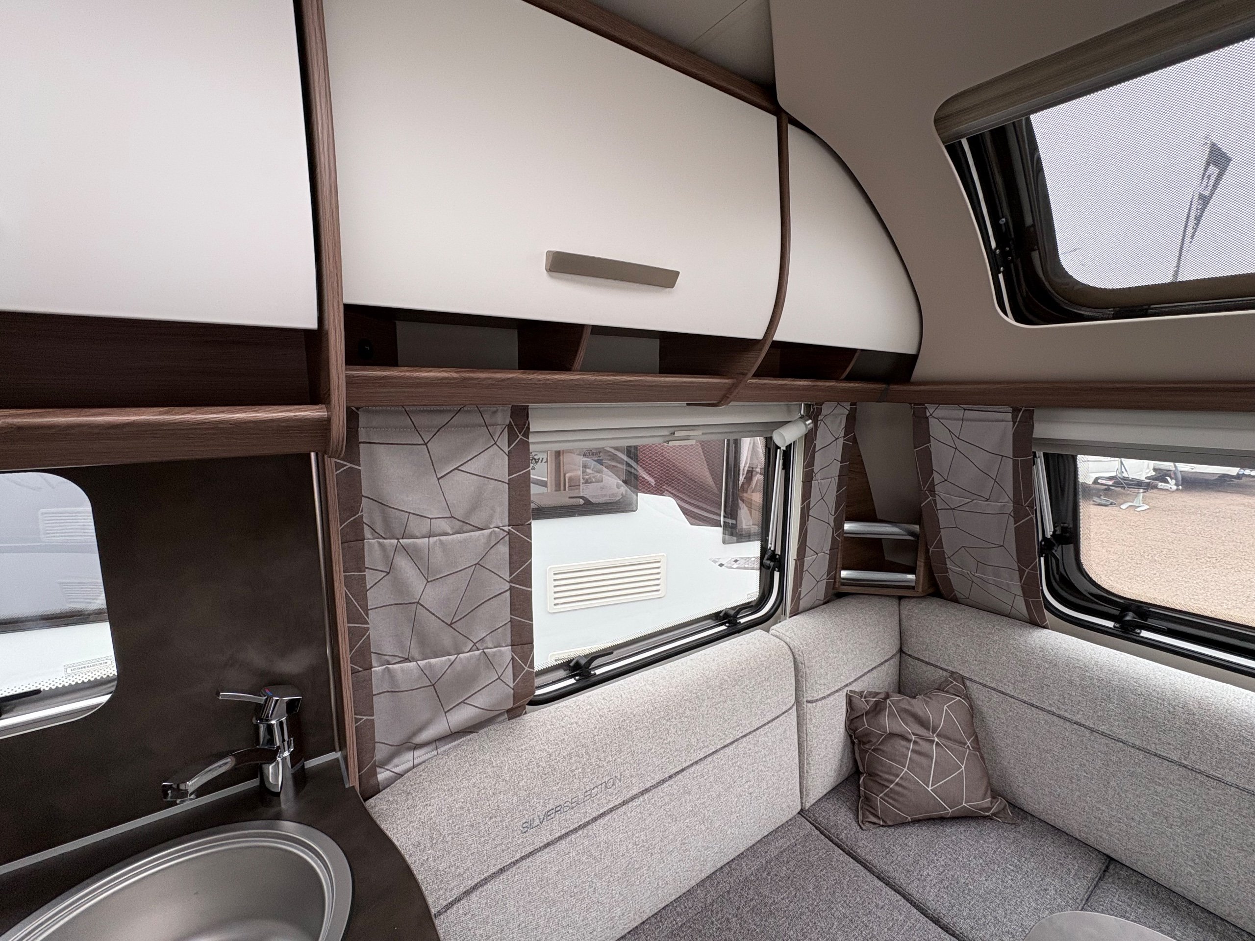 Year: 2019, Berth: 4, Internal length: 5.32m / 17'4", External length: 7.31m / 23'9", Width: 2.32m / 7'6", Unladen weight: 1170kg, MTPLM: 1500kg, Awning size: 9.60m, Warranty: 12 months. This fixed bed caravan is continental specification so the door is on the off side not the near side. This model is designed for running from a mains hook up, with the leisure battery solely for the caravan mover and the water pump. A gas space heater is fitted along with a three burner gas hob and a three way fridge, while the hot water and microwave are purely mains. This caravan also has a caravan mover fitted to it, and also comes with both a storage cover and a Kampa air awning. The fixed double bed is at the rear while the wrap around front seats, make into another generous double bed. -