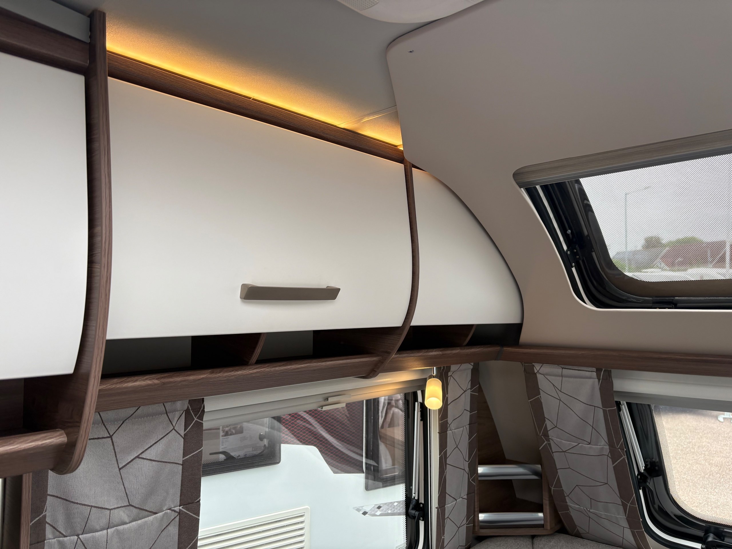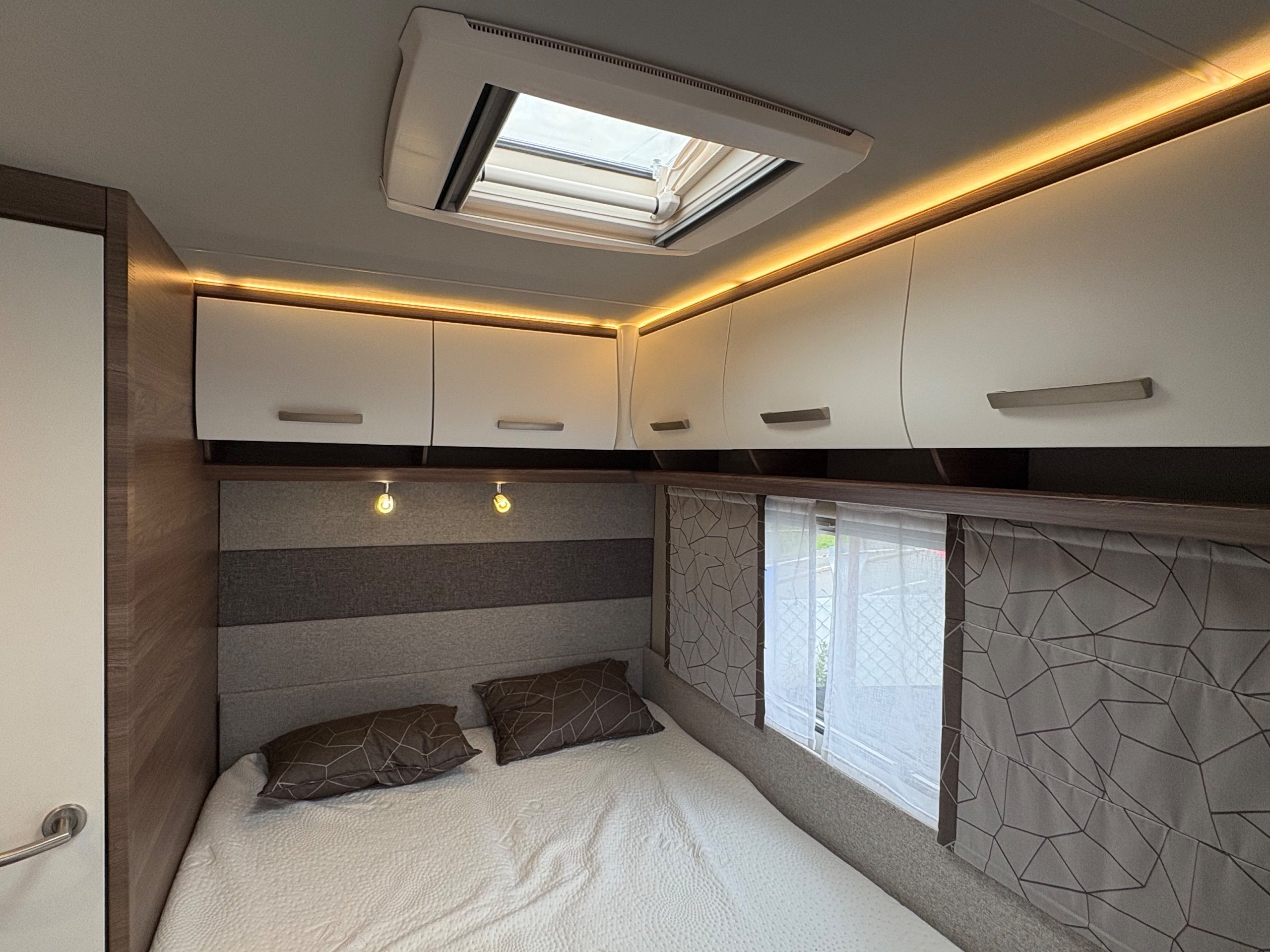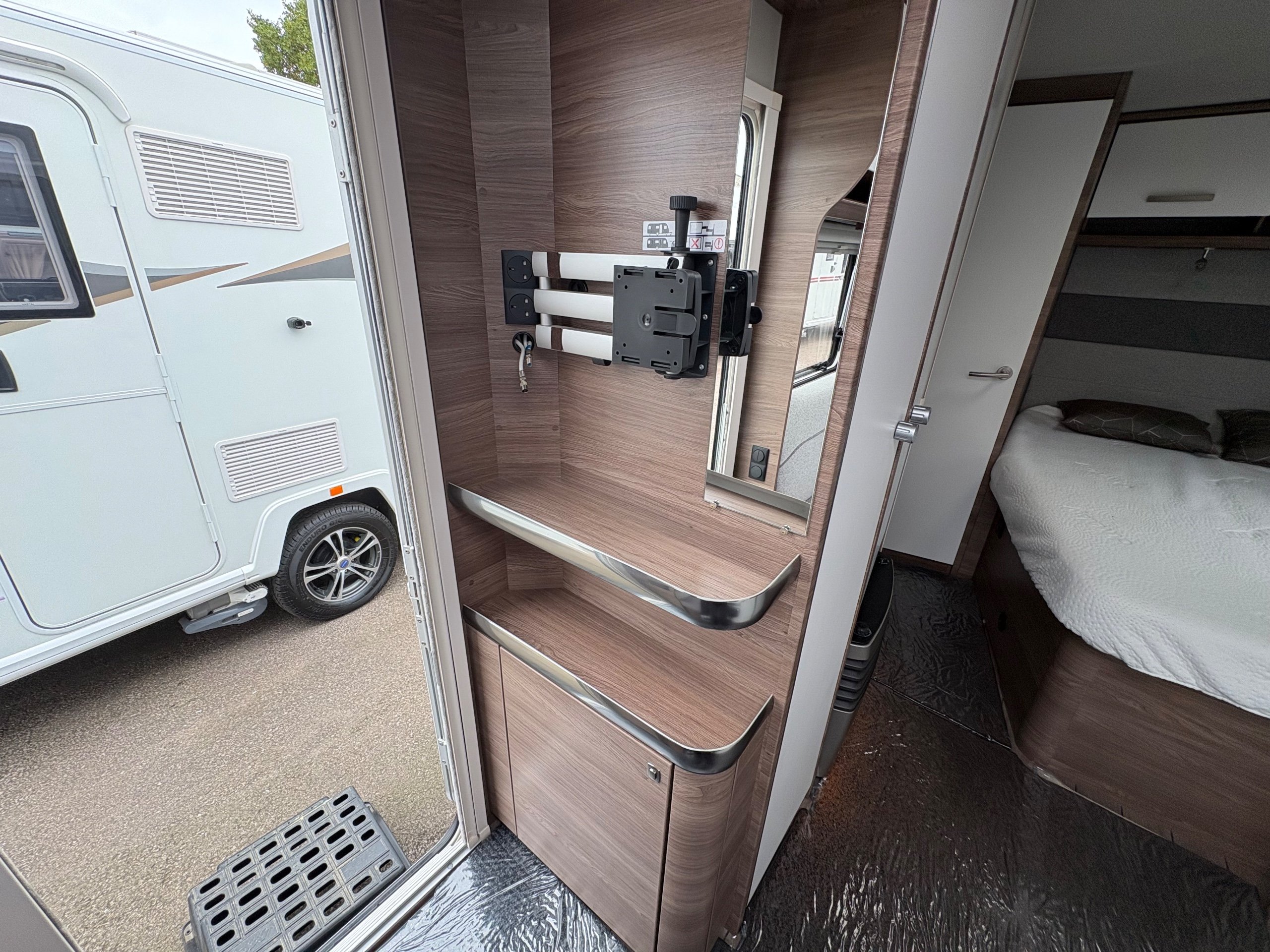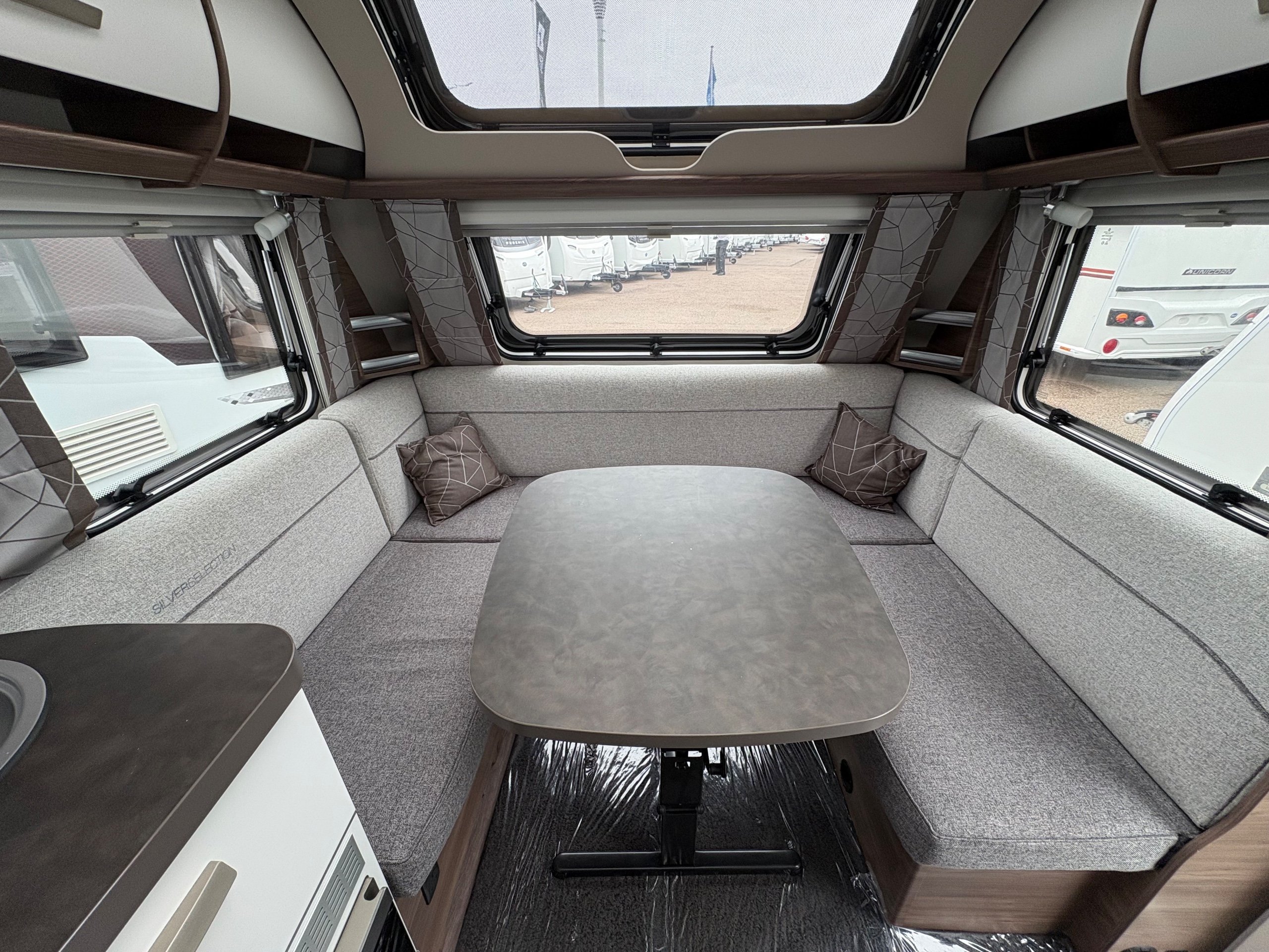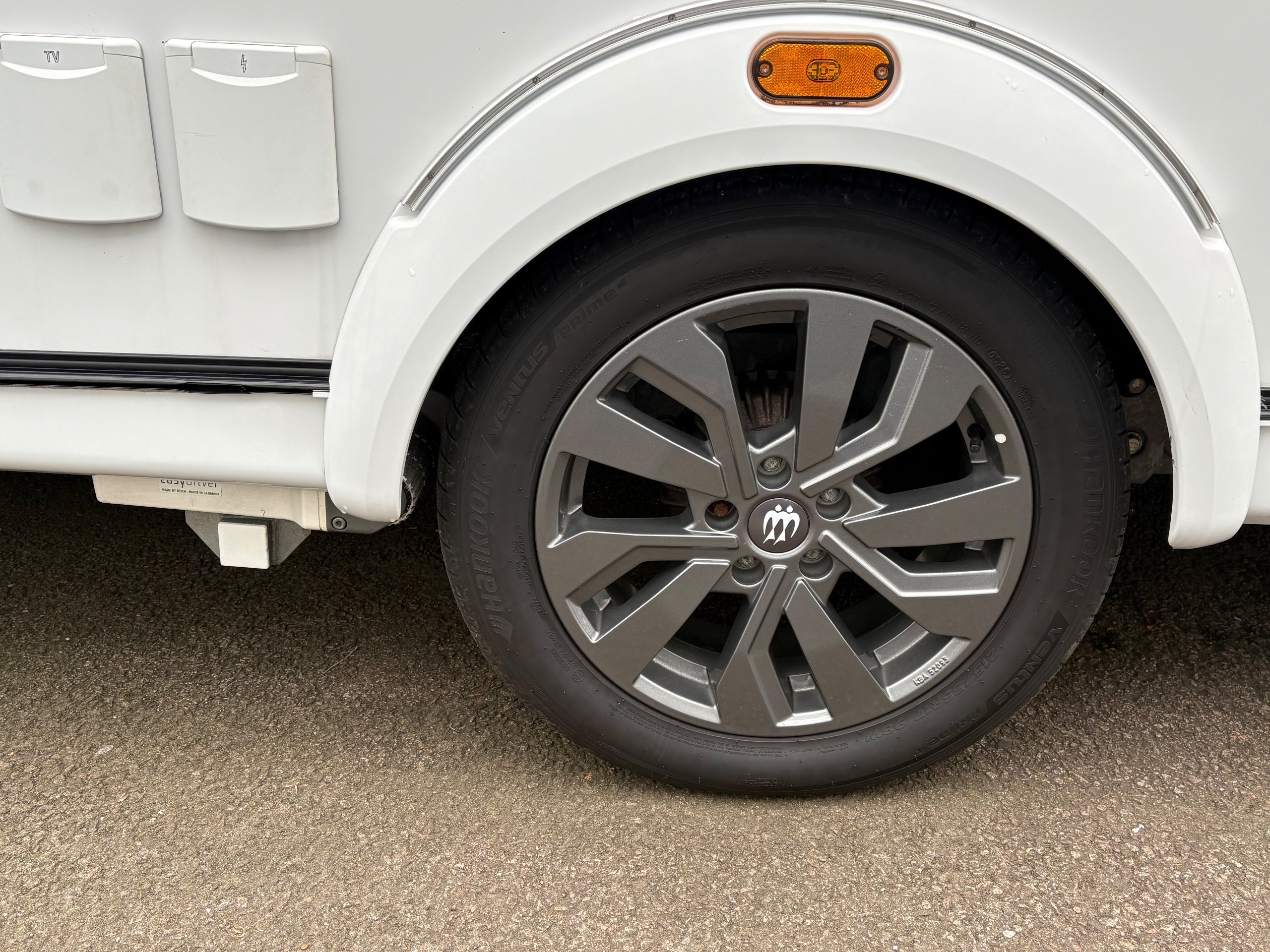 Year: 2019, Berth: 4, Internal length: 5.32m / 17'4", External length: 7.31m / 23'9", Width: 2.32m / 7'6", Unladen weight: 1170kg, MTPLM: 1500kg, Awning size: 9.60m, Warranty: 12 months. This fixed bed caravan is continental specification so the door is on the off side not the near side. This model is designed for running from a mains hook up, with the leisure battery solely for the caravan mover and the water pump. A gas space heater is fitted along with a three burner gas hob and a three way fridge, while the hot water and microwave are purely mains. This caravan also has a caravan mover fitted to it, and also comes with both a storage cover and a Kampa air awning. The fixed double bed is at the rear while the wrap around front seats, make into another generous double bed. -
